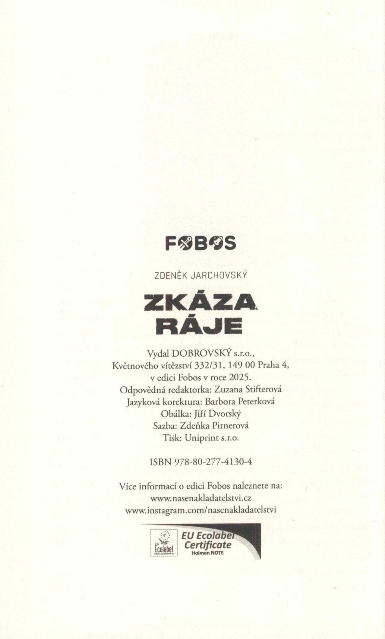 Zkáza ráje / Zdeněk Jarchovský ; obálka Jiří Dvorský. -- Praha : Dobrovský s.r.o., 2025. -- Uniprint s.r.o. -- 234 stran ; 20 cm. -- (Fobos). -- Zdobená barevná obálka. - Na přední záložce obálky text, na zadní záložce biografická poznámka o autorovi. - V závěru knihy ediční upoutávky. - Na zadní straně obálky anotace knihy. -- Anotace: Dystopický postapokalyptický sci-fi román vedený ve dvou časových linkách. V první se z monologu nejmenovaného vynálezce dozvídáme o jeho objevu tachyonové brány, kterou je možné cestovat zpátky v čase. Ve druhé lince sledujeme kvazistředověkou společnost žijící z pozůstatků naší civilizace. Dramatický oblouk je umocněn tím, že příběh spolu s čtenářem odkrývají i magistři institutu a vzdělaný páter Jakobo křečovitě se držící křesťanských dogmat o potopě a novém světě. Četba deníku je prokládána dobrodružstvími magistrů, jež zažívají při plnění pracovních povinností, která vrhají světlo na povahu nové civilizace. -- ISBN : 978-80-277-4130-4 (brožováno).