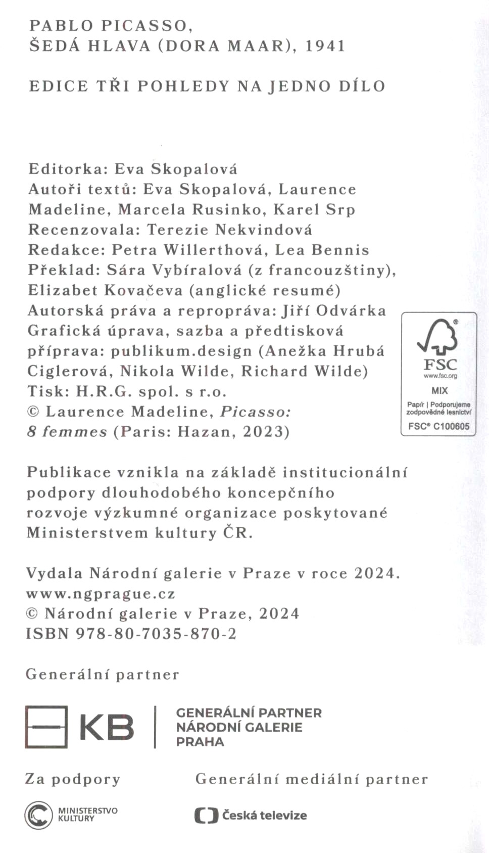 $a Pablo Picasso : $b Šedá hlava (Dora Maar), 1941 / $c Eva Skopalová (ed.), Laurence Madeline, Marcela Rusinko, Karel Srp ; překlad Sára Vybíralová (z francouzštiny), Elizabet Kovačeva (anglické resumé) ; grafická úprava, sazba a předtisková příprava publikum.design (Anežka Hrubá Ciglerová, Nikola Wilde, Richard Wilde) 264 -1