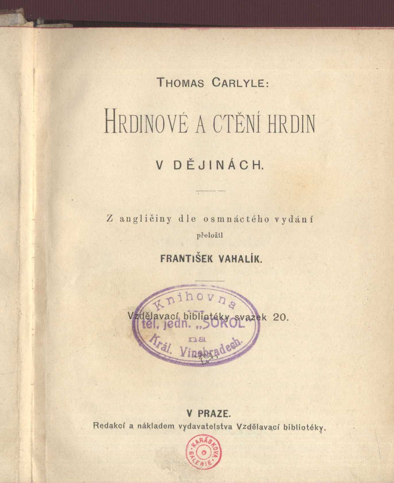 1. Názvové údajeHrdinové a ctění hrdin v dějinách / Thomas Carlyle ; z angličtiny dle 18. vydání přeložil František Vahalík