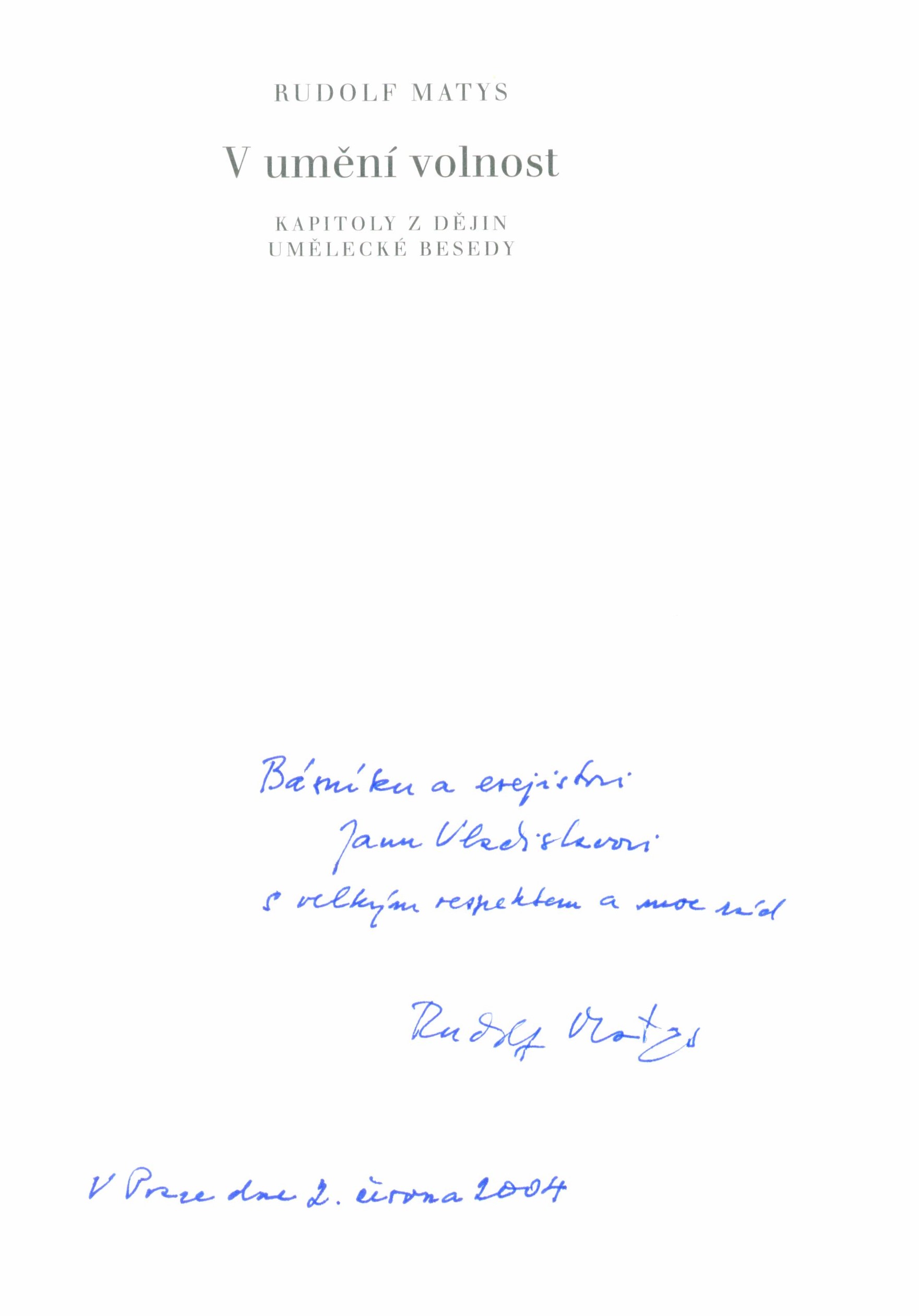 1. Názvové údajeV umění volnost : kapitoly z dějin Umělecké besedy / Rudolf Matys ; obálku navrhl Robin Brichta ; graficky upravila Michaela Blažejová