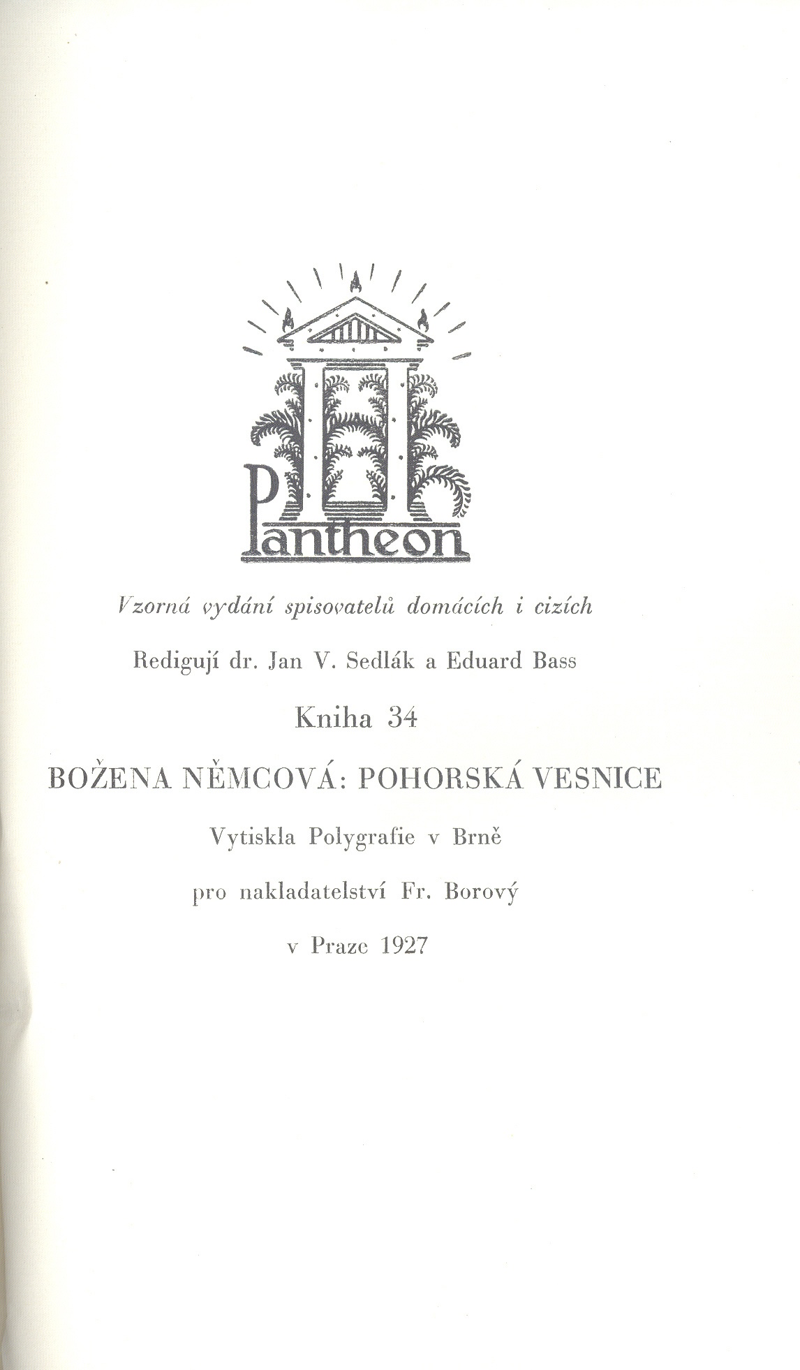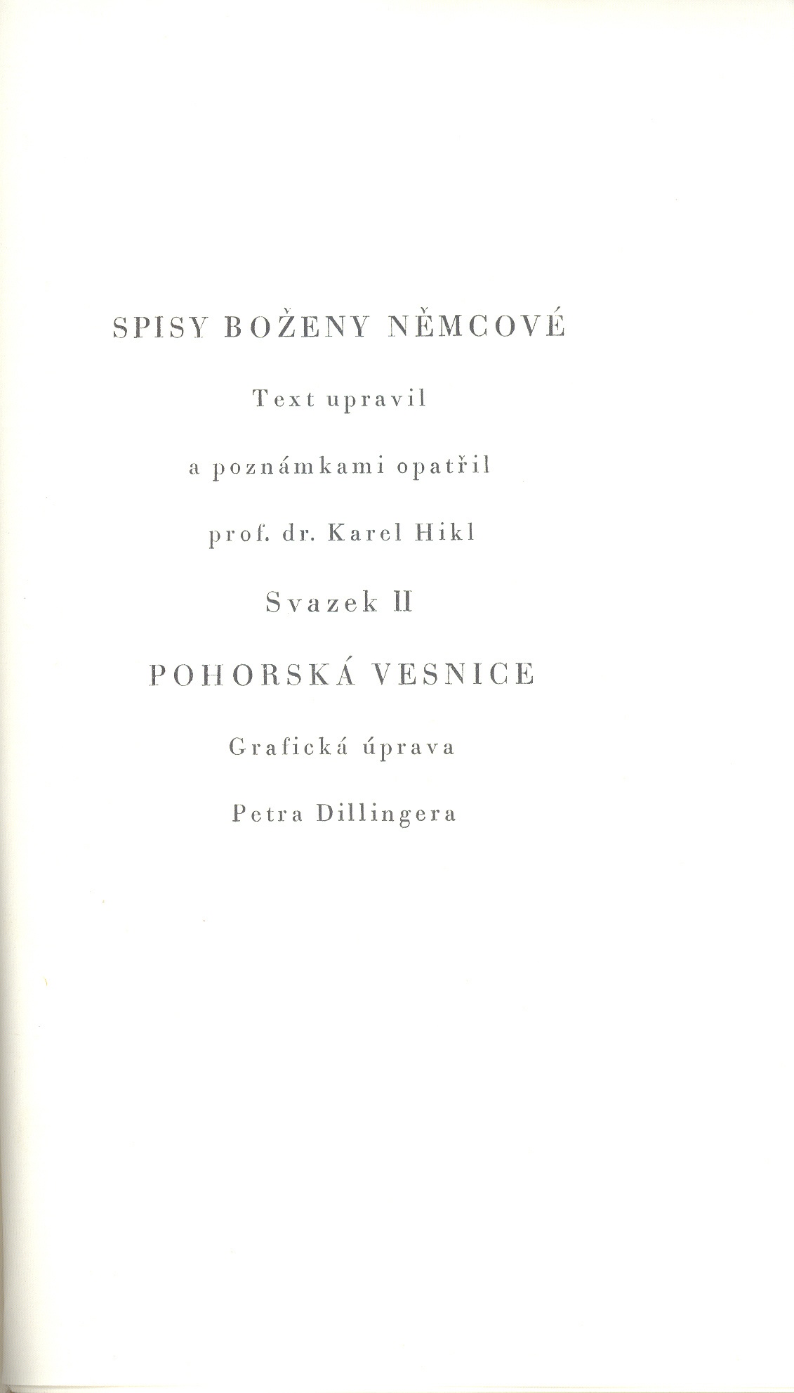 1. Názvové údajePohorská vesnice : povídka ze života lidu venkovského / Božena Němcová ; [text upravil a poznámkami opatřil Karel Hikl ; grafická úprava Petra Dillingera]