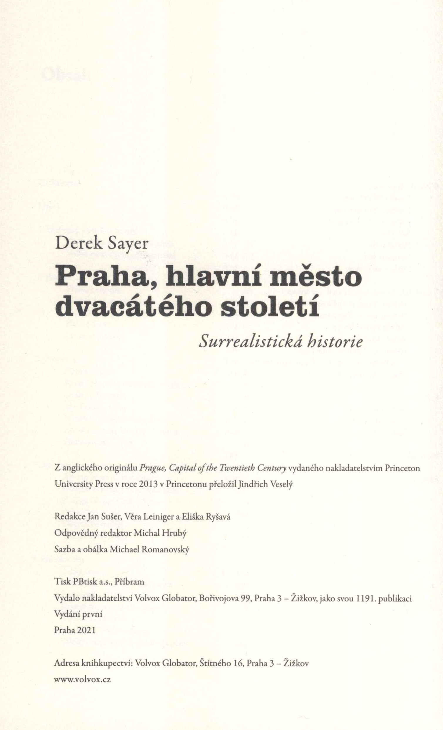 2. Názvové údajePraha, hlavní město dvacátého století : surrealistická historie / Derek Sayer ; z anglického originálu Prague, capital of the twentieth century ... přeložil Jindřich Veselý ; sazba a obálka Michael Romanovský
