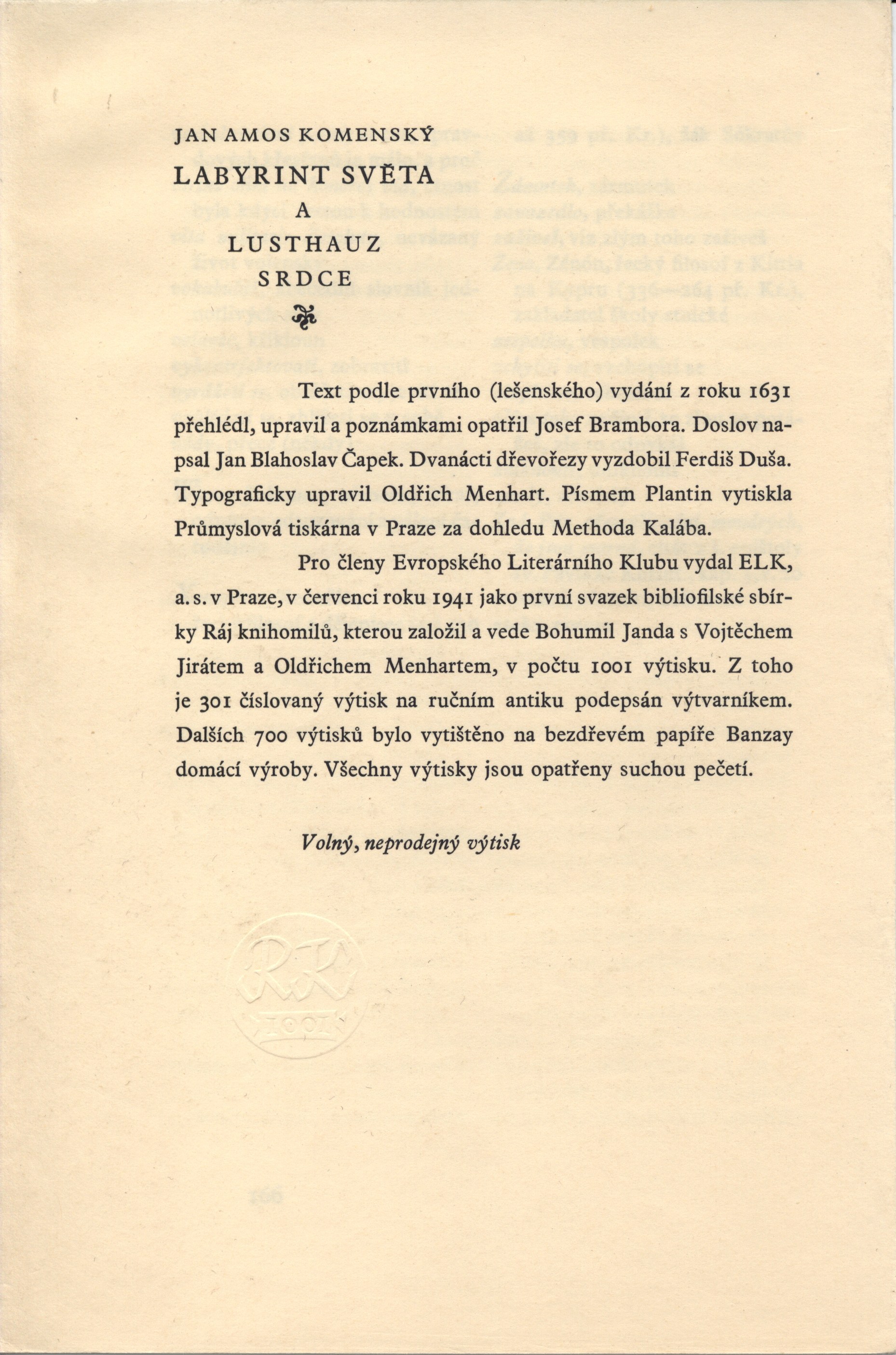 1. Názvové údajeLabyrint světa a Lusthauz srdce : to jest světlé vymalování, kterak v tomto světě a věcech jeho všechněch nic není než matení a motání, kolotání a lopotování, mámení a šalba, bída a tesknost, a naposledy omrzení všeho a zoufání; ale kdož doma v srdci svém sedě s jediným Pánem Bohem se uzavírá, ten sám k pravému a plnému mysli uspokojení a radosti že přichází / [Jan Amos Komenský ; text podle prvního (lešenského) vydání z roku 1631 přehlédl, upravil a poznámkami opatřil Josef Brambora ; doslov napsal Jan Blahoslav Čapek ; dvanácti dřevořezy vyzdobil Ferdiš Duša ; typograficky upravil Oldřich Menhart]