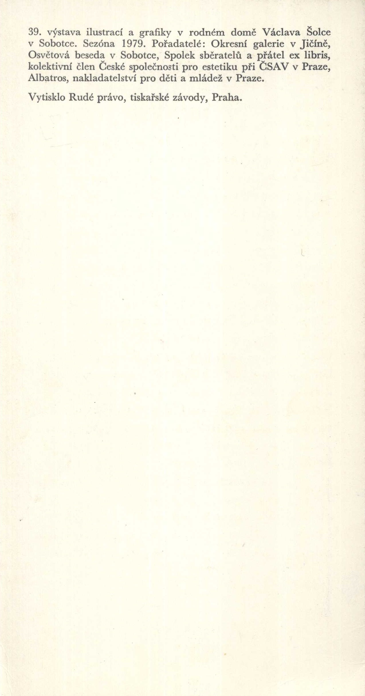 1. Názvové údajeEva Bednářová : ilustrace : rodný dům Václava Šolce, Sobotka, červenec 1979 / text Jaroslav Šimůnek