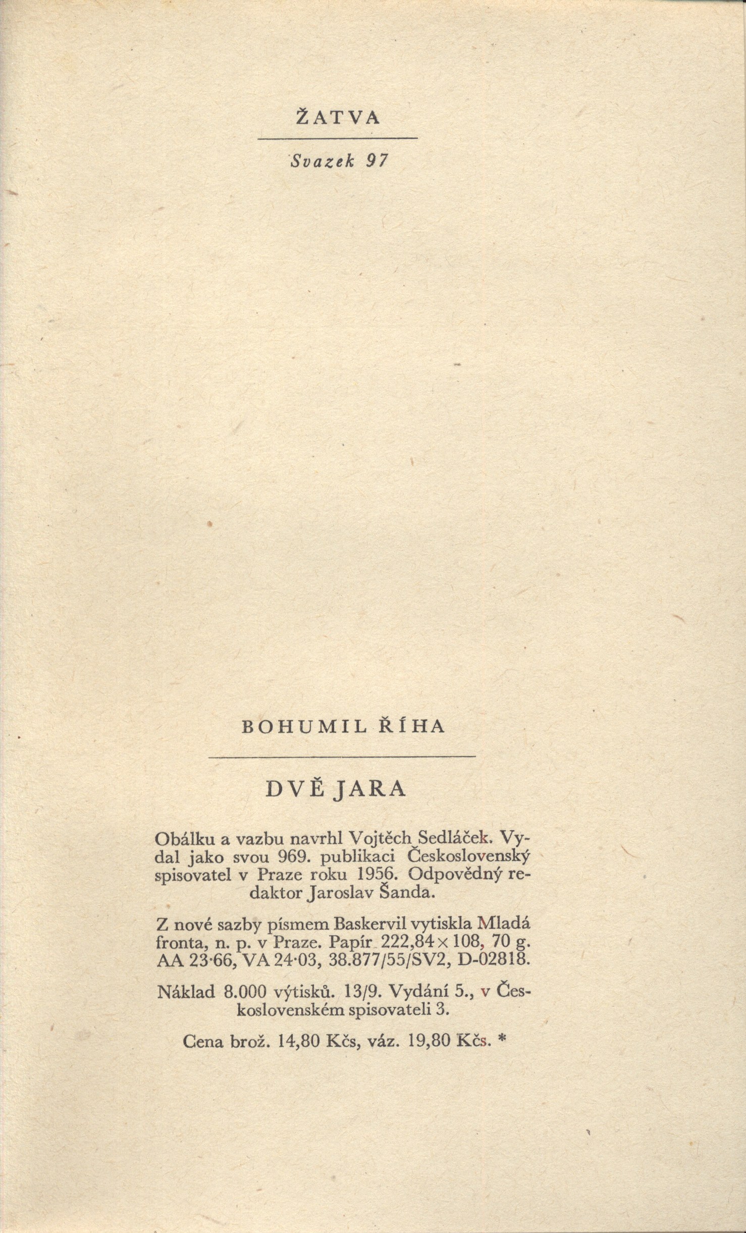 Klíčová slova česká literatura * próza * Říha B. * román * kolektivizace * jaro * r. 1945 * r. 1949 * výzdoba knihy * frontispis * Sedláček V.