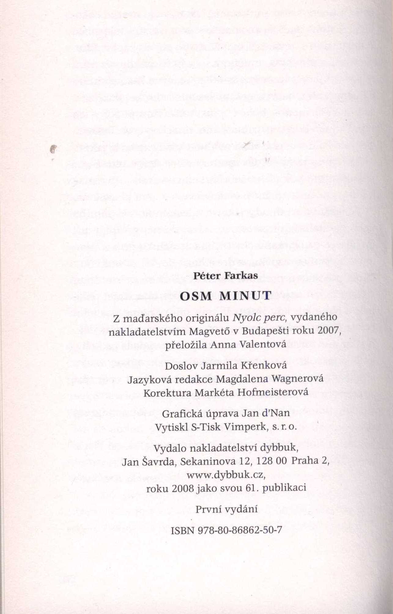 1. Názvové údajeOsm minut / Péter Farkas ; z maďarského originálu Nyolc perc ... přeložila Anna Valentová