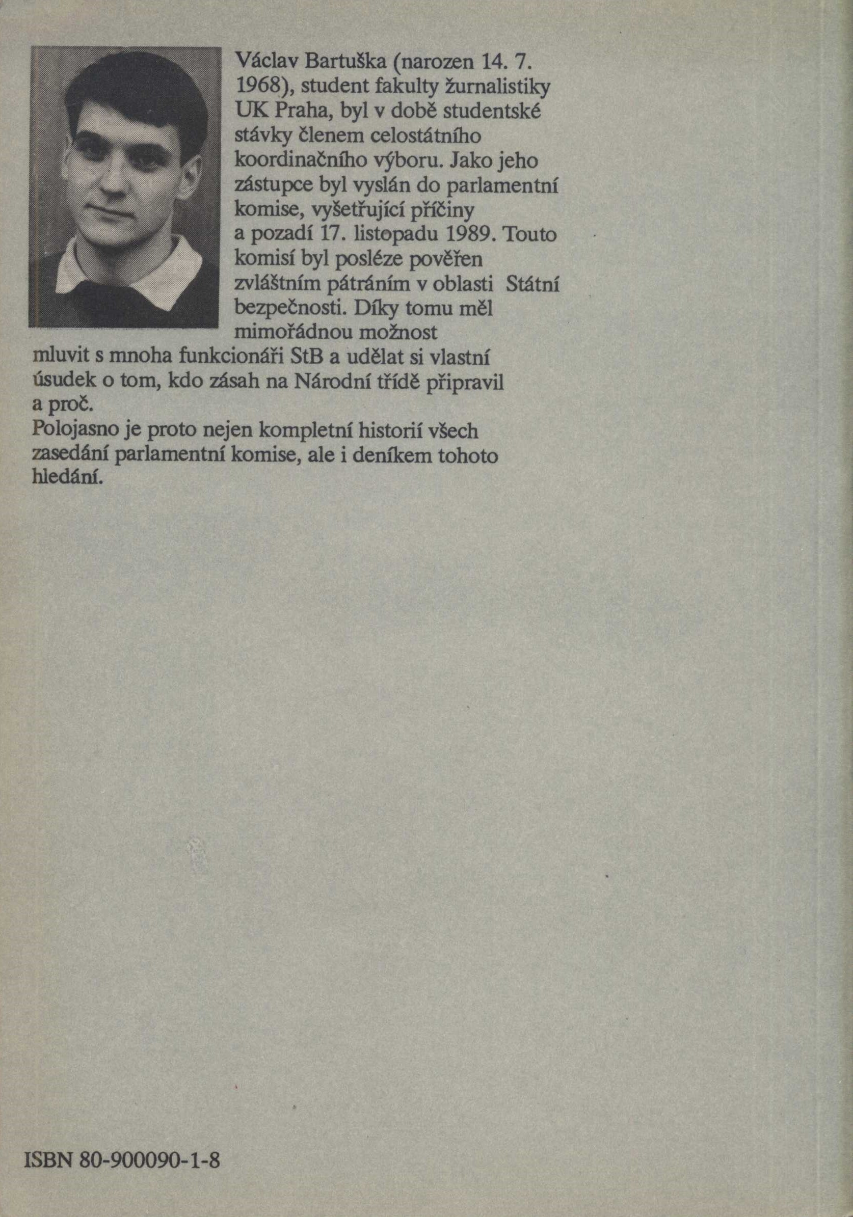 Klíčová slova česká literatura * autobiografická literatura * vzpomínky * Bartuška V. * Československo * listopad 1989 * komise * vyšetřovací komise * události * 17. listopad 1989 * r. 1990
