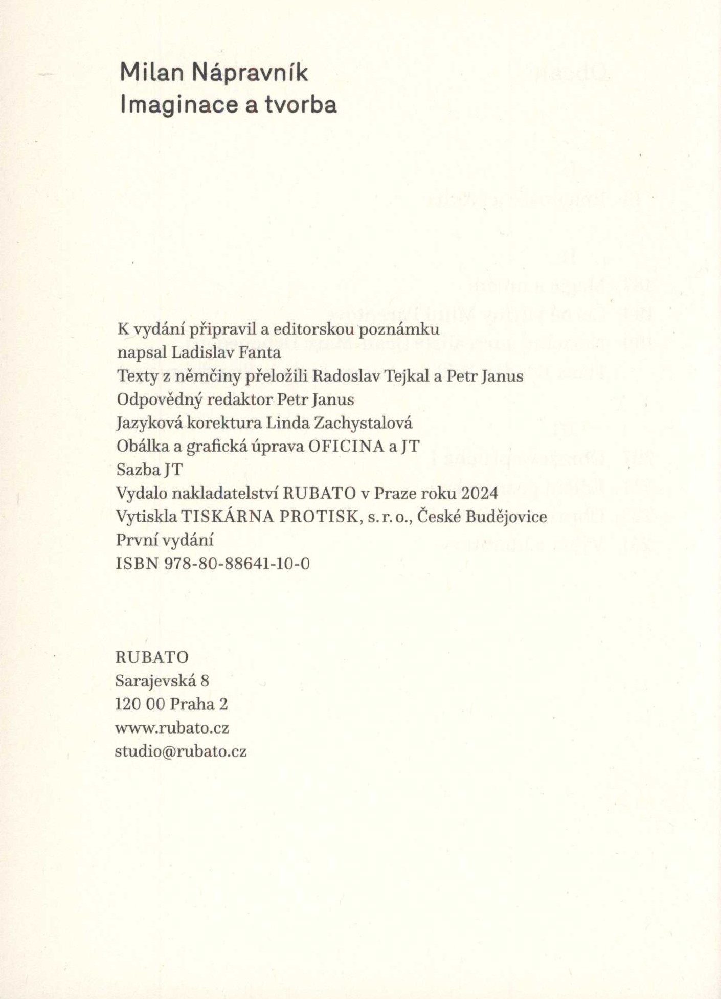 1. Názvové údajeImaginace a tvorba / Milan Nápravník ; k vydání připravil a editorskou poznámku napsal Ladislav Fanta ; texty z němčiny přeložili Radoslav Tejkal a Petr Janus ; obálka a grafická úprava Oficina a JT
