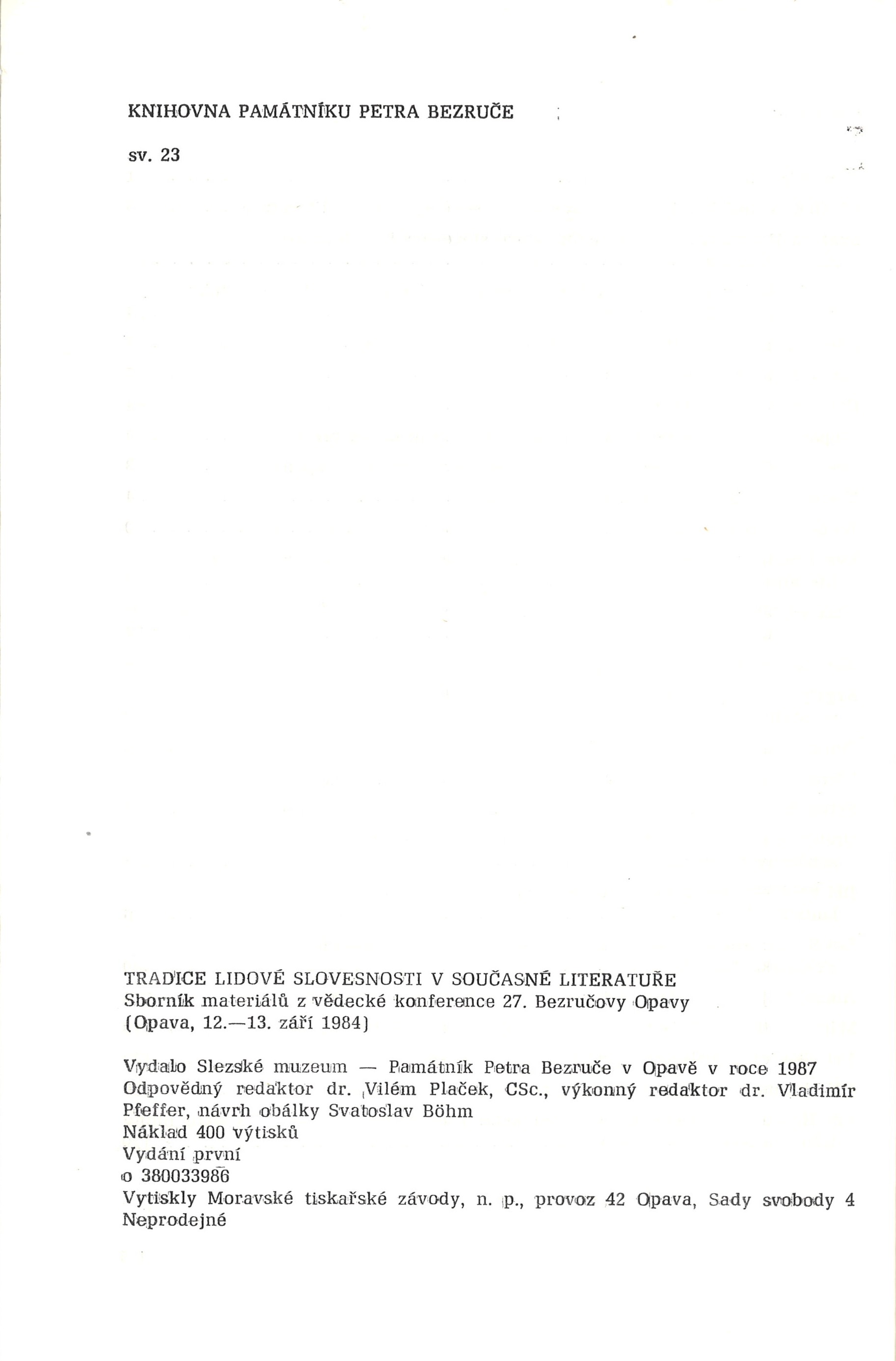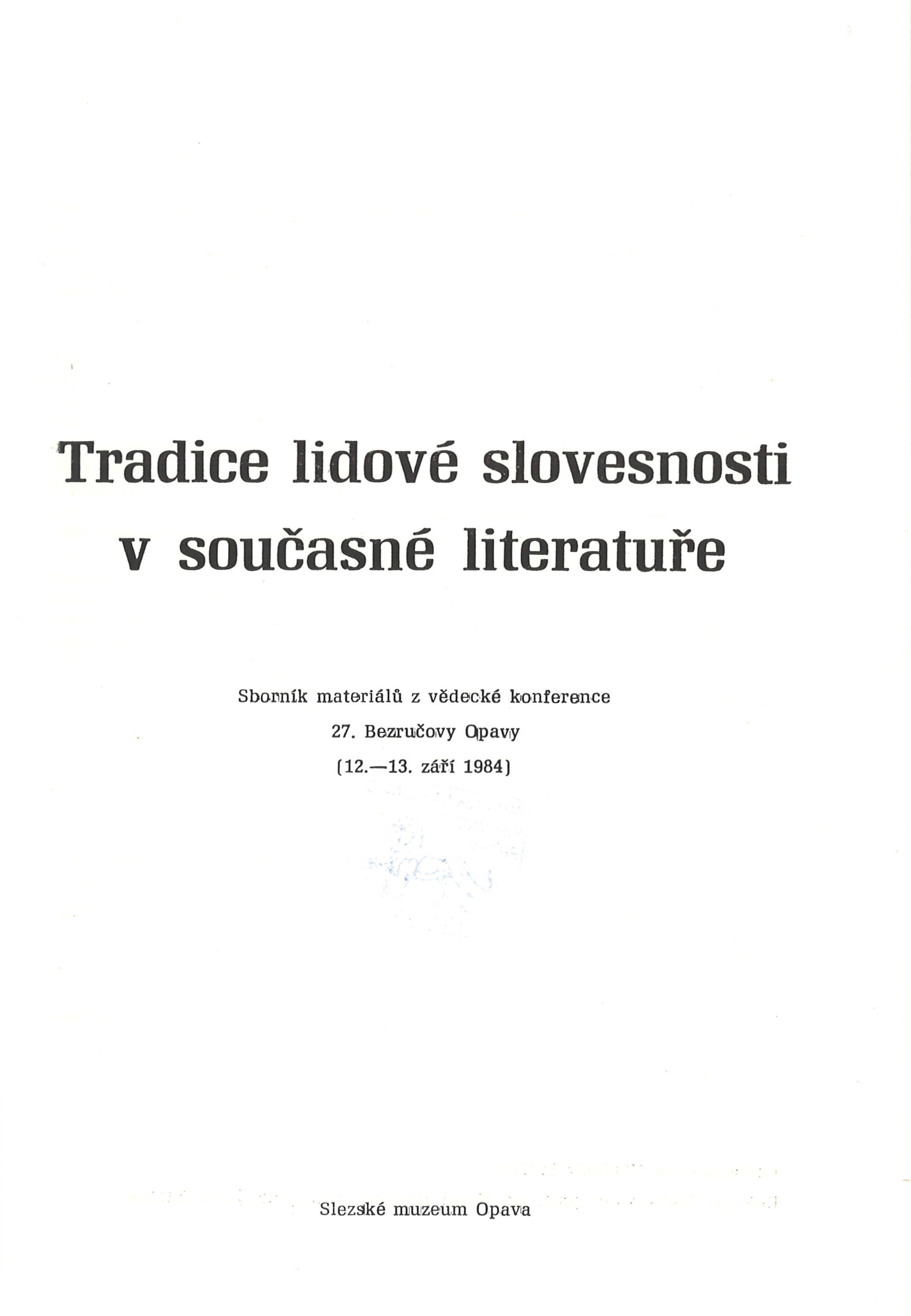 1. Názvové údajeTradice lidové slovesnosti v současné literatuře : sborník materiálů z vědecké konference 27. Bezručovy Opavy (12.-13. září 1984) : [pořádalo] Slezské muzeum Opava / redigoval Vladimír Pfeffer ; obálka Svatoslav Böhm