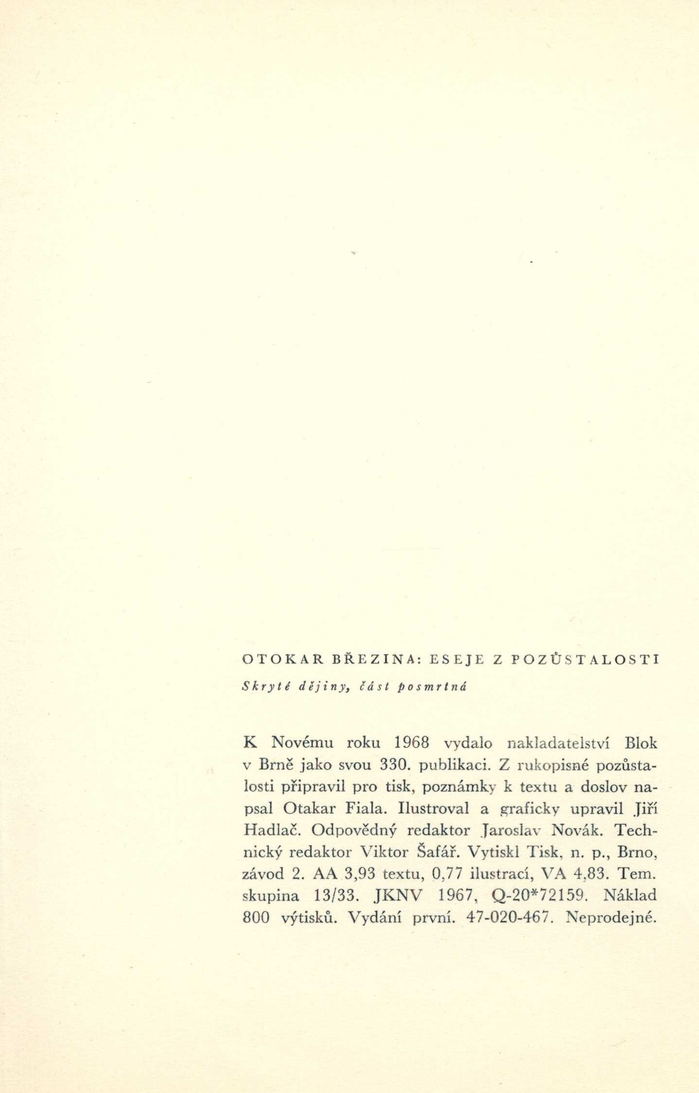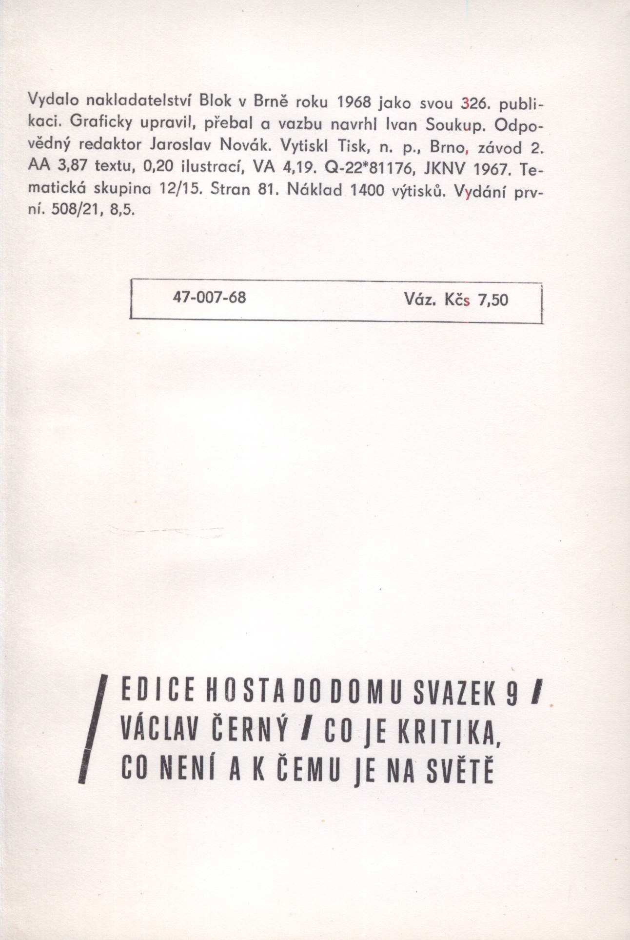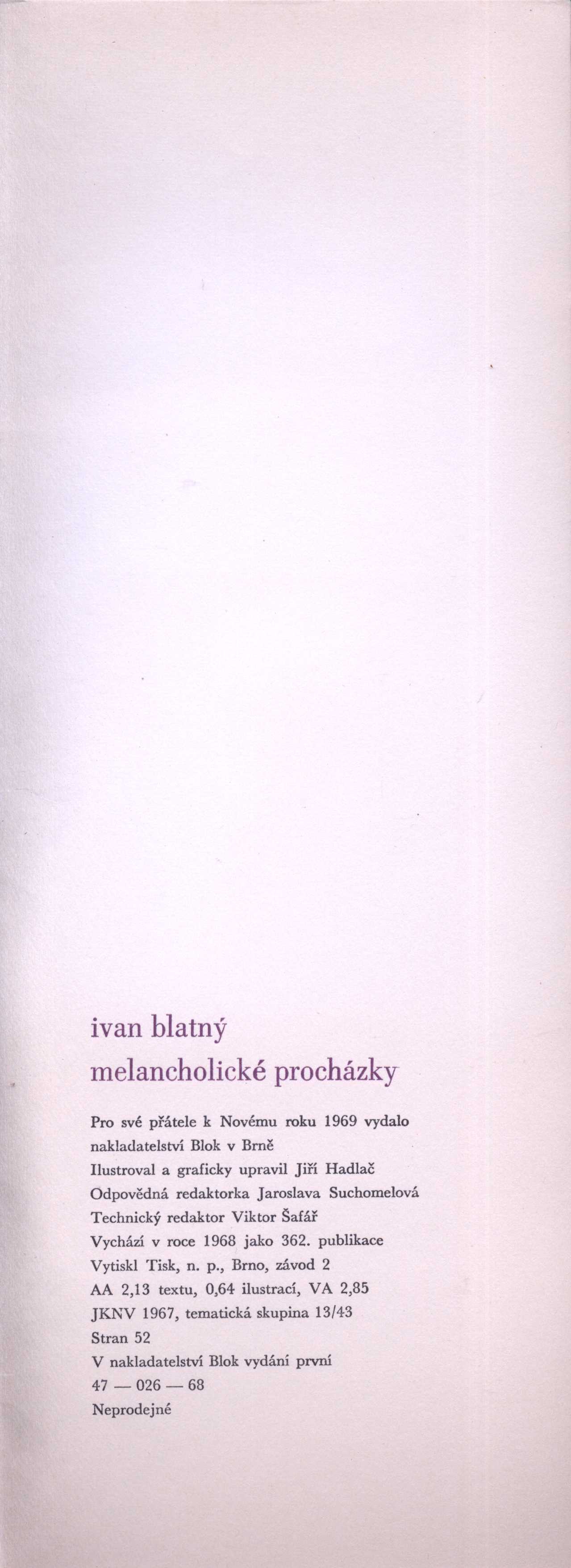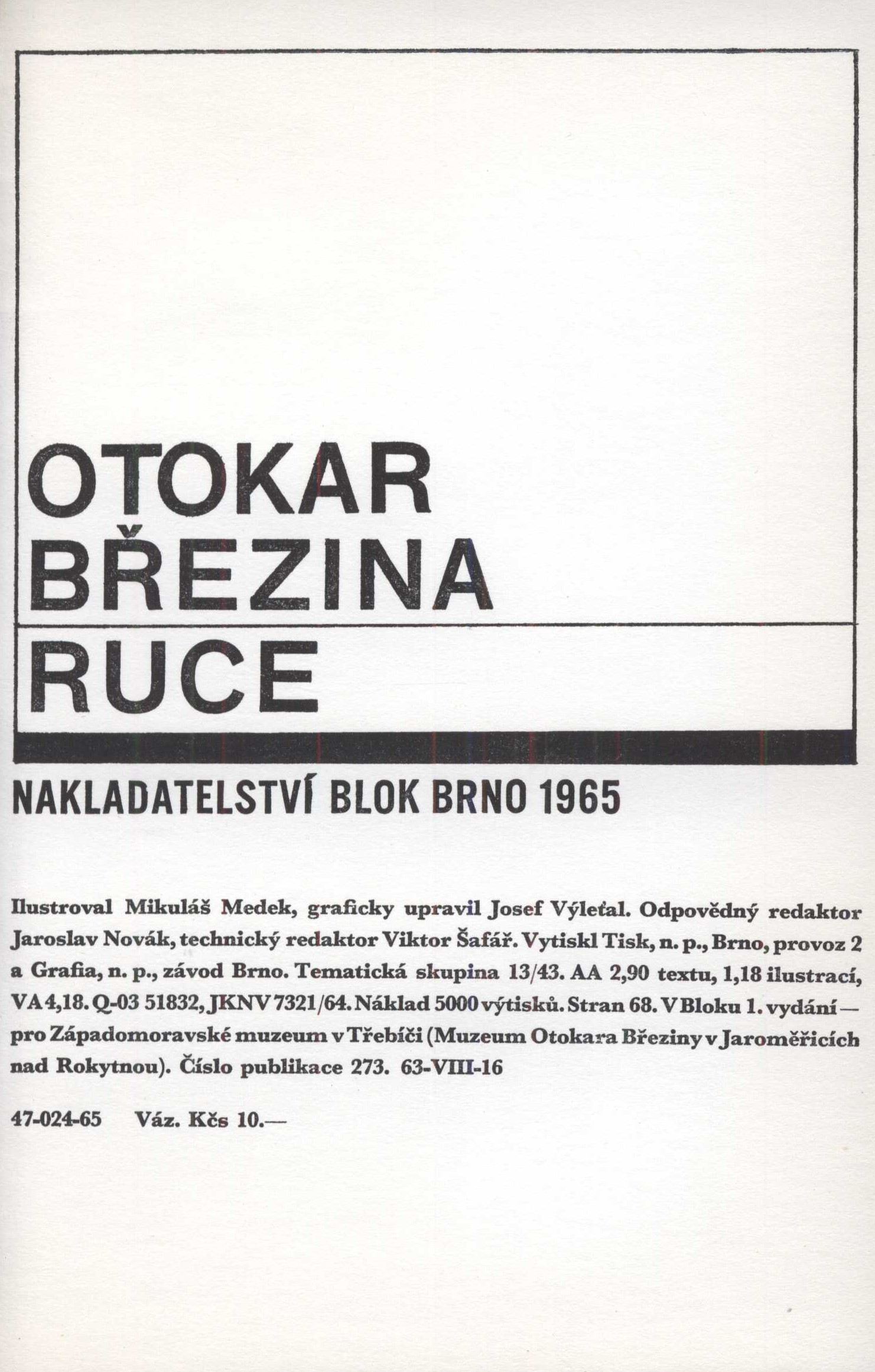 Názvové údaje Melancholické procházky / Ivan Blatný ; ilustroval a graficky upravil Jiří Hadlač Osobní jméno Blatný, Ivan, 1919-1990 (Autor) Další autoři Hadlač, Jiří, 1927-1991 (Ilustrátor) Korp. Blok (nakladatelství) (Nakladatel, vydavatel) Tisk Brno (tiskárna) (Tiskař) Nakladatel Brno : Blok, 1968 Výrobce Brno : Tisk, n. p., závod 2 Rozsah 52 stran ; 31 cm Klíčová slova česká literatura * česká poezie * básně * neprodejný tisk Počet ex. 3, z toho volných 3 Druh dok. monografie Signatura JVladislav 015, R&AHamanovi 0985, Listopad 0371 Názvové údaje S odkrytým hledím / Vladimír Bozděch ; [kresby Jarmila Totušková ; grafická úprava Jan Jordán] Osobní jméno Bozděch, Vladimír, 1928-1991 (Autor) (Dedikátor) Další autoři Totušková, Jarmila, 1937- (Ilustrátor) Jordán, Jan, 1954- (Knižní grafik) Mertl, Věroslav, 1929-2013 (Dedikant) Korp. Blok (nakladatelství) (Nakladatel, vydavatel) Tisk Brno (tiskárna) (Tiskař) Nakladatel V Brně : Blok, 1978 Výrobce (Tisk 2) Rozsah 54 s. : il. Klíčová slova česká poezie * básně Počet ex. 1, z toho volných 1 Druh dok. monografie Signatura C12b 13317 Názvové údaje Eseje z pozůstalosti : skryté dějiny, část posmrtná / Otokar Březina ; z rukopisné pozůstalosti připravil pro tisk, poznámky k textu a doslov napsal Otakar Fiala ; ilustroval a graficky upravil Jiří Hadlač Osobní jméno Březina, Otokar, 1868-1929 (Autor) Další autoři Fiala, Otakar, 1889-1977 (Editor) (Autor doslovu, tiráže atd.) Hadlač, Jiří, 1927-1991 (Ilustrátor) (Knižní grafik) Korp. Blok (nakladatelství) (Nakladatel, vydavatel) Tisk Brno (tiskárna) (Tiskař) Nakladatel Brno : Blok, 1968 Výrobce Tisk, n. p., závod 2 Rozsah 103 stran : ilustrace ; 20,5 cm Klíčová slova česká próza * eseje * filozofie * filozofie ducha * přelom 19. a 20. stol. Počet ex. 4, z toho volných 3 Druh dok. monografie Signatura Z A 4 D 47, Z A 4 C 29, P 109 f 10, Holman-Březina 0113 Názvové údaje Eseje z pozůstalosti : skryté dějiny, část posmrtná / Otokar Březina ; z rukopisné pozůstalosti připravil pro tisk, poznámky k textu a doslov napsal Otakar Fiala ; ilustroval a graficky upravil Jiří Hadlač Osobní jméno Březina, Otokar, 1868-1929 (Autor) Další autoři Fiala, Otakar, 1889-1977 (Editor) (Autor doslovu, tiráže atd.) Hadlač, Jiří, 1927-1991 (Ilustrátor) (Knižní grafik) Korp. Blok (nakladatelství) (Nakladatel, vydavatel) Tisk Brno (tiskárna) (Tiskař) Nakladatel Brno : Blok, 1967 Výrobce Tisk, n. p., závod 2 Rozsah 103 stran : ilustrace ; 20 cm Klíčová slova česká próza * eseje Počet ex. 2, z toho volných 2 Druh dok. monografie Signatura Holan 01152, Holman-Březina 0112 Názvové údaje Ruce / Otokar Březina ; ilustrace Mikuláš Medek ; grafická úprava Josef Vyleťal Osobní jméno Březina, Otokar, 1868-1929 (Autor) Další autoři Medek, Mikuláš, 1926-1974 (Ilustrátor) Vyleťal, Josef, 1940-1989 (Knižní grafik) Korp. Blok (nakladatelství) (Nakladatel, vydavatel) Západomoravské muzeum (Třebíč, Česko) (Nakladatel, vydavatel) Muzeum Otokara Březiny (Jaroměřice nad Rokytnou, Česko) (Nakladatel, vydavatel) Tisk Brno (tiskárna) (Nakladatel, vydavatel) Grafia (tiskárna) (Nakladatel, vydavatel) Nakladatel Brno : Blok, 1965 Výrobce Tisk, n. p., provoz 2 : Grafia, n. p. Rozsah 61 stran : ilustrace ; 20,5 cm Klíčová slova česká poezie * básně * sbírka básní Počet ex. 3, z toho volných 3 Druh dok. monografie Signatura C12b 3663, LK Janeček 1254, Holman-Březina 0115 Názvové údaje Symfonie bratrských hlasů : poezie Otokara Březiny v cizích jazycích / Otokar Březina ; uspořádal O.F. Babler ; frontispis Rudolf Kremlička ; graficky upravil Ivan Soukup ; autorem fotogramu na přebalu je Petr Jero Osobní jméno Březina, Otokar, 1868-1929 (Autor) Další autoři Babler, Otto František, 1901-1984 (Sestavovatel, kompilátor) Kremlička, Rudolf, 1886-1932 (Ilustrátor) Soukup, Ivan, 1942- (Knižní grafik) Jero, Petr, 1951- (Ilustrátor) (Autor obálky) Korp. Blok (nakladatelství) (Nakladatel, vydavatel) Tisk Brno (tiskárna) (Tiskař) Nakladatel V Brně : Blok, 1970 Výrobce Tisk, knižní výroba, n. p., závod 1 Rozsah 95 stran ; 20,5 x 20,5 cm Klíčová slova česká poezie * básnické dílo * překlady básní * Březina O. Počet ex. 3, z toho volných 3 Druh dok. monografie Signatura ZA 5 f 25, P 90 B 20, Holman-Březina 0138 Názvové údaje Nepřicházejí vhod : dopisy, básně, překlady, prózy / Josef Čapek - Bohuslav Reynek ; [uspořádali Josef Glivický a Ludvík Kundera ; úvod napsal Ludvík Kundera ; k vydání připravil Josef Glivický ; bibliografii prací B. Reynka sestavil Vlastimil Vokolek a Josef Glivický ; grafická úprava Jiří Šindler] Osobní jméno Čapek, Josef, 1887-1945 (Autor) Další autoři Reynek, Bohuslav, 1892-1971 (Autor) Kundera, Ludvík, 1920-2010 (Sestavovatel, kompilátor) (Autor úvodu atd.) Glivický, Josef, 1903-1991 (Sestavovatel, kompilátor) (Autor komentáře textu) Vokolek, Vlastimil, 1903-1985 (Autor komentáře textu) Šindler, Jiří, 1938-2022 (Knižní grafik) Korp. Blok (nakladatelství) (Nakladatel, vydavatel) Tisk Brno (tiskárna) (Tiskař) Nakladatel Brno : Blok, 1969 Výrobce Tisk) Rozsah 128 s., [8] obr. příl. : il. ; 21 cm Osobní hesla Čapek, Josef, 1887-1945 - malíř, grafik, scénický výtvarník a spisovatel * Reynek, Bohuslav, 1892-1971 - grafik, básník a překladatel Klíčová slova česká literatura * povídky * korespondence * překlady Počet ex. 2, z toho volných 2 Druh dok. monografie Signatura Holan 2401, C12b 14550 Názvové údaje Co je kritika, co není a k čemu je na světě / Václav Černý ; [graficky upravil, přebal a vazbu navrhl Ivan Soukup] Osobní jméno Černý, Václav, 1905-1987 (Autor) Další autoři Soukup, Ivan, 1942- (Knižní grafik) (Autor obálky) (Výtvarník vazby) Korp. Blok (nakladatelství) (Nakladatel, vyd