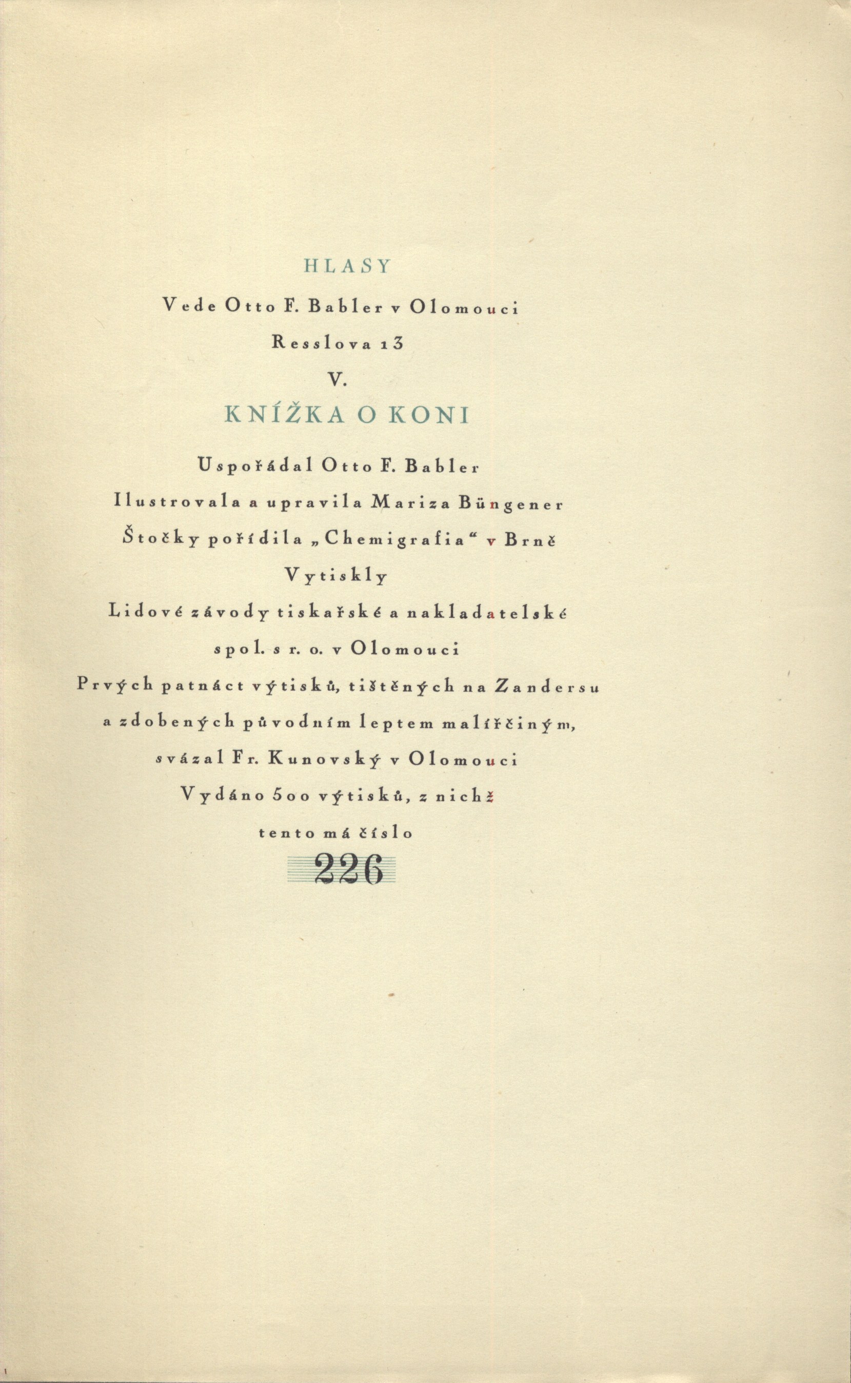 Názvové údaje Slezské písně / [Petr Bezruč] ; [kaktus ryl do dřeva O. Petr] Osobní jméno Bezruč, Petr, 1867-1958 (Autor) (Autor podpisu) Další autoři Petr, Otto, 1893-1971 (Ilustrátor) Karásek ze Lvovic, Jiří, 1871-1951 (Autor podpisu) Korp. Nový lid (Brno, Česko) (Nakladatel, vydavatel) Pokorný a spol. (Brno) (Tiskař) Chemigrafia (Brno, Česko) (Tiskař obrazu) Nakladatel V Brně : Nákladem Nového lidu, 1930 Výrobce (Tiskárna Pokorného a spol.) Rozsah 175, [5] s., [1] list obr. přílohy : il. Klíčová slova česká literatura * česká poezie * Slezsko * sociální poezie * balady Počet ex. 1, z toho volných 1 Druh dok. monografie Signatura KaG XVI C 121 Názvové údaje Knížka o koni / uspořádal Otto F. Babler ; ilustrovala [a upravila] Mariza Büngener ; [svázal Fr. Kunovský] Další autoři Babler, Otto František, 1901-1984 (Sestavovatel, kompilátor) (Nakladatel, vydavatel) Büngener, Mariza (Ilustrátor) (Knižní grafik) Kunovský, František, 1886-1960 (Vazač) Korp. Lidové závody tiskařské a nakladatelské (Olomouc) (Tiskař) (Tiskař obrazu) Chemigrafia (Brno, Česko) (Leptař) Nakladatel Olomouc : [Otto. F. Babler], 1927 Výrobce Lidové závody tiskařské a nakladatelské spol. s r. o.) Rozsah 41 s. : il. ; 23 cm Klíčová slova prózy * básně * překlady * téma * koně * ilustrované knihy * ilustrace * číslovaný výtisk Počet ex. 1, z toho volných 1 Druh dok. monografie Signatura Topič 0705