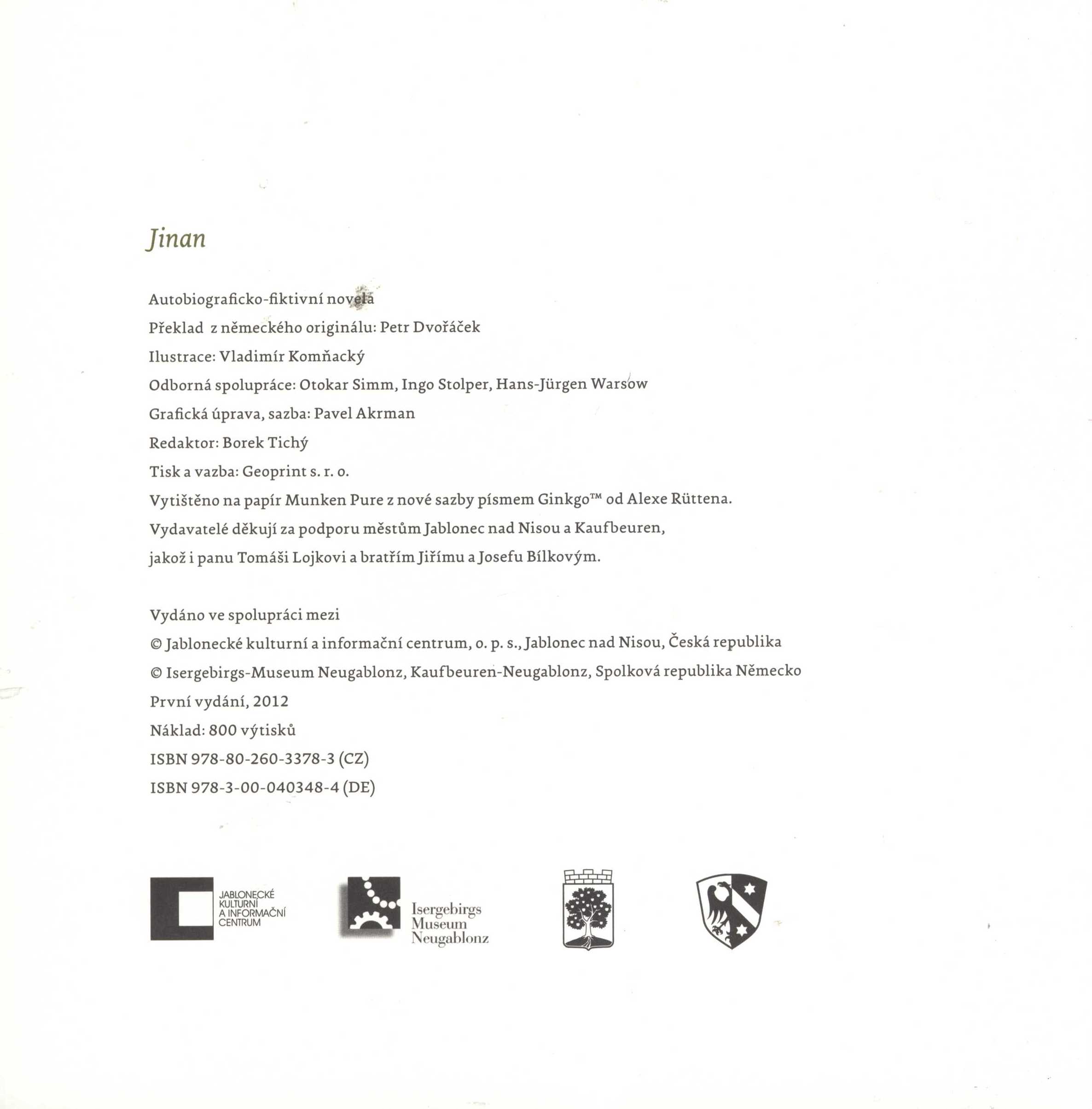 Názvové údaje Dna kořenů / Julius Benko ; ilustrace Josef Šporgy Osobní jméno Benko, Julius, 1981- (Autor) Další autoři Šporgy, Josef, 1973- (Ilustrátor) Korp. Nakladatelství Bor (Nakladatel, vydavatel) Geoprint (tiskárna) (Tiskař) Nakladatel Liberec : Bor, 2018 Výrobce Geoprint s.r.o. Rozsah 65 stran : ilustrace ; 20 cm Klíčová slova česká poezie * básně * intimní lyrika Počet ex. 1, z toho volných 1 Druh dok. monografie Signatura C12b 18781 Názvové údaje Jaroslav Brychta : spoluzakladatel a tvůrce železnobrodského skla / Antonín Langhamer, Martin Hlubuček ; [fotografie Gabriel Urbánek, Jaroslav Zahradník, archivy ; grafika Martin Hlubuček] Osobní jméno Langhamer, Antonín, 1936-2017 (Autor) Další autoři Hlubuček, Martin, 1974- (Autor) (Knižní grafik) Brychta, Jaroslav, 1895-1971 (Umělec) Urbánek, Gabriel, 1948- (Fotograf) Korp. Geoprint (tiskárna) (Tiskař) Nakladatel Železný Brod : Město Železný Brod, 2014 Výrobce Geoprint) Rozsah 215 s. : il. (převážně barev.), portréty ; 31 cm Osobní hesla Brychta, Jaroslav, 1895-1971 - umělecký sklář a sochař Klíčová slova umělecké sklo * skláři * sklářské umění * umělecké sklářství * Česko * stol. 20. * monografie * obrazové publikace Počet ex. 1, z toho volných 1 Druh dok. monografie Signatura C12d 1924 Názvové údaje Srpen 1968 v Liberci / Jindřich Marek ... [et al.] ; [koncepce a úvodní text Tomáš Hasil ; texty Jindřich Marek ... [et al.] ; texty k fotografiím Jan Šolc ; sazba a grafické zpracování Ester Rut Vognerová] Osobní jméno Marek, Jindřich, 1952- (Autor) Další autoři Hasil, Tomáš, 1961- (Sestavovatel, kompilátor) (Autor úvodu atd.) Šolc, Jan, 1938- (Autor úvodu atd.) Vognerová, Ester Rut (Sazeč) Korp. Spacium (Liberec) (Nakladatel, vydavatel) Geoprint (tiskárna) (Tiskař) Nakladatel Liberec : Spacium, o. p. s., 2008 Výrobce (Geoprint, s. r. o.) Rozsah 198 s. : il. ; 20 x 27 cm + 2 CD + 1 DVD Předmětová hesla Srpen, 1968 Geografické heslo Československo - dějiny - 1968 * Liberec (Česko) - dějiny - 1968 Klíčová slova fotografické publikace * Liberec * srpen 1968 * sovětská invaze * dobové fotografie Počet ex. 1, z toho volných 1 Druh dok. monografie Signatura C12b 13576 Názvové údaje Socha a město Liberec 1969 : [2. července - 30. září 1969 / odborná redakce, koncepce, úvodní text a průvodní texty] Ivona Raimanová ; [texty Hana Seifertová, Jiří Šetlík ; fotografie Vít Jón, Leoš Nebor, Jan Svoboda ; sazba a grafické zpracování Ester Rut Vognerová] Osobní jméno Raimanová, Ivona, 1956- (Autor) (Editor) Další autoři Seifertová, Hana, 1934- (Autor úvodu atd.) Šetlík, Jiří, 1929-2023 (Autor úvodu atd.) Jón, Vít (Fotograf) Nebor, Leoš, 1930-1992 (Fotograf) Svoboda, Jan, 1934-1990 (Fotograf) Vognerová, Ester Rut (Knižní grafik) Korp. Spacium (Liberec) (Nakladatel, vydavatel) Geoprint (tiskárna) (Tiskař) Nakladatel Liberec : Spacium, o. p. s., 2008 Výrobce (Geoprint, s. r. o.) Rozsah 140 s. : il., portréty ; 20 x 27 cm Heslo akce Socha a město (1969_: Liberec, Česko Předmětová hesla umělecké výstavy - Česko - 1961-1970 * české sochařství - 20. stol * moderní sochařství - Česko * veřejná prostranství - Česko Geografické heslo Liberec (Česko) Klíčová slova fotografické publikace * sochy * čeští sochaři * instalace * Liberec * r. 1969 * veřejný prostor Počet ex. 1, z toho volných 1 Druh dok. monografie Signatura C12b 13577 Názvové údaje V prostoru 2000 : generace 1989-2009 / [texty a rozhovory] Ivona Raimanová ; [fotografické portréty Karel Cudlín ; fotografie David Černý ... [et al.] ; grafická úprava studio pixl-e] Osobní jméno Raimanová, Ivona, 1956- (Autor) (Dotazovatel, interviewující) Další autoři Cudlín, Karel, 1960- (Fotograf) Černý, David, 1967- (Fotograf) Tomáš, Jan, 1976- (Typograf) Korp. Spacium (Liberec) (Nakladatel, vydavatel) Geoprint (tiskárna) (Tiskař) Studio pixl-e (firma) (Knižní grafik) Nakladatel Liberec : Spacium, o. p. s., 2009 Výrobce (Geoprint, s. r. o.) Rozsah 253 s. : il. (převážně barev.), portréty ; 26 cm Předmětová hesla výtvarní umělci - Česko - 20.-21. stol * české sochařství - 20.-21. stol * objekty (umění) - Česko * instalace (umění) - Česko * moderní umění - Česko Klíčová slova české výtvarné umění * výtvarní umělci * instalace * projekty * veřejný prostor * rozhovory * čeští výtvarníci * fotografické publikace Počet ex. 1, z toho volných 1 Druh dok. monografie Signatura C12c 3703 Názvové údaje Jinan : [autobiograficko-fiktivní] novela = Ginkgo : [autobiografisch-fiktive] Novelle / Pierre Christophe Schlevogt ; [překlad z německého originálu Petr Dvořáček ; ilustrace Vladimír Komňacký ; grafická úprava, sazba Pavel Akrman] Osobní jméno Schlevogt, Pierre Christophe, 1934- (Autor) Další autoři Dvořáček, Petr, 1949- (Překladatel) Komňacký, Vladimír, 1958- (Ilustrátor) Akrman, Pavel, 1976- (Knižní grafik) (Sazeč) Korp. Geoprint (tiskárna) (Tiskař) Jablonecké kulturní a informační centrum (Nakladatel, vydavatel) Nakladatel Jablonec nad Nisou : Jablonecké kulturní a informační centrum ; Kaufbeuren-Neugablonz : Isergebirgs-Museum Neugablonz, 2012 Výrobce (Geoprint) Rozsah 39, 43 s. : il. ; 22 cm Osobní hesla Schlevogt, Pierre Christophe, 1934- - německý výtvarník, šperkař a medailér Předmětová hesla výtvarní umělci - Německo - 20.-21. stol. Klíčová slova německá literatura * německá próza * autobiografická novela * dvojjazyčné vydání Počet ex. 1, z toho volných 1 Druh dok. monografie Signatura C12b 15342 Názvové údaje Eva Vlasáková : práce s papírem, instalace, obrazy, grafika, sklo = work with paper, installations, paintings, prints, glass / autoři textů: Antonín Langhamer, Miroslav Kudrna, Jiří Machalický, Jana Orlíková-Brabcová, Jan Rous, Jan 