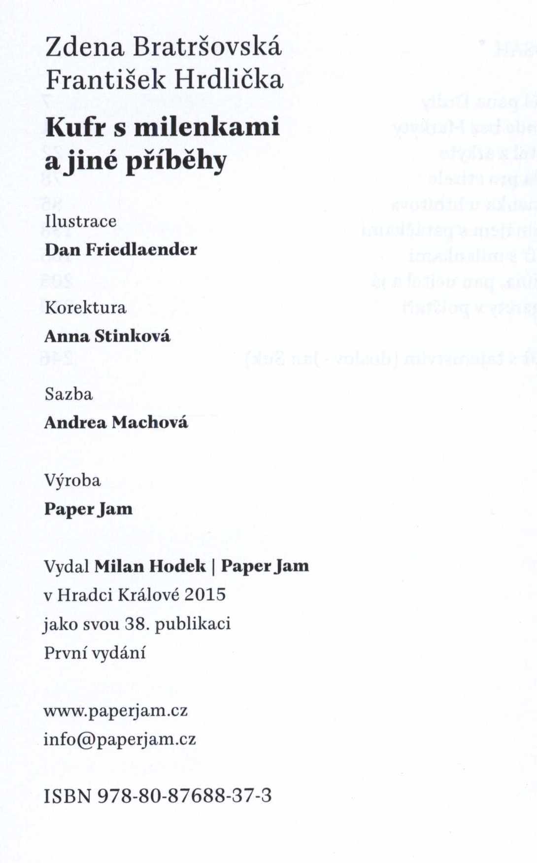 Názvové údaje Kufr s milenkami a jiné příběhy / Zdena Bratršovská, František Hrdlička Osobní jméno Bratršovská, Zdena, 1951- (Autor) Další autoři Hrdlička, František, 1937- (Autor) Korp. Paper Jam (tiskárna) (Nakladatel, vydavatel) (Tiskař) Milan Hodek (nakladatelství) (Nakladatel, vydavatel) Nakladatel V Hradci Králové : Milan Hodek - Paper Jam, 2015 Rozsah 251 stran ; 17 cm Klíčová slova česká próza * české povídky Počet ex. 1, z toho volných 1 Druh dok. monografie Signatura C12a 5700 Názvové údaje Šprýmy s/z rýmy : limericky pro malé i velké / Zdena Bratršovská, František Hrdlička ; ilustrace Alena Krchová Osobní jméno Bratršovská, Zdena, 1951- (Autor) Další autoři Hrdlička, František, 1937- (Autor) Krchová, Alena, 1990- (Ilustrátor) Korp. Milan Hodek (nakladatelství) (Nakladatel, vydavatel) Paper Jam (tiskárna) (Tiskař) Nakladatel V Hradci Králové : Milan Hodek - Paper Jam, 2019 Výrobce Praha : Paper Jam Rozsah 102 stran : barevné ilustrace ; 17 cm Klíčová slova česká poezie * limeriky Počet ex. 1, z toho volných 1 Druh dok. monografie Signatura LITa 0051 Názvové údaje Trylky / Roman Erben Osobní jméno Erben, Roman, 1940- (Autor) (Ilustrátor) Další autoři Milan Hodek (nakladatelství) (Nakladatel, vydavatel) Paper Jam (tiskárna) (Tiskař) Nakladatel V Hradci Králové : Milan Hodek - Paper Jam, 2019 Rozsah 49 nečíslovaných listů : ilustrace ; 16 cm Klíčová slova česká literatura * autorská kniha * poezie * básně * ilustrované vydání Počet ex. 1, z toho volných 1 Druh dok. monografie Signatura LITa 0013