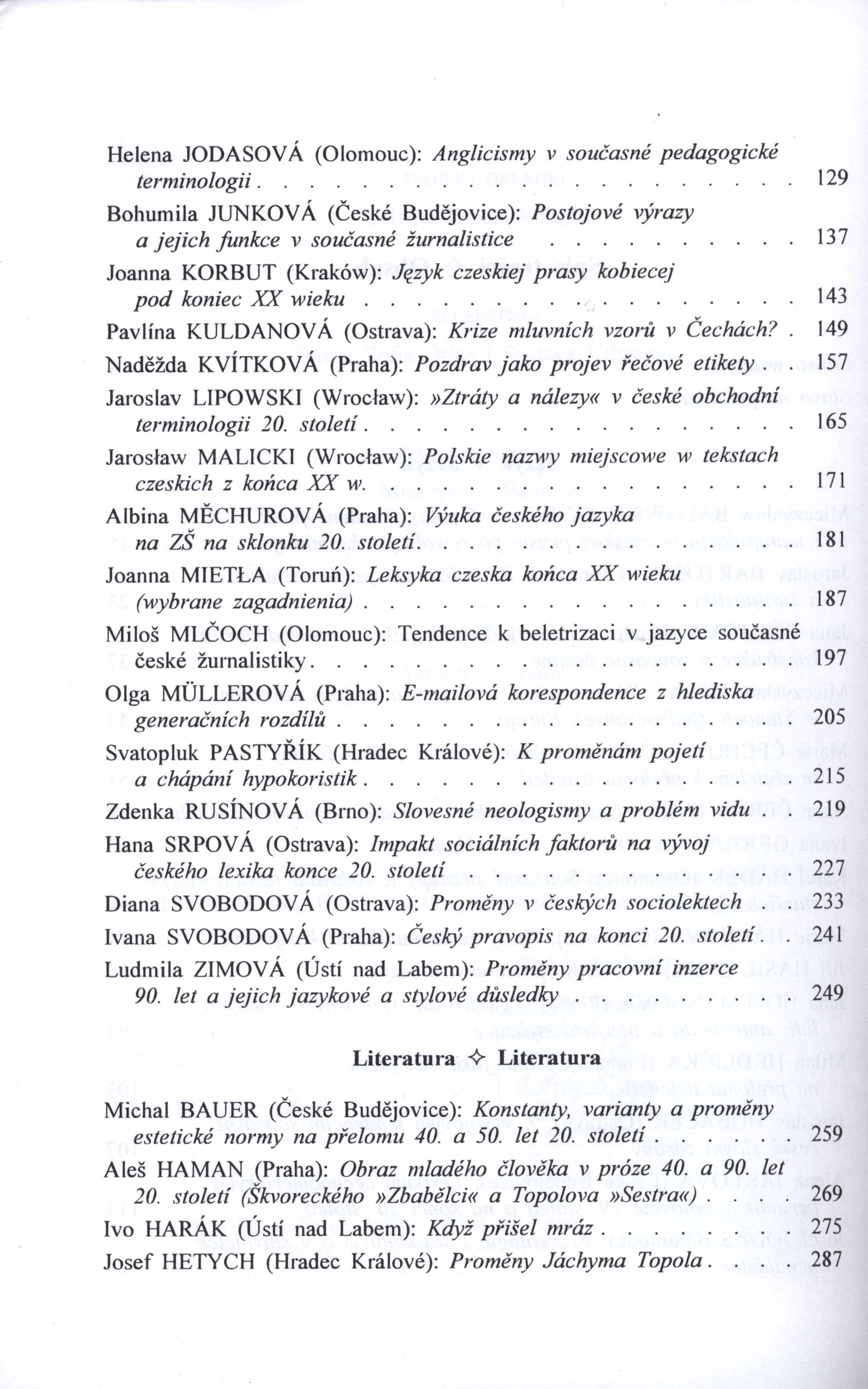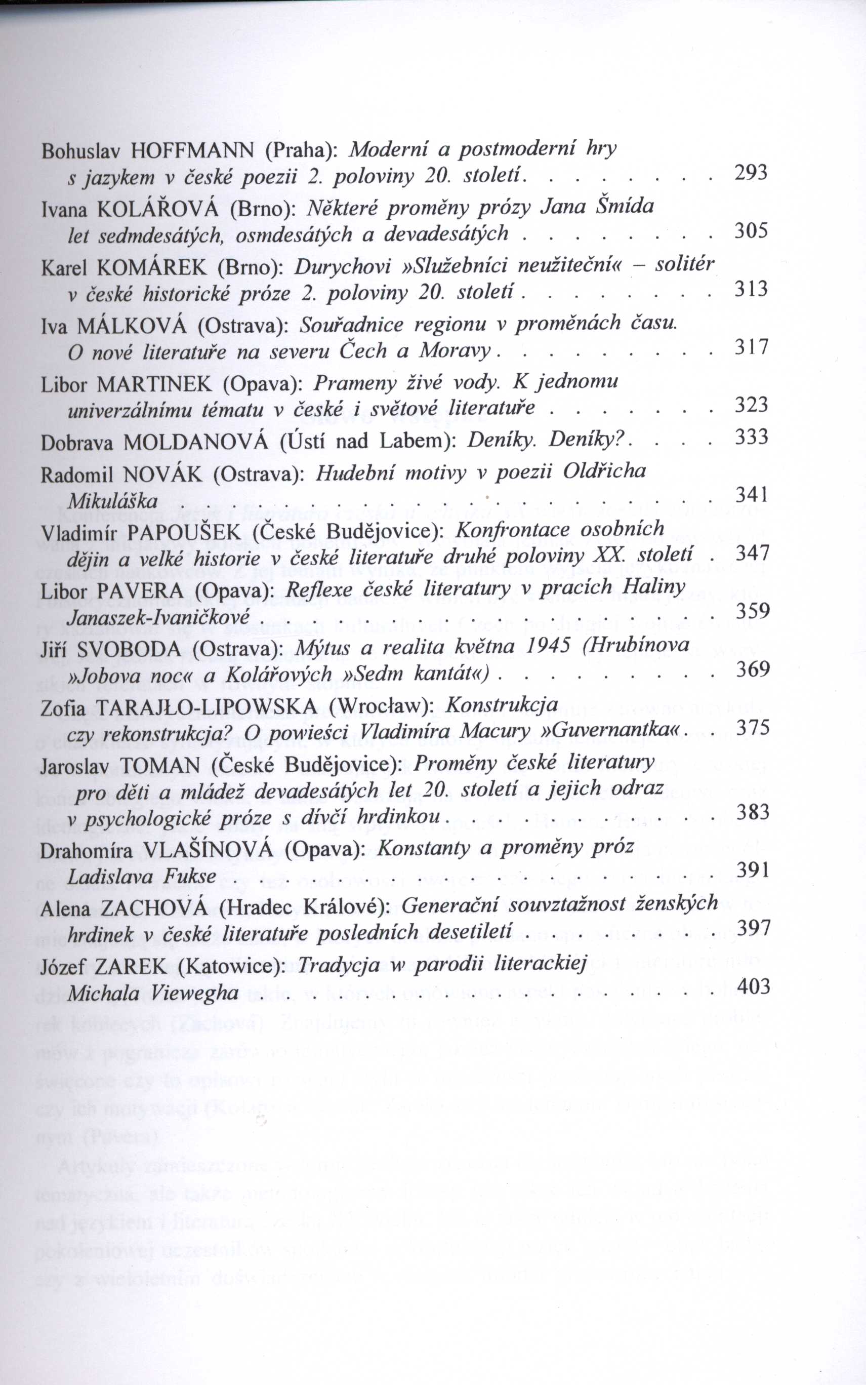 Názvové údaje Francouzský román mezi dvěma světovými válkami / Aleksander Abłamowicz ; [z pol. orig. přel. Helena Stachová ; jmenný rejstř. sest. Karel Blaschke ; přebal, vazba a graf. úpr. Zbyněk Janáček] Osobní jméno Abłamowicz, Aleksander, 1932-2011 (Autor) Další autoři Stachová, Helena, 1931- (Překladatel) Blaschke, Karel (Autor úvodu atd.) Janáček, Zbyněk, 1957- (Grafický technik) (Výtvarník vazby) Korp. Ostravská univerzita. Filozofická fakulta Nakladatelství Tilia (Nakladatel, vydavatel) Nakladatel Šenov u Ostravy : Tilia, 1997 Rozsah 238 s. ; 21 cm Klíčová slova francouzská literatura * teorie literatury * literární kritika * rozbory díla * francouzský román * r. 1918-1939 Počet ex. 1, z toho volných 1 Druh dok. monografie Signatura C12b 1913 Názvové údaje Adam Mickiewicz a Slované : materiály z mezinárodní vědecké konference uskutečněné v Ostravě ve dnech 29.-30. listopadu 2005 u příležitosti 150. výročí úmrtí Adama Mickiewicze / vědecký redaktor Mieczysław Balowski Záhlaví-akce Adam Mickiewicz a Slované (2005 : Ostrava, Česko) Další autoři Balowski, Mieczysław, 1956- (Editor) Korp. Ostravská univerzita. Filozofická fakulta Uniwersytet im. Adama Mickiewicza w Poznaniu (univerzita) Vilniaus Pedagoginis universitetas Nakladatel Ostrava : Ostravská univerzita, Filozofická fakulta, 2008 Rozsah 347 s. : barev. il. ; 21 cm Osobní hesla Mickiewicz, Adam, 1798-1855 - polský básník Klíčová slova polští spisovatelé * polská literatura * stol. 19. * sborníky z konferencí Počet ex. 1, z toho volných 1 Druh dok. monografie Signatura C12b 11599 Názvové údaje Język i literatura czeska u schyłku XX wieku = Český jazyk a literatura na sklonku XX. století / redakcja naukowa Mieczysław Balowski a Jiří Svoboda Záhlaví-akce Český jazyk a literatura na sklonku XX. století (2001 : Ostrava Wałbrzych, Polsko) Další autoři Svoboda, Jiří, 1931- (Editor) Balowski, Mieczysław, 1956- (Editor) Korp. Ostravská univerzita. Filozofická fakulta (Nakladatel, vydavatel) Nakladatel Ostrava : Ostravská univerzita ; Wałbrzych : Państwowa wyższa szkoła zawodowa, 2001 Rozsah 408 s. ; 24 cm Klíčová slova česká literatura * český jazyk * sborníky * sborníky z konferencí Počet ex. 1, z toho volných 1 Druh dok. monografie Signatura R&AHamanovi 0807 Názvové údaje Mluvená čeština na Moravě / Dana Davidová ... [et all.] ; obálka Zbyněk Janáček Osobní jméno Davidová, Dana, 1937-1998 (Autor) Další autoři Bogoczová, Irena, 1961- (Autor úvodu atd.) Fic, Karel, 1946-2005 (Autor úvodu atd.) Hubáček, Jaroslav, 1929-2020 (Autor úvodu atd.) Chloupek, Jan, 1928-2003 (Autor úvodu atd.) Jandová, Eva, 1956- (Autor úvodu atd.) Janáček, Zbyněk, 1957- (Grafický technik) Korp. Ostravská univerzita. Filozofická fakulta (Nakladatel, vydavatel) Nakladatel Ostrava : Filozofická fakulta Ostravské univerzity : Tilia, 1997 Rozsah 171 s. : il. Klíčová slova jazykověda * čeština * mluvená čeština * Morava Počet ex. 1, z toho volných 1 Druh dok. monografie Signatura C12b 1954 Názvové údaje Osobnosti a díla světové literatury pro děti a mládež / Ivana Gejgušová Osobní jméno Gejgušová, Ivana, 1955- (Autor) Další autoři Ostravská univerzita. Katedra českého jazyka a literatury s didaktikou (Ostrava, Česko) Nakladatel Ostrava : Ostravská univerzita, Pedagogická fakulta, 2002 Rozsah 39 s. ; 21 cm Klíčová slova literatura pro děti * literatura pro mládež * světová literatura * narativní povaha díla * dobrodružná literatura * literární výchova * studium * výuka * metodická příručka Počet ex. 2, z toho volných 2 Druh dok. monografie Signatura C12b 6751, C12b 7001 Názvové údaje Sochař Igor Kitzberger : magická síla ohně / Petr Holý ; [přebal, polep a grafickou úpravu navrhl Svatoslav Böhm ; fotografie Vladimír Caletka ... et al. ; překlad resumé Daniela Rywiková (angličtina), Jörg Hochfeld (němčina)] Osobní jméno Holý, Petr, 1933-2010 (Autor) Další autoři Kitzberger, Igor, 1963-2025 (Umělec) Böhm, Svatoslav, 1934-2023 (Autor obálky) Rywiková, Daniela, 1976- (Překladatel) Caletka, Vladimír (Fotograf) Hochfeld, Jörg (Překladatel) Korp. Ostravská univerzita (Ostrava, Česko) (Nakladatel, vydavatel) Nakladatelství Tilia (Nakladatel, vydavatel) Oldřich Harok - Tiskárna (Tiskař) Nakladatel V Ostravě : Ostravská univerzita ; V Šenově u Ostravy : Nakladatelství Tilia, 2006 Výrobce (Tiskárna Oldřicha Haroka) Rozsah 141, [3] s. : il. (převážně barev.), portréty ; 29,6 cm Osobní hesla Kitzberger, Igor, 1963-2025 - sochař, umělecký kovář * Holý, Petr, 1933-2010 - historik umění a estetik, práce v oboru, překladatel, poezie, próza, rozhlasové hry Předmětová hesla české sochařství - 20.-21. stol. * moderní sochařství - Česko Klíčová slova české výtvarné umění * české moderní umění * české sochařství * Kitzberger I. * kovářství * monografie * fotografické publikace Počet ex. 1, z toho volných 1 Druh dok. monografie Signatura NK /06 103 Názvové údaje Heinrich Böll : vzpurný humanista / Norbert Honsza ; [z pol. orig. přel. Helena Stachová ; něm. citáty v pol. orig. do češ. přel. Eva Pátková ; bibliogr. ses. Ivan Stupek ; jmenný rejstř. ses. Karel Blaschke ; přebal, vazba a graf. úpr. Zbyněk Janáček] Osobní jméno Honsza, Norbert, 1933- (Autor) Další autoři Stachová, Helena, 1931- (Překladatel) Pátková, Eva, 1938- (Překladatel) Stupek, Ivan, 1943- (Autor úvodu atd.) Blaschke, Karel (Autor úvodu atd.) Janáček, Zbyněk, 1957- (Grafický technik) (Výtvarník vazby) Korp. Ostravská univerzita. Filozofická fakulta (Nakladatel, vydavatel) Nakladatelství Tilia (Nakladatel, vydavatel) Nakladatel Ostrava : Tilia, 1997 Rozsah 174 s. Osobní hesla Böll, Heinrich, 1917-1985 - německý spisovatel Klíčová slova polská liter