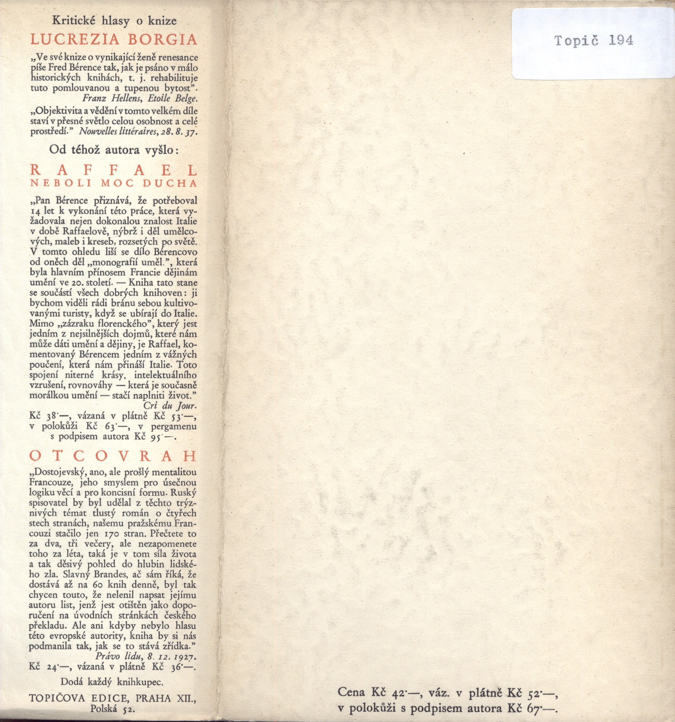 Názvové údaje Slovo k mladým / Kamil Bednář Osobní jméno Bednář, Kamil, 1912-1972 (Autor) Další autoři Václav Petr (nakladatelství) (Nakladatel, vydavatel) Osvěta (tiskárna) (Nakladatel, vydavatel) Nakladatel Praha : Václav Petr, 1940 Výrobce Ve Valašském Meziříčí : Osvěta Rozsah 29 stran ; 19 cm Klíčová slova česká mládež * poválečné období * poválečná generace * vliv literatury * mladí básníci * básnická tvorba * úvahy Počet ex. 3, z toho volných 2 Druh dok. monografie Signatura ZKSlabý 0225, P 114 G 67, P 37 a 48 Názvové údaje Veliký mrtvý / Kamil Bednář ; [obálka a úprava Jaroslava Švába] Osobní jméno Bednář, Kamil, 1912-1972 (Autor) Další autoři Šváb, Jaroslav, 1906-1999 (Knižní grafik) (Autor obálky) Korp. Václav Petr (nakladatelství) (Nakladatel, vydavatel) Osvěta (tiskárna) (Tiskař) Nakladatel Praha : Václav Petr, 1940 Výrobce (Osvěta Rozsah 30 s. Klíčová slova česká literatura * česká poezie Počet ex. 3, z toho volných 3 Druh dok. monografie Signatura VHB 0241, P 33 C 42, M 174 d 90 Názvové údaje Vlastní životopis jejž pro své děti a potomky roku 1763 napsal František Benda královský pruský koncertní mistr / přeložil a vysvětlivkami opatřil Jaroslav Čeleda Osobní jméno Benda, František, 1709-1786 (Autor) Další autoři Čeleda, Jaroslav, 1890-1974 (Překladatel) (Autor úvodu atd.) Korp. Topičova edice (nakladatelství) (Nakladatel, vydavatel) Osvěta (tiskárna) (Tiskař) Nakladatel V Praze : Topičova edice, 1939 Výrobce Osvěta) Rozsah 63 s., [8] l. obr. příl. : il. Osobní hesla Benda, František, 1709-1786 - houslový virtuos, skladatel, pruský koncertní mistr, pedagog Klíčová slova česká literatura * německy psaná literatura * životopis * česká hudba * čeští hudebníci * České království * Prusko * Německo * stol. 18. Počet ex. 2, z toho volných 2 Druh dok. monografie Signatura Leschinger 178, KaG XLV D 34 Názvové údaje Čajkovskij / Nina Berberova ; z ruštiny přeložil Stanislav Minařík ; [dřevoryt a grafická úprava Cyrila Boudy] Osobní jméno Berberova, Nina Nikolajevna, 1901-1993 (Autor) Další autoři Minařík, Stanislav, 1884-1944 (Překladatel) Bouda, Cyril, 1901-1984 (Ilustrátor) (Knižní grafik) Korp. Topičova edice (nakladatelství) (Nakladatel, vydavatel) Osvěta (tiskárna) (Tiskař) Nakladatel V Praze : Topičova edice, 1937 Výrobce Osvěta, společnost s o. r.) Rozsah 261 s. : il. ; 23 cm Osobní hesla Čajkovskij, Petr Il‘jič, 1840-1893 - ruský skladatel, hudební kritik, teoretik a dirigent Klíčová slova ruská literatura * překlad * próza * román * životopisný román * Čajkovskij P. I. Počet ex. 1, z toho volných 1 Druh dok. monografie Signatura Topič 0195 Názvové údaje Lionardo da Vinci, dělník rozumu / Fred Bérence ; z francouzštiny přeložil Duchoslav Foršt ; [dřevoryt a grafická úprava Cyrila Boudy] Osobní jméno Bérence, Fred, 1889-1977 (Autor) Další autoři Foršt, Duchoslav, 1901-1983 (Překladatel) Bouda, Cyril, 1901-1984 (Ilustrátor) (Knižní grafik) Korp. Topičova edice (nakladatelství) (Nakladatel, vydavatel) Osvěta (tiskárna) (Tiskař) Nakladatel V Praze : Topičova edice, 1939 Výrobce Osvěta, společnost s o. r.) Rozsah 369 s., [2] l. obr. příl. : il. ; 22 cm Osobní hesla Leonardo, da Vinci, 1452-1519 - italský malíř, sochař, architekt a vědec Klíčová slova francouzská literatura * próza * překlad * monografie * biografie * Leonardo da Vinci * italské malířství * obrazové přílohy Počet ex. 1, z toho volných 1 Druh dok. monografie Signatura Topič 0101 Názvové údaje Lucrezia Borgia / Fred Bérence ; z francouzštiny přeložil Václav Renč ; [dřevoryt a grafická úprava Cyrila Boudy] Osobní jméno Bérence, Fred, 1889-1977 (Autor) Další autoři Renč, Václav, 1911-1973 (Překladatel) Bouda, Cyril, 1901-1984 (Ilustrátor) (Knižní grafik) Korp. Topičova edice (nakladatelství) (Nakladatel, vydavatel) Osvěta (tiskárna) (Tiskař) Nakladatel V Praze : Topičova edice, 1940 Výrobce Osvěta, společnost s o. r.) Rozsah 358 s. : il. ; 22 cm Osobní hesla Borgia, Lucrezia, vévodkyně z Ferrary, 1480-1519 - italská šlechtična Klíčová slova francouzská literatura * překlad * próza * román * historický román * Borgia L. Počet ex. 1, z toho volných 1 Druh dok. monografie Signatura Topič 0194 Názvové údaje Jan Erazím Vocel, zakladatel našich dějin umění / Vojtěch Birnbaum Osobní jméno Birnbaum, Vojtěch, 1877-1934 (Autor) Další autoři Václav Petr (nakladatelství) (Nakladatel, vydavatel) Osvěta (tiskárna) (Tiskař) Nakladatel Praha : Václav Petr, 1942 Výrobce (Ve Valašském Meziříčí : Osvěta) Rozsah 31 stran Osobní hesla Vocel, Jan Erazim, 1802-1871 - archeolog, literární historik, redaktor, básník Klíčová slova česká literatura * dějiny umění * stol. 19. Počet ex. 2, z toho volných 2 Druh dok. monografie Signatura KaG XXXIII G 6, KaG LXV 607 Názvové údaje Ženy doby přemyslovské / Alžběta Birnbaumová Osobní jméno Birnbaumová, Alžběta, 1898-1967 (Autor) Další autoři Václav Petr (nakladatelství) (Nakladatel, vydavatel) Osvěta (tiskárna) (Tiskař) Nakladatel Praha : Václav Petr, 1940 Výrobce Osvěta) Rozsah 31 s. Klíčová slova česká literatura * česká historie * české dějiny * Přemyslovci * středověk * žena * ženy Počet ex. 1, z toho volných 1 Druh dok. monografie Signatura VHB 0268 Názvové údaje Inferiorita české literatury katolické / Vilém Bitnar Osobní jméno Bitnar, Vilém, 1874-1948 (Autor) Další autoři Václav Petr (nakladatelství) (Nakladatel, vydavatel) Osvěta (tiskárna) (Tiskař) Nakladatel Praha : Václav Petr, 1941 Výrobce Osvěta) Rozsah 29 s. Klíčová slova česká literatura * dějiny české literatury * katolicismus * katolíci * katolická literatura Počet ex. 1, z toho volných 1 Druh dok. monografie Si