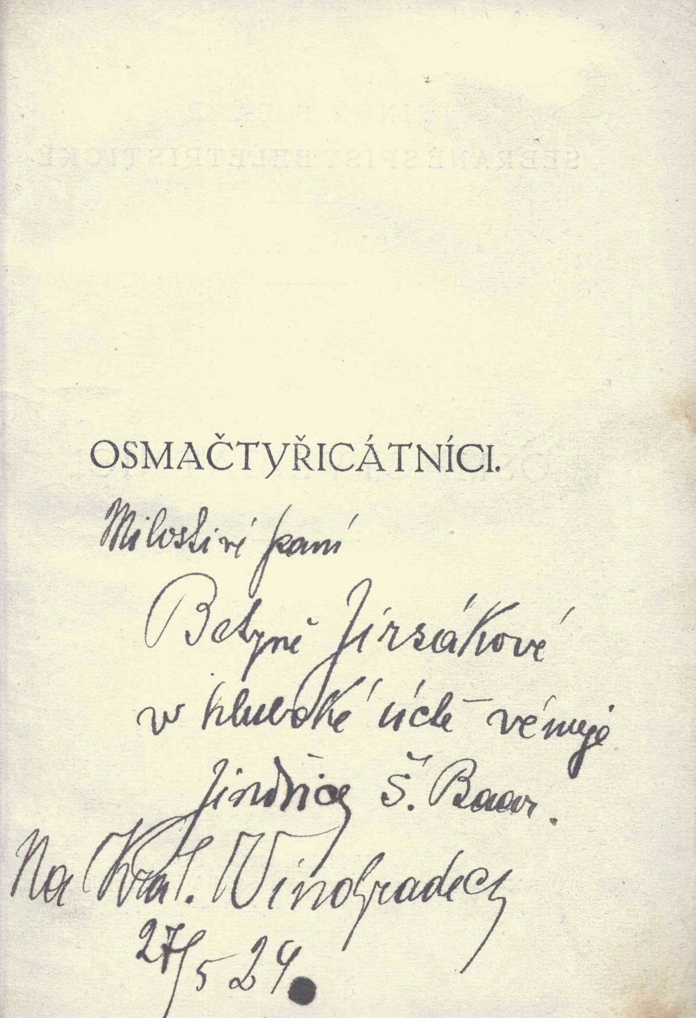 Názvové údaje Druhá kniha z přírody / Jindřich Š. Baar Osobní jméno Baar, Jindřich Šimon, 1869-1925 (Autor) Další autoři Českomoravské podniky tiskařské a vydavatelské. 1908-1918 (Praha, Bratislava (Československo)) (Nakladatel, vydavatel) Rolnická tiskárna (tiskárna) (Tiskař) Nakladatel V Praze : Českomoravské podniky tiskařské a vydavatelské, 1930 Výrobce (Tiskem Rolnické tiskárny) Rozsah 286 s. Klíčová slova česká literatura * česká próza * česká beletrie * sbírka povídek * příhody o zvířatech * r. 1930 Počet ex. 1, z toho volných 1 Druh dok. monografie Signatura AVrbova 391 Názvové údaje Farská panička ; Kohouti : (Farských historek díl 2.) / Jindřich Š. Baar Osobní jméno Baar, Jindřich Šimon, 1869-1925 (Autor) Další autoři Českomoravské podniky tiskařské a vydavatelské. 1908-1918 (Praha, Bratislava (Československo)) (Nakladatel, vydavatel) Rolnická tiskárna (tiskárna) (Tiskař) Nakladatel V Praze : Českomoravské podniky tiskařské a vydavatelské, 1927 Výrobce Tiskem Rolnické tiskárny Rozsah 290 stran Klíčová slova česká próza * český román * katolická literatura * venkov Počet ex. 2, z toho volných 2 Druh dok. monografie Signatura VHB 0249, P 62 e 6 Názvové údaje Hu nás : povídky z chodské hyjty / Jindřich Š. Baar Osobní jméno Baar, Jindřich Šimon, 1869-1925 (Autor) Další autoři Českomoravské podniky tiskařské a vydavatelské. 1908-1918 (Praha, Bratislava (Československo)) (Nakladatel, vydavatel) Rolnická tiskárna (tiskárna) (Tiskař) Nakladatel V Praze : Českomoravské podniky tiskařské a vydavatelské, 1927 Výrobce (Rolnická tiskárna) Rozsah 241 s. Klíčová slova česká literatura * česká próza * česká beletrie * vesnické povídky * Chodsko * stol. 19. * r. 1927 Počet ex. 1, z toho volných 1 Druh dok. monografie Signatura AVrbova 389 Názvové údaje Chodské povídky a pohádky / Jindřich Š. Baar ; [ilustrace Artuš Scheiner]. Řada II Osobní jméno Baar, Jindřich Šimon, 1869-1925 (Autor) Další autoři Scheiner, Artuš, 1863-1938 (Ilustrátor) Korp. Československé podniky tiskařské a vydavatelské (v Praze (Česko)) (Nakladatel, vydavatel) Rolnická tiskárna (tiskárna) (Tiskař) Nakladatel V Praze : Československé podniky tiskařské a vydavatelské, 1922 Výrobce Rolnická tiskárna Rozsah 76 stran, 8 nečíslovaných listů obrazových příloh : ilustrace Klíčová slova česká literatura * Chodsko * pohádky * povídky * lidová slovesnost Počet ex. 2, z toho volných 2 Druh dok. monografie Signatura AVrbova 054, P 61 a 12 Názvové údaje Jan Cimbura : jihočeská idylla / Jindřich Š. Baar Osobní jméno Baar, Jindřich Šimon, 1869-1925 (Autor) Další autoři Českomoravské podniky tiskařské a vydavatelské. 1908-1918 (Praha, Bratislava (Československo)) (Nakladatel, vydavatel) Rolnická tiskárna (tiskárna) (Tiskař) Nakladatel V Praze : Českomoravské podniky tiskařské a vydavatelské, 1927 Výrobce Rolnická tiskárna Rozsah 414 stran ; 19 cm Klíčová slova česká literatura * katolická literatura * román * venkov Počet ex. 2, z toho volných 2 Druh dok. monografie Signatura VHB 0250, P 88 e 31 Názvové údaje Lůsy : III. díl románu "Paní komisarka" / Jindřich Š. Baar ; [doslov napsal F. Teplý] Osobní jméno Baar, Jindřich Šimon, 1869-1925 (Autor) Další autoři Teplý, František, 1867-1945 (Autor doslovu, tiráže atd.) Korp. Českomoravské podniky tiskařské a vydavatelské. 1908-1918 (Praha, Bratislava (Československo)) Rolnická tiskárna (tiskárna) (Tiskař) Nakladatel V Praze : Českomoravské podniky tiskařské a vydavatelské, 1925 Výrobce (Rolnická tiskárna) Rozsah 528, VII s. Klíčová slova česká literatura * česká próza * česká beletrie * historický román * vesnický román * Chodsko * chodský venkov * život na Chodsku * Klenčí pod Čerchovem * Faster P. * stol. 19., léta 40. * r. 1925 Počet ex. 1, z toho volných 1 Druh dok. monografie Signatura AVrbova 387 Názvové údaje Osmačtyřicátníci : díl II. románu "Paní komisarka" / Jindřich Š. Baar Osobní jméno Baar, Jindřich Šimon, 1869-1925 (Autor) (Dedikátor) Další autoři Československé podniky tiskařské a vydavatelské (v Praze (Česko)) (Nakladatel, vydavatel) Rolnická tiskárna (tiskárna) (Tiskař) Nakladatel V Praze : Nákladem Československých podniků tiskařských a vydavatelských, 1924 Výrobce Rolnická tiskárna Rozsah 486 stran Klíčová slova česká próza * historický román * vesnický román * Chodsko * chodský venkov * život na Chodsku * Klenčí pod Čerchovem * Faster P. * kníže Windischgraetz * hrabě Stadion R. * hrabě Stadion F. * stol. 19., léta 40. * r. 1848 * r. 1924 Počet ex. 2, z toho volných 2 Druh dok. monografie Signatura AVrbova 386, P 62 f 34 Názvové údaje Paní komisarka : chodský obrázek z doby předbřeznové / Jindřich Š. Baar Osobní jméno Baar, Jindřich Šimon, 1869-1925 (Autor) (Dedikátor) Další autoři Československé podniky tiskařské a vydavatelské (v Praze (Česko)) (Nakladatel, vydavatel) Rolnická tiskárna (tiskárna) (Tiskař) Nakladatel V Praze : Nákladem Československých podniků tiskařských a vydavatelských, 1923 Výrobce Rolnická tiskárna Rozsah 460 stran Klíčová slova česká literatura * česká próza * česká beletrie * historický román * vesnický román * Chodsko * chodský venkov * život na Chodsku * chodské tradice * chodské zvyky * Klenčí pod Čerchovem * Němcová B. * stol. 19., léta 40. * r. 1923 Počet ex. 2, z toho volných 2 Druh dok. monografie Signatura AVrbova 385, P 62 f 23 Názvové údaje Panská přízeň a jiné povídky. Kniha druhá, Hu nás / Jindřich Š. Baar Osobní jméno Baar, Jindřich Šimon, 1869-1925 (Autor) Další autoři Českomoravské podniky tiskařské a vydavatelské. 1908-1918 (Praha, Bratislava (Československo)) (Nakladatel, vydavatel) Rolnic