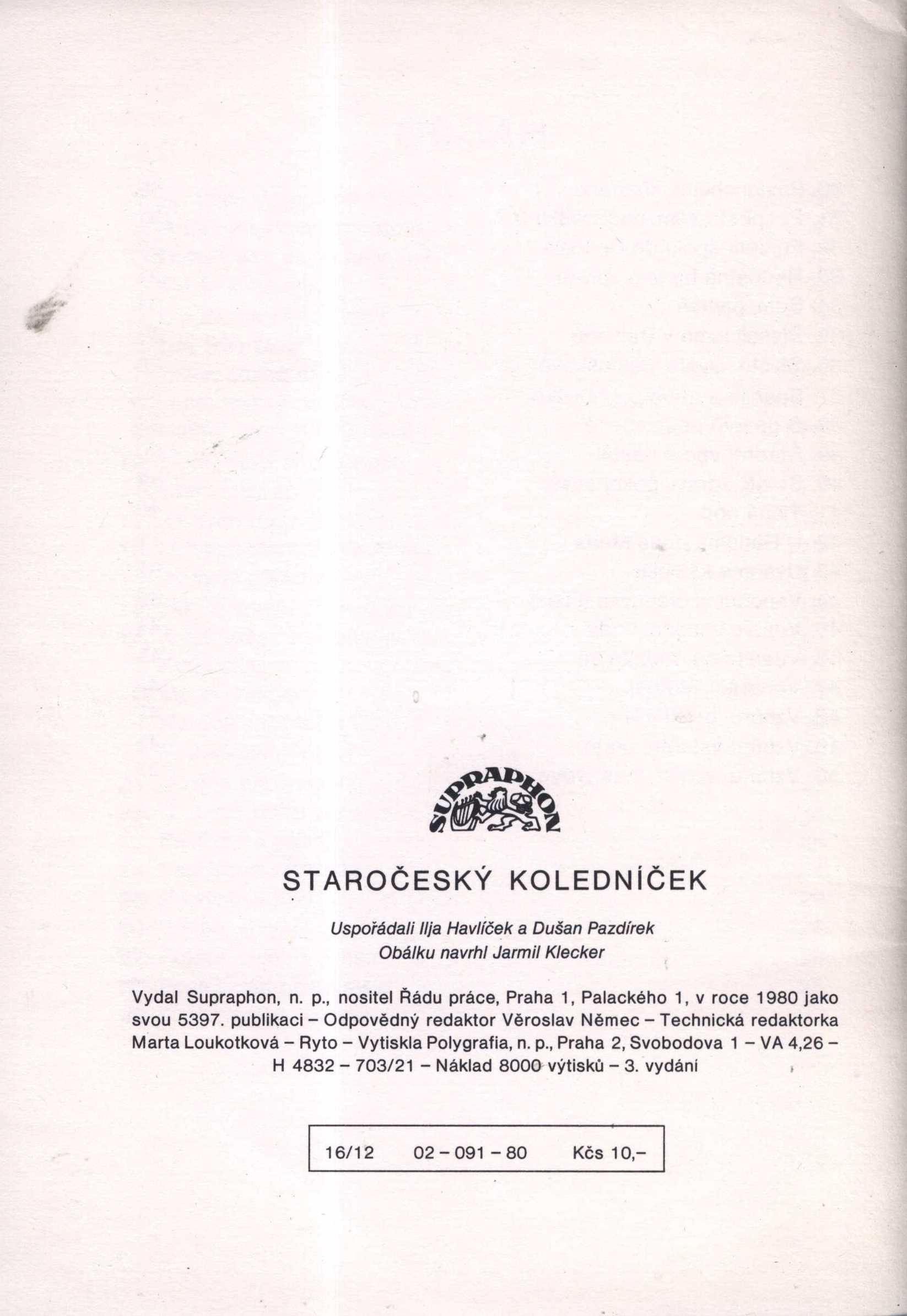Názvové údaje Staročeský koledníček : 50 koled pro zpěv s doprovodem harmonia, varhan nebo klavíru / uspořádali Ilja Havlíček a Dušan Pazdírek ; [obálku navrhl Jarmil Klecker] Další autoři Havlíček, Ilja, 1927- (Sestavovatel, kompilátor) Pazdírek, Dušan (Sestavovatel, kompilátor) Klecker, Jarmil, 1926-1997 (Autor obálky) Korp. Supraphon (Nakladatel, vydavatel) Polygrafia (Tiskař) Nakladatel Praha : Supraphon, 1980 Výrobce Polygrafia) Rozsah 49 s. : il. + noty Klíčová slova hudba * vánoční písně * koledy * zpěvy Počet ex. 1, z toho volných 1 Druh dok. monografie Signatura BVolkova 0173