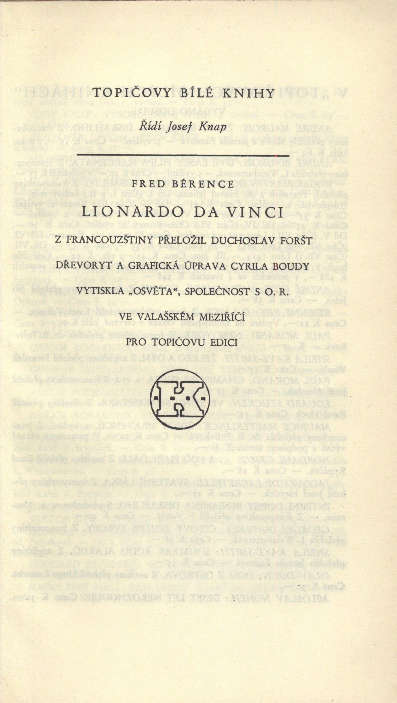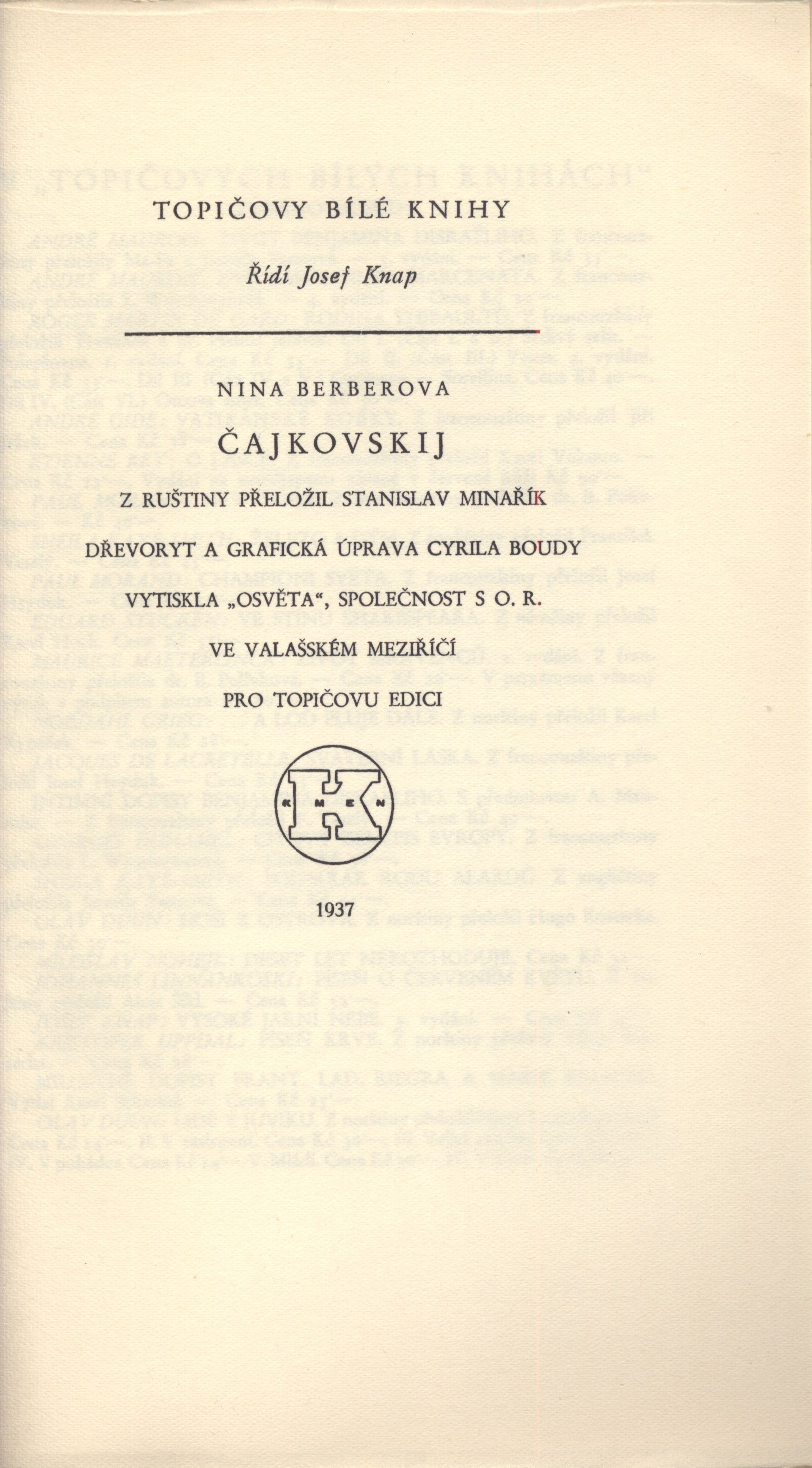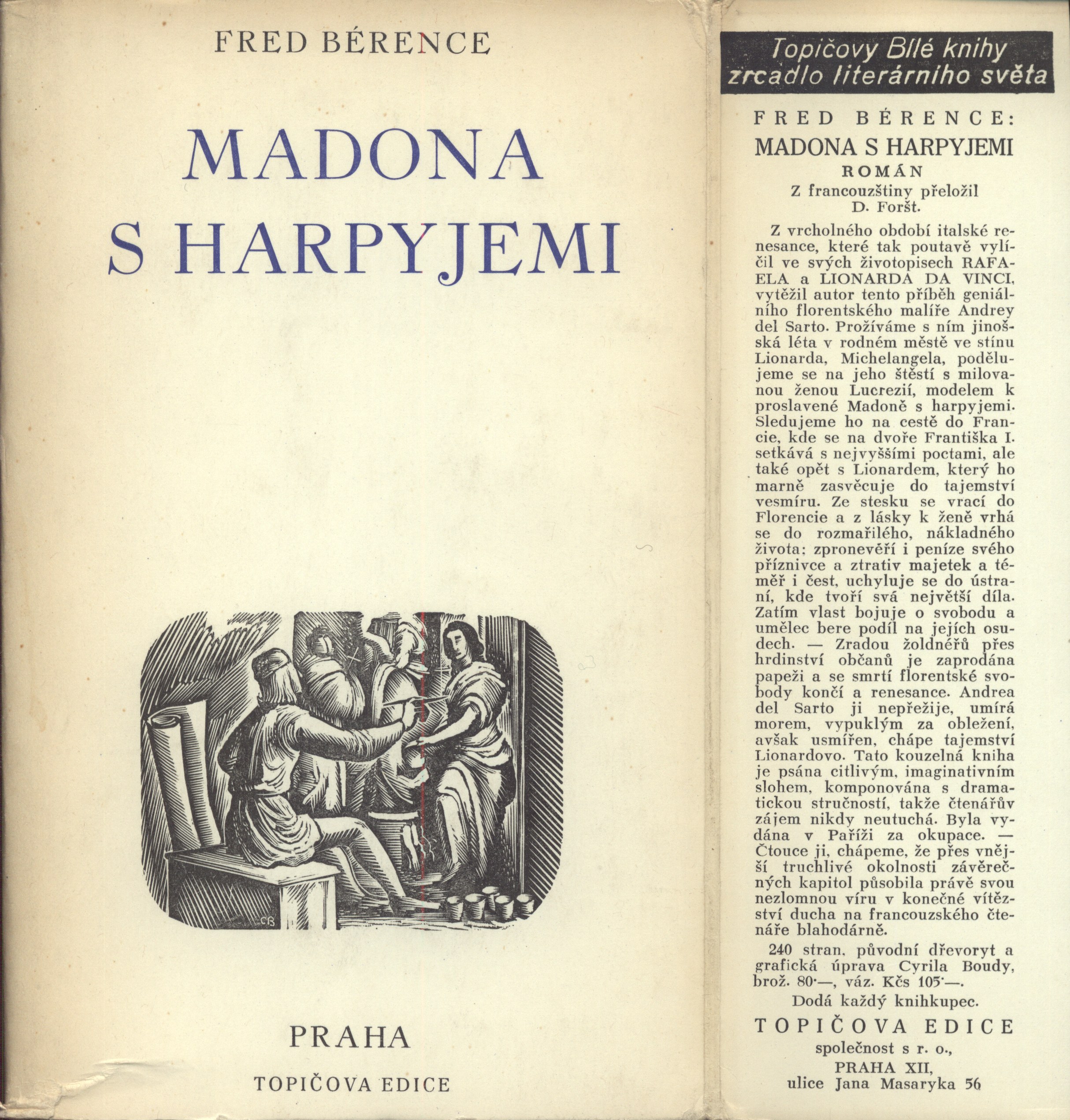 Názvové údaje Akty / Mikoláš Aleš ; vybral a úvodní slovo napsal Emanuel Svoboda ; graficky upravil Cyril Bouda Osobní jméno Aleš, Mikoláš, 1852-1913 (Umělec) (Ilustrátor) Další autoři Svoboda, Emanuel, 1883-1967 (Sestavovatel, kompilátor) (Autor doslovu, tiráže atd.) Bouda, Cyril, 1901-1984 (Knižní grafik) Korp. Topičova edice (nakladatelství) (Nakladatel, vydavatel) Družstvo knihtiskárny (tiskárna, Hranice, Přerov) (Tiskař) Nakladatel V Praze : Topičova edice, 1942 Výrobce V Hranicích : Družstvo knihtiskárny Rozsah xliv, 189 srean : ilustrace ; 24 cm Osobní hesla Aleš, Mikoláš, 1852-1913 - malíř, kreslíř a ilustrátor Klíčová slova české výtvarné umění * Aleš M. * akty * obrazové publikace Počet ex. 2, z toho volných 2 Druh dok. monografie Signatura Topič 0684, Knytl 1834 Názvové údaje Všehochuť : knížka veselých obrázků / nakreslil Mikoláš Aleš ; srovnal a slovem doprovodil Adolf Wenig Osobní jméno Aleš, Mikoláš, 1852-1913 (Ilustrátor) Další autoři Wenig, Adolf, 1874-1940 (Sestavovatel, kompilátor) (Autor) Korp. Topičova edice (nakladatelství) (Nakladatel, vydavatel) Českoslovanská akciová tiskárna (Tiskař) Nakladatel V Praze : Topičova edice, 1939 Výrobce Českoslovanská akciová tiskárna Rozsah 81 stran : ilustrace Klíčová slova česká próza * příběhy Počet ex. 1, z toho volných 1 Druh dok. monografie Signatura P 78 a 67 Názvové údaje Památník z Beethovenových slov / [uspořádal] Richard Benz ; [z němčiny] přeložil Antonín Němec ; obálka a grafická úprava Cyrila Boudy] Osobní jméno Beethoven, Ludwig van, 1770-1827 (Umělec) Další autoři Benz, Richard, 1884-1966 (Sestavovatel, kompilátor) Němec, Antonín, 1894-1958 (Překladatel) Bouda, Cyril, 1901-1984 (Autor obálky) (Knižní grafik) Korp. Topičova edice (nakladatelství) (Nakladatel, vydavatel) Müller a spol. (tiskárna) (Tiskař) Nakladatel V Praze : Topičova edice, 1941 Výrobce knihtiskárna Müller a spol.) Rozsah 80 s. ; 20 cm Osobní hesla Beethoven, Ludwig van, 1770-1827 - německý skladatel Klíčová slova hudebníci * němečtí umělci * Beethoven L. van * autobiografický text * překlad Počet ex. 1, z toho volných 1 Druh dok. monografie Signatura Topič 0335 Názvové údaje Vlastní životopis jejž pro své děti a potomky roku 1763 napsal František Benda královský pruský koncertní mistr / přeložil a vysvětlivkami opatřil Jaroslav Čeleda Osobní jméno Benda, František, 1709-1786 (Autor) Další autoři Čeleda, Jaroslav, 1890-1974 (Překladatel) (Autor úvodu atd.) Korp. Topičova edice (nakladatelství) (Nakladatel, vydavatel) Osvěta (tiskárna) (Tiskař) Nakladatel V Praze : Topičova edice, 1939 Výrobce Osvěta) Rozsah 63 s., [8] l. obr. příl. : il. Osobní hesla Benda, František, 1709-1786 - houslový virtuos, skladatel, pruský koncertní mistr, pedagog Klíčová slova česká literatura * německy psaná literatura * životopis * česká hudba * čeští hudebníci * České království * Prusko * Německo * stol. 18. Počet ex. 2, z toho volných 2 Druh dok. monografie Signatura Leschinger 178, KaG XLV D 34 Názvové údaje Čajkovskij / Nina Berberova ; z ruštiny přeložil Stanislav Minařík ; [dřevoryt a grafická úprava Cyrila Boudy] Osobní jméno Berberova, Nina Nikolajevna, 1901-1993 (Autor) Další autoři Minařík, Stanislav, 1884-1944 (Překladatel) Bouda, Cyril, 1901-1984 (Ilustrátor) (Knižní grafik) Korp. Topičova edice (nakladatelství) (Nakladatel, vydavatel) Osvěta (tiskárna) (Tiskař) Nakladatel V Praze : Topičova edice, 1937 Výrobce Osvěta, společnost s o. r.) Rozsah 261 s. : il. ; 23 cm Osobní hesla Čajkovskij, Petr Il‘jič, 1840-1893 - ruský skladatel, hudební kritik, teoretik a dirigent Klíčová slova ruská literatura * překlad * próza * román * životopisný román * Čajkovskij P. I. Počet ex. 1, z toho volných 1 Druh dok. monografie Signatura Topič 0195 Názvové údaje Lionardo da Vinci, dělník rozumu / Fred Bérence ; z francouzštiny přeložil Duchoslav Foršt ; [dřevoryt a grafická úprava Cyrila Boudy] Osobní jméno Bérence, Fred, 1889-1977 (Autor) Další autoři Foršt, Duchoslav, 1901-1983 (Překladatel) Bouda, Cyril, 1901-1984 (Ilustrátor) (Knižní grafik) Korp. Topičova edice (nakladatelství) (Nakladatel, vydavatel) Osvěta (tiskárna) (Tiskař) Nakladatel V Praze : Topičova edice, 1939 Výrobce Osvěta, společnost s o. r.) Rozsah 369 s., [2] l. obr. příl. : il. ; 22 cm Osobní hesla Leonardo, da Vinci, 1452-1519 - italský malíř, sochař, architekt a vědec Klíčová slova francouzská literatura * próza * překlad * monografie * biografie * Leonardo da Vinci * italské malířství * obrazové přílohy Počet ex. 1, z toho volných 1 Druh dok. monografie Signatura Topič 0101 Názvové údaje Lucrezia Borgia / Fred Bérence ; z francouzštiny přeložil Václav Renč ; [dřevoryt a grafická úprava Cyrila Boudy] Osobní jméno Bérence, Fred, 1889-1977 (Autor) Další autoři Renč, Václav, 1911-1973 (Překladatel) Bouda, Cyril, 1901-1984 (Ilustrátor) (Knižní grafik) Korp. Topičova edice (nakladatelství) (Nakladatel, vydavatel) Osvěta (tiskárna) (Tiskař) Nakladatel V Praze : Topičova edice, 1940 Výrobce Osvěta, společnost s o. r.) Rozsah 358 s. : il. ; 22 cm Osobní hesla Borgia, Lucrezia, vévodkyně z Ferrary, 1480-1519 - italská šlechtična Klíčová slova francouzská literatura * překlad * próza * román * historický román * Borgia L. Počet ex. 1, z toho volných 1 Druh dok. monografie Signatura Topič 0194 Názvové údaje Madona s harpyjemi : román / Fred Bérence ; z francouzštiny přeložil Duchoslav Foršt ; [dřevoryt a grafická úprava Cyrila Boudy] Osobní jméno Bérence, Fred, 1889-1977 (Autor) Další autoři Foršt, Duchoslav, 1901-1983 (Překladatel) Bouda, Cyril, 1901-1984 (Ilustrátor) (Knižní grafik) Korp. Topičova edice (nakladat