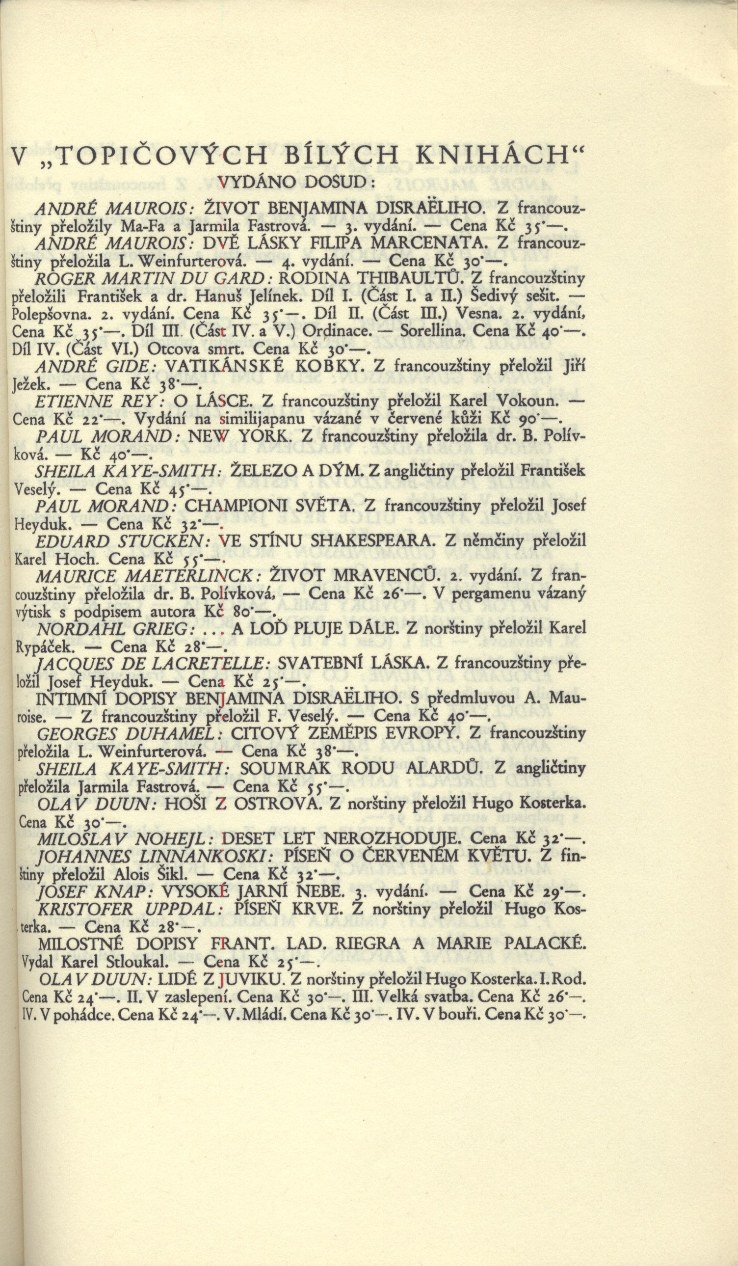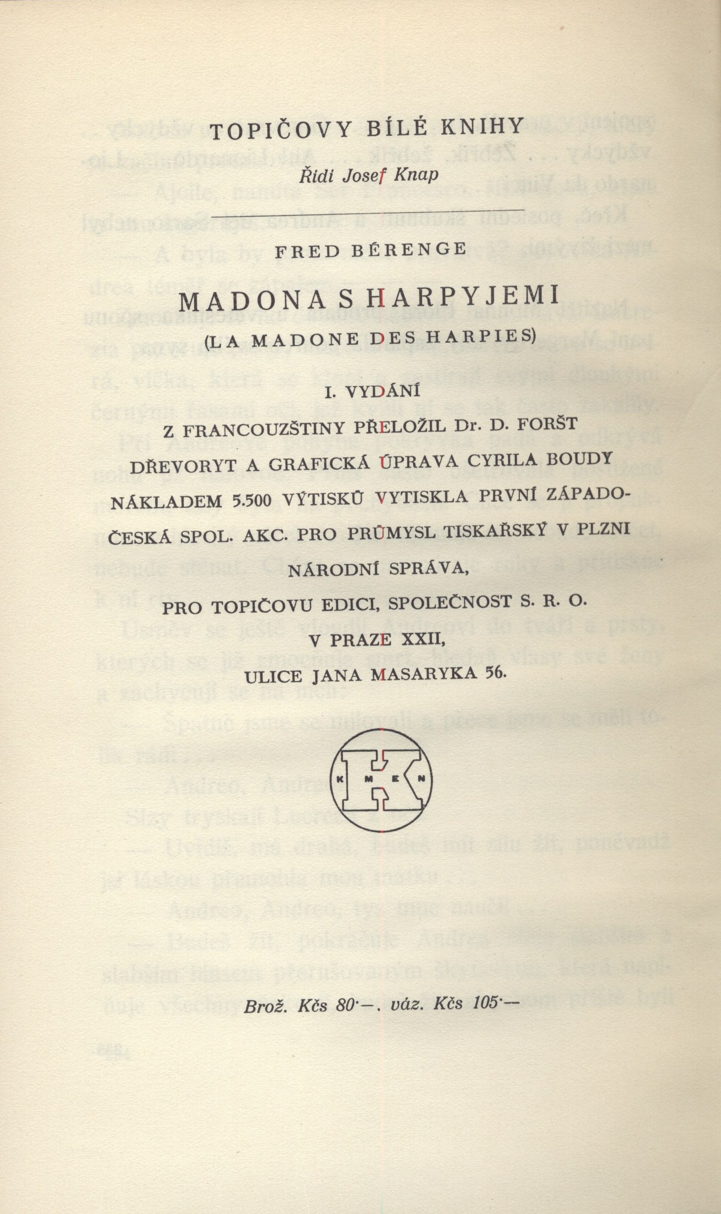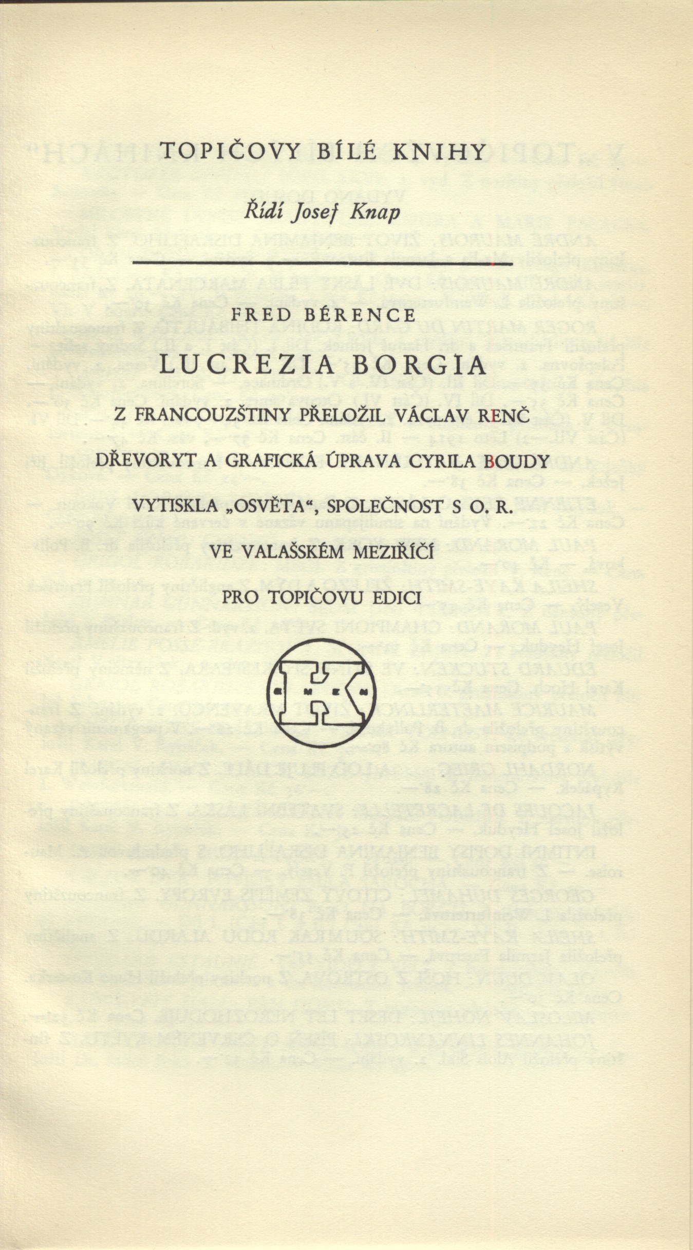Názvové údaje Akty / Mikoláš Aleš ; vybral a úvodní slovo napsal Emanuel Svoboda ; graficky upravil Cyril Bouda Osobní jméno Aleš, Mikoláš, 1852-1913 (Umělec) (Ilustrátor) Další autoři Svoboda, Emanuel, 1883-1967 (Sestavovatel, kompilátor) (Autor doslovu, tiráže atd.) Bouda, Cyril, 1901-1984 (Knižní grafik) Korp. Topičova edice (nakladatelství) (Nakladatel, vydavatel) Družstvo knihtiskárny (tiskárna, Hranice, Přerov) (Tiskař) Nakladatel V Praze : Topičova edice, 1942 Výrobce V Hranicích : Družstvo knihtiskárny Rozsah xliv, 189 srean : ilustrace ; 24 cm Osobní hesla Aleš, Mikoláš, 1852-1913 - malíř, kreslíř a ilustrátor Klíčová slova české výtvarné umění * Aleš M. * akty * obrazové publikace Počet ex. 2, z toho volných 2 Druh dok. monografie Signatura Topič 0684, Knytl 1834 Názvové údaje Všehochuť : knížka veselých obrázků / nakreslil Mikoláš Aleš ; srovnal a slovem doprovodil Adolf Wenig Osobní jméno Aleš, Mikoláš, 1852-1913 (Ilustrátor) Další autoři Wenig, Adolf, 1874-1940 (Sestavovatel, kompilátor) (Autor) Korp. Topičova edice (nakladatelství) (Nakladatel, vydavatel) Českoslovanská akciová tiskárna (Tiskař) Nakladatel V Praze : Topičova edice, 1939 Výrobce Českoslovanská akciová tiskárna Rozsah 81 stran : ilustrace Klíčová slova česká próza * příběhy Počet ex. 1, z toho volných 1 Druh dok. monografie Signatura P 78 a 67 Názvové údaje Památník z Beethovenových slov / [uspořádal] Richard Benz ; [z němčiny] přeložil Antonín Němec ; obálka a grafická úprava Cyrila Boudy] Osobní jméno Beethoven, Ludwig van, 1770-1827 (Umělec) Další autoři Benz, Richard, 1884-1966 (Sestavovatel, kompilátor) Němec, Antonín, 1894-1958 (Překladatel) Bouda, Cyril, 1901-1984 (Autor obálky) (Knižní grafik) Korp. Topičova edice (nakladatelství) (Nakladatel, vydavatel) Müller a spol. (tiskárna) (Tiskař) Nakladatel V Praze : Topičova edice, 1941 Výrobce knihtiskárna Müller a spol.) Rozsah 80 s. ; 20 cm Osobní hesla Beethoven, Ludwig van, 1770-1827 - německý skladatel Klíčová slova hudebníci * němečtí umělci * Beethoven L. van * autobiografický text * překlad Počet ex. 1, z toho volných 1 Druh dok. monografie Signatura Topič 0335 Názvové údaje Vlastní životopis jejž pro své děti a potomky roku 1763 napsal František Benda královský pruský koncertní mistr / přeložil a vysvětlivkami opatřil Jaroslav Čeleda Osobní jméno Benda, František, 1709-1786 (Autor) Další autoři Čeleda, Jaroslav, 1890-1974 (Překladatel) (Autor úvodu atd.) Korp. Topičova edice (nakladatelství) (Nakladatel, vydavatel) Osvěta (tiskárna) (Tiskař) Nakladatel V Praze : Topičova edice, 1939 Výrobce Osvěta) Rozsah 63 s., [8] l. obr. příl. : il. Osobní hesla Benda, František, 1709-1786 - houslový virtuos, skladatel, pruský koncertní mistr, pedagog Klíčová slova česká literatura * německy psaná literatura * životopis * česká hudba * čeští hudebníci * České království * Prusko * Německo * stol. 18. Počet ex. 2, z toho volných 2 Druh dok. monografie Signatura Leschinger 178, KaG XLV D 34 Názvové údaje Čajkovskij / Nina Berberova ; z ruštiny přeložil Stanislav Minařík ; [dřevoryt a grafická úprava Cyrila Boudy] Osobní jméno Berberova, Nina Nikolajevna, 1901-1993 (Autor) Další autoři Minařík, Stanislav, 1884-1944 (Překladatel) Bouda, Cyril, 1901-1984 (Ilustrátor) (Knižní grafik) Korp. Topičova edice (nakladatelství) (Nakladatel, vydavatel) Osvěta (tiskárna) (Tiskař) Nakladatel V Praze : Topičova edice, 1937 Výrobce Osvěta, společnost s o. r.) Rozsah 261 s. : il. ; 23 cm Osobní hesla Čajkovskij, Petr Il‘jič, 1840-1893 - ruský skladatel, hudební kritik, teoretik a dirigent Klíčová slova ruská literatura * překlad * próza * román * životopisný román * Čajkovskij P. I. Počet ex. 1, z toho volných 1 Druh dok. monografie Signatura Topič 0195 Názvové údaje Lionardo da Vinci, dělník rozumu / Fred Bérence ; z francouzštiny přeložil Duchoslav Foršt ; [dřevoryt a grafická úprava Cyrila Boudy] Osobní jméno Bérence, Fred, 1889-1977 (Autor) Další autoři Foršt, Duchoslav, 1901-1983 (Překladatel) Bouda, Cyril, 1901-1984 (Ilustrátor) (Knižní grafik) Korp. Topičova edice (nakladatelství) (Nakladatel, vydavatel) Osvěta (tiskárna) (Tiskař) Nakladatel V Praze : Topičova edice, 1939 Výrobce Osvěta, společnost s o. r.) Rozsah 369 s., [2] l. obr. příl. : il. ; 22 cm Osobní hesla Leonardo, da Vinci, 1452-1519 - italský malíř, sochař, architekt a vědec Klíčová slova francouzská literatura * próza * překlad * monografie * biografie * Leonardo da Vinci * italské malířství * obrazové přílohy Počet ex. 1, z toho volných 1 Druh dok. monografie Signatura Topič 0101 Názvové údaje Lucrezia Borgia / Fred Bérence ; z francouzštiny přeložil Václav Renč ; [dřevoryt a grafická úprava Cyrila Boudy] Osobní jméno Bérence, Fred, 1889-1977 (Autor) Další autoři Renč, Václav, 1911-1973 (Překladatel) Bouda, Cyril, 1901-1984 (Ilustrátor) (Knižní grafik) Korp. Topičova edice (nakladatelství) (Nakladatel, vydavatel) Osvěta (tiskárna) (Tiskař) Nakladatel V Praze : Topičova edice, 1940 Výrobce Osvěta, společnost s o. r.) Rozsah 358 s. : il. ; 22 cm Osobní hesla Borgia, Lucrezia, vévodkyně z Ferrary, 1480-1519 - italská šlechtična Klíčová slova francouzská literatura * překlad * próza * román * historický román * Borgia L. Počet ex. 1, z toho volných 1 Druh dok. monografie Signatura Topič 0194 Názvové údaje Madona s harpyjemi : román / Fred Bérence ; z francouzštiny přeložil Duchoslav Foršt ; [dřevoryt a grafická úprava Cyrila Boudy] Osobní jméno Bérence, Fred, 1889-1977 (Autor) Další autoři Foršt, Duchoslav, 1901-1983 (Překladatel) Bouda, Cyril, 1901-1984 (Ilustrátor) (Knižní grafik) Korp. Topičova edice (nakladat