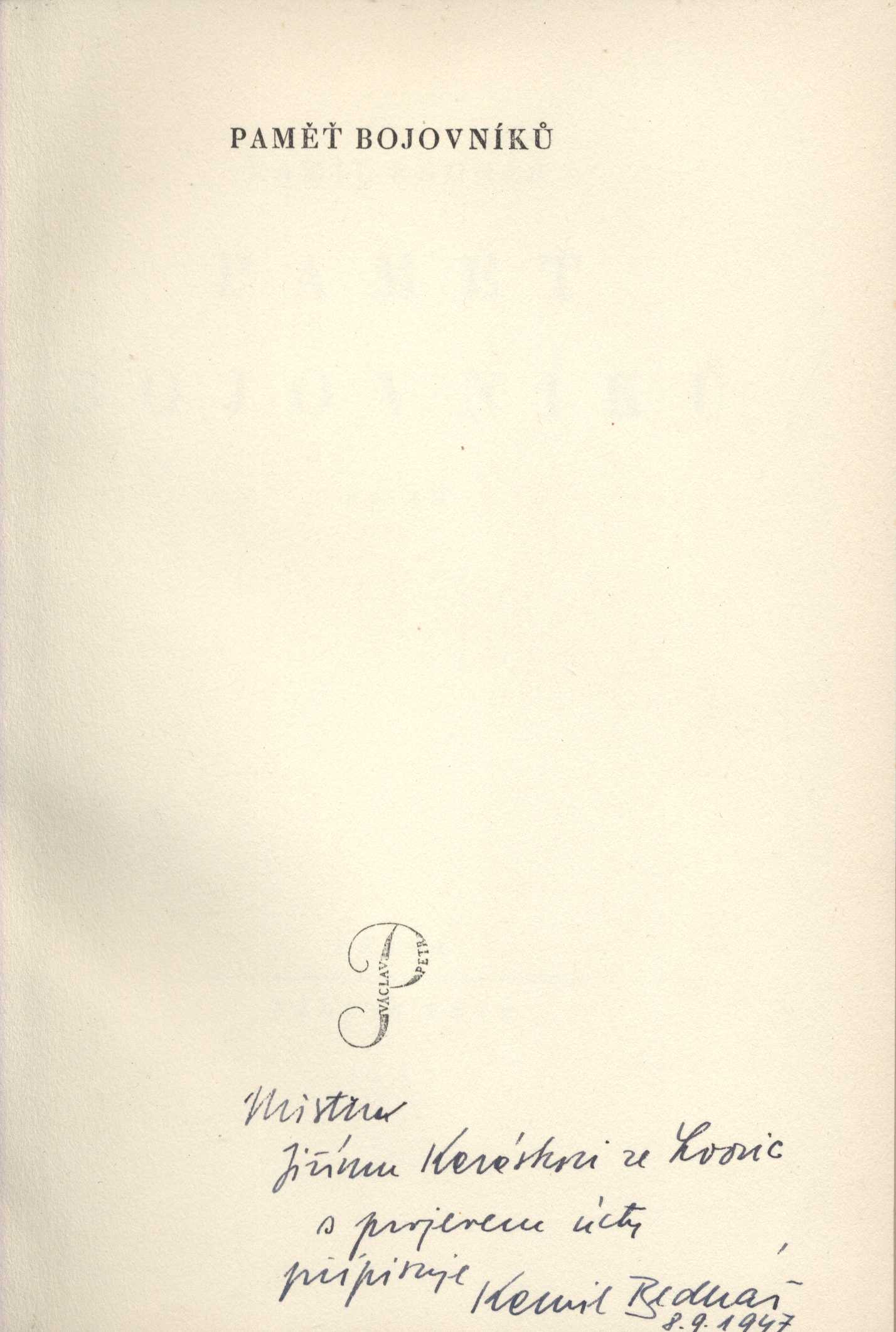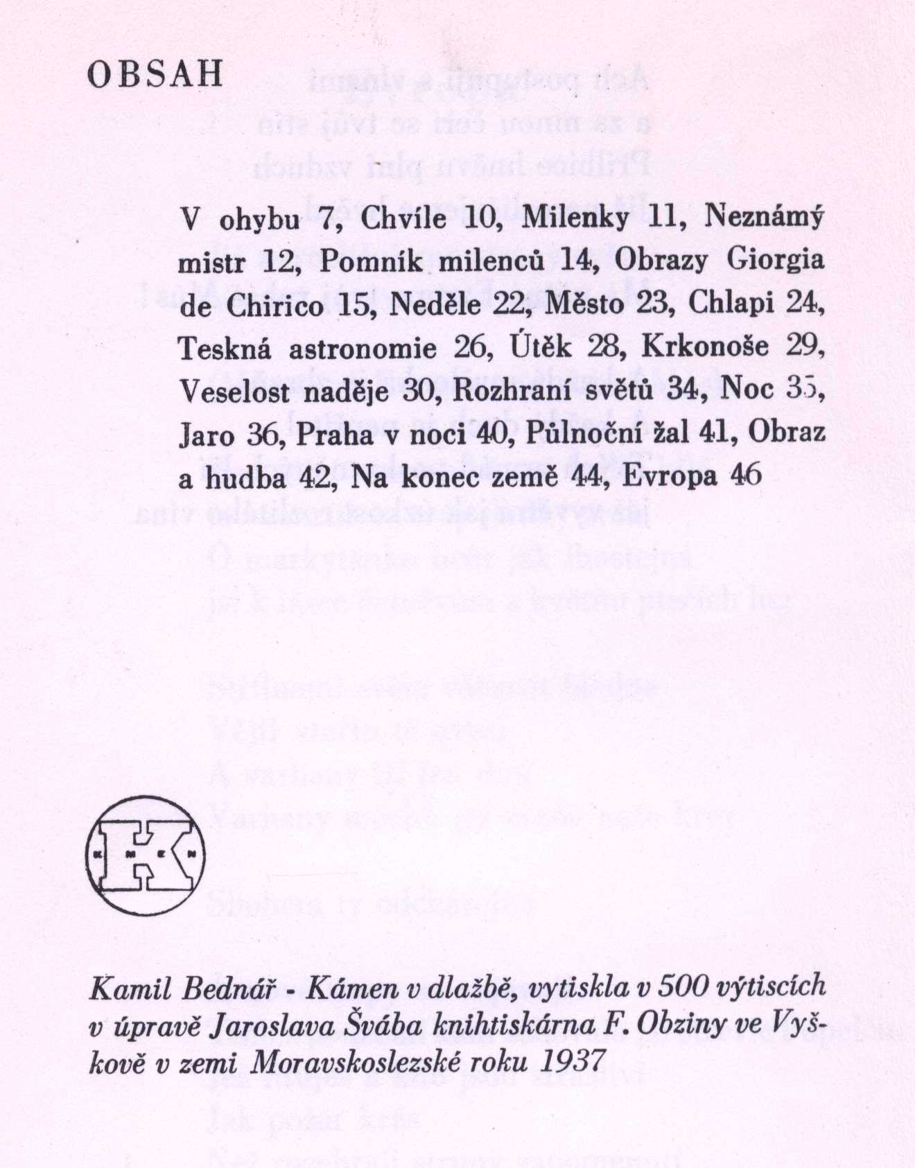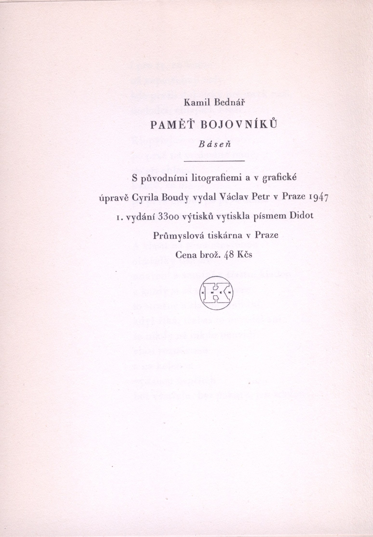 Názvové údaje Hladiny tůní : [poesie] / Kamil Bednář ; [upravil, obálku a vazbu navrhl Jaroslav Šváb ; kresby Josefa Lieslera] Osobní jméno Bednář, Kamil, 1912-1972 (Autor) Další autoři Šváb, Jaroslav, 1906-1999 (Knižní grafik) (Autor obálky) (Výtvarník vazby) Liesler, Josef, 1912-2005 (Ilustrátor) Korp. Václav Petr (nakladatelství) (Nakladatel, vydavatel) Frant. Bartoš (tiskárna) (Tiskař) Nakladatel Praha Václav Petr, 1943 Výrobce vytiskla knihtiskárna Frant. Bartoše) Rozsah 96, [4] s. : il. ; 20,9 cm Klíčová slova česká literatura * poezie * sbírka básní Počet ex. 1, z toho volných 1 Druh dok. monografie Signatura OŘíha 293 Názvové údaje Kámen v dlažbě : básně / Kamil Bednář ; [v úpravě Jaroslava Švába] Osobní jméno Bednář, Kamil, 1912-1972 (Autor) Další autoři Šváb, Jaroslav, 1906-1999 (Knižní grafik) Korp. Václav Petr (nakladatelství) (Nakladatel, vydavatel) František Obzina (tiskárna, nakladatelství) (Tiskař) Nakladatel Praha : Václav Petr, 1937 Výrobce Knihtiskárna F. Obziny) Rozsah 47 s. Klíčová slova česká poezie * básně * stol. 20., léta 30. Počet ex. 1, z toho volných 1 Druh dok. monografie Signatura C12b 12956 Názvové údaje Paměť bojovníků : báseň / Kamil Bednář ; [s původními litografiemi a v grafické úpravě Cyrila Boudy] Osobní jméno Bednář, Kamil, 1912-1972 (Autor) (Dedikátor) Další autoři Karásek ze Lvovic, Jiří, 1871-1951 (Dedikant) Bouda, Cyril, 1901-1984 (Autor obálky) (Ilustrátor) Korp. Václav Petr (nakladatelství) (Nakladatel, vydavatel) Průmyslová tiskárna v Praze (Tiskař) Nakladatel Praha : Václav Petr, 1947 Výrobce (Průmyslová tiskárna) Rozsah 49 s. : il. Klíčová slova česká literatura * česká poezie * 2. světová válka Počet ex. 1, z toho volných 1 Druh dok. monografie Signatura KaG XLI D 64 Názvové údaje Paměť bojovníků : báseň / Kamil Bednář ; [s původními litografiemi a v grafické úpravě Cyrila Boudy] Osobní jméno Bednář, Kamil, 1912-1972 (Autor) Další autoři Bouda, Cyril, 1901-1984 (Ilustrátor) (Knižní grafik) (Autor obálky) Korp. Václav Petr (nakladatelství) (Nakladatel, vydavatel) Průmyslová tiskárna v Praze (Tiskař) Nakladatel Praha : Václav Petr, 1947 Výrobce (Průmyslová tiskárna v Praze) Rozsah 49, [3] s. : il. ; 19,5 cm Klíčová slova česká literatura * poezie * báseň * válečná témata Počet ex. 5, z toho volných 4 Druh dok. monografie Signatura OŘíha 253, P 90 C 42, Thon 3329, Knytl 0977, P 56 e 63 Názvové údaje Píseň lásky / Kamil Bednář ; [kresby Ludmila Jiřincová ; typografická úprava Josef Sonberg] Osobní jméno Bednář, Kamil, 1912-1972 (Autor) Další autoři Jiřincová, Ludmila, 1912-1994 (Ilustrátor) Sonberg, Josef, 1892-1979 (Typograf) Korp. Václav Petr (nakladatelství) (Nakladatel, vydavatel) V. Neubert a synové (firma) (Tiskař obrazu) Orbis (tiskárna) (Tiskař) Nakladatel [Praha] : Václav Petr, 1944 Výrobce (V. Neubert a synové) Rozsah [36] s. : il. ; 15,3 cm Klíčová slova česká poezie * básně * stol. 20., léta 40. Počet ex. 2, z toho volných 2 Druh dok. monografie Signatura C12a 3345, OŘíha 219 Názvové údaje Slovo k mladým / Kamil Bednář Osobní jméno Bednář, Kamil, 1912-1972 (Autor) Další autoři Václav Petr (nakladatelství) (Nakladatel, vydavatel) Osvěta (tiskárna) (Nakladatel, vydavatel) Nakladatel Praha : Václav Petr, 1940 Výrobce Ve Valašském Meziříčí : Osvěta Rozsah 29 stran ; 19 cm Klíčová slova česká mládež * poválečné období * poválečná generace * vliv literatury * mladí básníci * básnická tvorba * úvahy Počet ex. 3, z toho volných 2 Druh dok. monografie Signatura ZKSlabý 0225, P 114 G 67, P 37 a 48 Názvové údaje Vánoce v Čechách / Kamil Bednář ; [kresby nakreslil Miroslav Truksa] Osobní jméno Bednář, Kamil, 1912-1972 (Autor) (Autor podpisu) Další autoři Truksa, Miroslav, 1918- (Ilustrátor) Korp. Václav Petr (nakladatelství) (Nakladatel, vydavatel) Česká grafická Unie (tiskárna a nakladatelství) (Tiskař) Nakladatel Praha : Václav Petr, 1940 [spr. 1941] Výrobce (Česká grafická Unie a. s.) Rozsah 27 s. : il. ; 24 s. Klíčová slova česká literatura * poezie * básně * Bednář K. * ilustrované knihy * ilustrace * Truksa M. * soukromý tisk * Petr V. Počet ex. 1, z toho volných 0 Druh dok. monografie Signatura Topič 0695 Názvové údaje Vánoce v Čechách / Kamil Bednář ; [kresby nakreslil Miroslav Truksa] Osobní jméno Bednář, Kamil, 1912-1972 (Autor) (Autor podpisu) Další autoři Truksa, Miroslav, 1918- (Ilustrátor) Korp. Václav Petr (nakladatelství) (Nakladatel, vydavatel) Česká grafická Unie (tiskárna a nakladatelství) (Tiskař) Nakladatel Praha : Václav Petr, 1940 Výrobce (Česká grafická unie) Rozsah 27 s. : il. Klíčová slova česká poezie * básně * bibliofilie Počet ex. 1, z toho volných 1 Druh dok. monografie Signatura VMartínek 0634 Názvové údaje Veliký mrtvý / Kamil Bednář ; [obálka a úprava Jaroslava Švába] Osobní jméno Bednář, Kamil, 1912-1972 (Autor) Další autoři Šváb, Jaroslav, 1906-1999 (Knižní grafik) (Autor obálky) Korp. Václav Petr (nakladatelství) (Nakladatel, vydavatel) Osvěta (tiskárna) (Tiskař) Nakladatel Praha : Václav Petr, 1940 Výrobce (Osvěta Rozsah 30 s. Klíčová slova česká literatura * česká poezie Počet ex. 3, z toho volných 3 Druh dok. monografie Signatura VHB 0241, P 33 C 42, M 174 d 90 Názvové údaje Jan Erazím Vocel, zakladatel našich dějin umění / Vojtěch Birnbaum Osobní jméno Birnbaum, Vojtěch, 1877-1934 (Autor) Další autoři Václav Petr (nakladatelství) (Nakladatel, vydavatel) Osvěta (tiskárna) (Tiskař) Nakladatel Praha : Václav Petr, 1942 Výrobce (Ve Valašském Meziříčí : Osvěta) Rozsah 31 stran Osobní hesla Vocel, Jan Erazim, 1802-1871 - archeolog, literární historik, redaktor, básník Klíčov