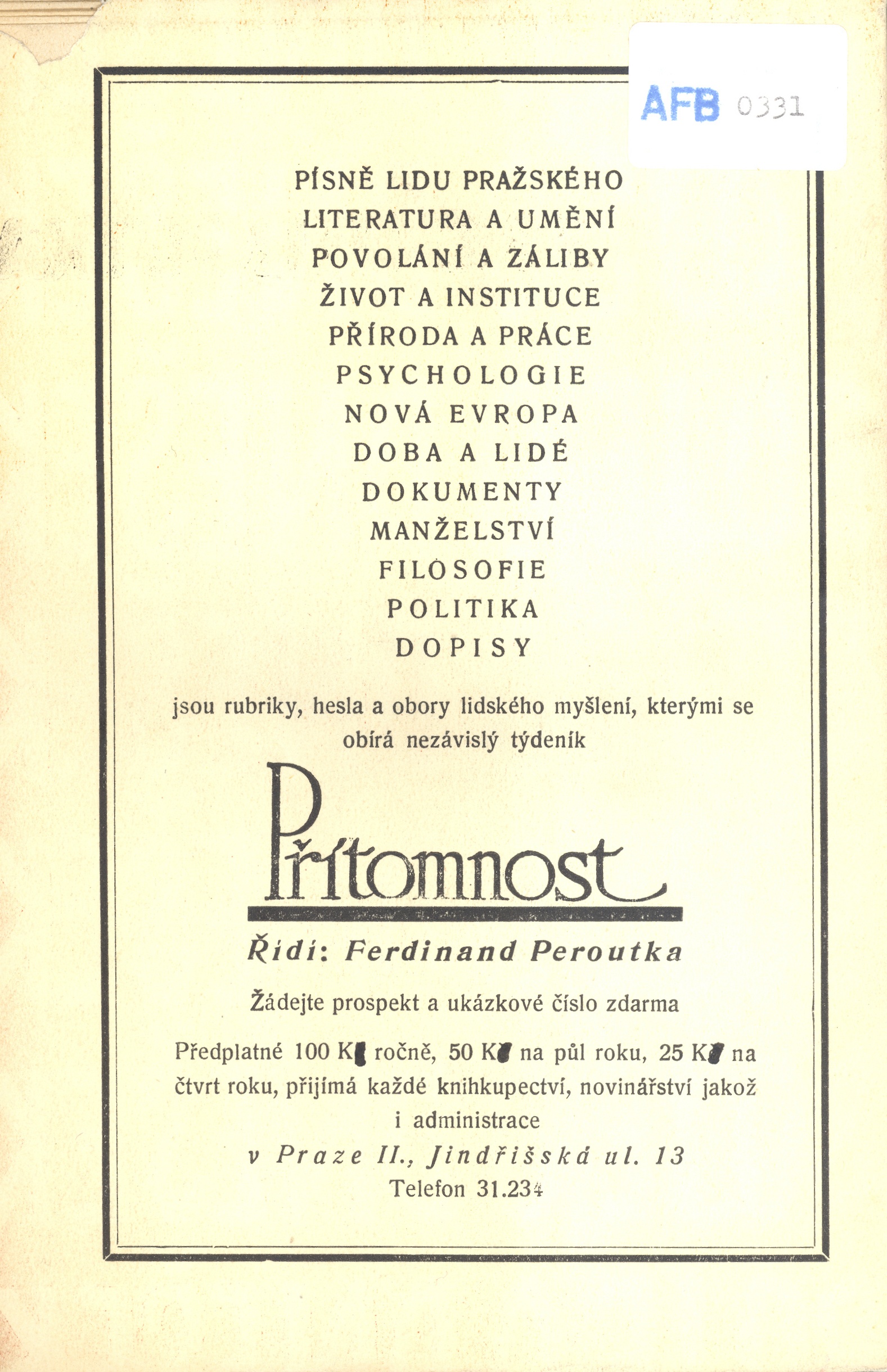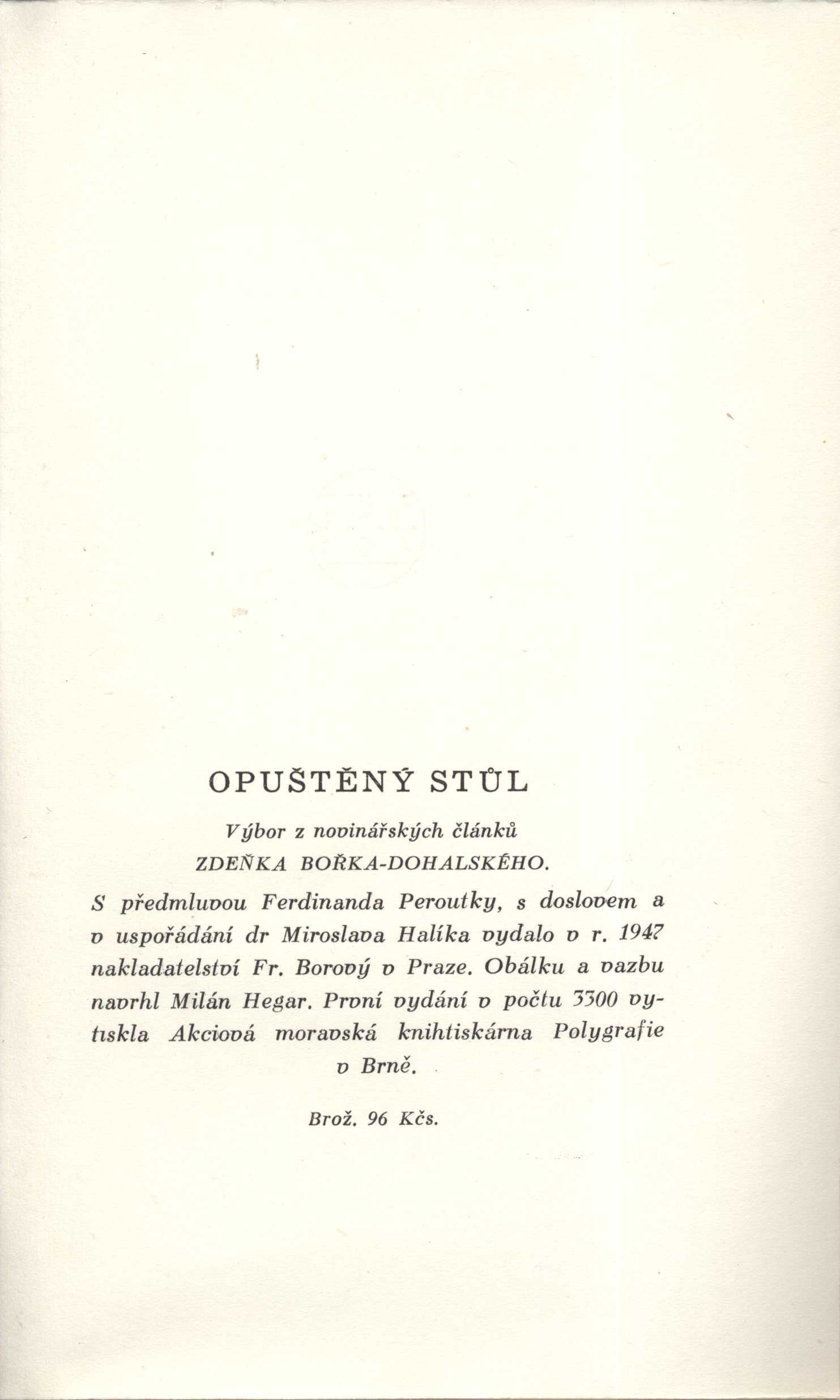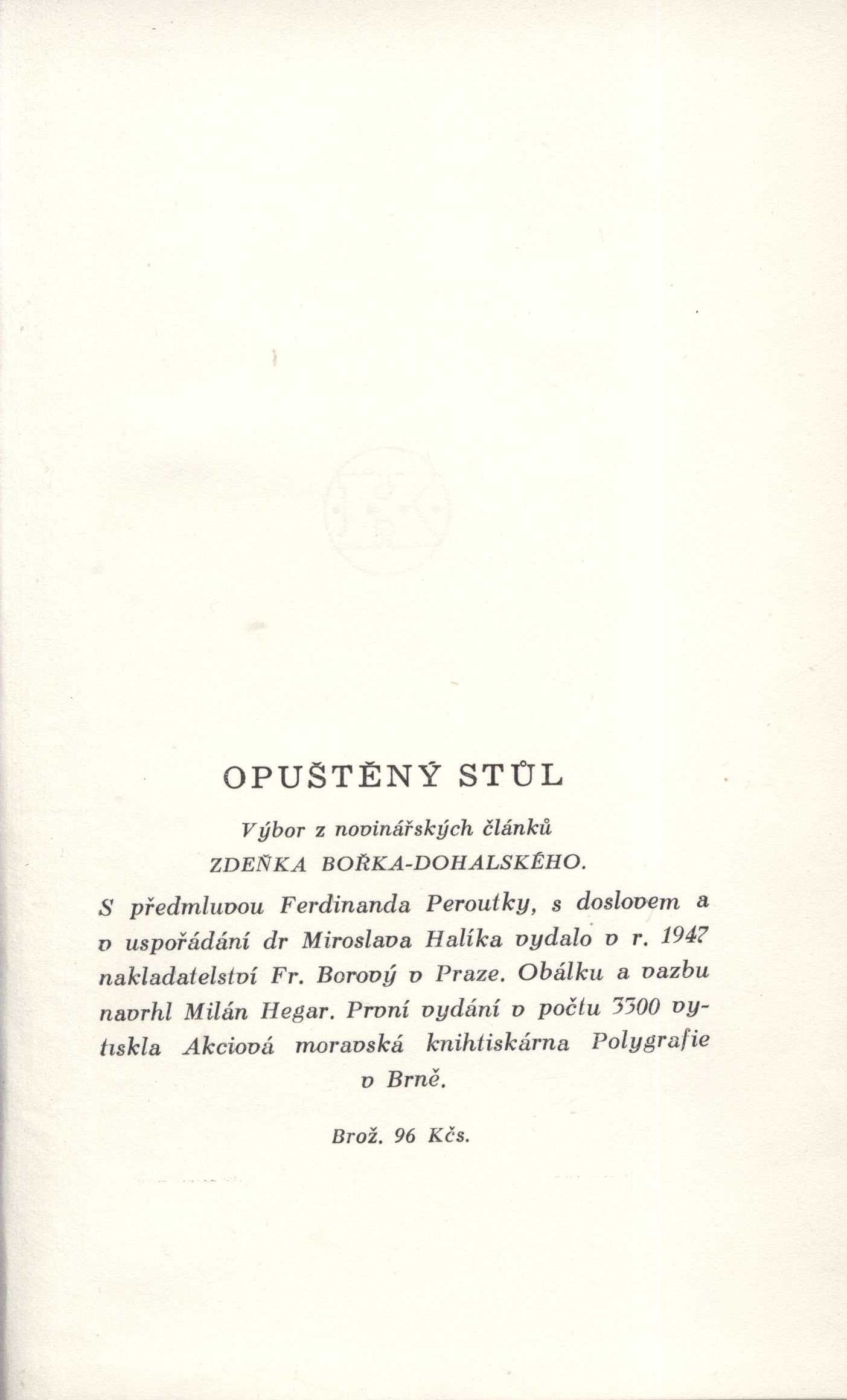 Názvové údaje Opuštěný stůl : [výbor z novinářských článků] / Zdeněk Bořek-Dohalský ; [s předmluvou Ferdinanda Peroutky ; s doslovem a v uspořádání Dr. Miroslava Halíka ; obálku a vazbu navrhl Milán Hegar] Osobní jméno Bořek-Dohalský, Zdeněk, 1900-1945 (Autor) Další autoři Peroutka, Ferdinand, 1895-1978 (Autor úvodu atd.) Halík, Miroslav, 1901-1975 (Autor doslovu, tiráže atd.) (Sestavovatel, kompilátor) Hegar, Milan, 1921-1987 (Autor obálky) (Výtvarník vazby) Korp. Fr. Borový (firma) (Nakladatel, vydavatel) Akciová moravská knihtiskárna Polygrafie (Tiskař) Nakladatel V Praze : Fr. Borový, 1947 Výrobce Akciová moravská knihtiskárna Polygrafie) Rozsah 307 s. ; 8° Osobní hesla Bořek-Dohalský, Zdeněk, 1900-1945 - novinář, fejetonista Klíčová slova česká literatura * novinové články * výbor článků Počet ex. 1, z toho volných 1 Druh dok. monografie Signatura AFB 1822 Názvové údaje Opuštěný stůl : výbor z novinářských článků / Zdeněk Bořek-Dohalský ; s předmluvou Ferdinanda Peroutky ; s doslovem a v uspořádání Dr. Miroslava Halíka ; obálku a vazbu navrhl Milán Hegar Osobní jméno Bořek-Dohalský, Zdeněk, 1900-1945 (Autor) Další autoři Peroutka, Ferdinand, 1895-1978 (Autor úvodu atd.) Halík, Miroslav, 1901-1975 (Autor doslovu, tiráže atd.) (Sestavovatel, kompilátor) Hegar, Milan, 1921-1987 (Autor obálky) (Výtvarník vazby) Korp. Fr. Borový (firma) (Nakladatel, vydavatel) Akciová moravská knihtiskárna Polygrafie (Tiskař) Nakladatel V Praze : Fr. Borový, 1947 Výrobce V Brně : Akciová moravská knihtiskárna Polygrafie Rozsah 307 stran ; 21,5 cm Osobní hesla Bořek-Dohalský, Zdeněk, 1900-1945 - novinář, fejetonista Klíčová slova česká literatura * novinové články * výbor článků Počet ex. 2, z toho volných 2 Druh dok. monografie Signatura AFB 1821, Šafář 085 Názvové údaje A Handbook of Czech Prose Writing 1940-2005 / Bohuslava Bradbrook Osobní jméno Bradbrook, B. R., 1922-2019 (Autor) Další autoři Jirásek, Jiří, 1932- (Ilustrátor) Korp. Sussex Academic Press (Brighton - Portland (Velká Británie)) (Nakladatel, vydavatel) Nakladatel Brighton - Portland : Sussex Academic Press, [2007] Rozsah x, 156, [2] s. : il. Osobní hesla Bělohradská, Hana, 1929-2005 - beletristka, filmová scénáristka, překladatelka * Beneš, Jan, 1936-2007 - výtvarník, prozaik, publicista * Dousková, Irena, 1964- - básnířka, prozaička * Fischl, Viktor, 1912-2006 - diplomat, básník, prozaik, publicista, překladatel * Fuks, Ladislav, 1923-1994 - prozaik * Havel, Václav, 1936-2011 - spisovatel a dramaturg, dramatik, publicista v literárních a divadelních časopisech, esejista, politik, prezident ČR * Holubová, Miloslava, 1913-2001 - historička umění * Hostovský, Egon, 1908-1973 - prozaik, redaktor, překladatel * Hrabal, Bohumil, 1914-1997 - prozaik, básník a překladatel * Kantůrková, Eva, 1930- - prozaička, scénáristka, novinářka * Klíma, Ivan, 1931-2025 - prozaik, dramatik, publicista, esejista, autor rozhlasových her * Kohout, Pavel, 1928- - dramatik, prozaik, publicista, básník, scénárista, překladatel, filmový režisér * Kožík, František, 1909-1997 - prozaik, dramatik a básník * Kraus, Ivan, 1939- - herec, scénárista, loutkář, spisovatel, fejetonista, povídkář * Křesadlo, Jan, 1926-1995 - klinický psycholog, polyhistor a polyglot, ilustrátor, zpěvák, skladatel, aranžér, sbormistr * Kriseová, Eda, 1940- - prozaička, publicistka * Kundera, Milan, 1929-2023 - prozaik a básník, esejista, literární teoretik, překladatel * Lustig, Arnošt, 1926-2011 - prozaik, scénárista, publicista, autor rozhlasových her * Neff, Vladimír, 1909-1983 - prozaik, dramatik, překladatel * Otčenášek, Jan, 1924-1979 - beletrista, dramatik, autor literatury pro mládež, komunistický publicista * Páral, Vladimír, 1932- - spisovatel * Pavel, Ota, 1930-1973 - sportovní novinář, beletrista * Peroutka, Ferdinand, 1895-1978 - novinář a redaktor, publicista, historik a filosof, beletrista * Procházka, Jan, 1929-1971 - spisovatel, filmový scénárista, dramaturg * Procházková, Lenka, 1951- - prozaička, scenáristka, publicistka * Richterová, Sylvie, 1945- - prozaička, překladatelka, VŠ profesorka * Salivarová, Zdena, 1933-2025 - prozaička a překladatelka * Škvorecký, Josef, 1924-2012 - prozaik, básník, literární kritik, překladatel * Smetanová, Jindřiška, 1923-2012 - prozaička, filmová a televizní scénáristka, překladatelka * Strnad, Jaroslav, 1918-2000 - JUDr., básník, prozaik, dramatik, překladatel, publicista, recenzent * Šulcová, Marie, 1926- - redaktorka, publicistka * Švandrlík, Miloslav, 1932-2009 - prozaik, humorista * Trefulka, Jan, 1929-2012 - prozaik, literární kritik, scénárista * Vaculík, Ludvík, 1926-2015 - prozaik, fejetonista, kulturní a politický publicista * Viewegh, Michal, 1962- - spisovatel a publicista Klíčová slova česká literatura * česká próza * próza * prozaické texty * prozaici * biografie * literární rozbory * příručka * stol. 20., 2. pol. * stol. 20.-21. * r. 1940-2005 Počet ex. 1, z toho volných 1 Druh dok. monografie Signatura C12c 3055 Názvové údaje Strž Karla Čapka : průvodce expozicemi Památníku Karla Čapka / [autor Marta Dandová / grafická úprava a sazba Pavel Bosák] Osobní jméno Dandová, Marta, 1934- (Autor) Záhlaví-korpor. Památník Karla Čapka (muzeum) (Nakladatel, vydavatel) Další autoři Bosák, Pavel (Knižní grafik) (Sazeč) Nakladatel Stará Huť : Památník Karla Čapka, 2000 Výrobce Septim Tisk) Rozsah 59 s. : il., portréty, faksim. ; 15x21 cm Osobní hesla Čapek, Karel, 1890-1938 - spisovatel, dramatik, novinář * Scheinpflugová, Olga, 1902-1968 - herečka a spisovatelka * Peroutka, Ferdinand, 1895-1978 - novinář a redaktor, publicista, historik a filosof, beletrista Heslo korporace (zkrác. h