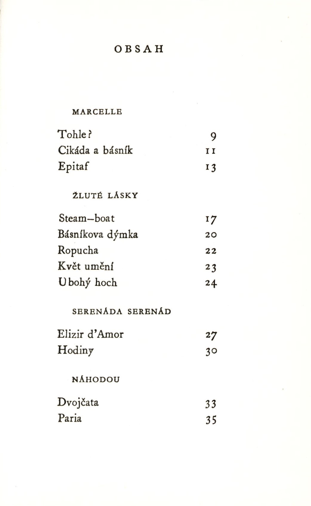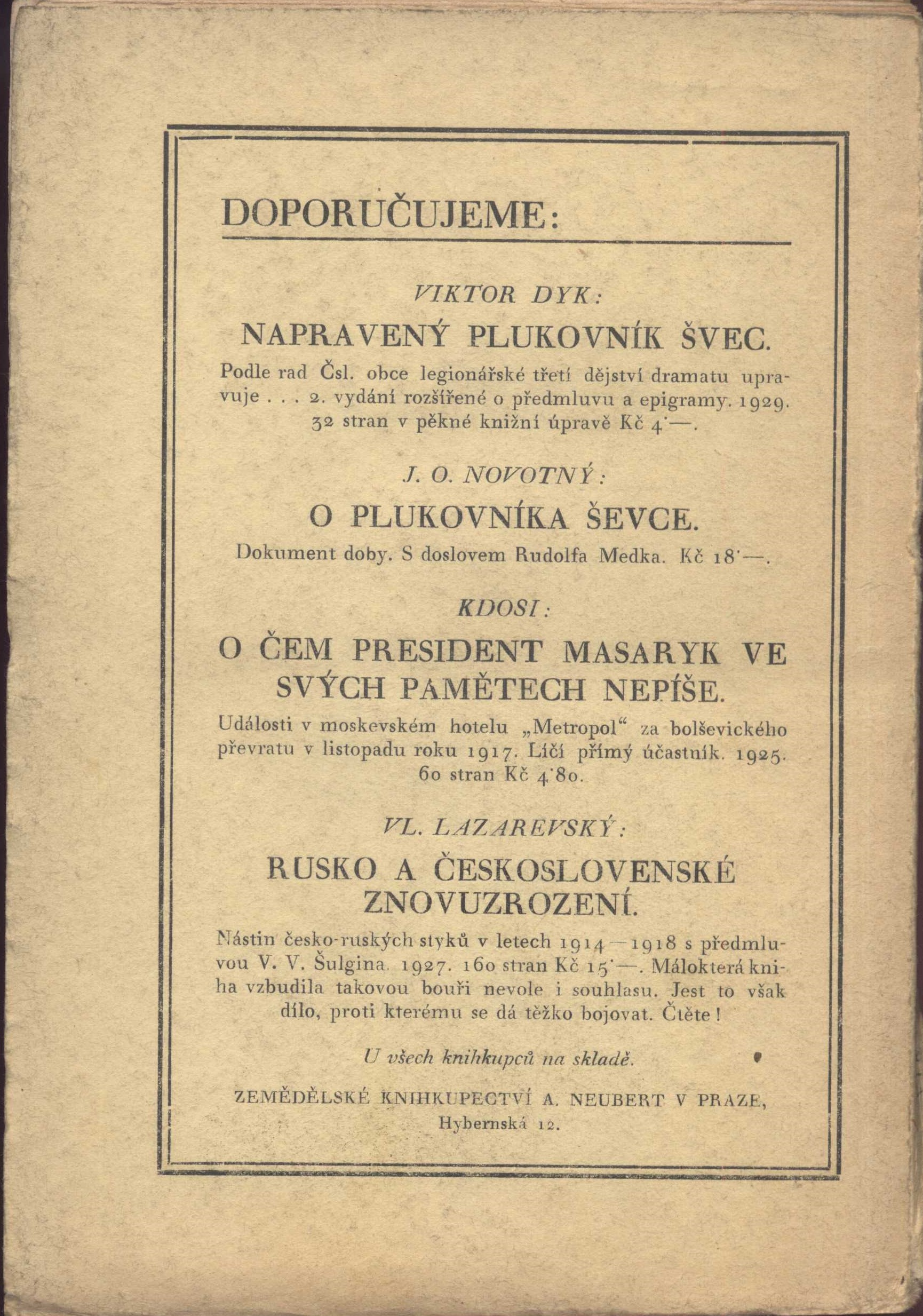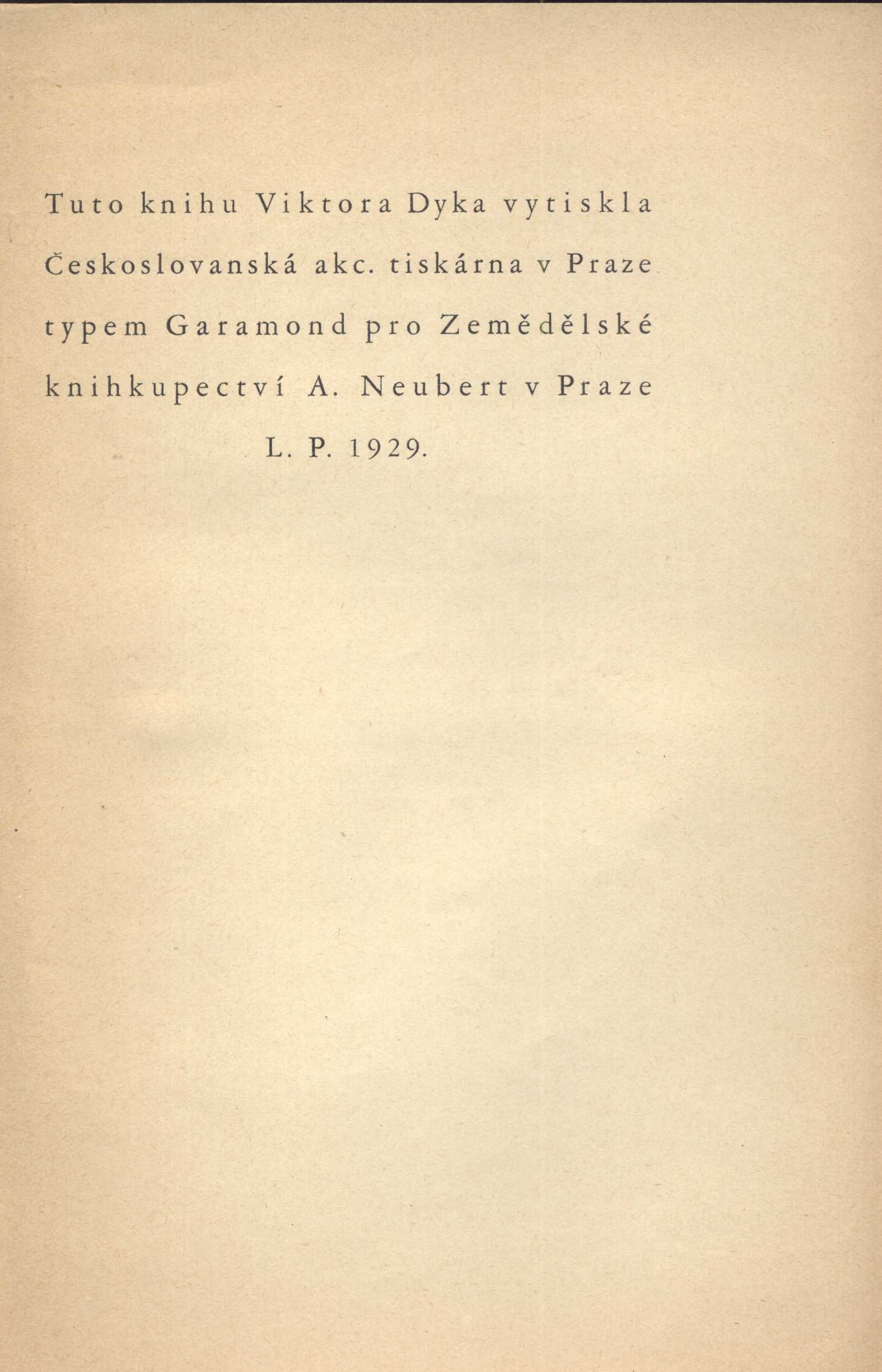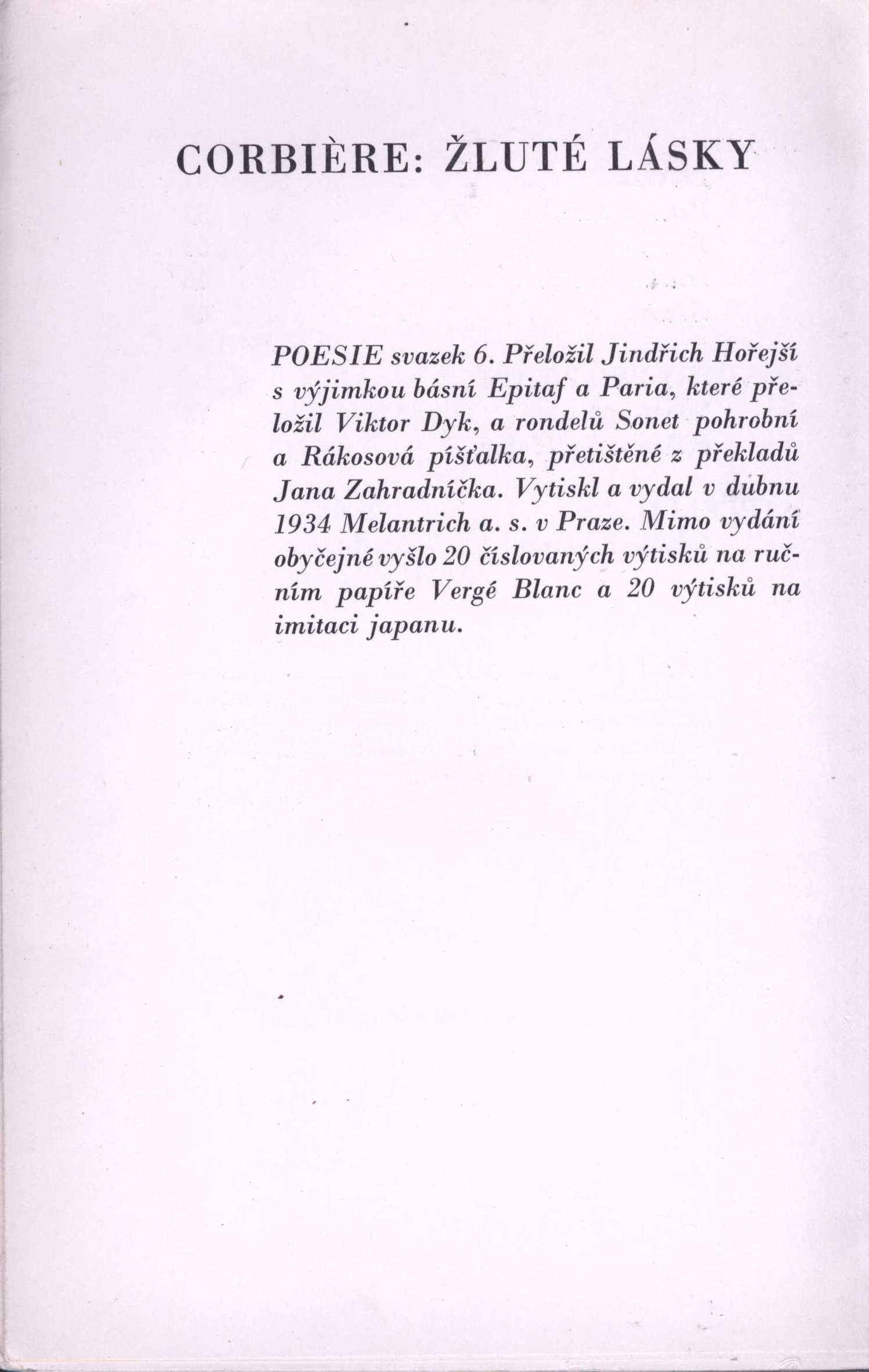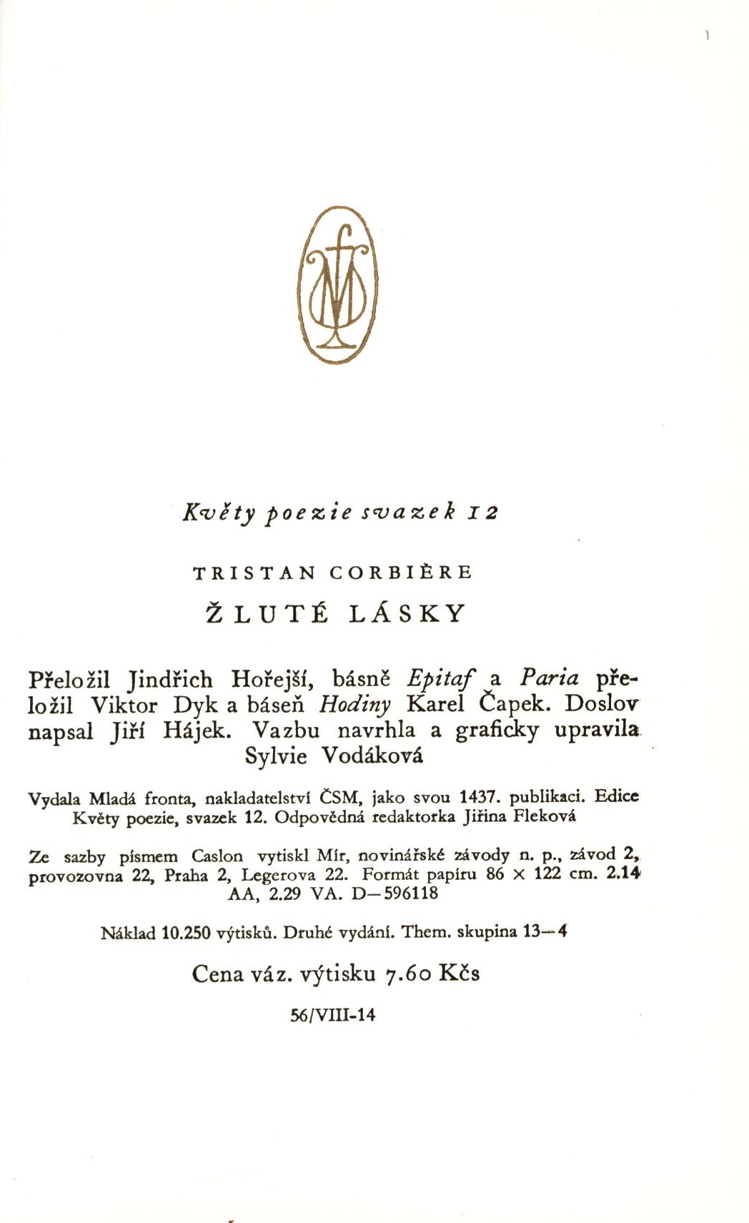 Názvové údaje Výbor z lyriky / O. Březina, A. Sova, V, Dyk ; [uspořádal, úvodem a poznámkami opatřil Miloslav Hýsek] Osobní jméno Březina, Otokar, 1868-1929 (Autor) Další autoři Sova, Antonín, 1864-1928 (Autor) Dyk, Viktor, 1877-1931 (Autor) Hýsek, Miloslav, 1885-1957 (Sestavovatel, kompilátor) (Autor úvodu atd.) Nakladatel Praha : Nakladatelství Jana Leichtera, [19--] Výrobce (Tiskem Edvarda Leschingra) Rozsah 93 s. : il. Klíčová slova česká poezie * básně * výbory Počet ex. 1, z toho volných 1 Druh dok. monografie Signatura C12a 3341 Názvové údaje Žluté lásky / Tristan Corbière ; přeložil Jindřich Hořejší, básně Epitaf a Paria přeložil Viktor Dyk a báseň Hodiny Karel Čapek ; doslov napsal Jiří Hájek ; vazbu navrhla a graficky upravila Sylvie Vodáková Osobní jméno Corbière, Tristan, 1845-1875 (Autor) Další autoři Hořejší, Jindřich, 1886-1941 (Překladatel) Dyk, Viktor, 1877-1931 (Překladatel) Čapek, Karel, 1890-1938 (Překladatel) Hájek, Jiří, 1919-1994 (Autor doslovu, tiráže atd.) Vodáková, Sylvie, 1926- (Výtvarník vazby) (Knižní grafik) Korp. Mladá fronta (nakladatelství) (Nakladatel, vydavatel) Mír, novinářské závody (tiskárna) (Tiskař) Nakladatel V Praze : Mladá fronta, 1959 Výrobce V Praze : Mír, novinářské závody Rozsah 92 stran ; 15 cm Osobní hesla Corbière, Tristan, 1845-1875 - francouzský básník Klíčová slova francouzská literatura * francouzská poezie * překlady z francouzštiny * překlady do češtiny * sbírka básní Počet ex. 2, z toho volných 2 Druh dok. monografie Signatura RSzpuk 0613, AHO 0662 Názvové údaje Žluté lásky / Tristan Corbière ; přeložil Jindřich Hořejší, báseňí Epitaf a Paria přeložil Viktor Dyk, Sonet pohrobní a Rákosovou píšťalku přeložil Jan Zahradníček Osobní jméno Corbière, Tristan, 1845-1875 (Autor) Další autoři Hořejší, Jindřich, 1886-1941 (Překladatel) (Autor komentáře) Dyk, Viktor, 1877-1931 (Překladatel) Zahradníček, Jan, 1905-1960 (Překladatel) Korp. Melantrich (nakladatelství) (Tiskař) (Nakladatel, vydavatel) Nakladatel Praha : vytiskl a vydal Melantrich, 1934 Rozsah 77 stran ; 21 cm Klíčová slova francouzská literatura * poezie * Corbière T. * francouzská poezie * sbírka básní * český překlad * Hořejší J. * Dyk V. * Zahradníček J. * r. 1934 Počet ex. 2, z toho volných 2 Druh dok. monografie Signatura MEL 1557, AHO 0332 Názvové údaje Žluté lásky / Tristan Corbiére ; [přeložil Jindřich Hořejší ; s výjimkou básní Epitaf a Paria, které přeložil Viktor Dyk ; a rondelů Sonet pohrobní a Rákosová píšťalká, přetištěné z překladů Jana Zahradníčka] Osobní jméno Corbière, Tristan, 1845-1875 (Autor) Další autoři Hořejší, Jindřich, 1886-1941 (Překladatel) Dyk, Viktor, 1877-1931 (Překladatel) Zahradníček, Jan, 1905-1960 (Překladatel) Korp. Melantrich (nakladatelství) (Nakladatel, vydavatel) Nakladatel Praha : Melantrich, 1934 Rozsah 77 s. Klíčová slova francouzská poezie * překlad * sbírka básní Počet ex. 3, z toho volných 3 Druh dok. monografie Signatura Holan 406, MEL 1507, C12a 4395 Názvové údaje Animal triste / Gabriele D'Annunzio Osobní jméno D'Annunzio, Gabriele, 1863-1938 (Autor) Další autoři Procházka, Arnošt, 1869-1925 (Překladatel) Dyk, Viktor, 1877-1931 (Překladatel) Korp. J. Skalák a spol. (Praha) (Tiskař) Moderní revue (nakladatelství) (Nakladatel, vydavatel) Nakladatel V Praze : Moderní revue, 1912 Výrobce Tiskem J. Skaláka a spol. Rozsah 18 nečíslovaných stran ; 25 cm Klíčová slova italská literatura * poezie * lyrika * dekadence Počet ex. 5, z toho volných 5 Druh dok. monografie Signatura KaG XVI C 215, Sáňka 3829, P 86 a 31, Knytl 1490, Sáňka 1566 Názvové údaje Album monarchů, aneb, Sic transit Gloria dreibundi / kreslil Dr. Desiderus ; verše od Viktora Dyka a Karla Čapka Autor Dr. Desiderius, 1880-1934 (Ilustrátor) Další autoři Dyk, Viktor, 1877-1931 (Autor) Čapek, Karel, 1890-1938 (Autor) Korp. Pražská akciová tiskárna (Tiskař) Nakladatel [Praha] : Nebojsa, 1918 Výrobce Tiskem Pražské akciové tiskárny Rozsah 24 stran : ilustrace ; 26 cm Klíčová slova česká literatura * obrazové publikace * verše * císaři * panovníci * stol. 20. * Rakousko * Německo * Turecko * Bulharsko Počet ex. 2, z toho volných 2 Druh dok. monografie Signatura Hoffmeister 0627, O 22 B 34/přív. 1 Odkazy (1) - PERIODIKA - Svázaný ročník periodika Názvové údaje Ad usum pana presidenta republiky / napsal Viktor Dyk Osobní jméno Dyk, Viktor, 1877-1931 (Autor) (Autor úvodu atd.) Další autoři Ústřední zemědělské knihkupectví A. Neubert (Nakladatel, vydavatel) Českoslovanská akciová tiskárna (Tiskař) Nakladatel V Praze : Zemědělské knihkupectví A. Neubert, 1929 Výrobce V Praze Českoslovanská akc. tiskárna Rozsah 97 stran ; 21 cm Klíčová slova česká literatura * Dyk V. * česká politika * 1. světová válka * první republika * polemika * Beneš E. * Masaryk T. G. * r. 1929 Počet ex. 1, z toho volných 1 Druh dok. monografie Signatura VZinková 0539 Názvové údaje Ad usum pana presidenta republiky / Viktor Dyk Osobní jméno Dyk, Viktor, 1877-1931 (Autor) Další autoři Ústřední zemědělské knihkupectví A. Neubert (Nakladatel, vydavatel) Českoslovanská akciová tiskárna (Tiskař) Nakladatel V Praze : Zemědělské knihkupectví A. Neubert, 1929 Výrobce (Českoslovanská akc. tiskárna) Rozsah 85 s. Osobní hesla Beneš, Edvard, 1884-1948 - sociolog, politik, prezident Klíčová slova česká literatura * stol. 20., léta 20. * r. 1929 * česká politika * 1. světová válka * první republika * polemika * Beneš E. * Masaryk T. G. Počet ex. 1, z toho volných 1 Druh dok. monografie Signatura KaG XVI B2 328