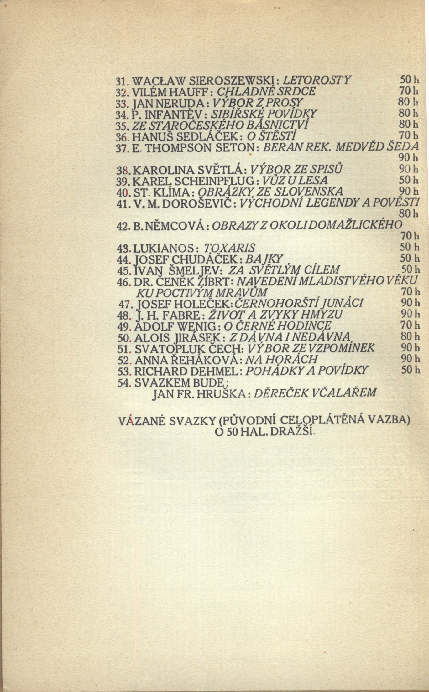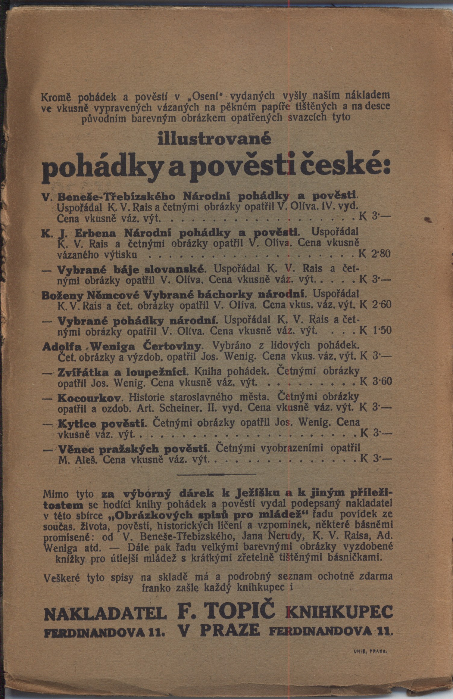 Názvové údaje Källornas musik / Otokar Březina ; med inledning av Arne Novák ; fran tjechiskan av E. Werr Osobní jméno Březina, Otokar, 1868-1929 (Autor) Další autoři Novák, Arne, 1880-1939 (Autor úvodu atd.) Wester, Ellen, 1873-1930 (Překladatel) Bílek, František, 1872-1941 (Ilustrátor) Korp. Albert Bonniers förlag (Nakladatel, vydavatel) Alb. Bonniers Boktryckeri (tiskárna) (Tiskař) Nakladatel Stockholm : Albert Bonniers Förlag, 1928 Výrobce Alb. Bonniers Boktryckeri Rozsah 150 stran ; 18,5 cm Klíčová slova česká próza * filozofie umění * symbolismus (literatura) * idealismus * eseje * překlad Počet ex. 4, z toho volných 4 Druh dok. monografie Signatura C12b 10773, C12b 12393, Holman-Březina 0086, Holman-Březina 0171 Názvové údaje Proti buržoasní literární "vědě" Arne Nováka / František Buriánek Osobní jméno Buriánek, František, 1917-1995 (Autor) (Dedikátor) Další autoři Slabý, Zdeněk Karel, 1930-2020 (Dedikant) Nakladatel Praha : Osvěta, 1952 Výrobce Západočeské tiskárny) Rozsah 27 s. ; 22 cm Osobní hesla Novák, Arne, 1880-1939 - profesor české literatury, literární kritik a historik, esejista Klíčová slova literární kritici * literární vědci * česká literární věda * buržoazní literatura * Česko * stol. 20. * kritické studie Počet ex. 1, z toho volných 1 Druh dok. monografie Signatura ZKSlabý 0706 Názvové údaje Výbor z Ohlasů písní ruských a českých Fr. Lad. Čelakovského / s předmluvou Arne Nováka ; uspořádal Adolf Wenig Osobní jméno Čelakovský, František Ladislav, 1799-1852 (Autor) Další autoři Novák, Arne, 1880-1939 (Autor úvodu atd.) Wenig, Adolf, 1874-1940 (Sestavovatel, kompilátor) Kukula, O. (Dřívější majitel) (Autor podpisu) Korp. F. Topič (nakladatelství) (Nakladatel, vydavatel) Unie (tiskárna) (Tiskař) Nakladatel [Praha] : Nákladem F. Topiče, [1909] Výrobce (Unie) Rozsah 59, [1] s. : il. Klíčová slova česká literatura * česká poezie * ohlasová poezie * ohlasy * národní obrození * stol. 19., 1. pol. Počet ex. 1, z toho volných 1 Druh dok. monografie Signatura KaG XXXI E 97 Názvové údaje Výbor z ohlasů písní ruských a českých Fr. Lad. Čelakovského / s předmluvou Arne Nováka ; vydání uspořádal Adolf Wenig ; [úprava knihy od Jaroslava Bendy] Osobní jméno Čelakovský, František Ladislav, 1799-1852 (Autor) Další autoři Novák, Arne, 1880-1939 (Autor úvodu atd.) Wenig, Adolf, 1874-1940 (Sestavovatel, kompilátor) Benda, Jaroslav, 1882-1970 (Knižní grafik) (Ilustrátor) Korp. Kruh českých spisovatelů (Nakladatel, vydavatel) Unie (tiskárna) (Tiskař) Nakladatel [V Praze] : nákladem Kruhu českých spisovatelů, [1909] Výrobce (tiskem Unie) Rozsah 59 s. : il. ; 19 cm Osobní hesla Čelakovský, František Ladislav, 1799-1852 - profesor slavistiky a bohemistiky, básník, sběratel a vydavatel Klíčová slova česká literatura * poezie * písně * ohlasy * Čelakovský F. L. * výzdoba knihy * Benda J. * secesní výzdoba Počet ex. 1, z toho volných 1 Druh dok. monografie Signatura Topič 0649 Názvové údaje Lingam : dvanáct asijských novel / Max Dauthendey ; přeložil Alfons Breska ; úvodní studii napsal Arne Novák ; obálka a dřevoryty od F. Koblihy Osobní jméno Dauthendey, Max, 1867-1918 (Autor) Další autoři Breska, Alfons, 1873-1946 (Překladatel) Novák, Arne, 1880-1939 (Autor úvodu atd.) Kobliha, František, 1877-1962 (Ilustrátor) Nakladatel V Praze : Nakladatelské družstvo Máje, česká akciová společnost, 1919 Výrobce V Praze : Tiskem Dra. Ed. Grégra a syna, 1919 Rozsah 143 stran : ilustrace ; 15 cm Klíčová slova britská literatura * próza * Orient Počet ex. 2, z toho volných 2 Druh dok. monografie Signatura Holan 42, KaG XVI C2 98 Názvové údaje Pohádky a povídky / napsal Richard Dehmel ; z němčiny přeložila Zdenka Hostinská ; s úvodem Arne Nováka Osobní jméno Dehmel, Richard, 1863-1920 (Autor) Další autoři Hostinská, Zdenka, 1863-1942 (Překladatel) Novák, Arne, 1880-1939 (Autor úvodu atd.) Benda, Jaroslav, 1882-1970 (Knižní grafik) Korp. F. Topič (nakladatelství) (Autor) Unie (tiskárna) (Tiskař) Nakladatel Praha : F. Topič, 1913 Výrobce (Unie) Rozsah 58 s. : il. ; 20 cm Osobní hesla Dehmel, Richard, 1863-1920 - německý básník, dramatik a prozaik Klíčová slova německá literatura * próza * překlad * pohádky * povídky * literatura pro děti Počet ex. 1, z toho volných 1 Druh dok. monografie Signatura Topič 0401 Názvové údaje Arne Novák : cesta k osobnosti / Julius Heidenreich Osobní jméno Dolanský, Julius, 1903-1975 (Autor) Další autoři Fr. Borový (firma) (Nakladatel, vydavatel) Akciová moravská knihtiskárna Polygrafie (Tiskař) Nakladatel Praha : Fr. Borový, 1940 Výrobce Akc. moravská knihtiskárna Polygrafie) Rozsah 31 s. ; 8° Osobní hesla Novák, Arne, 1880-1939 - literární kritik a historik, esejista, redaktor Klíčová slova česká literatura * Novák A. * život a dílo * monografie Počet ex. 1, z toho volných 1 Druh dok. monografie Signatura AFB 1294 Názvové údaje Marco Polo : člověk a doba / Mirek Elpl ; [úvod Marco Polo v Čechách napsal Arne Novák ; obálku navrhl Vojtěch Tittelbach] Osobní jméno Elpl, Mirek, 1905-1960 (Autor) Další autoři Novák, Arne, 1880-1939 (Autor úvodu atd.) Tittelbach, Vojtěch, 1900-1971 (Autor obálky) Korp. Melantrich (nakladatelství) (Nakladatel, vydavatel) Nakladatel V Praze : Melantrich, [1937] Rozsah 219 s. ; 8° Osobní hesla Polo, Marco, asi 1254-1324 - italský cestovatel, obchodník Klíčová slova česká literatura * česká próza * román * životopisný román * Marco Polo Počet ex. 2, z toho volných 2 Druh dok. monografie Signatura MEL 1335, MEL 1335a Názvové údaje Homer : slavné dílo velikého muže / W. E. Gladstone ; z angličtiny přeložil V. Patejdl Osobní jméno Gladstone, William Ewart, 1809-1898 (Autor) Další autoři 