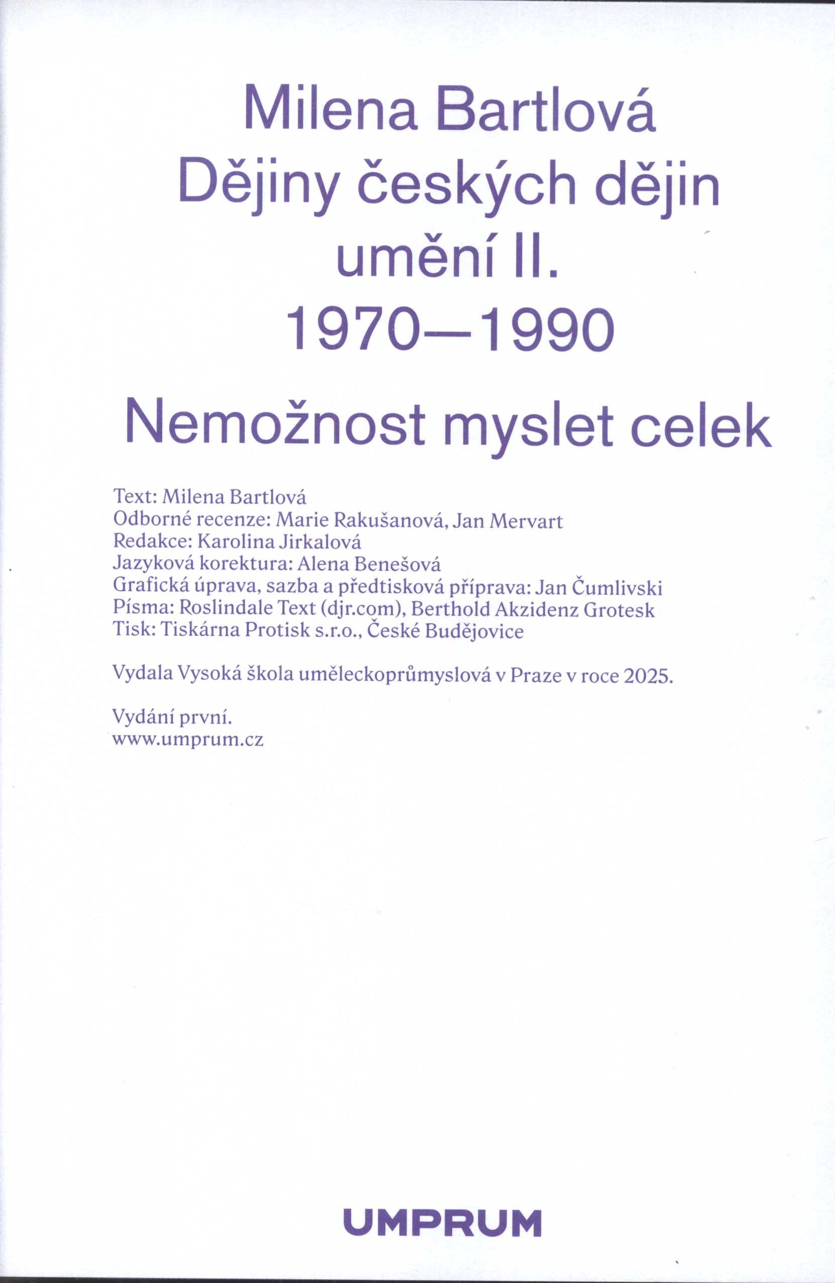 Názvové údaje Naše, národní umění : studie z dějin dějepisu umění / Milena Bartlová ; [sazba a obálka Čestmír Kučera] Osobní jméno Bartlová, Milena, 1958- (Autor) Další autoři Kučera, Čestmír (Autor obálky) Korp. Společnost pro odbornou literaturu - Barrister & Principal (nakladatelství) (Nakladatel, vydavatel) Masarykova univerzita. Seminář dějin umění (Brno) (Nakladatel, vydavatel) Nakladatel Brno : Společnost pro odbornou literaturu - Barrister & Principal : Masarykova univerzita, Filozofická fakulta - Seminář dějin umění, 2009 Rozsah 149 s., xxiv s. obr. příl. : il. (převážně barev.), mapy, portréty, faksim. Chronologie 19.-20. stol. Klíčová slova soubor studií * české umění * evropské umění * české výtvarné umění * národní identita * kulturní identita * historiografie umění * dějiny umění * Čechy a Morava * střední Evropa * stol. 19.-20. Počet ex. 1, z toho volných 1 Adr. el. zdr. obsah Druh dok. monografie Signatura C12b 18321 Názvové údaje Skutečná přítomnost : středověký obraz mezi ikonou a virtuální realitou / Milena Bartlová ; [na přebalu fotografie Dušana Burana ; grafická úprava a sazba Jana Sapáková] Osobní jméno Bartlová, Milena, 1958- (Autor) Další autoři Buran, Dušan, 1969- (Fotograf) Sapáková, Jana, 1947- (Grafický technik) Korp. Argo (nakladatelství) (Nakladatel, vydavatel) Nakladatel Praha : Argo, 2012 Výrobce (Protisk) Rozsah 407 s. : il. (převážně barev.), faksim. Klíčová slova středověk * středověká kultura * umění * obrazy * ikonografie * interpretace děl * funkce obrazu * vizuální komunikace * komunikační média * teorie umění * vztahy Počet ex. 2, z toho volných 2 Druh dok. monografie Signatura C12c 3664, C12c 4273 Názvové údaje Inteligence obrazu a jazyk dějin umění : výbor z textů / Michæl Baxandall ; výbor uspořádala a úvodní studii napsala Milena Bartlová ; přeložil Martin Pokorný Osobní jméno Baxandall, Michael, 1933-2008 (Autor) Další autoři Bartlová, Milena, 1958- (Sestavovatel, kompilátor) (Autor úvodu atd.) Pokorný, Martin, 1973- (Překladatel) Doležal, Kryštof, 1976- (Knižní grafik) Korp. Uměleckoprůmyslová škola (Praha, Česko) (Nakladatel, vydavatel) Tiskárna Helbich (Tiskař) (Tiskař obrazu) Nakladatel V Praze : Vysoká škola uměleckoprůmyslová, 2019 Výrobce [Brno] : Tiskárna Helbich Rozsah 240 stran : ilustrace (převážně barevné), faksimile ; 24 cm Předmětová hesla dějiny umění * history of art Klíčová slova britská literatura * anglická literatura * český překlad * výbor textů * výtvarné umění * jazyk * obraz * interpretace díla * obrazové přílohy Počet ex. 1, z toho volných 0, prezenčně 1 Druh dok. monografie Signatura MetC 0230 Názvové údaje Mistr Týnské kalvárie : pražská řezbářská dílna předhusitské doby / koncepce výstavy, výběr exponátů a zpracování katalogu komisař výstavy Jan Chlíbec a Milena Štefanová-Bartlová ; stať Ke stylovému původu umění Mistra Týnské kalvárie napsal Jaromír Homolka Osobní jméno Chlíbec, Jan, 1953- (Autor) Další autoři Bartlová, Milena, 1958- (Autor) Homolka, Jaromír, 1926-2017 (Autor úvodu atd.) Nakladatel V Praze : Národní galerie v Praze, 1990 Výrobce Vytiskl s. p. Mír 3 Rozsah 81 stran, 44 stran nečíslovaných obrazových příloh : ilustrace ; 24 cm Osobní hesla Mistr Týnské kalvárie, činný 1390-1420 Klíčová slova výtvarné umění * střední Evropa * středověké umění * řezbářství * stol. 14.-15. * katalog výstavy Počet ex. 1, z toho volných 1 Druh dok. monografie Signatura C12c 5142 Názvové údaje Dějiny umění v české společnosti: otázky, problémy, výzvy : příspěvky přednesené na Prvním sjezdu českých historiků umění / editorka Milena Bartlová Záhlaví-akce Sjezd českých historiků umění (1.) (2003 : Praha, Česko) Další autoři Bartlová, Milena, 1958- (Editor) Nakladatel Praha : Argo, 2004 Rozsah 273 s. : il. Klíčová slova dějiny umění * filozofie umění * křesťanské umění * české země * sborníky z konferencí Počet ex. 1, z toho volných 1 Druh dok. monografie Signatura C12b 7918 Názvové údaje Dějiny českých dějin umění. II., 1970-1990. Nemožnost myslet celek / Milena Bartlová Osobní jméno Bartlová, Milena, 1958- (Autor) Další autoři Čumlivski, Jan, 1978- (Knižní grafik) (Sazeč) Korp. Vysoká škola uměleckoprůmyslová (Praha, Česko) (Nakladatel, vydavatel) Protisk (tiskárna, České Budějovice) (Tiskař) Nakladatel [Praha] : UMPRUM, 2025 Výrobce České Budějovice : Tiskárna Protisk s.r.o. Rozsah 581 stran : ilustrace, portréty, faksimile ; 22 cm Klíčová slova Česko * umění * dějiny umění * historiografie * historici umění * umění a politika * instituce a organizace * stol. 20., léta 70.-90. * r. 1970-1990 Počet ex. 1, z toho volných 1 Druh dok. monografie Signatura LITb 02941