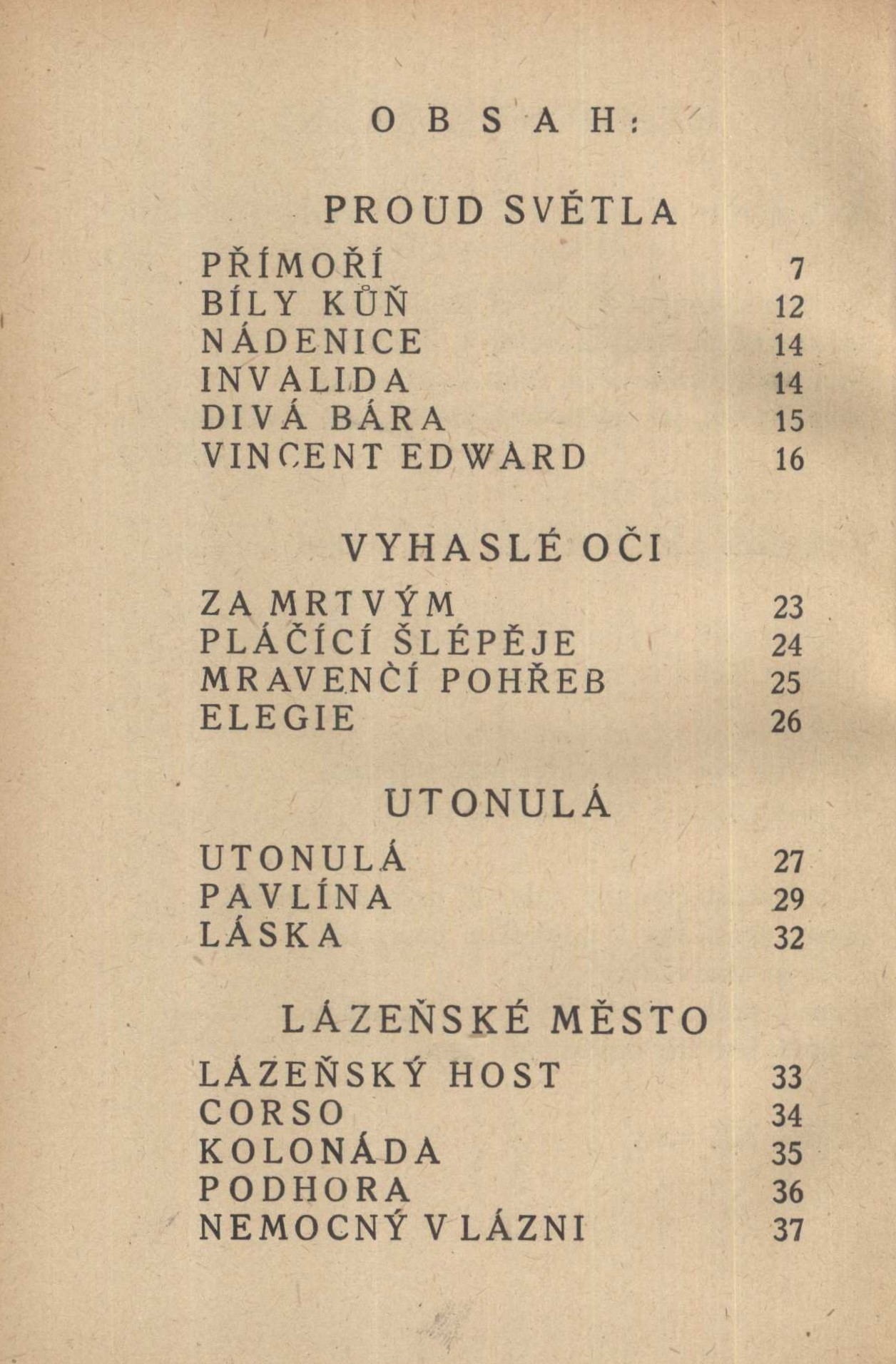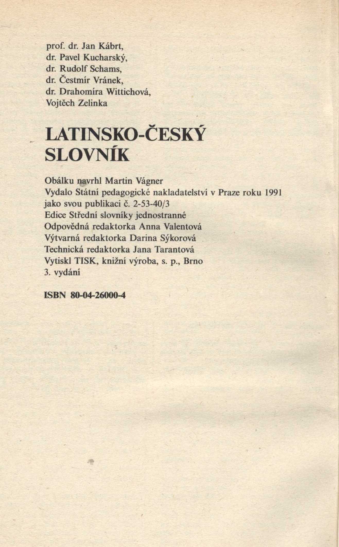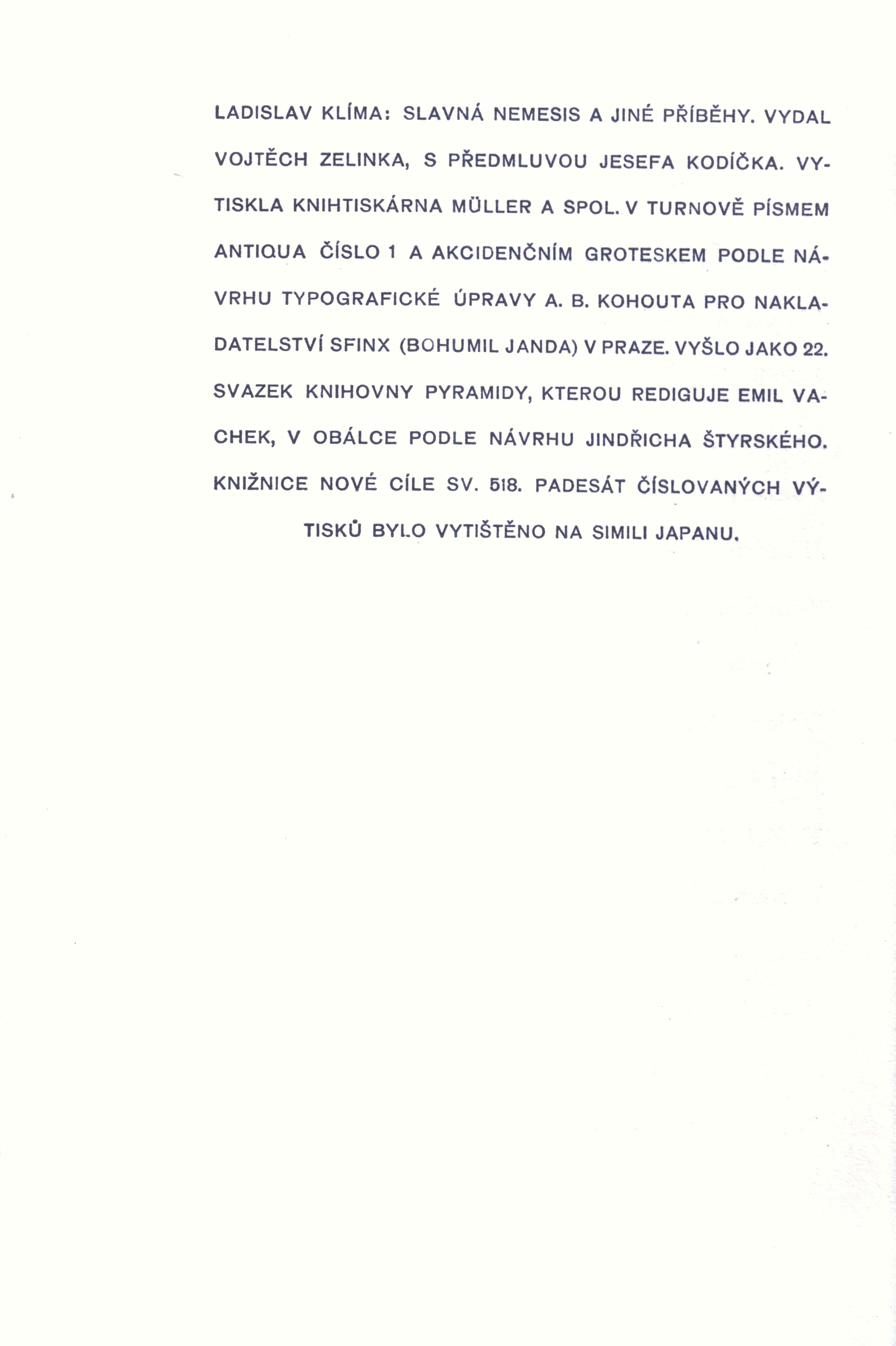 Názvové údaje Proud světla : lyrika posledních let / Jaroslav Bednář ; s obálkou Václava Maška Osobní jméno Bednář, Jaroslav, 1889-1976 (Autor) (Dedikátor) Další autoři Mašek, Václav, 1893-1973 (Autor obálky) Zelinka, Vojtěch, 1890-1963 (Dedikant) Šikýř, Oldřich (Dedikant) Korp. Evžen Rosendorf (nakladatelství) (Nakladatel, vydavatel) Graf a Stricker (tiskárna) (Tiskař) Nakladatel V Praze : Evžen K. Rosendorf, 1926 Výrobce V Žižkově : Graf a Stricker Rozsah 37 stran ; 19 cm Klíčová slova česká literatura * poezie * básně Počet ex. 3, z toho volných 2 Druh dok. monografie Signatura VMartínek 1257, P 119 g 7, P 63 b 45 Názvové údaje Latinsko-český slovník / Jan Kábrt, Pavel Kucharský, Rudolf Schams, Čestmír Vránek, Drahomíra Wittichová, Vojtěch Zelinka Osobní jméno Kábrt, Jan, 1910-2006 (Autor) Další autoři Kucharský, Pavel, (Autor) 1910-1979 Schams, Rudolf, (Autor) 1886-1974 Vránek, Čestmír, (Autor) 1901-1978 Wittichová, Drahomíra (Autor) Zelinka, Vojtěch, (Autor) 1890-1963 Korp. Státní pedagogické nakladatelství (Nakladatel, vydavatel) Tisk Brno (tiskárna) (Tiskař) Nakladatel Praha : Státní pedagogické nakladatelství 1991 Výrobce Brno : Tisk, knižní výroba, s.p. 1991 Rozsah 483 stran ; 21,5 cm Klíčová slova jazykové slovníky * latina * čeština * latinsko-český slovník Počet ex. 1, z toho volných 1 Druh dok. monografie Signatura C12b 18133 Názvové údaje Slavná Nemesis : [a jiné příběhy] / Ladislav Klíma ; s předmluvou Josef Kodíčka ; vydal Vojtěch Zelinka ; podle návrhu typografické úpravy A.B. Kohouta ; v obálce podle návrhu Jindřicha Štyrského Osobní jméno Klíma, Ladislav, 1878-1928 (Autor) Další autoři Kodíček, Josef, 1892-1954 (Autor úvodu atd.) Zelinka, Vojtěch, 1890-1963 (Editor) Kohout, Alois Bohumil, 1897-1977 (Typograf) Štyrský, Jindřich, 1899-1942 (Autor obálky) Korp. Nakladatelství B. Janda - Sfinx (Nakladatel, vydavatel) Müller a spol. (tiskárna) (Tiskař) Nakladatel Praha : Sfinx, B. Janda, 1932 Výrobce Turnov : Müller a spol. Rozsah 300 stran ; 27 cm Klíčová slova česká literatura * výbor z díla * filozofické prózy * autobiografické prvky * Klíma L. * stol. 20., léta 30. Počet ex. 2, z toho volných 2 Druh dok. monografie Signatura EJulis 0191, JVladislav 855 Názvové údaje O Pánu Bohu / Božena Němcová ; vybral a poznámkami opatřil Vojtěch Zelinka ; [vyzdobil František Vik] Osobní jméno Němcová, Božena, 1820-1862 (Autor) Další autoři Braunerová, Zdenka, 1858-1934 (Dedikant) Zelinka, Vojtěch, 1890-1963 (Editor) (Sestavovatel, kompilátor) (Autor doslovu, tiráže atd.) Vik, František, 1895-1957 (Ilustrátor) Kuncíř, Ladislav, 1890-1974 (Nakladatel, vydavatel) Hellmuth-Brauner, Vladimír, 1910-1982 (Dedikant) Korp. Ladislav Kuncíř (nakladatelství a knihkupectví) (Nakladatel, vydavatel) František Obzina (tiskárna, nakladatelství) (Tiskař) Nakladatel V Praze : U Ladislava Kuncíře, 1929 Výrobce František Obzina) Rozsah 37 s. : il. Klíčová slova česká literatura * česká próza * pohádky * české pohádky * literatura pro děti * literatura pro děti a mládež * Ježíš Nazaretský Počet ex. 2, z toho volných 2 Druh dok. monografie Signatura KaG XXXII C 82, VHB 0884 Názvové údaje Obrazové dějiny literatury české. Díl II., Od Hálka a Nerudy až po naše časy : s dodatkem Úvod do českého básnictví / napsali Gustav Pallas a Vojtěch Zelinka Osobní jméno Pallas, Gustav, 1882-1964 (Autor) Další autoři Zelinka, Vojtěch, 1890-1963 (Autor) Korp. Česká grafická Unie (tiskárna a nakladatelství) (Nakladatel, vydavatel) Unie (tiskárna) (Tiskař) Nakladatel V Praze : nákladem České grafické Unie a. s., 1926 Výrobce V Praze : tiskem Unie Rozsah 4 nečíslované strany, 557 stran, 10 nečíslovaných listů obrazových příloh : ilustrace (částečně barevné), portréty, faksimile, noty ; Klíčová slova česká literatura * dějiny * literatura * Čechy a Morava * obrazové publikace * obrazové přílohy * r. 1926 Druh dok. monografie Odkazy (1) - Monografie Názvové údaje Obrazové dějiny literatury české. Díl I., Od nejstarších dob až do Hálka a Nerudy / napsali Gustav Pallas a Vojtěch Zelinka Osobní jméno Pallas, Gustav, 1882-1964 (Autor) Další autoři Zelinka, Vojtěch, 1890-1963 (Autor) Korp. Česká grafická Unie (tiskárna a nakladatelství) (Nakladatel, vydavatel) Unie (tiskárna) (Tiskař) Nakladatel V Praze : nákladem České grafické Unie a. s., 1926 Výrobce V Praze : tiskem Unie Rozsah viii, 415 stran, 18 nečíslovaných listů obrazové přílohy, 557 stran, 10 listů obrazové přílohy : ilustrace (částečně barevné), faksimile, noty ; 25 cm Klíčová slova česká literatura * dějiny * literatura * Čechy a Morava * obrazové publikace * obrazové přílohy * r. 1926 Počet ex. 1, z toho volných 1 Druh dok. monografie Signatura VZinková 0813/přív. Odkazy (1) - Monografie Názvové údaje Obrazové dějiny literatury české / napsali Gustav Pallas a Vojtěch Zelinka. Díl. II., Od Hálka a Nerudy až po naše časy Osobní jméno Pallas, Gustav, 1882-1964 (Autor) Další autoři Zelinka, Vojtěch, 1890-1963 (Autor) Nakladatel V Praze : Nákladem České grafické unie, 1926 Výrobce (Unie) Rozsah 557 s., [11] l. obr. příl. : il., faksim. Klíčová slova česká literatura * dějiny literatury * stol. 19.-20. Počet ex. 1, z toho volných 1 Druh dok. monografie Signatura C12c 1769/2. Názvové údaje Obrazové dějiny literatury české / napsali Gustav Pallas a Vojtěch Zelinka. Díl. I., Od nejstarších dob až do Hálka a Nerudy Osobní jméno Pallas, Gustav, 1882-1964 (Autor) Další autoři Zelinka, Vojtěch, 1890-1963 (Autor) Nakladatel V Praze : Nákladem České grafické unie, 1926 Výrobce (Unie) Rozsah viii, 415 s., [16] l. obr. příl. : il., faksim. Klíčová slova česká literatura * dějiny literat