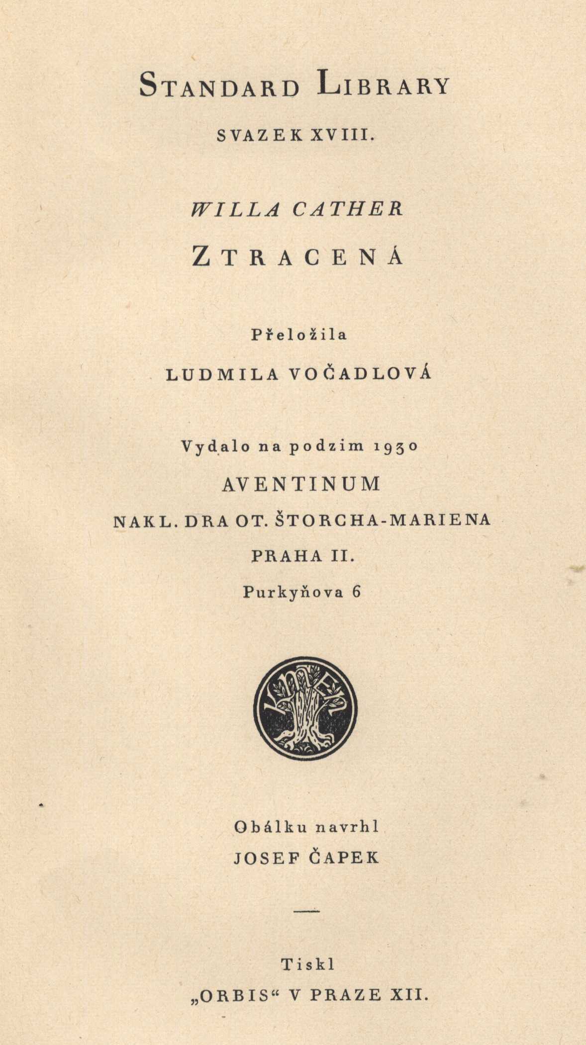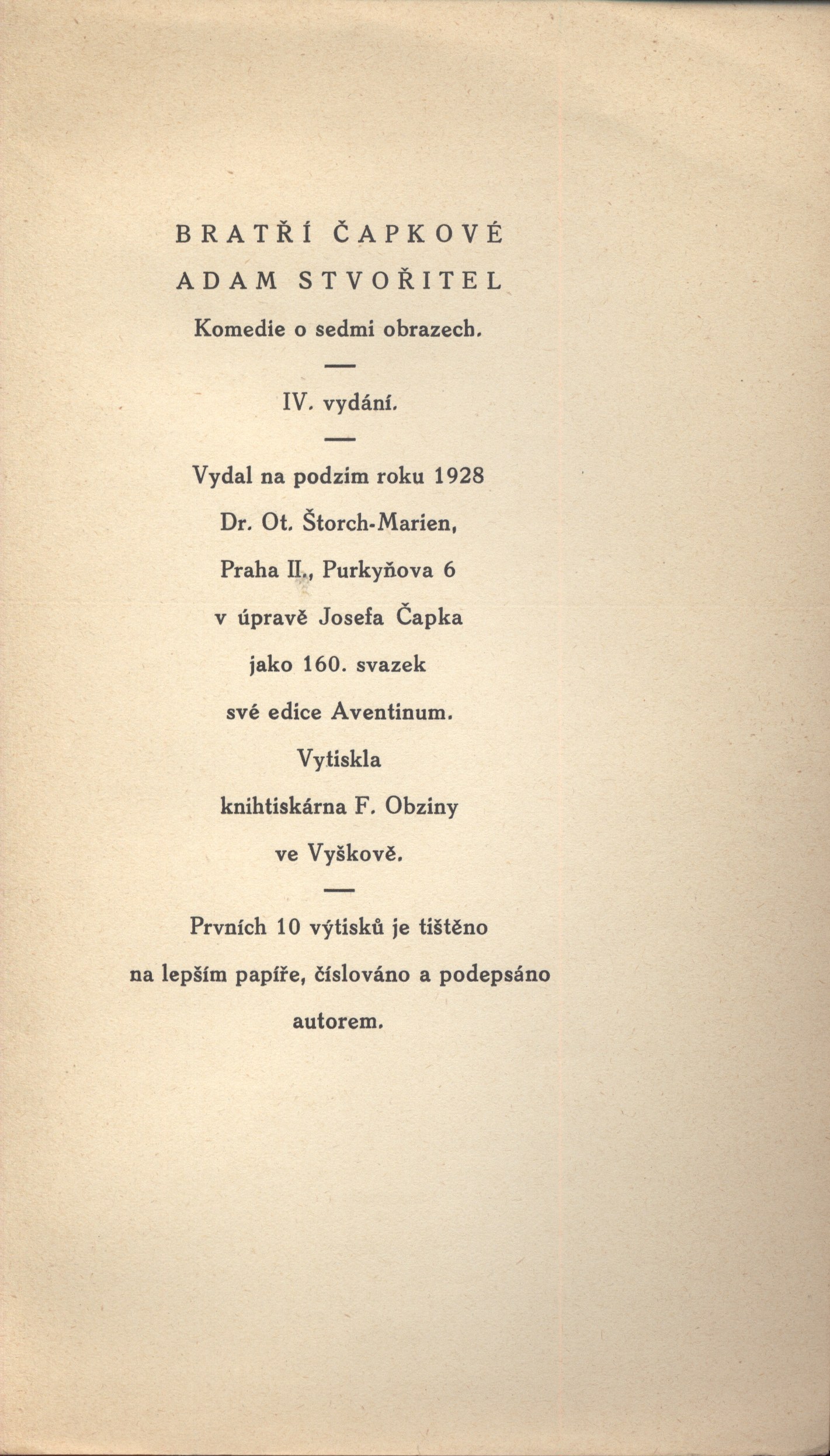 Názvové údaje Básně G[uillaumea] Apollinairea : vybrané z knih: Hnijící kouzelník, Alkoholy, Kalligramy / překlad Miloše Hlávky s použitím K. Čapkova Pásma ; upravil F. Muzika Osobní jméno Apollinaire, Guillaume, 1880-1918 (Autor) Další autoři Hlávka, Miloš, 1907-1945 (Překladatel) Čapek, Karel, 1890-1938 (Jiná role) Muzika, František, 1900-1974 (Knižní grafik) Korp. Aventinum (nakladatelství) (Nakladatel, vydavatel) Vokolek, Václav (tiskárna : Pardubice) (Tiskař) Nakladatel Praha : Aventinum, 1929 Výrobce V Pardubicích : Václav Vokolek Rozsah 68 stran : Klíčová slova francouzská poezie * výbory * stol. 20. Počet ex. 3, z toho volných 3 Druh dok. monografie Signatura M 183 f 68, P 107 a 51, P 91 g 15 Názvové údaje Zavražděný básník : román / Guillaume Apollinaire ; [autorisovaný překlad M. Šramla a J. Seiferta ; upravil a obálku nakreslil K. Teige] Osobní jméno Apollinaire, Guillaume, 1880-1918 (Autor) Další autoři Teige, Karel, 1900-1951 (Knižní grafik) (Autor obálky) Seifert, Jaroslav, 1901-1986 (Překladatel) Štorch-Marien, Otakar, 1897-1974 (Nakladatel, vydavatel) Bernard, Maxim, 1902-1949 (Překladatel) Korp. Aventinum (nakladatelství) (Nakladatel, vydavatel) František Obzina (tiskárna, nakladatelství) (Tiskař) Nakladatel Praha : Dr. Ot. Štorch-Marien, 1925 Výrobce Knihtiskárna F. Obziny) Rozsah 84 s. Klíčová slova francouzská literatura * francouzská próza * román * avantgarda Počet ex. 1, z toho volných 1 Druh dok. monografie Signatura KaG XV C 145 Názvové údaje Zavražděný básník : román / Guillaume Apollinaire ; autorisovaný překlad M. Šramla a J. Seiferta Osobní jméno Apollinaire, Guillaume, 1880-1918 (Autor) Další autoři Seifert, Jaroslav, 1901-1986 (Překladatel) Šraml, Max, 1902-1949 (Překladatel) Teige, Karel, 1900-1951 (Autor obálky) (Knižní grafik) Mrkvička, Otakar, 1898-1957 (Autor obálky) Hořejší, Jindřich, 1886-1941 (Dřívější majitel) Korp. Dr. Ot. Štorch-Marien (nakladatelství) (Nakladatel, vydavatel) Aventinum (nakladatelství) (Nakladatel, vydavatel) František Obzina (tiskárna, nakladatelství) (Tiskař) Nakladatel Praha : Aventinum, Dr. Ot. Štorch-Marien, 1925 Výrobce Ve Vyškově na Moravě : knihtiskárna F. Obziny Rozsah 84 stran ; 22 cm Klíčová slova francouzská literatura * próza * Apollinaire G. * román * český překlad * Šraml M. * Seifert J. * r. 1925 Počet ex. 2, z toho volných 2 Druh dok. monografie Signatura OŘíha 323, AHO 0382 Názvové údaje Deset let Aventina : 1919-1929 : seznam knih vydaný k 15. září roku 1929 Záhlaví-korpor. Aventinum (nakladatelství) (Nakladatel, vydavatel) Další autoři Štorch-Marien, Otakar, 1897-1974 (Autor úvodu atd.) Korp. František Obzina (tiskárna, nakladatelství) (Tiskař) Nakladatel Praha : Aventinum, 1929 Výrobce Knihtiskárna F. Obziny) Rozsah 67 s. Klíčová slova česká literatura * česká nakladatelství * katalog nakladatelství * knihy Počet ex. 1, z toho volných 1 Druh dok. monografie Signatura KaG V B 17 Názvové údaje Londýnský antikvář / Arnold Bennett ; [přeložila Ludmila Vočadlová ; obálku navrhl Josef Čapek] Osobní jméno Bennett, Arnold, 1867-1931 (Autor) Další autoři Vočadlová, Ludmila, 1895-1982 (Překladatel) Čapek, Josef, 1887-1945 (Autor obálky) Korp. Aventinum (nakladatelství) (Nakladatel, vydavatel) Orbis (tiskárna) (Tiskař) Nakladatel Praha : Aventinum, 1931 Výrobce (Orbis) Rozsah 304 s. ; 22 cm Klíčová slova anglická próza * romány Počet ex. 1, z toho volných 1 Druh dok. monografie Signatura VMartínek 1016 Názvové údaje Moje pohádka : cyklus šesti dřevorytů / František Bílek Osobní jméno Bílek, František, 1872-1941 (Autor) (Ilustrátor) (Grafický technik) Další autoři Karásek ze Lvovic, Jiří, 1871-1951 (Autor podpisu) Korp. Aventinum (nakladatelství) (Nakladatel, vydavatel) František Obzina (tiskárna, nakladatelství) (Tiskař) Nakladatel Praha : Aventinum, 1921 Výrobce Fr. Obzina) Rozsah [6] s., [6] l. obr. příl. : il. Klíčová slova česká literatura * české umění * česká grafika * grafické listy * album * dřevoryty * bibliofilie * bibliofilská vydání * bibliofilské tisky Počet ex. 1, z toho volných 1 Druh dok. monografie Signatura KaG X B 16 Názvové údaje Ztracená / Willa Cather ; [přeložila Ludmila Vočadlová ; obálku navrhl Josef Čapek] Osobní jméno Cather, Willa Sibert, 1873-1947 (Autor) Další autoři Vočadlová, Ludmila, 1895-1982 Čapek, Josef, 1887-1945 (Překladatel) Korp. Aventinum (nakladatelství) (Nakladatel, vydavatel) Orbis (tiskárna) (Tiskař) Nakladatel Praha : Aventinum, 1930 Rozsah 111 s. ; 22 cm Klíčová slova americká próza * romány Počet ex. 1, z toho volných 1 Druh dok. monografie Signatura VMartínek 1012 Názvové údaje Pan-Evropa / R. Coudenhove-Kalergi ; [v překladu O. Laurinové ; s předmluvou Ed. Beneše] Osobní jméno Coudenhove-Kalergi, Richard Nicolaus von, 1894-1972 (Autor) Další autoři Laurinová, Olga, 1892-1950 (Překladatel) Beneš, Edvard, 1884-1948 (Autor úvodu atd.) Korp. Aventinum (nakladatelství) (Nakladatel, vydavatel) Orbis (tiskárna) (Tiskař) Nakladatel Praha : Aventinum, 1926 Výrobce (Orbis) Rozsah 111 s., [1] příl. Klíčová slova německá literatura * Evropa * evropanství * evropská politika Počet ex. 1, z toho volných 1 Druh dok. monografie Signatura KaG XXV B 2 Názvové údaje Adam stvořitel : komedie o sedmi obrazech / bratří Čapkové ; [v úpravě Josefa Čapka] Osobní jméno Čapek, Josef, 1887-1945 (Autor) (Knižní grafik) Další autoři Čapek, Karel, 1890-1938 (Autor) Korp. Dr. Ot. Štorch-Marien (nakladatelství) (Nakladatel, vydavatel) Aventinum (nakladatelství) (Nakladatel, vydavatel) František Obzina (tiskárna, nakladatelství) (Tiskař) Nakladatel Praha : Aventinum, Dr. Ot. Štorch-Marien, 1928 Výrobce F. Obzina) Rozsah 92 s. : il. ; 22 cm Klíčová slova č