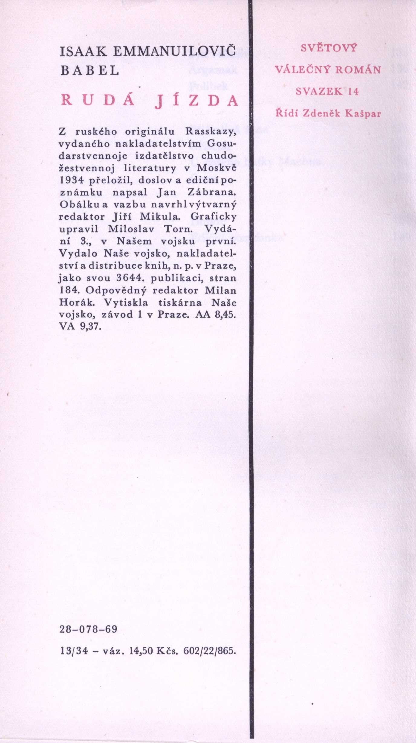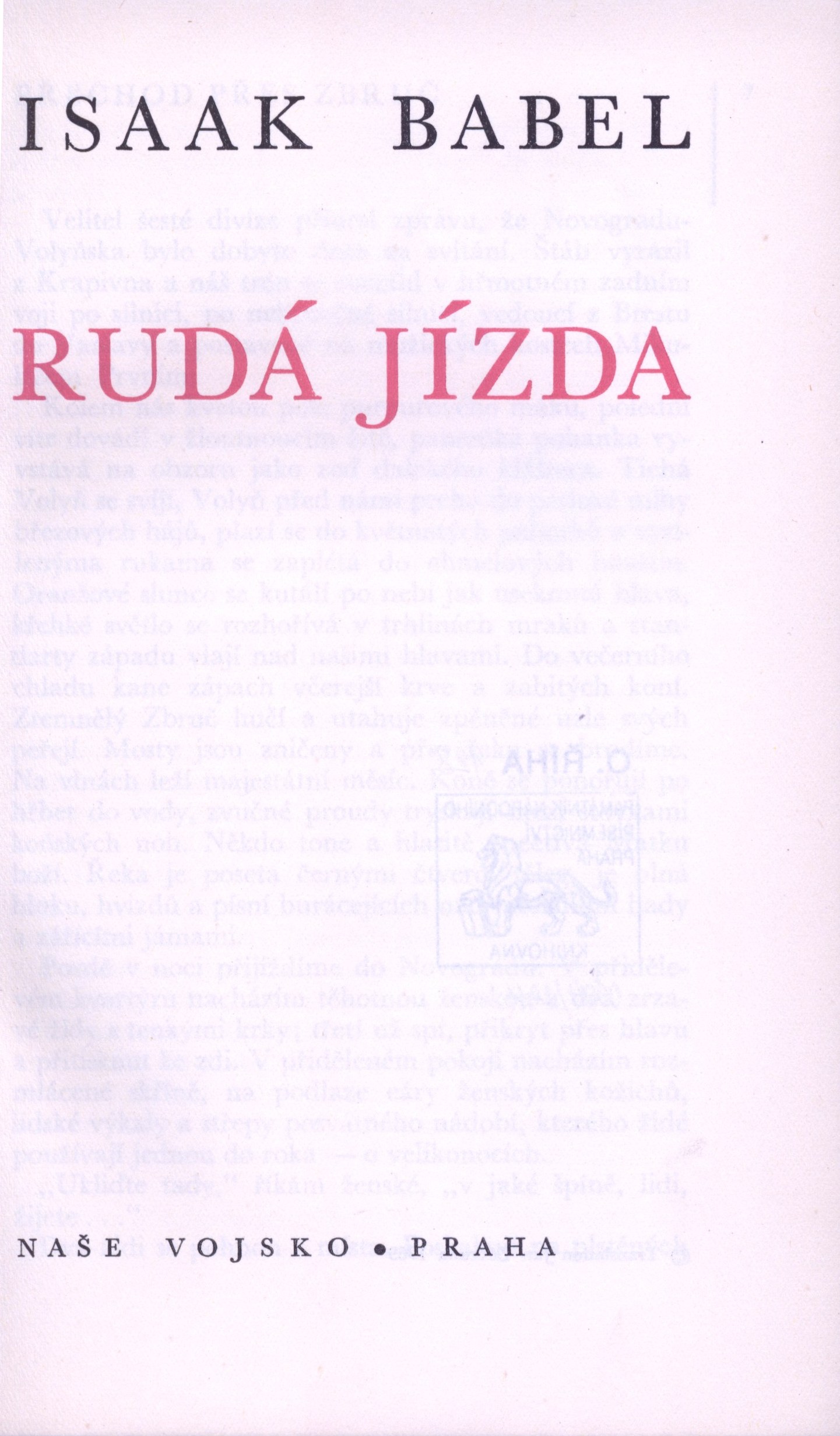 Názvové údaje Historie mého holubníku / Isaak Babel ; [z ruštiny přeložil a uspořádal Jan Zábrana ; doslov Vladimír Novotný ; ilustrovala Eva Bednářová ; obálku, vazbu a grafickou úpravu navrhl Pavel Hrach] Osobní jméno Babel‘, Isaak Èmmanuilovič, 1894-1940 (Autor) Další autoři Zábrana, Jan, 1931-1984 (Překladatel) (Editor) Novotný, Vladimír, 1946- (Autor doslovu, tiráže atd.) Bednářová, Eva, 1937-1986 (Ilustrátor) Hrach, Pavel, 1947- (Autor obálky) (Výtvarník vazby) (Grafický technik) Nakladatel Praha : Odeon, 1986 Výrobce Stráž) Rozsah 356 s. : il Klíčová slova sovětská literatura * ruská literatura * překlad * próza * povídky * výbor Počet ex. 1, z toho volných 1 Druh dok. monografie Signatura NK/86 0053 Názvové údaje Konarmija = Konarmia / I. Babel' Osobní jméno Babel‘, Isaak Èmmanuilovič, 1894-1940 (Autor) Nakladatel Letchworth : Prideau Press, 1976 Rozsah 142 stran ; 20 cm Osobní hesla Babel‘, Isaak Èmmanuilovič, 1894-1940 - ruský novinář, dramatik, esejista Klíčová slova ruská literatura * ruská próza * povídky Počet ex. 1, z toho volných 1 Druh dok. monografie Signatura BVolkova 1016 Názvové údaje Oděské povídky / Isaak Babel ; z ruského originálu ... přeložil Jan Zábrana ; čtrnácti dvoubarevnými a patnácti jednobarevnými dřevory vyzdobil a graficky upravil Jiří Šindler Osobní jméno Babel‘, Isaak Èmmanuilovič, 1894-1940 (Autor) Další autoři Zábrana, Jan, 1931-1984 (Překladatel) Šindler, Jiří, 1922-2015 (Ilustrátor) Korp. Nakladatelství československých výtvarných umělců (Nakladatel, vydavatel) Polygrafia (tiskárna, Praha) (Tiskař) Nakladatel Praha : Nakladatelství československých výtvarných umělců, 1965 Výrobce Polygrafia Rozsah 121 stran : ilustrace Klíčová slova ruská literatura * ruská próza * povídky Počet ex. 5, z toho volných 5 Druh dok. monografie Signatura JVladislav 066, ZE 1 a 44, ZA 1 f 13, P 134 f 17, P 92 a 68 Názvové údaje Povídky / Isaak Babel ; [z ruského originálu ... a časopiseckých originálů uspořádal, přeložil a doslov napsal Jan Zábrana ; ilustroval Albín Brunovský ; obálku s použitím kresby A. Brunovského, vazbu a grafickou úpravu navrhl Jaroslav Šváb] Osobní jméno Babel‘, Isaak Èmmanuilovič, 1894-1940 (Autor) Další autoři Zábrana, Jan, 1931-1984 (Překladatel) (Autor doslovu, tiráže atd.) (Dedikátor) Brunovský, Albín, 1935-1997 (Ilustrátor) Šváb, Jaroslav, 1906-1999 (Grafický technik) Holan, Vladimír, 1905-1980 (Dedikant) Nakladatel Praha : Mladá fronta, 1964 Rozsah 247 s., 7 obr. příl. ; 19 cm Klíčová slova ruská próza * židovská tematika * židovské povídky Počet ex. 2, z toho volných 2 Druh dok. monografie Signatura Holan 1013, Fuks 0398 Názvové údaje Rudá jízda / Isaak Babel ; [z ruských originálů přeložil Jan Zábrana ; doslov napsal Vladimír Novotný ; grafická úprava, ilustrace a sazba Pavel Růt] Osobní jméno Babel‘, Isaak Èmmanuilovič, 1894-1940 (Autor) Další autoři Zábrana, Jan, 1931-1984 (Překladatel) Novotný, Vladimír, 1946- (Autor doslovu, tiráže atd.) Růt, Pavel, 1967- (Knižní grafik) (Ilustrátor) (Sazeč) Korp. Argo (nakladatelství) (Nakladatel, vydavatel) Akcent tiskárna Vimperk (Tiskař) Nakladatel Praha : Argo, 2010 Výrobce Akcent) Rozsah 179 s. : il. ; 21 cm Klíčová slova ruská literatura * ruská próza * válečný román Počet ex. 1, z toho volných 1 Druh dok. ***nezařazeno*** Signatura C12b 15801 Názvové údaje Rudá jízda / Isaak [Emmanuilovič] Babel ; z ruského originálu ... přeložil, doslov a ediční poznámku napsal Jan Zábrana ; obálku a vazbu navrhl výtvarný redaktor Jiří Mikula ; graficky upravil Miloslav Torn Osobní jméno Babel‘, Isaak Èmmanuilovič, 1894-1940 (Autor) Další autoři Zábrana, Jan, 1931-1984 (Překladatel) (Autor doslovu, tiráže atd.) (Autor úvodu atd.) Mikula, Jiří, 1926-2004 (Autor obálky) (Výtvarník vazby) Torn, Miloslav (Knižní grafik) Korp. Naše vojsko (nakladatelství) (Nakladatel, vydavatel) Naše vojsko (tiskárna) (Tiskař) Nakladatel Praha : Naše vojsko, 1969 Výrobce Naše vojsko Rozsah 180 stran ; 20,6 cm Osobní hesla Babel‘, Isaak Èmmanuilovič, 1894-1940 - ruský novinář, dramatik, esejista Klíčová slova ruská literatura * sovětská literatura * próza * překlad * povídky * válečná témata * stol. 20., léta 20. Počet ex. 2, z toho volných 2 Druh dok. monografie Signatura OŘíha 128, P 119 a 67 Názvové údaje Rudá jízda ; Oděské povídky ; Povídky / Isaak Babel ; přeložil [a doslov napsal] Jan Zábrana ; obálku a vazbu navrhl Vojtěch Tittelbach ; graficky upravil Václav Bláha Osobní jméno Babel‘, Isaak Èmmanuilovič, 1894-1940 (Autor) Další autoři Tittelbach, Vojtěch, 1900-1971 (Autor obálky) Zábrana, Jan, 1931-1984 (Překladatel) (Autor doslovu, tiráže atd.) Bláha, Václav, 1922-2021 (Knižní grafik) Korp. Svět sovětů (nakladatelství) (Nakladatel, vydavatel) Brněnské knihtiskárny (Tiskař) Nakladatel Praha : Svět sovětů, 1958 Výrobce Brno : Brněnská knihtiskárna Rozsah 340 stran Klíčová slova ruská próza * povídky * SSSR * občanská válka * r. 1918-1920 * autobiografické prvky Počet ex. 2, z toho volných 2 Druh dok. monografie Signatura C12b 10446, P 7 f 44