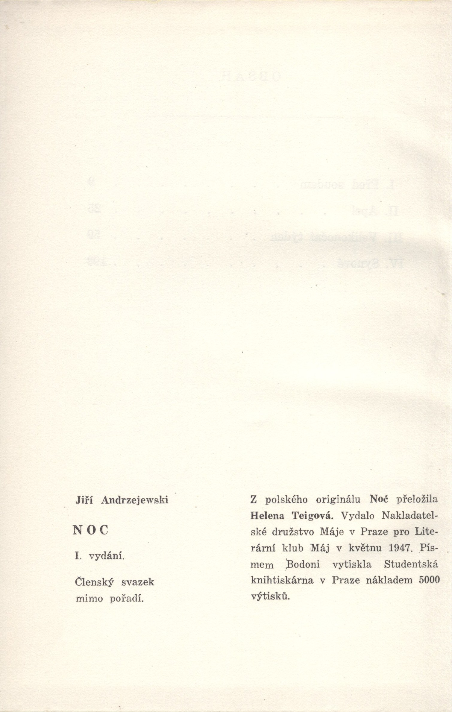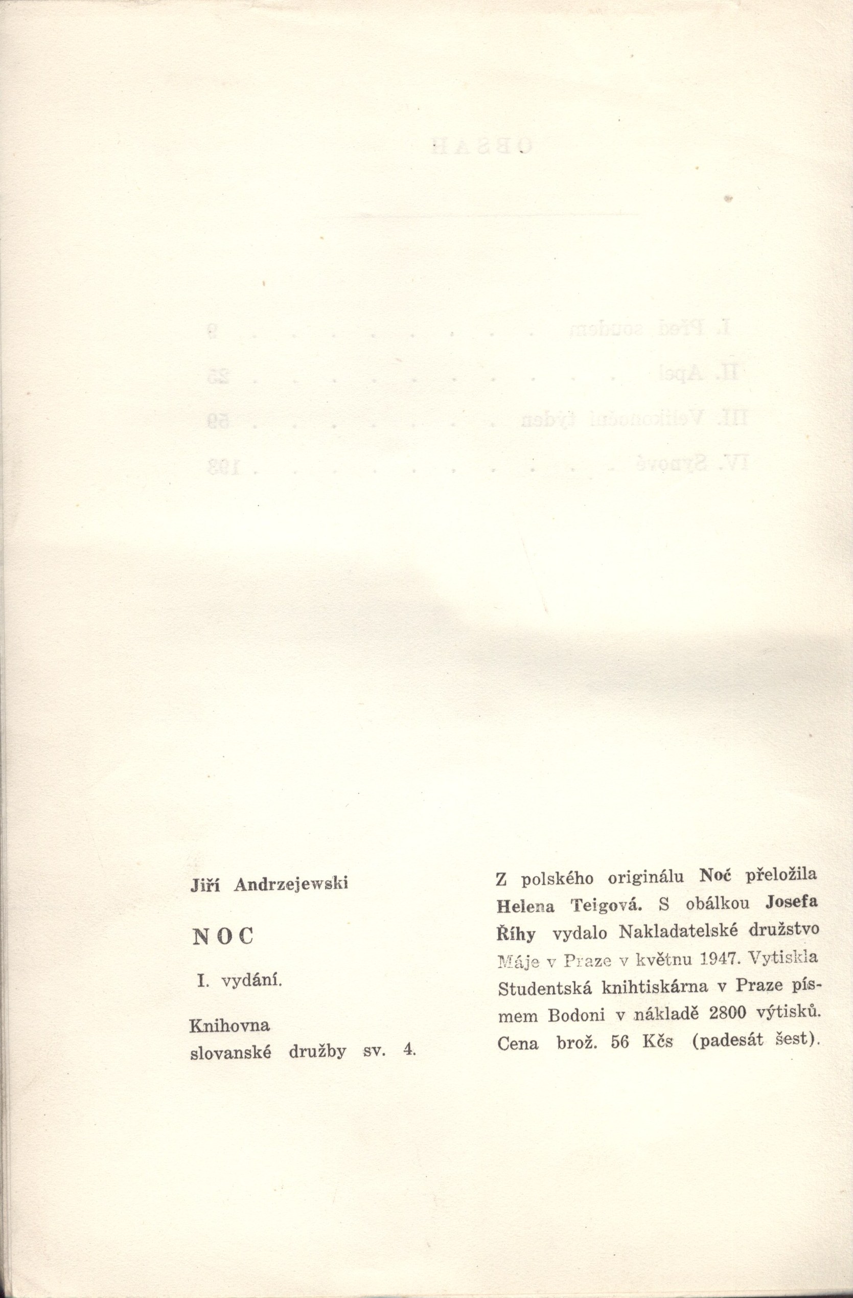 Názvové údaje Noc : povídky / Jiří Andrzejewski ; [z polského originálu ... přeložila Helena Teigová ; s obálkou Josefa Říhy] Osobní jméno Andrzejewski, Jerzy, 1909-1983 (Autor) Další autoři Teigová, Helena, 1902-1986 (Překladatel) Říha, Josef, 1920-1994 (Autor obálky) Korp. Máj (nakladatelství) (Nakladatel, vydavatel) Cíl (Rumburk) (Tiskař) Nakladatel Praha : Máj, 1948 Výrobce tiskárna Cíl) Rozsah 209 s. ; 22 cm Klíčová slova polská literatura * překlad * próza * povídky * Polsko * 2. světová válka Počet ex. 1, z toho volných 1 Druh dok. monografie Signatura Máj 107a Názvové údaje Noc : povídky / Jiří Andrzejewski ; [z polského originálu ... přeložila Helena Teigová ; s obálkou Josefa Říhy] Osobní jméno Andrzejewski, Jerzy, 1909-1983 (Autor) Další autoři Teigová, Helena, 1902-1986 (Překladatel) Říha, Josef, 1920-1994 (Autor obálky) Korp. Máj (nakladatelství) (Nakladatel, vydavatel) Cíl (Rumburk) (Tiskař) Nakladatel Praha : Máj, 1948 Výrobce tiskárna Cíl) Rozsah 209 s. ; 21 cm Klíčová slova polská literatura * překlad * próza * povídky * Polsko * 2. světová válka Počet ex. 1, z toho volných 1 Druh dok. monografie Signatura Máj 107 Názvové údaje Noc : povídky / Jiří Andrzejewski ; z polského originálu ... přeložila Helena Teigová Osobní jméno Andrzejewski, Jerzy, 1909-1983 (Autor) Další autoři Teigová, Helena, 1902-1986 (Překladatel) Korp. Nakladatelské družstvo Máje (Nakladatel, vydavatel) Studentská knihtiskárna (Tiskař) Nakladatel V Praze : vydalo Nakladatelské družstvo Máje pro Literární klub Máj, 1947 Výrobce (Studentská knihtiskárna) Rozsah 208 s. ; 21 cm Klíčová slova polská literatura * překlad * próza * povídky * Polsko * 2. světová válka Počet ex. 1, z toho volných 1 Druh dok. monografie Signatura Máj 073 Názvové údaje Noc : povídky / Jiří Andrzejewski ; [z polského originálu Noć přeložila Helena Teigová ; s obálkou Josefa Říhy ] Osobní jméno Andrzejewski, Jerzy, 1909-1983 (Autor) (Dedikátor) Další autoři Karásek ze Lvovic, Jiří, 1871-1951 (Dedikant) Stachová, Helena, 1931- (Překladatel) (Dedikátor) Říha, Josef, 1920-1994 (Autor obálky) Korp. Nakladatelské družstvo Máje (Nakladatel, vydavatel) Studentská knihtiskárna (Tiskař) Nakladatel V Praze : Nakladatelské družstvo Máje, 1947 Výrobce (Studentská knihtiskárna) Rozsah 208 s. Klíčová slova polská literatura * próza * povídky Počet ex. 1, z toho volných 1 Druh dok. monografie Signatura KaG XLI D 108 Názvové údaje Noc : povídky / Jiří Andrzejewski ; [z polského originálu ... přeložila Helena Teigová ; s obálkou Josefa Říhy] Osobní jméno Andrzejewski, Jerzy, 1909-1983 (Autor) Další autoři Teigová, Helena, 1902-1986 (Překladatel) Říha, Josef, 1920-1994 (Autor obálky) Korp. Nakladatelské družstvo Máje (Nakladatel, vydavatel) Studentská knihtiskárna (Tiskař) Nakladatel V Praze : Nakladatelské družstvo Máje, 1947 Výrobce (Studentská knihtiskárna) Rozsah 208 s. ; 22 cm Klíčová slova polská literatura * překlad * próza * povídky * Polsko * 2. světová válka Počet ex. 1, z toho volných 1 Druh dok. monografie Signatura Máj 099 Názvové údaje Popel a démant / Jerzy Andrzejewski ; z polského originálu Popiół i diament ... přeložila Helena Teigová Osobní jméno Andrzejewski, Jerzy, 1909-1983 (Autor) Další autoři Teigová, Helena, 1902-1986 (Překladatel) Prošek, Josef, 1923-1992 (Autor obálky) (Fotograf) Chvála, Alois, 1885-1973 Korp. Nakladatelství Svoboda (Nakladatel, vydavatel) Grafika (Plzeň, Česko) (Tiskař) Nakladatel Praha : Nakladatelství Svoboda, 1948 Výrobce Plzeň : Grafika Rozsah 289 stran ; 22 cm Osobní hesla Andrzejewski, Jerzy, 1909-1983 - polský prozaik, publicista, fejetonista a scenárista Předmětová hesla Andrzejewski, Jerzy (1909-1983) Klíčová slova polská literatura * próza * Andrzejewski J. * román * Polsko * konec války * překlad * Teigová H. Počet ex. 1, z toho volných 1 Druh dok. monografie Signatura VZinková 0311 Názvové údaje Strana a tvorba spisovatele / Jerzy Andrzejewski ; [Z pol.] přel. Jaroslav Závada Osobní jméno Andrzejewski, Jerzy, 1909-1983 (Autor) Další autoři Závada, Jaroslav, 1907-1964 (Překladatel) Nakladatel Praha : Československý spisovatel, 1953 Rozsah 90 s. Klíčová slova polská literatura * literární tvorba * angažovanost * studie Počet ex. 2, z toho volných 2 Druh dok. monografie Signatura AČS 02249, AČS 02249a