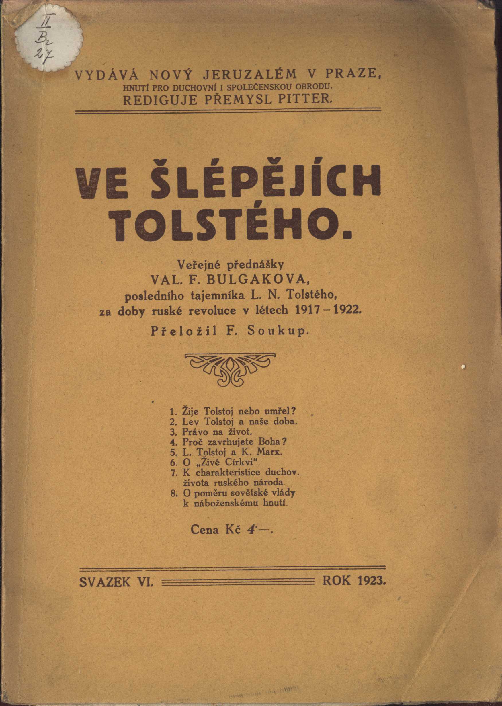 Názvové údaje Z deníku Amielova : Dle výboru L. N. Tolstého / Henri Amiel ; Z frančiny přel. Lev Šolc ; Josef Jeřábek Osobní jméno Amiel, Henri Frédéric, 1821-1881 (Autor) Další autoři Tolstoj, Lev Nikolajevič, 1828-1910 (Editor) Šolc, Lev, 1861-1907 (Překladatel) Jeřábek, Josef, 1877-1957 Nakladatel Praha : Jan Laichter, b.r Rozsah 32 s. Osobní hesla Jeřábek, Josef, 1877-1957 - pedagog, matematik, znalec hudebního umění Klíčová slova francouzská literatura * deníky * úvahy * výbor * stol. 19., léta 40.-50. Počet ex. 1, z toho volných 1 Druh dok. monografie Signatura C12a 1426 Názvové údaje Z denníku Amielova / dle výboru L. N. Tolstého ; z frančiny přel. Lev Šolc Osobní jméno Amiel, Henri Frédéric, 1821-1881 (Autor) Další autoři Šolc, Lev, 1861-1907 (Překladatel) Tolstoj, Lev Nikolajevič, 1828-1910 (Sestavovatel, kompilátor) (Autor úvodu atd.) Korp. Jan Laichter (nakladatelství) (Nakladatel, vydavatel) Albert Malíř (tiskárna a nakladatelství) (Tiskař) Tělocvičná jednota Sokol Královské Vinohrady (Dřívější majitel) Nakladatel Praha : Nákladem Jana Laichtera, 1903 Výrobce (Tiskem Alberta Malíře) Rozsah 189 s. ; 8° Osobní hesla Amiel, Henri Frédéric, 1821-1881 - švýcarský prozaik Klíčová slova Švýcarsko * prozaici * švýcarští spisovatelé * filozofie * úvahy * umění * stol. 19., léta 20.-stol. 20., léta 80. * deníky Počet ex. 2, z toho volných 2 Druh dok. monografie Signatura Holan 229, KaG XXVIII D 51 Názvové údaje Lev Tolstoj v poslední rok svého života : Deník tajemníka L. N. Tolstého / V. F. Bulgakov ; Přel. Josef Hostovský ; Spisovatelova předml. k českému vyd Osobní jméno Bulgakov, Valentin Fedorovič, 1886-1966 (Autor) Další autoři Hostovský, Josef, 1882-1965 (Překladatel) Bulgakov, Valentin Fedorovič, 1886-1966 (Autor úvodu atd.) Nakladatel Praha : B. Kočí, 1923 Rozsah 430 s. : il Osobní hesla Tolstoj, Lev Nikolajevič, 1828-1910 - ruský prozaik, dramatik, publicista, myslitel a pedagog * Tolstoj, Lev Nikolajevič, 1828-1910 - ruský prozaik, dramatik, publicista, myslitel a pedagog * Tolstoj, Lev Nikolajevič, 1828-1910 - ruský prozaik, dramatik, publicista, myslitel a pedagog Klíčová slova ruská literatura * životopisná literatura * Tolstoj L. N. * r. 1923 Počet ex. 1, z toho volných 1 Druh dok. monografie Signatura MUK 973 Názvové údaje Ve šlépějích Tolstého / veřejné přednášky Val. F. Bulgakova ; přeložil F. Soukup Osobní jméno Bulgakov, Valentin Fedorovič, 1886-1966 (Autor) Další autoři Pitter, Přemysl, 1895-1976 (Autor doslovu, tiráže atd.) Korp. Nový Jeruzalém (spolek) (Nakladatel, vydavatel) Knihtiskárna Staněk (tiskárna) (Tiskař) Nakladatel Nový Jeruzalém, 1923 Výrobce (Knihtiskárna Staněk) Rozsah 93 s. Osobní hesla Tolstoj, Lev Nikolajevič 1828-1910 - ruský prozaik, dramatik, publicista, myslitel a pedagog Klíčová slova ruská literatura * přednášky * přednáška * filozofie * etika * náboženství * křesťanství * SSSR * Tolstoj L. N. Počet ex. 2, z toho volných 2 Druh dok. monografie Signatura KaG II B2 27, KaG XLI D 115 Názvové údaje Tolstoj, apoštol lidskosti a míru : řeč, kterou měl při posmrtné oslavě L. N. Tolstého pořádané Osvětovým svazem na radnici Staroměstské 26. prosince 1910 / Frant. Drtina Osobní jméno Drtina, František, 1861-1925 (Autor) (Nakladatel, vydavatel) Další autoři Edvard Leschinger (firma) (Tiskař) Nakladatel V Praze : nákladem vlastním, 1911 Tiskem Edavrda Leschingra Rozsah 13 stran ; 23, 5 cm Osobní hesla Tolstoj, Lev Nikolajevič, 1828-1910 - ruský prozaik, dramatik, publicista, myslitel a pedagog Klíčová slova ruští spisovatelé * ruská literatura * humanismus * úmrtí * oslavné projevy Počet ex. 1, z toho volných 1 Druh dok. separáty Signatura Patočka 0422 Názvové údaje Životní názor L.N. Tolstého / napsal Frant. Drtina Osobní jméno Drtina, František, 1861-1925 (Autor) Další autoři Edvard Leschinger (firma) (Tiskař) Nakladatel V Praze : [nakladatel není známý], 1910 Výrobce Tiskem Edvarda Leschingra Rozsah 13 stran ; 24 cm Osobní hesla Tolstoj, Lev Nikolajevič, 1828-1910 - ruský prozaik, dramatik, publicista, myslitel a pedagog Klíčová slova ruští spisovatelé * filozofické názory * životní filozofie * pojednání * separáty Počet ex. 1, z toho volných 1 Druh dok. monografie Signatura Patočka 0420 Názvové údaje Portréty : Čechov, Tolstoj, Korolenko, Andrejev, Kocjubynskyj, Jesenin, Blok / Maxim Gorkij ; z ruského originálu přeložil, upravil a doslov napsal Jaroslav Hulák ; obálku a vazbu navrhl Václav Bláha Osobní jméno Gor‘kij, Maksim, 1868-1936 (Autor) Další autoři Hulák, Jaroslav, 1920-1999 (Překladatel) Bláha, Václav, 1922-2021 (Autor obálky) Korp. Nakladatelství Svoboda (Nakladatel, vydavatel) Nakladatel Praha : Svoboda, 1968 Rozsah 174 stran Osobní hesla Čechov, Anton Pavlovič, 1860-1904 - ruský prozaik, dramatik a lékař * Tolstoj, Lev Nikolajevič, 1828-1910 - ruský prozaik, dramatik, publicista, myslitel a pedagog * Korolenko, Vladimir Galaktionovič, 1853-1921 - ruský prozaik * Andrejev, Leonid Nikolajevič, 1871-1919 - ruský prozaik, dramatik * Kocjubyns‘kyj, Mychajlo Mychajlovyč, 1864-1913 - ukrajinský spisovatel, veřejný činitel * Jesenin, Sergej Aleksandrovič, 1895-1925 - ruský básník * Blok, Aleksandr Aleksandrovič, 1880-1921 - ruský básník, spisovatel, dramatik, publicista a literární kritik Klíčová slova ruská literatura * ruští spisovatelé * vzpomínky * portréty * biografie * stol. 19.-20. Počet ex. 2, z toho volných 2 Druh dok. monografie Signatura C12b 4403, P 112 d 38 Názvové údaje Vzpomínky na Lva Nikolajeviče Tolstého / Maxim Gorkij ; přeložili Sáva Racek a Jiří Weil ; portrét L. N. Tolstého nakreslil Ladislav Süss Osobní jméno Gor‘kij, Maksim, 1868-1936 (Autor) Další autoři R