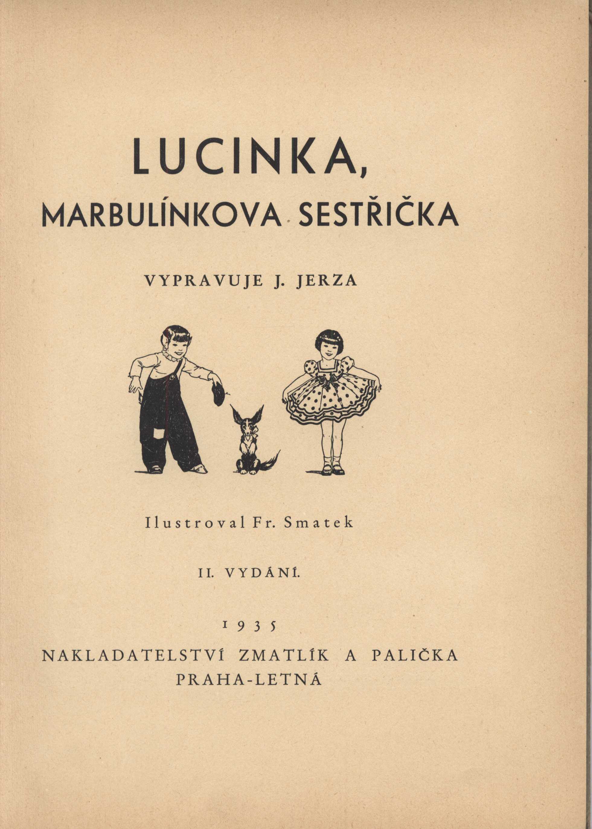 Názvové údaje Lucinka, Marbulínkova sestřička / vypravuje J. Jerza ; ilustroval Fr. Smatek Osobní jméno Jerza, J., 1869-1949 (Autor) Další autoři Smatek, Fráňa, 1899-1978 (Ilustrátor) Korp. Zmatlík a Palička (nakladatelství) (Nakladatel, vydavatel) (Tiskař) Nakladatel Praha : Zmatlík a Palička, 1935 Rozsah 64 stran : ilustrace ; 25 cm Klíčová slova publikace pro děti * česká próza * příběhy Počet ex. 1, z toho volných 1 Druh dok. monografie Signatura C12c 4711 Názvové údaje Hodiny šťastného člověka : praktický návod, kterak zachovati možno zdraví a svěžest do pozdního stáří, kterak nalézti mír a klid a žíti životem blažených / J. Jerza [pseud.] Osobní jméno Jerza, J., 1869-1949 (Autor) Další autoři Zmatlík a Palička (nakladatelství) (Nakladatel, vydavatel) Nakladatel Praha-Letná : Zmatlík a Palička, [1921] Rozsah 63 stran Klíčová slova životní styl * duševní zdraví * zdraví * poučné spisy Počet ex. 1, z toho volných 1 Druh dok. monografie Signatura M 68 g 12 Názvové údaje Kašpárkovy veselé pohádky / vypravuje J. Jerza [pseud.] ; ilustroval Fr. Smatek Osobní jméno Jerza, J., 1869-1949 (Autor) Další autoři Smatek, Fráňa, 1899-1978 (Ilustrátor) Korp. Zmatlík a Palička (nakladatelství) (Nakladatel, vydavatel) Nakladatel Praha-Letná : Zmatlík a Palička, 1933 Rozsah 95 stran, 1 nečíslovaná strana obrazové přílohy Klíčová slova literatura pro děti * pohádky Počet ex. 1, z toho volných 1 Druh dok. monografie Signatura Z B 5 d 42