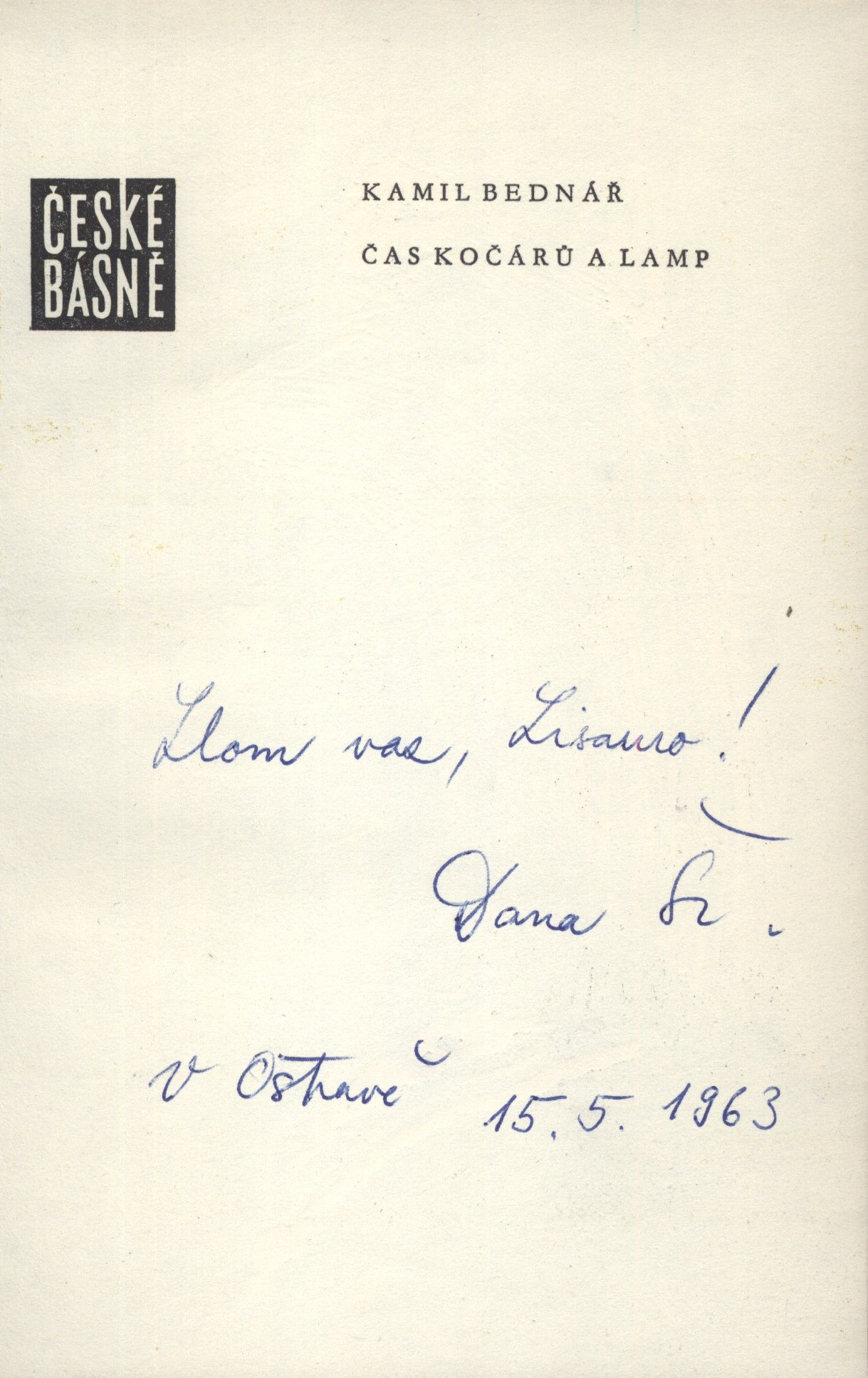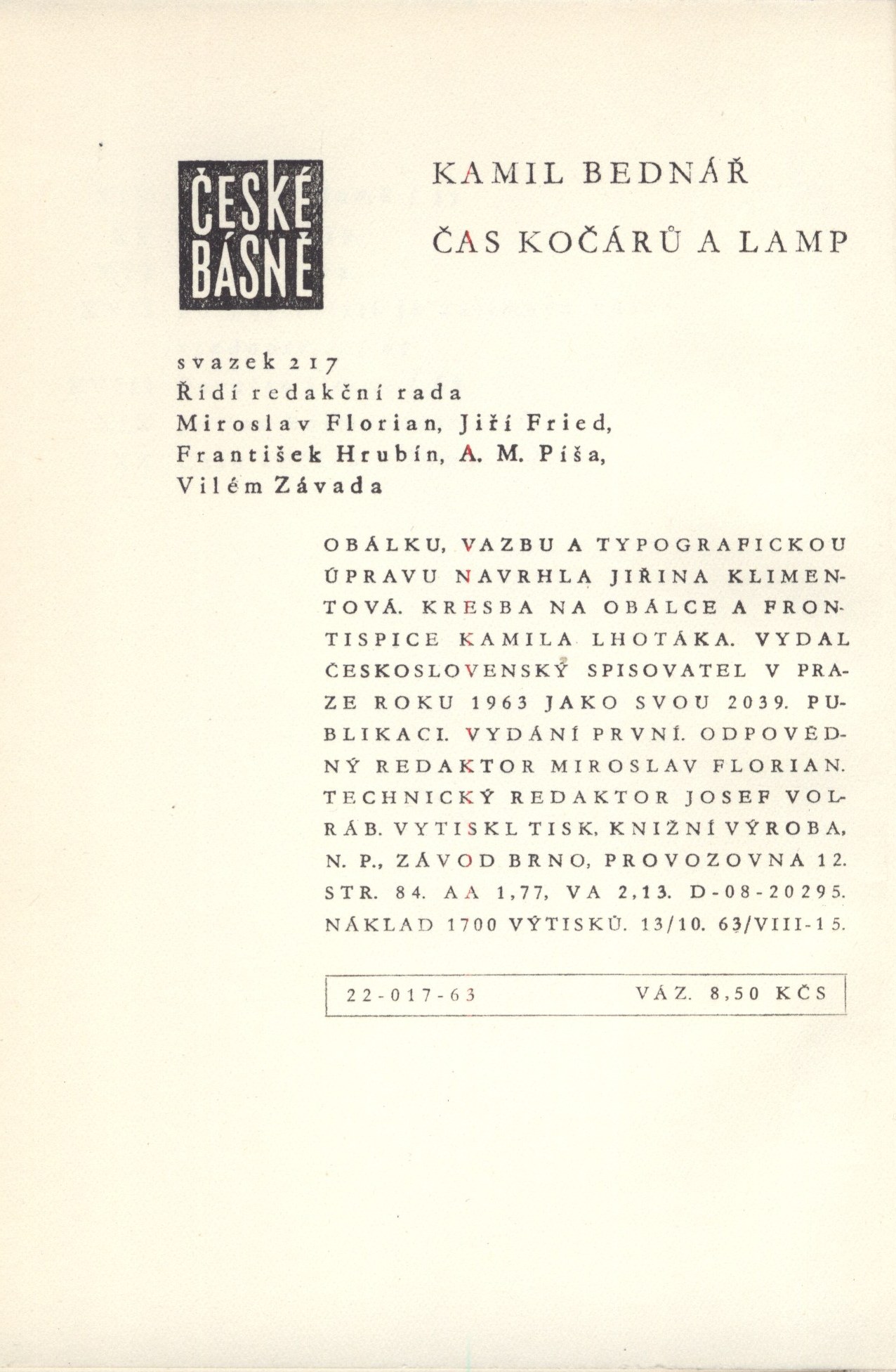 Názvové údaje Cikcak / Paul Andreota ; Z franc. přel Eva Ruxová ; Obálku s použitím kresby Kamila Lhotáka navrhl Zdenek Seydl Osobní jméno Andreota, Paul, 1917- (Autor) Další autoři Ruxová, Eva, 1923- (Překladatel) Seydl, Zdenek, 1916-1978 (Grafický technik) Lhoták, Kamil, 1912-1990 (Ilustrátor) Nakladatel Praha : Československý spisovatel, 1970 Rozsah 153 s. Klíčová slova francouzská literatura * próza * detektivní román Počet ex. 2, z toho volných 2 Druh dok. monografie Signatura AČS 00364, AČS 00364a Názvové údaje Čas kočárů a lamp / Kamil Bednář ; [obálku, vazbu a typogr. úpr. navrhla Jiřina Klimentová ; kresba na obálce a frontisp. Kamila Lhotáka] Osobní jméno Bednář, Kamil, 1912-1972 (Autor) Další autoři Klimentová, Jiřina, 1932-1997 (Grafický technik) Lhoták, Kamil, 1912-1990 (Ilustrátor) Korp. Československý spisovatel (nakladatelství) (Nakladatel, vydavatel) Nakladatel Praha : Československý spisovatel, 1963 Rozsah 78 s. Klíčová slova česká literatura * poezie * básnická sbírka * stol. 20., léta 60. Počet ex. 4, z toho volných 4 Druh dok. monografie Signatura C12a 1625, LK P 50 g 42, AČS 05308, AČS 05308a Názvové údaje Čas kočárů a lamp / Kamil Bednář ; [obálku, vazbu a typografickou úpravu navrhla Jiřina Klimentová ; kresba na obálce a frontispice Kamila Lhotáka] Osobní jméno Bednář, Kamil, 1912-1972 (Autor) Další autoři Klimentová, Jiřina, 1932-1997 (Autor obálky) (Výtvarník vazby) (Typograf) Lhoták, Kamil, 1912-1990 (Ilustrátor) Korp. Československý spisovatel (nakladatelství) (Nakladatel, vydavatel) Tisk Brno (tiskárna) (Tiskař) Nakladatel Praha : Československý spisovatel, 1963 Výrobce Tisk, knižní výroba, n. p., provozovna 12) Rozsah 78 s. : il. ; 18 cm Osobní hesla Bednář, Kamil, 1912-1972 - básník, prozaik, esejista, překladatel, dramatik Klíčová slova česká literatura * poezie * básně * Bednář K. * česká poezie * ilustrace * Lhoták K. Počet ex. 1, z toho volných 1 Druh dok. monografie Signatura Topič 0532 Názvové údaje Ypsilon a Evangelina / Kamil Bednář ; ilustroval Kamil Lhoták Osobní jméno Bednář, Kamil, 1912-1972 (Autor) (Autor komentáře) Další autoři Lhoták, Kamil, 1912-1990 (Ilustrátor) Křivka, Václav (Typograf) Hrachovec, Josef (Tiskař obrazu) Korp. Spolek českých bibliofilů v Praze (Spolupracovník) Československý spisovatel (nakladatelství) (Nakladatel, vydavatel) Polygrafia (tiskárna, Praha) (Tiskař) Nakladatel Praha : Československý spisovatel, 1965 Výrobce V Praze : Polygrafia 3, n. p. Rozsah 55 stran : barevné ilustrace ; 21 cm Klíčová slova česká literatura * próza * ilustrace * bibliofilie Počet ex. 3, z toho volných 3 Druh dok. monografie Signatura AČS 05510, C12b 19377, P 139 A 129 Názvové údaje Poslední večeře / Hana Bělohradská ; Obálku navrhl Kamil Lhoták ; Typogr. úpr. Zdenek Seydl Osobní jméno Bělohradská, Hana, 1929-2005 (Autor) Další autoři Lhoták, Kamil, 1912-1990 (Grafický technik) Seydl, Zdenek, 1916-1978 (Grafický technik) Nakladatel Praha : Československý spisovatel, 1967 Rozsah 166 s. Klíčová slova česká literatura * próza * román Počet ex. 2, z toho volných 2 Druh dok. monografie Signatura AČS 01722, AČS 01722a Názvové údaje Jedna, dvě, tři, čtyři, pět / Ivan Blatný ; maloval Kamil Lhoták ; [graficky upravil Jaroslav Hrubý] Osobní jméno Blatný, Ivan, 1919-1990 (Autor) Další autoři Lhoták, Kamil, 1912-1990 (Ilustrátor) Hrubý, Jaroslav, 1913- (Knižní grafik) Korp. Fr. Borový (firma) (Nakladatel, vydavatel) Akciová moravská knihtiskárna Polygrafie (Tiskař) Nakladatel V Praze : Fr. Borový, 1947 Výrobce Akc. mor. knihtiskárna Polygrafie) Rozsah 73 s. : il. ; 8° Klíčová slova česká literatura * česká poezie * poezie pro děti * literatura pro děti Počet ex. 1, z toho volných 1 Druh dok. monografie Signatura AFB 1869 Názvové údaje Tento večer : [básně] / Ivan Blatný ; [s kresbou Kamila Lhotáka a v úpravě Víta Obrtela] Osobní jméno Blatný, Ivan, 1919-1990 (Autor) Další autoři Lhoták, Kamil, 1912-1990 (Ilustrátor) Obrtel, Vít, 1901-1988 (Grafický technik) Korp. Bedřich Stýblo (firma) (Tiskař) Nakladatel V Praze : B. Stýblo, 1945 Rozsah 79 s. : il Klíčová slova česká literatura * poezie * básně * stol. 20., léta 40. Počet ex. 3, z toho volných 3 Druh dok. monografie Signatura C12b 3648, LK ZA 6 f 15, EJulis 0046 Názvové údaje Hořící údolí / Phillip Bonosky ; [z angl. přel. a doslovem opatř. František Vrba ; obálku a vazbu navrhl Kamil Lhoták] Osobní jméno Bonosky, Phillip, 1916-2013 (Autor) Další autoři Vrba, František, 1920-1985 (Překladatel) (Autor úvodu atd.) Lhoták, Kamil, 1912-1990 (Knižní grafik) Nakladatel Praha : Československý spisovatel, 1955 Rozsah 290 s. Osobní hesla Bonosky, Phillip, 1916-2013 - americký prozaik litevského původu Klíčová slova americká literatura * próza * román Počet ex. 2, z toho volných 2 Druh dok. monografie Signatura AČS 05801, AČS 05801a Názvové údaje Kouzelné kapradí / Phillip Bonosky ; Z angl. přel. a doslovem opatř. František Vrba ; Obálku a vazbu navrhl Kamil Lhoták ; Typogr. upr. Zdenek Seydl Osobní jméno Bonosky, Phillip, 1916-2013 (Autor) Další autoři Vrba, František, 1920-1985 (Překladatel) Vrba, František, 1920-1985 (Autor úvodu atd.) Lhoták, Kamil, 1912-1990 (Grafický technik) Seydl, Zdenek, 1916-1978 (Grafický technik) Nakladatel Praha : Československý spisovatel, 1963 Rozsah 753 s. Osobní hesla Bonosky, Phillip, 1916-2013 - americký prozaik litevského původu Klíčová slova americká literatura * próza * román Počet ex. 2, z toho volných 2 Druh dok. monografie Signatura AČS 03373, AČS 03373a