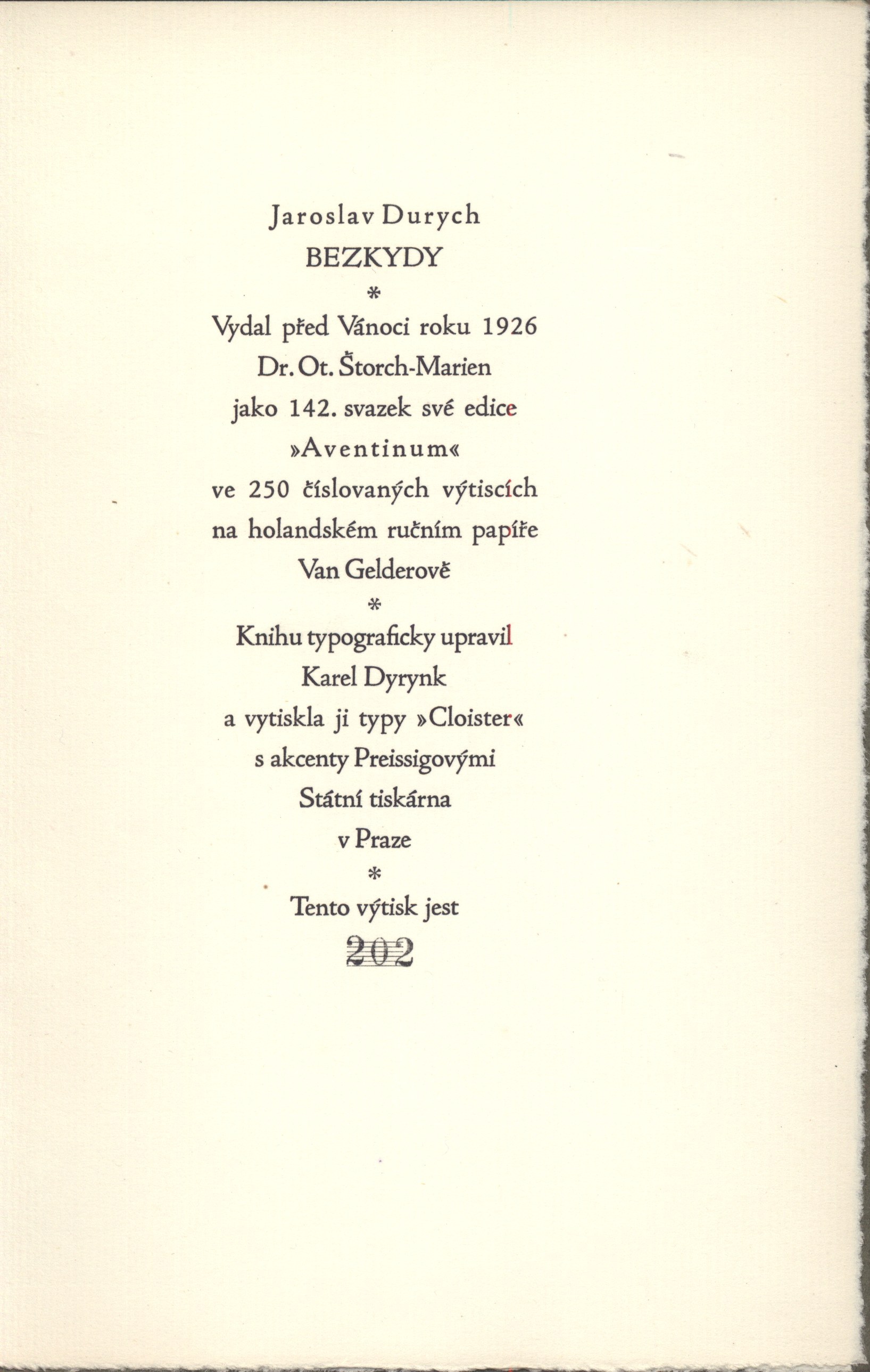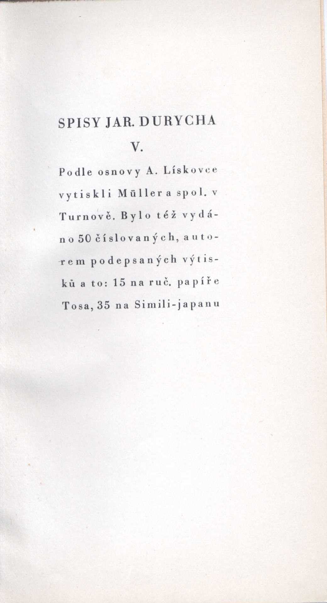 Názvové údaje Paměti Jiřiny a Jaroslavy Durychových / Jiřina Bártková-Durychová, Jaroslava Bálková-Durychová ; Doslov Václav Černý Osobní jméno Bártková-Durychová, Jiřina, 1920- (Autor) Další autoři Bálková-Durychová, Jaroslava, 1917- (Autor) Černý, Václav, 1905-1987 (Autor úvodu atd.) Nakladatel Olomouc : Matice cyrilometodějská, 1998 Rozsah 92 s., fot Osobní hesla Durych, Jaroslav, 1886-1962 - beletrista, básník, publicista, kritik, teoretik literatury, překladatel a redaktor * Bártková-Durychová, Jiřina, 1920- - autorka pamětí * Bártková-Durychová, Jiřina, 1920- - autorka pamětí * Bálková-Durychová, Jaroslava, 1917- - autorka pamětí * Bálková-Durychová, Jaroslava, 1917- - autorka pamětí Klíčová slova česká literatura * próza * autobiografické vzpomínky * Durych J. * stol. 20. Počet ex. 1, z toho volných 1 Druh dok. monografie Signatura C12b 2882 Názvové údaje Kdo jest Jaroslav Durych? / Jan Bartoš Osobní jméno Bartoš Bělčický, Jan, 1887-1955 (Autor) Další autoři Podřípské knihkupectví Josef Nývlt (Kralupy nad Vltavou) (Nakladatel, vydavatel) Josef Bláha (tiskárna) (Tiskař) Nakladatel Kralupy n. Vlt. : Jos. Nývlt, 1930 Výrobce (Josef Bláha) Rozsah 41 s. : il. Osobní hesla Durych, Jaroslav, 1886-1962 - beletrista, básník, publicista, kritik, teoretik literatury, překladatel a redaktor Klíčová slova česká literatura * čeští spisovatelé * křesťanská literatura * katolická literatura Počet ex. 1, z toho volných 1 Druh dok. monografie Signatura VHB 0254 Názvové údaje Hudba pramenů / Otakar Březina ; obrazy doprovodil František Bílek Osobní jméno Březina, Otokar, 1868-1929 (Autor) (Dedikátor) (Autor podpisu) Další autoři Bílek, František, 1872-1941 (Ilustrátor) Durych, Jaroslav, 1886-1962 (Dedikant) Holman, Petr, 1951-2019 (Korektor tištěných materiálů) Bělohlávek, Bedřich, 1902-1991 (Autor podpisu) Korp. Odkaz (nakladatelství) (Nakladatel, vydavatel) Lidová knihtiskárna J. Skalák a spol. (Tiskař) Nakladatel V Praze : nákladem Vydavatelského sdružení Odkaz, 1918 Výrobce Lidová knihtiskárna J. Skalák a spol. Rozsah 51 stran, 10 nečíslovaných listů obrazových příloh : ilustrace ; 23 cm Klíčová slova česká próza * filozofie umění * idealismus * symbolismus (literatura) * eseje Počet ex. 7, z toho volných 7 Druh dok. monografie Signatura P 138 d 12, P 138 d 13, P 36 b 50, P 66 B 7, Holman-Březina 0242, Holman-Březina 0243, Holman-Březina 0245 Názvové údaje Hudba pramenů / Otakar Březina Osobní jméno Březina, Otokar, 1868-1929 (Autor) (Autor podpisu) Další autoři Kosterka, Hugo, 1867-1956 (Nakladatel, vydavatel) Lakomá, Emilie, 1876-1952 (Autor podpisu) Durych, Jaroslav, 1886-1962 (Autor podpisu) Korp. Dělnická tiskárna (Tiskař) Nakladatel Královské Vinohrady : Hugo Kosterka, [1903] Výrobce Tiskem Dělnické tiskárny Rozsah 116 stran ; 16 cm Klíčová slova česká próza * filozofie umění * symbolismus (literatura) * mystika * idealismus * eseje Počet ex. 7, z toho volných 7 Druh dok. monografie Signatura P 54 d 34, P 54 F 40, P 23 B 42, P 137 H 47, Holman-Březina 0032, Holman-Březina 0046, Holman-Březina 0077 Názvové údaje Balady / Jaroslav Durych ; [pěti dřevoryty doprovází Arnošt Hrabal] Osobní jméno Durych, Jaroslav, 1886-1962 (Autor) Další autoři Hrabal, Arnošt, 1886-1969 (Ilustrátor) Korp. Ladislav Kuncíř (nakladatelství a knihkupectví) (Nakladatel, vydavatel) Nakladatelská společnost Rozmach (nakladatelství) (Nakladatel, vydavatel) Kryl a Scotti (firma) (Tiskař) Nakladatel Praha : Lad. Kuncíř : Nakladatelská společnost Rozmach, 1925 Výrobce Kryl a Scotti) Rozsah 67 s. : il. ; 21 cm Klíčová slova česká literatura * poezie * básně * česká poezie * balady * katolická literatura * katolická poezie * epická báseň * epická poezie * bibliofilie * bibliofilská vydání * bibliofilský tisk * číslovaný výtisk Počet ex. 3, z toho volných 3 Druh dok. monografie Signatura VMartínek 0065, Topič 0222, VHB 0386 Názvové údaje Básně / Jaroslav Durych Osobní jméno Durych, Jaroslav, 1886-1962 (Nakladatel, vydavatel) Další autoři Melantrich (nakladatelství) (Nakladatel, vydavatel) Nakladatel V Praze : Melantrich, 1940 Rozsah 149 s. ; 8° Klíčová slova česká literatura * česká poezie * sbírka básní Počet ex. 1, z toho volných 1 Druh dok. monografie Signatura MEL 1665 Názvové údaje Básně : Balady, Panenky, Žebrácké písně, Bezkydy / Jaroslav Durych ; [podle osnovy A. Lískovce] Osobní jméno Durych, Jaroslav, 1886-1962 (Autor) Další autoři Lískovec, Antonín, 1894-1949 (Knižní grafik) Korp. Ladislav Kuncíř (nakladatelství a knihkupectví) (Nakladatel, vydavatel) Müller a spol. (tiskárna) (Tiskař) Nakladatel V Praze Ladislav Kuncíř, 1930 Výrobce vytiskli Müller a spol.) Rozsah 164, [6] s. ; 17,8 cm Klíčová slova česká literatura * poezie * sbírka básní Počet ex. 7, z toho volných 7 Druh dok. monografie Signatura C12a 179, MUK 785, LK F I 2704, LK Václavek 1710, LK Thon 2799, LK Thon 2585, OŘíha 157 Názvové údaje Básně : Balady, Panenky, Žebrácké písně, Bezkydy / Jaroslav Durych ; [podle osnovy A. Lískovce] Osobní jméno Durych, Jaroslav, 1886-1962 (Autor) Další autoři Lískovec, Antonín, 1894-1949 (Knižní grafik) Korp. Ladislav Kuncíř (nakladatelství a knihkupectví) (Nakladatel, vydavatel) Müller a spol. (tiskárna) (Tiskař) Nakladatel Praha : Ladislav Kuncíř, 1930 Výrobce Müller a spol.) Rozsah 164 s. Klíčová slova česká poezie * básně Počet ex. 2, z toho volných 2 Druh dok. monografie Signatura MEL 1664, VMartínek 1191 Názvové údaje Bezkydy / Jaroslav Durych ; [typograficky upravil Karel Dyrynk] Osobní jméno Durych, Jaroslav, 1886-1962 (Autor) (Autor podpisu) Další autoři Dyrynk, Karel, 1876-1949 (Typograf) Korp. Dr. Ot. Štorch-Marien (nakladatelství) (Na