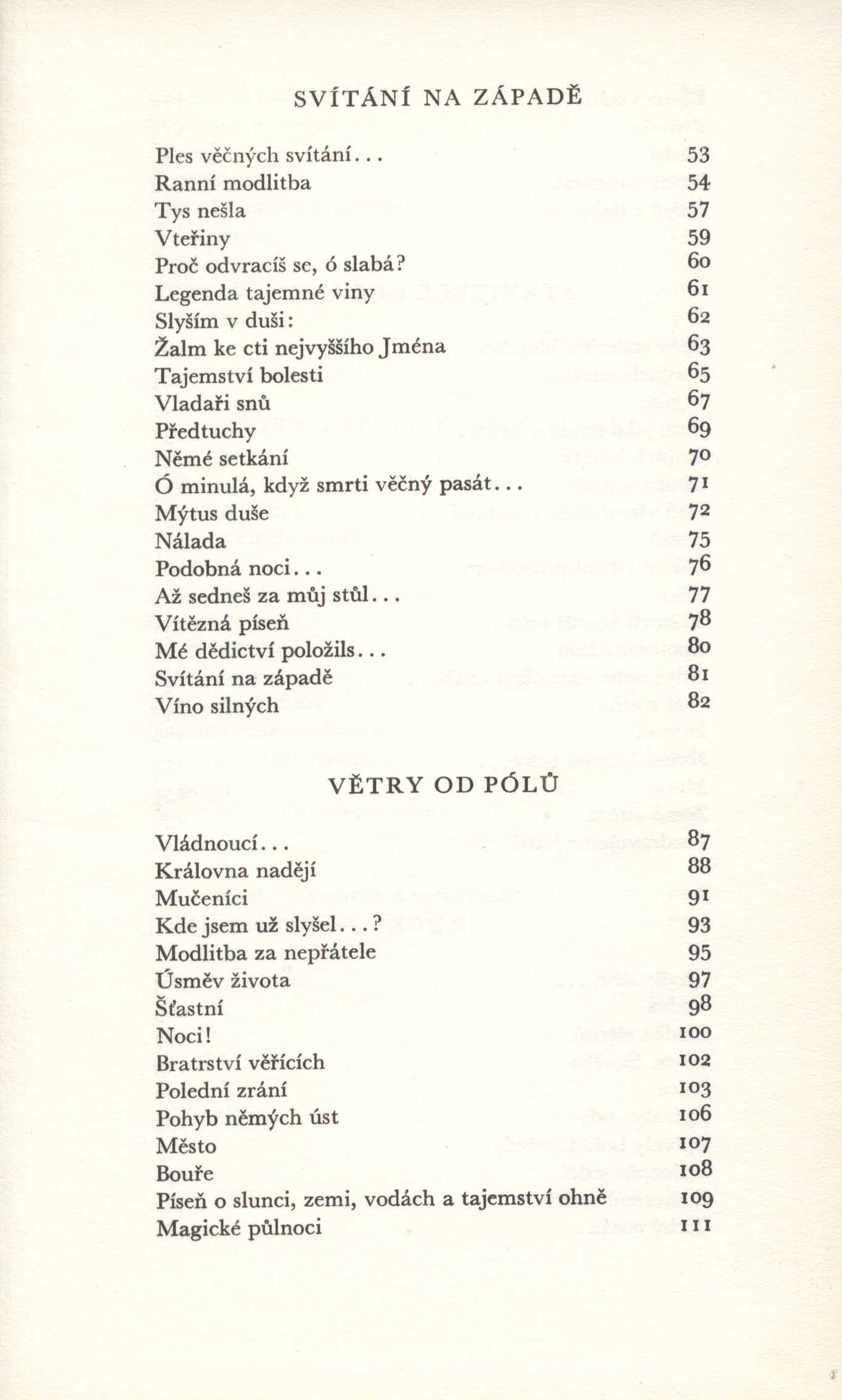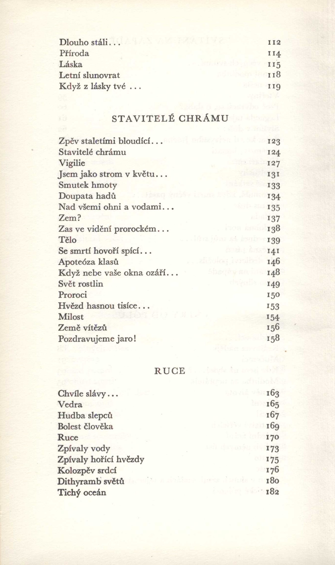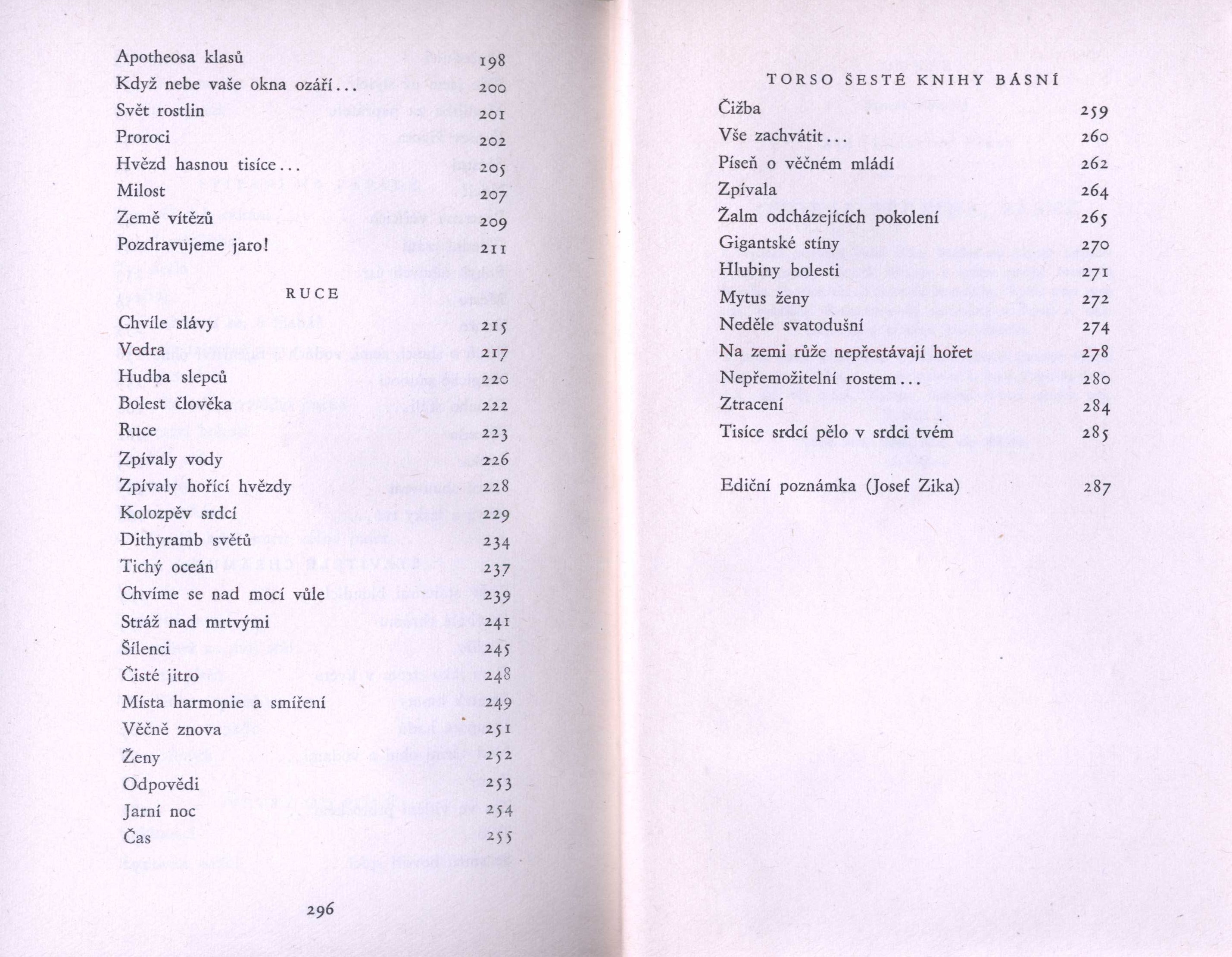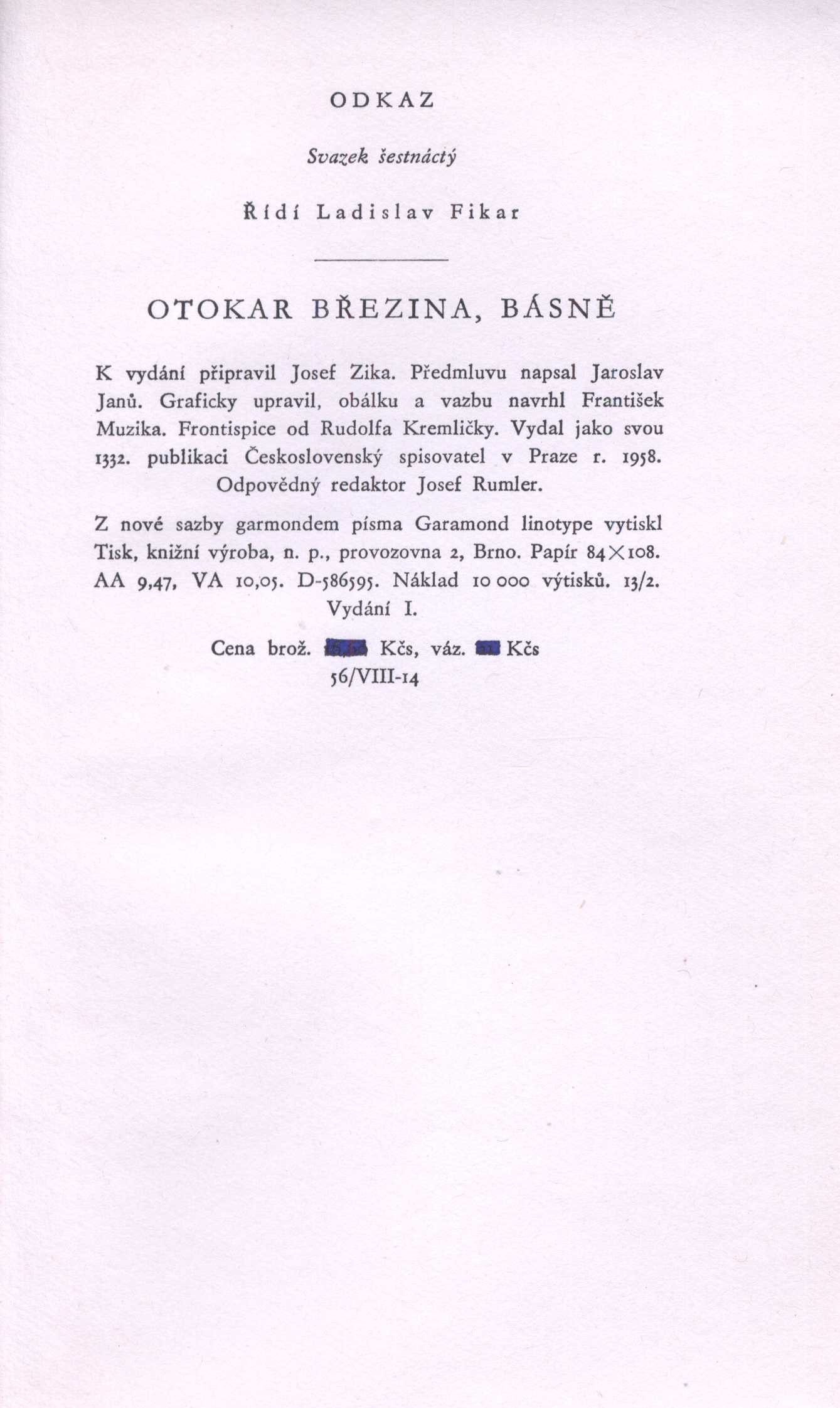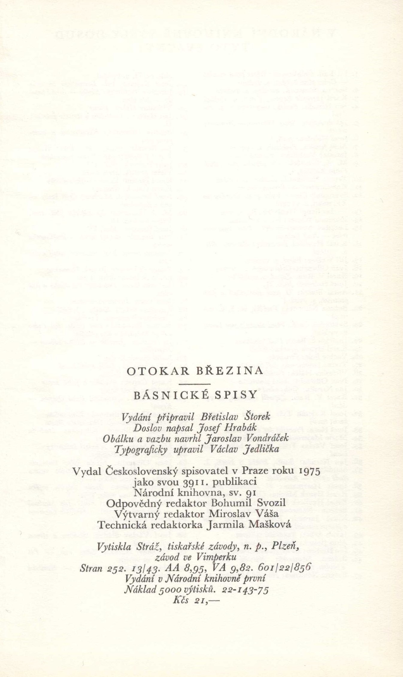 Názvové údaje XXXV=35. knižní aukce : Bohemica : Bohosloví. Historie. Topografie. Pragensia. Propagační literatura. Msaryk. Beletrie. Rukopisy, m. j. Březinovo svítání na západě : přídavek: Cizojazyčné tisky. J. W. Goethe. Kresby M. Alše : v pondělí dne 2. října, v úterý dne 3. října a ve středu dne 4. října 1933 v hotelu "Beránek" na Královských Vinohradech, Tylovo náměstí / [sestavili Bohumír Lifka a Karel Zink] Záhlaví-akce <XXXV=35>. Zinkova aukce (Bohemica) (2. 10. - 4. 10. 1933 : Hotel Beránek, Praha, Česko) Další autoři Lifka, Bohumír, 1900-1987 (Sestavovatel, kompilátor) Zink, Karel, 1889-1975 (Nakladatel, vydavatel) (Sestavovatel, kompilátor) Korp. Karel Zink (Praha, Česko) (Nakladatel, vydavatel) Orbis (tiskárna) (Tiskař) Nakladatel Praha : Karel Zink, 1933 Výrobce (Orbis) Rozsah 69 s. Osobní hesla Březina, Otokar, 1868-1929 - básník, esejista, prozaik * Goethe, Johann Wolfgang von, 1749-1832 - německý básník, dramatik, prozaik a vědec * Aleš, Mikoláš, 1852-1913 - malíř, kreslíř a ilustrátor Klíčová slova česká literatura * katalog * aukční katalog * aukční katalog knih * aukce * staré tisky * bohemika * vzácné tisky * vzácné knihy * rukopisy * autografy * autografy spisovatelů * kresby * pragensia * stol. 20., léta 30. * r. 1933 Počet ex. 1, z toho volných 1 Druh dok. monografie Signatura KaG XVII B 31/15 Názvové údaje Otokar Bržezina : vyrazitel' genija češskago naroda / A. Bem Osobní jméno Bem, Al‘fred Ljudvigovič, 1886-1945 (Autor) Nakladatel [Praha] : Russkij narodnyj universitet v Prage, 1930 Rozsah Strany 128-158 ; 25,5 cm Osobní hesla Březina, Otokar, 1868-1929 - učitel, básník, esejista, prozaik a myslitel Klíčová slova čeští spisovatelé * česká literatura * symbolismus * dílo * život * stol. 20. * význam díla * pojednání Počet ex. 1, z toho volných 1 Druh dok. monografie Signatura M 76 a 293 Názvové údaje [50=padesát] / Otokar Březina ; Svému dobrému učiteli Jakubu Demlovi k jeho padesátinám přepsala Marie N Osobní jméno Březina, Otokar, 1868-1929 (Autor) Další autoři N, Marie (Grafický technik) N, Marie (Dedikátor) Deml, Jakub, 1878-1961 (Dedikant) Nakladatel Tasov : b.n., 1928 Rozsah [Nestr.], obr Osobní hesla N, Marie - dedikátorka * Deml, Jakub, 1878-1961 - katolický kněz, básník, prozaik, publicista, překladatel Klíčová slova česká literatura * próza * eseje Počet ex. 1, z toho volných 1 Druh dok. monografie Signatura M 222 g 75 Názvové údaje Básně / Otakar Březina ; k vydání připravil Josef Zika ; předmluvu napsal Jaroslav Janů ; graficky upravil, obálku a vazbu navrhl František Muzika ; frontispice od Rudolfa Kremličky Osobní jméno Březina, Otokar, 1868-1929 (Autor) Další autoři Zika, Josef, 1921-1981 (Editor) Janů, Jaroslav, 1908-1969 (Autor úvodu atd.) Muzika, František, 1900-1974 (Knižní grafik) (Autor obálky) (Výtvarník vazby) Kremlička, Rudolf, 1886-1932 (Ilustrátor) Korp. Československý spisovatel (nakladatelství) (Nakladatel, vydavatel) Tisk Brno (tiskárna) (Tiskař) Nakladatel Praha : Československý spisovatel, 1958 Výrobce Brno : Tisk, knižní výroba, n.p., provozovna 2 Rozsah 296 stran ; 20 cm Klíčová slova česká poezie * básně * výbor Počet ex. 5, z toho volných 5 Druh dok. monografie Signatura AČS 03336, AČS 03336a, EJulis 0461, RSzpuk 0155, Holman-Březina 0421 Názvové údaje Básnické spisy / Otokar Březina ; vydání připravil Břetislav Štorek ; doslov napsal Josef Hrabák ; obálku a vazbu navrhl Jaroslav Vondráček ; typograficky upravil Václav Jedlička Osobní jméno Březina, Otokar, 1868-1929 (Autor) Další autoři Štorek, Břetislav, 1930-1976 (Editor) Hrabák, Josef, 1912-1987 (Autor doslovu, tiráže atd.) Vondráček, Jaroslav, 1919-1997 (Autor obálky) (Výtvarník vazby) Jedlička, Václav 1931- (Typograf) Korp. Československý spisovatel (nakladatelství) (Nakladatel, vydavatel) Stráž, tiskařské závody (Tiskař) Nakladatel Praha : Československý spisovatel, 1975 Výrobce Ve Vimperku : Stráž, tiskařské závody, n. p., Plzeň Rozsah 244 stran ; 20,5 cm Klíčová slova česká poezie * básně * výbor básní Počet ex. 3, z toho volných 3 Druh dok. monografie Signatura AČS 05805, AČS 05805a, Holman-Březina 0191 Názvové údaje Básnické spisy / Otokar Březina ; v úpravě Františka Bílka a s reprodukcí jeho dřevorytu "Otokar Březina" Osobní jméno Březina, Otokar, 1868-1929 (Autor) Další autoři Bílek, František, 1872-1941 (Knižní grafik) (Umělec) Korp. Česká akademie věd a umění (Nakladatel, vydavatel) Melantrich (nakladatelství : 1910-1950) (Nakladatel, vydavatel) Melantrich (tiskárna) (Tiskař) Nakladatel Praha : Česká akademie věd a umění nákladem Melantricha a.s., 1942 Výrobce V Praze : tiskem Melantricha a.s. Rozsah 272 stran, 2 nečíslované listy obrazových příloh : faksimile ; 26 cm Klíčová slova česká poezie * básně * básnické sbírky * sebrané spisy Počet ex. 4, z toho volných 4 Druh dok. monografie Signatura MUK 693, MUK 693a, LK P 95 a 19, Holman-Březina 0288 Názvové údaje Básnické spisy / Otakar Březina ; [redigoval Miloslav Hýsek ; v úpravě Františka Bílka s reprodukcí jeho dřevorytu "Otakar Březina" Osobní jméno Březina, Otokar, 1868-1929 (Autor) Další autoři Hýsek, Miloslav, 1885-1957 (Editor) Bílek, František, 1872-1941 (Knižní grafik) (Ilustrátor) Korp. Česká akademie věd a umění (Nakladatel, vydavatel) Melantrich (nakladatelství) (Nakladatel, vydavatel) Nakladatel V Praze : Melantrich, 1933 Rozsah 273 s., [3] obr. příl. ; 4° Osobní hesla Březina, Otokar, 1868-1929 - básník, esejista, prozaik Klíčová slova česká literatura * česká poezie * Březina O. * výbor básní * vybrané spisy Počet ex. 2, z toho volných 2 Druh dok. monografie Signatura MEL 2240, MEL 2240a