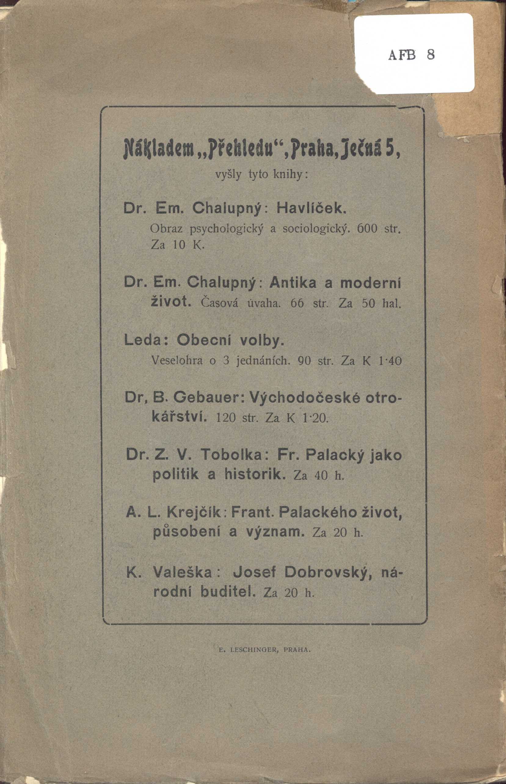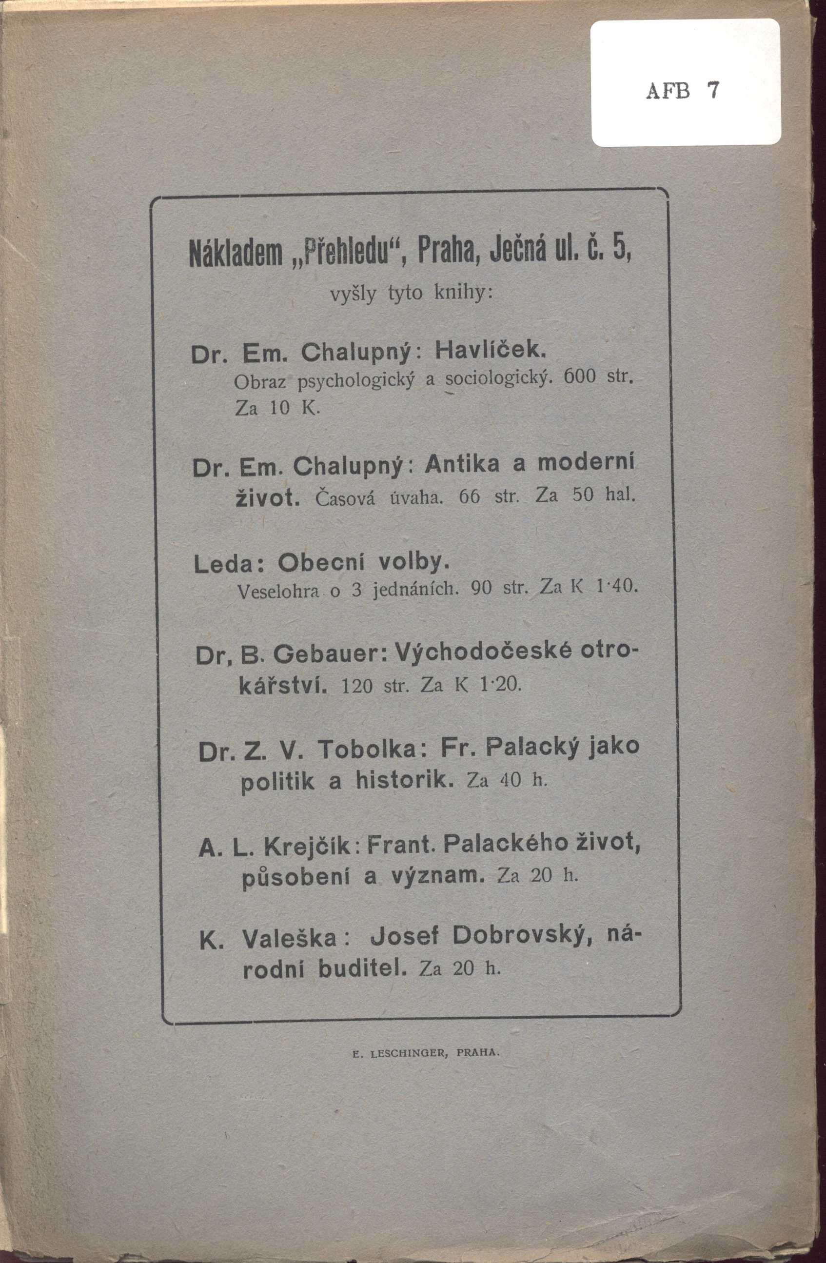 Názvové údaje Teskný historik Ladislav Hofman / Dagmar Blümlová Osobní jméno Blümlová, Dagmar, 1949- (Autor) Nakladatel České Budějovice : Jihočeská univerzita v Českých Budějovicích, Filozofická fakulta, Historický ústav ve spolupráci s Novou tiskárnou Pelhřimov, 2005 Rozsah 251 s. : il. ; 21 cm Osobní hesla Hofman, Ladislav, 1876-1903 - historik, překladatel Klíčová slova historici * Česko * stol. 20. * život a dílo * monografie Počet ex. 1, z toho volných 1 Druh dok. monografie Signatura C12b 10093 Názvové údaje Adam Mickiewicz / L. K. Hofman Osobní jméno Hofman, Ladislav, 1876-1903 (Autor) Další autoři Lidové družstvo tiskařské a vydavatelské (Nakladatel, vydavatel) Edvard Leschinger (firma) (Tiskař) Nakladatel Praha : nákladem Lidového družstva tiskařského a vydavatelského, 1908 Výrobce (tiskem Edvarda Leschingra) Rozsah 130 s. Osobní hesla Mickiewicz, Adam, 1798-1855 - polský básník Klíčová slova česká literatura * články * Mickiewicz A. Počet ex. 1, z toho volných 1 Druh dok. monografie Signatura AFB 0008 Názvové údaje Bismarck ; Max Lenz / L. K. Hofman Osobní jméno Hofman, Ladislav, 1876-1903 (Autor) Další autoři Lidové družstvo tiskařské a vydavatelské (Nakladatel, vydavatel) Edvard Leschinger (firma) (Tiskař) Nakladatel Praha : nákladem Lidového družstva tiskařského a vydavatelského (Přehled), 1908 Výrobce (E. Leschinger) Rozsah 16, 16 s. Osobní hesla Bismarck, Otto von, 1815-1898 - německý státník, kníže * Lenz, Max, 1850-1932 - německý historik Klíčová slova česká literatura * články * Bismarck O. * Lenz M. Počet ex. 1, z toho volných 1 Druh dok. monografie Signatura AFB 0007 Názvové údaje L. K. Hofmana Sebrané spisy / k vydání připravili J. Glücklich a K. Krofta. I., Spisy vědecké Osobní jméno Hofman, Ladislav, 1876-1903 (Autor) Další autoři Glücklich, Julius, 1876-1950 (Editor) (Autor úvodu atd.) Krofta, Kamil, 1876-1945 (Editor) (Autor úvodu atd.) Goll, Jaroslav, 1846-1929 (Autor úvodu atd.) Korp. Lidové družstvo tiskařské a vydavatelské (Nakladatel, vydavatel) Edvard Leschinger (firma) (Tiskař) Nakladatel V Praze : nákladem Lidového družstva tiskařského a vydavatelského, 1904 Výrobce Tiskem Edvarda Leschingra Rozsah xxv, 411 stran ; 21 cm Osobní hesla Hofman, Ladislav, 1876-1903 - historik, překladatel Klíčová slova česká literatura * próza * úvahy * články * referáty * výbor z díla * Hofman L. K. Počet ex. 2, z toho volných 2 Druh dok. monografie Signatura AFB 0041, M 50 a 25 Názvové údaje L. K. Hofmana Sebrané spisy / k vydání připravili V. Dyk, J. Glücklich a K. Krofta. II., Spisy smíšené Osobní jméno Hofman, Ladislav, 1876-1903 (Autor) Další autoři Dyk, Viktor, 1877-1931 (Editor) (Autor úvodu atd.) Glücklich, Julius, 1876-1950 (Editor) (Autor úvodu atd.) Krofta, Kamil, 1876-1945 (Editor) (Autor úvodu atd.) Korp. Lidové družstvo tiskařské a vydavatelské (Nakladatel, vydavatel) Edvard Leschinger (firma) (Tiskař) Nakladatel V Praze : nákladem Lidového družstva tiskařského a vydavatelského, 1905 Výrobce (tiskem Edvarda Leschingra) Rozsah xxviii, 351 stran ; 21 cm Osobní hesla Hofman, Ladislav, 1876-1903 - historik, překladatel Klíčová slova česká literatura * korespondence * deníky * Hofman L. K. Počet ex. 2, z toho volných 2 Druh dok. monografie Signatura AFB 0067, Knytl 2526 Názvové údaje Čtení z ruských dějin a z ruské literatury / Kníže Sergěj Wolkonskij ; přeložil Ladislav Hofman Osobní jméno Volkonskij, Sergej Michajlovič, kníže, 1860-1937 (Autor) Další autoři Hofman, Ladislav, 1876-1903 (Překladatel) Nakladatel Praha : Nákladem Jana Laichtera, 1901 Rozsah 124 s. Klíčová slova Rusko * dějiny Ruska * ruská literatura * ukázky z děl * přehledy Počet ex. 1, z toho volných 1 Druh dok. monografie Signatura Holan 1060