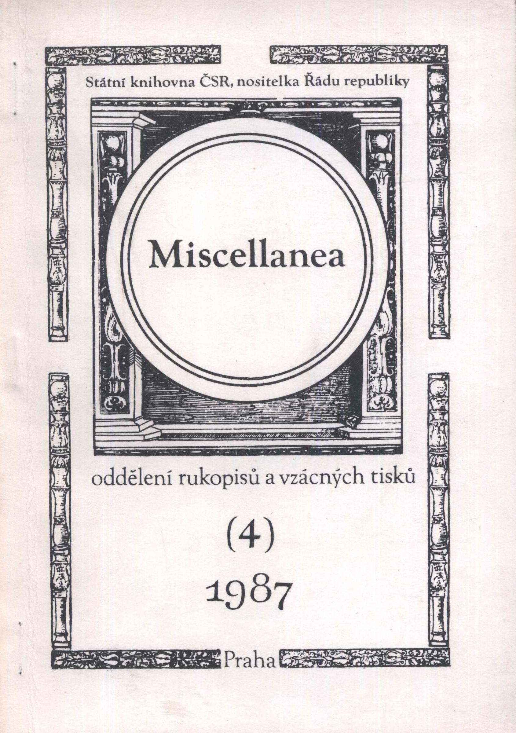 Názvové údaje Miscellanea oddělení rukopisů a vzácných tisků / Petr Voit, Jaroslava Kašparová Další autoři Voit, Petr, 1956- (Editor) Kašparová, Jaroslava, 1952- (Editor) Korp. Národní knihovna České republiky. Slovanská knihovna (Nakladatel, vydavatel) Roč., číslo Číslo 6/I, II, 1990 Nakladatel Praha : Národní knihovna v Praze, 1991 Rozsah 395 stran ; 21 cm Klíčová slova knihovnictví * literatura * historie Nadřízená jednotka Miscellanea oddělení rukopisů a vzácných tisků Počet ex. 1, z toho volných 1 Druh dok. PERIODIKA - Přijatá čísla Signatura Aa 00067 Názvové údaje Miscellanea oddělení rukopisů a vzácných tisků / Petr Voit, Jaroslava Kašparová Další autoři Voit, Petr, 1956- (Editor) Kašparová, Jaroslava, 1952- (Editor) Korp. Státní knihovna České socialistické republiky (Nakladatel, vydavatel) Roč., číslo Číslo 5, 1988 Nakladatel Praha : Státní knihovna ČSR, 1989 Rozsah 329 stran : fotografie ; 21 cm Osobní hesla Urbánková, Emma, 1909-1992 - knihovnice Klíčová slova knihovnictví * knižní kultura * vzácné tisky * literatura * historie * studie * sborník Nadřízená jednotka Miscellanea oddělení rukopisů a vzácných tisků Počet ex. 1, z toho volných 1 Druh dok. PERIODIKA - Přijatá čísla Signatura Aa 00066 Názvové údaje Miscellanea oddělení rukopisů a vzácných tisků Záhlaví-korpor. Státní knihovna České socialistické republiky. Sektor služeb a speciálních oddělení (Nakladatel, vydavatel) Další autoři Kašparová, Jaroslava, 1952- (Redaktor, výkonný redaktor) Gruntová, Šárka (Autor obálky) Roč., číslo 4/1, 1987 Nakladatel Praha : Státní knihovna ČSR, 1988 Rozsah 204 stran, 4 nečíslované strany obrazových příloh : faksimile ; 20,5 cm Klíčová slova Česko * rukopisy * vzácné tisky Nadřízená jednotka Miscellanea oddělení rukopisů a vzácných tisků Počet ex. 1, z toho volných 1 Druh dok. PERIODIKA - Přijatá čísla Signatura C12b 19461