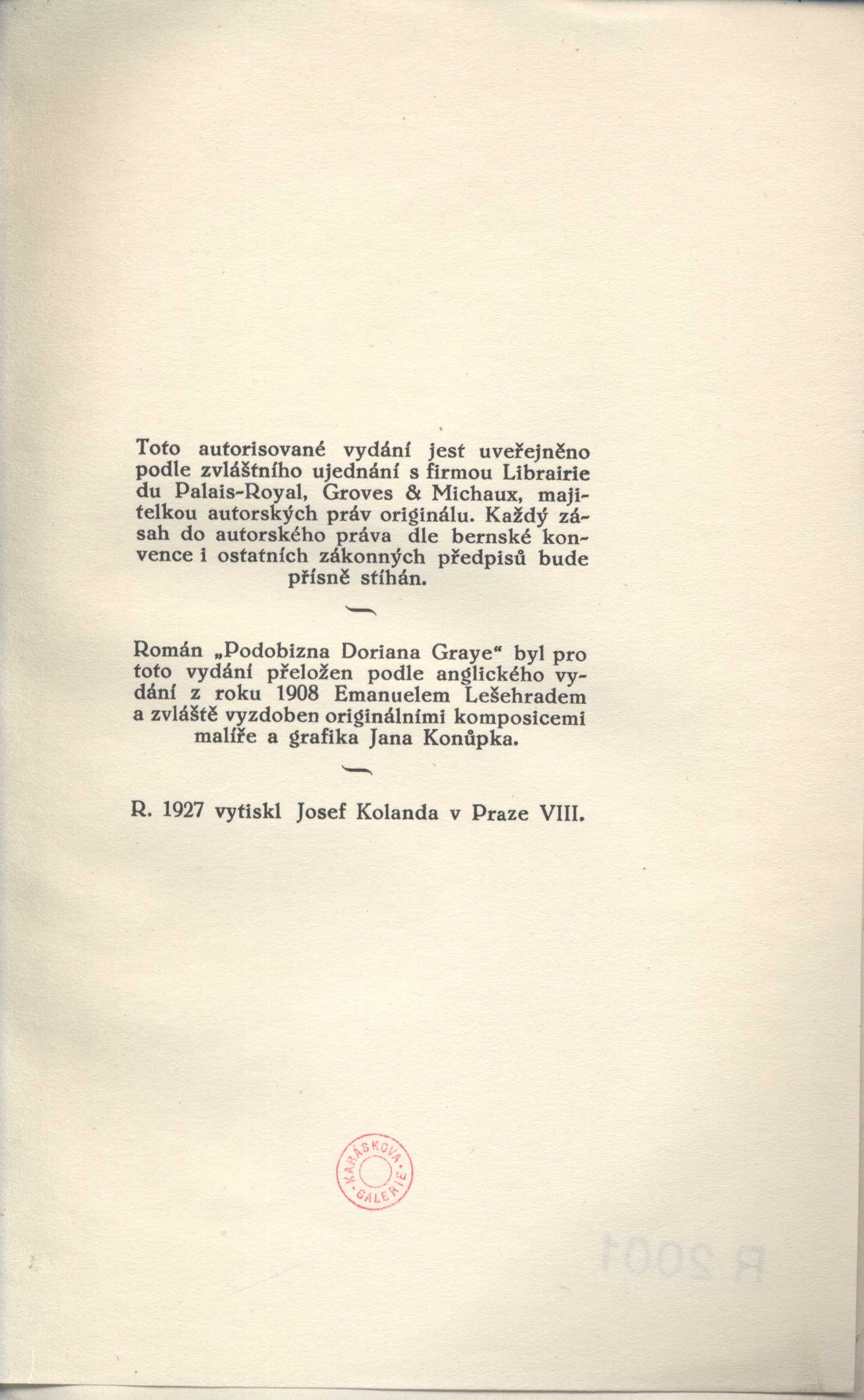 Názvové údaje Opičí žlázy : nechte se omladit : fraška o třech jednáních / napsal Jindra Adamec Osobní jméno Adamec, Jindra, 1903-1973 (Autor) Další autoři Fr. Švejda (nakladatelství) (Nakladatel, vydavatel) Josef Kolanda (Praha) (Tiskař) Nakladatel Praha : Frant. Švejda, 1930 Výrobce Jos. Kolanda Rozsah 88 stran Klíčová slova česká dramata * divadelní hry * veselohry Počet ex. 1, z toho volných 1 Druh dok. monografie Signatura P 44 F 112 Názvové údaje J. Ex. hrabě František Thun z Hohenšteina, c. k. místodržící v království Českém : kritika úřadní činnosti Jeho Excelence. Část III. / napsal J. Arbes Osobní jméno Arbes, Jakub, 1840-1914 (Autor) (Nakladatel, vydavatel) Další autoři Josef Kolanda (Praha) (Nakladatel, vydavatel) Nakladatel Na Smíchově : J. Arbes, 1895 Výrobce Knihtiskárna Vondruška a Kolanda Rozsah 638 stran ; 22 cm Osobní hesla Thun-Hohenstein, František de Paula Antonín, hrabě, 1847-1916 - právník a politik, říšský poslanec, Rytíř Zlatého rouna Klíčová slova politici * šlechtici * vláda * politika * Česko * Rakousko-Uhersko * stol. 19. * studie Počet ex. 1, z toho volných 1 Druh dok. monografie Signatura M 63 a 41/3 Názvové údaje Hlad / Knut Hamsun ; z norštiny přeložila M. Lesná-Krausová Osobní jméno Hamsun, Knut, 1859-1952 (Autor) Další autoři Krausová-Lesná, Milada, 1888-1961 (Překladatel) Korp. Nakladatelství Alois Hynek (Nakladatel, vydavatel) Josef Kolanda (Praha) (Tiskař) Unifikovaný název Sult. Česky Nakladatel V Praze : nakladatel Alois Hynek, 1932 Výrobce (knihtiskárna Josefa Kolandy) Rozsah 208 s., [1] l. obr. příl. ; 18,8 cm Klíčová slova norská literatura * próza * překlad * román Počet ex. 1, z toho volných 1 Druh dok. monografie Signatura OŘíha 190 Názvové údaje Posvátné ohně : legendy / Jiřího Karáska ze Lvovic Osobní jméno Karásek ze Lvovic, Jiří, 1871-1951 (Autor) (Autor podpisu) (Dedikátor) Další autoři Šimek, Rudolf (Nakladatel, vydavatel) Helbling, Vilibald, 1884- (Dřívější majitel) Korp. Josef Kolanda (Praha) (Tiskař) Nakladatel Praha : Rudolf Šimek, 1921 Výrobce (Knihtiskárna J. Kolanda) Rozsah 190 s. Klíčová slova Židé * novely * bibliofilie * česká próza * přelom 19. a 20. stol. * dekadence * moderní česká próza * apokryfy * bibliofilská vydání Počet ex. 2, z toho volných 2 Druh dok. monografie Signatura KaG V A 64, VMartínek 1386 Názvové údaje Překvapení v posteli : fraška o 3 jednáních / napsal Jiří Anger Osobní jméno Langer, Stanislav, (Autor) 1887-1967 Další autoři Evžen Rosendorf (nakladatelství) (Nakladatel, vydavatel) Josef Kolanda (Praha) (Tiskař) Nakladatel Praha : Evžen K. Rosendorf, [1928] Výrobce Josef Kolanda Rozsah 68 stran Klíčová slova česká dramata * komedie * divadelní hry Počet ex. 1, z toho volných 1 Druh dok. monografie Signatura P 44 f 61 Názvové údaje Stát a revoluce / Mikuláš Lenin ; přeložil Josef Reiner Osobní jméno Lenin, Vladimir Iľjič, 1870-1924 (Autor) Další autoři Reiner, Josef, 1897-1920 (Překladatel) Brunner, Vratislav Hugo, 1886-1928 (Autor obálky) (Knižní grafik) Korp. Fr. Borový (firma) (Nakladatel, vydavatel) Josef Kolanda (Praha) (Tiskař) Nakladatel Praha : Fr. Borový, 1920 Výrobce Josef Kolanda) Rozsah 145 s. Klíčová slova stát * revoluce * marxistické pojetí Počet ex. 3, z toho volných 3 Druh dok. monografie Signatura N/A, AFB 2158, AFB 2158a Názvové údaje Žalář nejtemnější : román / Ivan Olbracht Osobní jméno Olbracht, Ivan, 1882-1952 (Autor) Další autoři Brunner, Vratislav Hugo, 1886-1928 (Autor obálky) Korp. Fr. Borový (firma) (Nakladatel, vydavatel) Josef Kolanda (Praha) (Tiskař) Nakladatel V Praze : nakladatel Fr. Borový, 1921 Výrobce (tiskem J. Kolandy) Rozsah 186, [2] s. ; 8° Klíčová slova česká literatura * próza * román Počet ex. 2, z toho volných 2 Druh dok. monografie Signatura AFB 0186, AFB 0186a Názvové údaje Podobizna Doriana Graye / Oscar Wilde ; [román ... přeložen podle anglického vydání z roku 1908 Emanuelem Lešehradem ; a zvláště vyzdoben originálními komposicemi malíře a grafika Jana Konůpka] Osobní jméno Wilde, Oscar, 1854-1900 (Autor) Další autoři Lešehrad, Emanuel, 1877-1955 (Překladatel) (Dedikátor) Konůpek, Jan, 1883-1950 (Ilustrátor) Karásek ze Lvovic, Jiří, 1871-1951 (Dedikant) Korp. Nakladatelství Alois Hynek (Nakladatel, vydavatel) Josef Kolanda (Praha) (Tiskař) Nakladatel Praha : Nakladatelství Aloise Hynka, 1927 Výrobce (Josef Kolanda) Rozsah 289 s. : il. Klíčová slova britská literatura * próza * román * dekadence Počet ex. 1, z toho volných 1 Druh dok. monografie Signatura KaG XVI B2 164 Názvové údaje Aristainetos : listy o lásce a milování / knihu přeložila z originálu z latiny Libuše Bartošová podle jediného výtisku chovaného v pražské Universitní knihovně Autor Aristainetos, činný 5. století (Autor) Další autoři Bartošová, Libuše (Překladatel) Beneš, Oldřich (Nakladatel, vydavatel) Korp. Nakladatelství Ostrov (1991-2020) (Nakladatel, vydavatel) Josef Kolanda (Praha) (Tiskař) Nakladatel Na Žižkově [Praha] : Ostrov, 1926 Výrobce Josef Kolanda Rozsah 178 stran : 5 obrazových příloha Klíčová slova řecká literatura * antická literatura Počet ex. 1, z toho volných 1 Druh dok. monografie Signatura P 77 g 56 Názvové údaje Mysterie / Knut Hamsun ; z norštiny přeložila M. Lesná-Krausová Osobní jméno Hamsun, Knut, 1859-1952 (Autor) Další autoři Krausová-Lesná, Milada, 1888-1961 (Překladatel) Korp. Nakladatelství Alois Hynek (Nakladatel, vydavatel) Josef Kolanda (Praha) (Tiskař) Nakladatel V Praze : Nakladatel Alois Hynek, 1931 Výrobce V Praze : Knihtiskárna Josefa Kolandy Rozsah 344 stran ; 19 cm Klíčová slova norská literatura * próza * Hamsun K. * román * český překlad * Lesná-Krausová M. * r. 1931 Počet ex. 1, z 