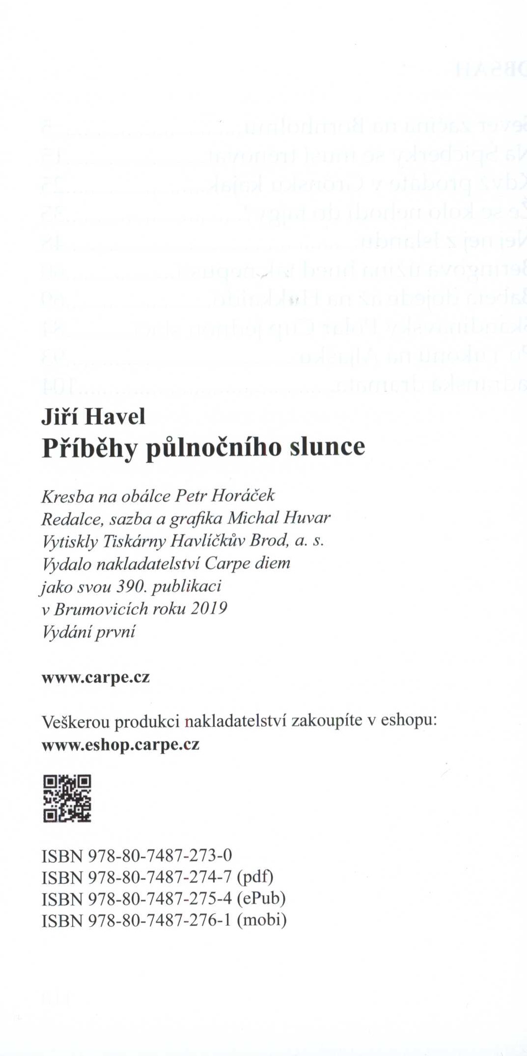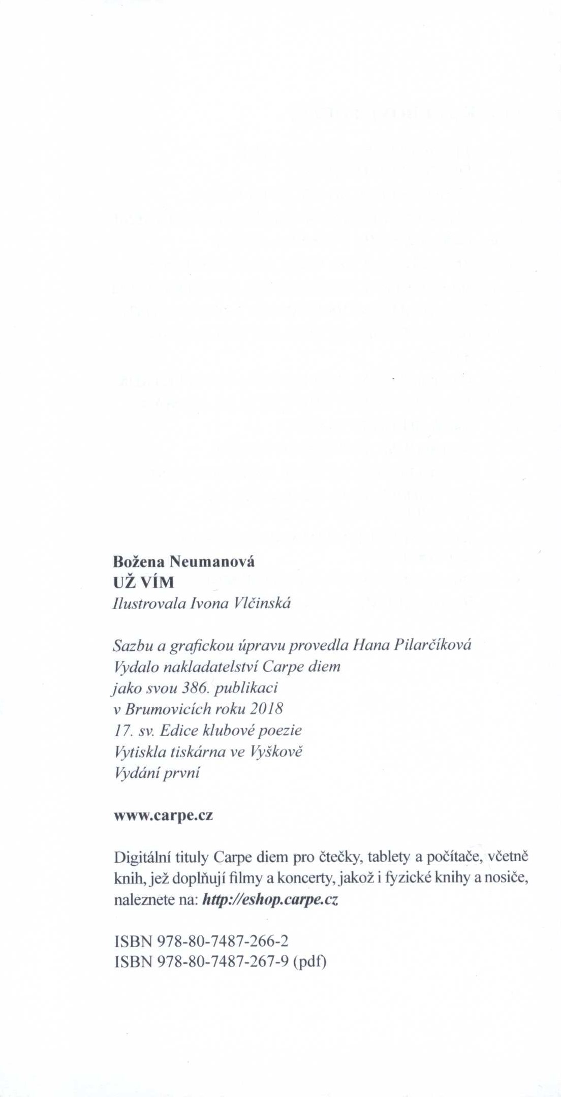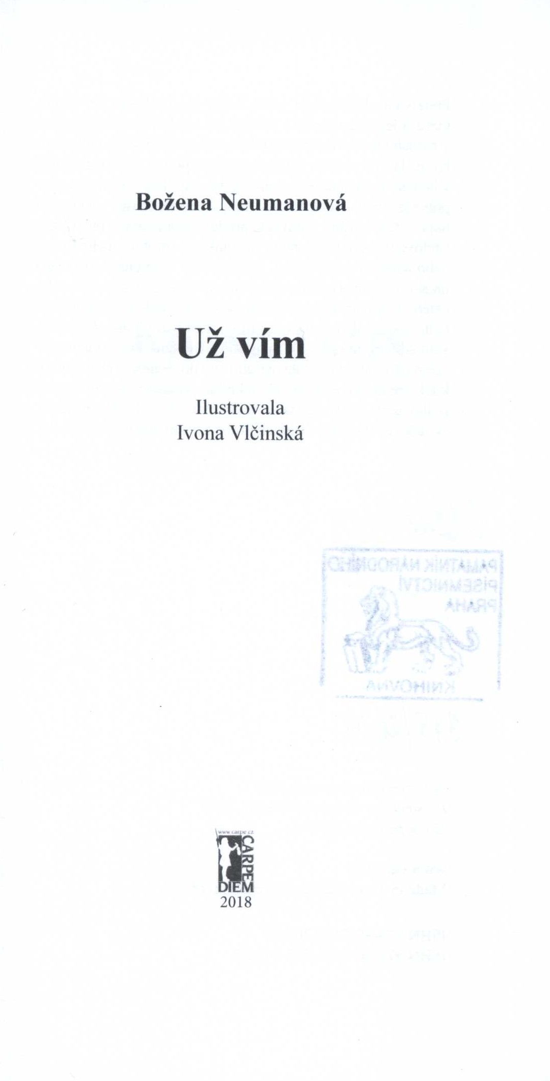 Názvové údaje Milenci z bedny / Ludvík Aškenazy ; ilustrace Denisa Vodičková-Pavlíčková ; graficky upravil a obálku navrhl Dušan Unger Osobní jméno Aškenazy, Ludvík, 1921-1986 (Autor) Další autoři Vodičková-Pavlíčková, Denisa (Ilustrátor) Unger, Dušan, 1962- (Knižní grafik) Korp. Carpe diem (nakladatelství) (Nakladatel, vydavatel) Nakladatel Brno : Print-Typia ; Brumovice : Carpe diem, 1999 Rozsah 86 stran : ilustrace ; 16 cm Klíčová slova česká literatura * česká próza * příběhy Počet ex. 1, z toho volných 1 Druh dok. monografie Signatura BVolkova 1678 Názvové údaje Milníky mimo civilizaci / Viktor Labský ; [k vydání připravil Michal Huvar ; graficky upravil a sazbu vysázel Petr Líznar] Osobní jméno Labský, Viktor, 1951- (Autor) Další autoři Huvar, Michal, 1960- (Editor) Korp. Carpe diem (nakladatelství) (Nakladatel, vydavatel) Nakladatel V Brumovicích : Carpe diem, 2009 Rozsah 342 s. Klíčová slova česká literatura * česká próza * Amerika * dobrodružné příběhy * cestopisné vyprávění Počet ex. 1, z toho volných 1 Druh dok. monografie Signatura C12a 4146 Názvové údaje Už vím / Božena Neumanová ; ilustrovala Ivona Vlčinská ; sazbu a grafickou úpravu provedla Hana Pilarčíková Osobní jméno Neumanová, Božena (Autor) Další autoři Vlčinská, Ivona (Ilustrátor) Pilarčíková, Hana (Sazeč) (Knižní grafik) Korp. Carpe diem (nakladatelství) Nakladatel V Brumovicích : Carpe diem, 2018 Výrobce Vyškov : tiskárna Rozsah 41 stran : ilustrace ; 19 cm Klíčová slova česká literatura * poezie * básnická sbírka * lyrické básně Počet ex. 1, z toho volných 1 Druh dok. monografie Signatura C12a 6129
