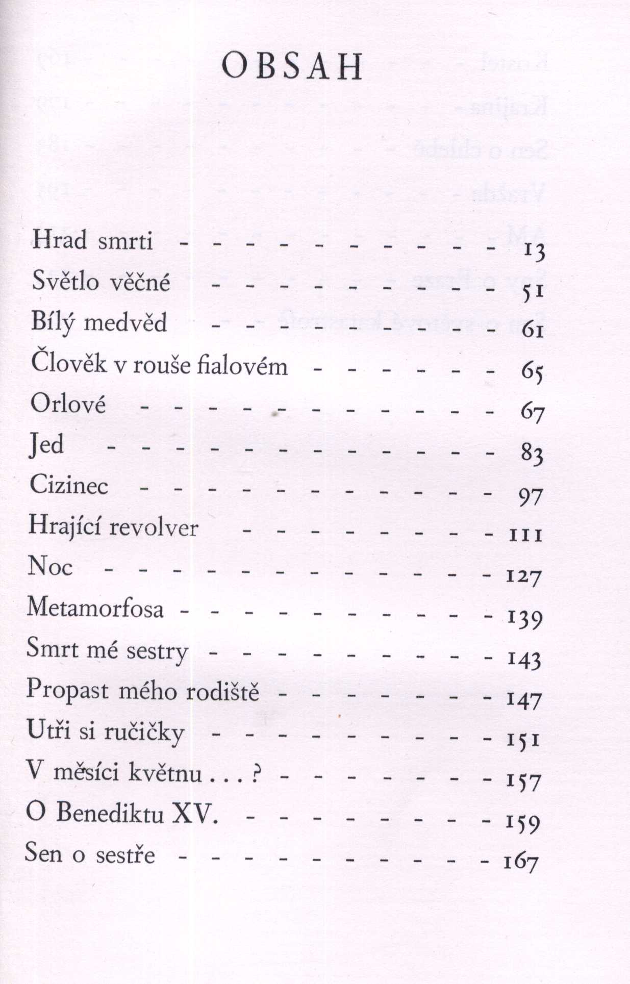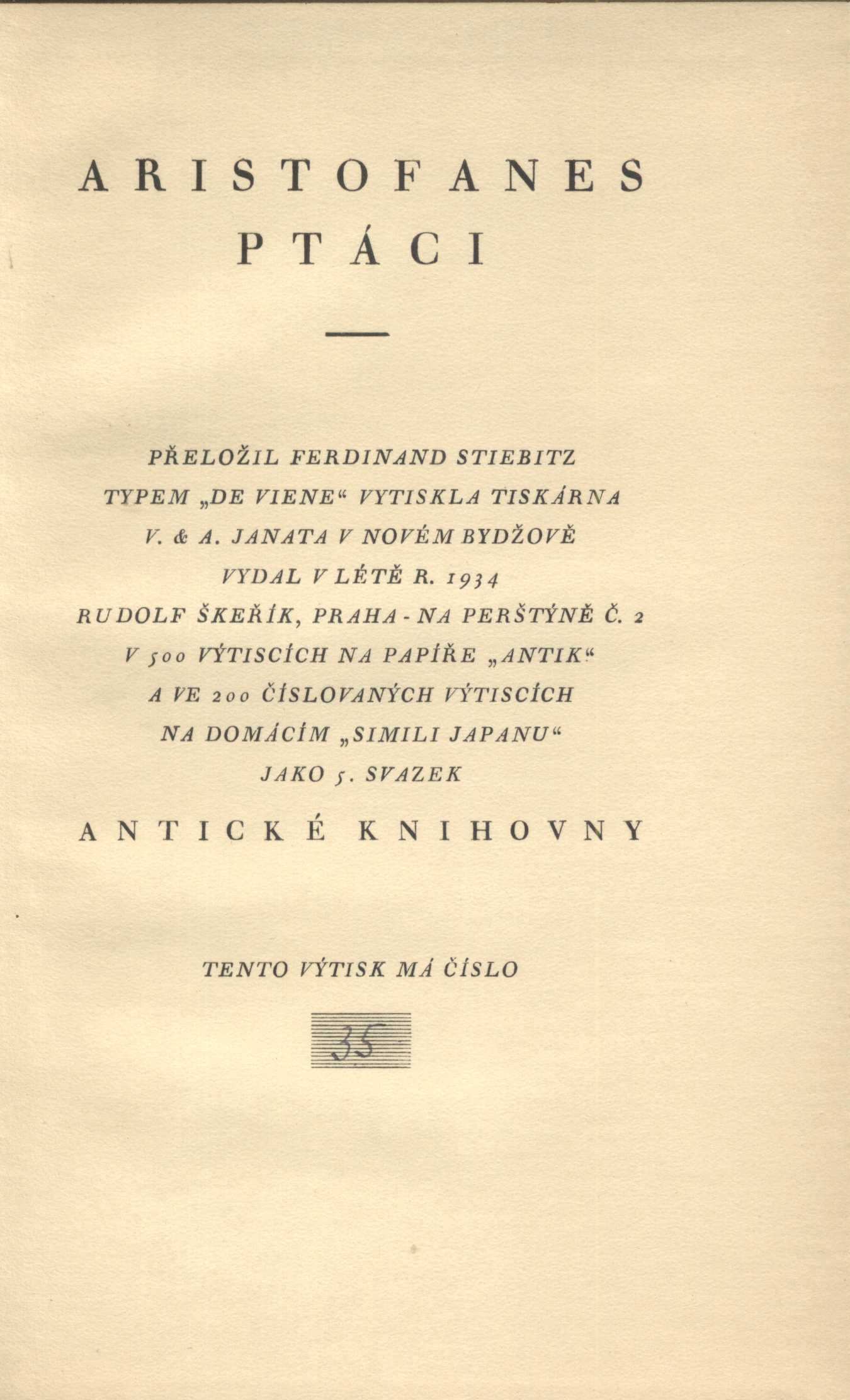 Názvové údaje Kouzelné dobrodružství : (Veliký Meaulnes) : román / Alain-Fournier ; z francouzštiny přeložil Jaroslav Zaorálek Autor Alain-Fournier, 1886-1914 (Autor) Další autoři Zaorálek, Jaroslav, 1896-1947 (Překladatel) Martin, Ivan (Autor obálky) (Výtvarník vazby) Korp. Rudolf Škeřík (nakladatelství) (Nakladatel, vydavatel) Státní tiskárna v Praze (Tiskař) Nakladatel Praha : Symposion, Rudolf Škeřík, 1948 Výrobce Státní tiskárna Rozsah 234 stran ; 21 cm Klíčová slova francouzská literatura * próza * Alain-Fournier * překlad * Zaorálek J. * román * r. 1948 Počet ex. 2, z toho volných 2 Druh dok. monografie Signatura VZinková 0147, M 153 c 36 Názvové údaje Veliký Meaulnes : román / Alain Fournier ; přeložil Jaroslav Zaorálek Autor Alain-Fournier, 1886-1914 (Autor) Další autoři Zaorálek, Jaroslav, 1896-1947 (Překladatel) Korp. Rudolf Škeřík (nakladatelství) (Nakladatel, vydavatel) Nakladatel Praha : R. Škeřík, 1928 Rozsah 214 stran Klíčová slova francouzský román Počet ex. 1, z toho volných 1 Druh dok. monografie Signatura M 151 h 38 Názvové údaje Hetéry a jejich svět / Alkifron ; přeložil František Stiebitz Autor Alkifrón, činný 2. století (Autor) Další autoři Stiebitz, Ferdinand, 1894-1961 (Překladatel) Korp. Rudolf Škeřík (nakladatelství) (Nakladatel, vydavatel) Nakladatel Praha : Rudolf Škeřík, 1931 Rozsah 101 stran : ilustrace ; 18 cm Klíčová slova antická literatura * klasická řecká literatura * korespondence Počet ex. 2, z toho volných 2 Druh dok. monografie Signatura Knytl 356, Janeček 288 Názvové údaje Kacíř a spol : výbor povídek / Guillaume Apollinaire ; přeložil Jaroslav Starý ; ilustroval Jos. Čapek Osobní jméno Apollinaire, Guillaume, 1880-1918 (Autor) Další autoři Starý, Jaroslav, 1896-1947 (Překladatel) Čapek, Josef, 1887-1945 (Ilustrátor) Korp. Rudolf Škeřík (nakladatelství) (Nakladatel, vydavatel) Průmyslová tiskárna v Praze (Tiskař) Nakladatel Praha : Rud. Škeřík, 1926 Výrobce Průmyslová tiskárna Rozsah 137 stran, 2 listy : ilustrace Klíčová slova francouzská próza * povídky * výbor povídek Počet ex. 3, z toho volných 3 Druh dok. monografie Signatura Nezval 1371, P 83 d 42, Knytl 934 Názvové údaje Ptáci : komedie / Aristofanes ; přeložil Ferdinand Stiebitz Autor Aristofanés, asi 445-asi 386 př. Kr. (Autor) Další autoři Stiebitz, Ferdinand, 1894-1961 (Překladatel) (Autor doslovu, tiráže atd.) Zink, Karel, 1889-1975 (Dedikátor) Zinková, Viola, 1925-2017 (Dedikant) Korp. Rudolf Škeřík (nakladatelství) (Nakladatel, vydavatel) Grafické závody V. a A. Janata (Tiskař) Nakladatel Praha : Antická knihovna, Rudolf Škeřík, 1934 Výrobce V Novém Bydžově : V. & A. Janata Rozsah 125 stran ; 20 cm Klíčová slova řecká literatura * řecká dramata * Aristofanes * komedie * překlad * Stiebitz F. * číslovaný výtisk * r. 1934 Počet ex. 2, z toho volných 2 Druh dok. monografie Signatura VZinková 0585, P 134 g 100 Názvové údaje Šálení času : Daphne Adeane : román / Maurice Baring ; [přeložil Jan Čep ; knihu upravil K. Svolinský ; vazbu navrhl Fr. Muzika] Osobní jméno Baring, Maurice, 1874-1945 (Autor) Další autoři Čep, Jan, 1902-1974 (Překladatel) Svolinský, Karel, 1896-1986 (Knižní grafik) Muzika, František, 1900-1974 (Autor obálky) Korp. Rudolf Škeřík (nakladatelství) (Nakladatel, vydavatel) Průmyslová tiskárna v Praze (Tiskař) Nakladatel Praha : Rudolf Škeřík, 1929 Výrobce (Průmyslová tiskárna) Rozsah 377 s. ; 8° Klíčová slova anglická próza * romány Počet ex. 1, z toho volných 1 Druh dok. monografie Signatura VMartínek 1514 Názvové údaje Mississippi = Blow for a landing : velebná matka řek : román / Ben Lucien Burman ; [přeložil Karel Novotný ; barevná linolea, grafická úprava a vazba od Michaela Floriana] Osobní jméno Burman, Ben Lucien, 1896-1984 (Autor) Další autoři Novotný, Karel N., 1907-1970 (Překladatel) Florian, Michael, 1911-1984 (Ilustrátor) (Grafický technik) Korp. Rudolf Škeřík (nakladatelství) (Nakladatel, vydavatel) Müller a spol. (tiskárna) (Tiskař) Nakladatel Praha : Rudolf Škeřík, 1941 Rozsah 297 s. : il. ; 19 cm Klíčová slova americká literatura * překlad * baladická próza * román * Mississippi * Amerika * stol. 19.-20. Počet ex. 1, z toho volných 1 Druh dok. monografie Signatura Leschinger 131 Názvové údaje Zvířata a lidé v džungli / W.L. Comfort a Zamin Ki Dost ; [přeložil Zdeněk Vančura ; úpravu a vazbu navrhla Toyen] Osobní jméno Comfort, Will Levington, 1878-1932 (Autor) Další autoři Zamin Ki Dost, 1866-1947 (Autor) Vančura, Zdeněk, 1903-1974 (Překladatel) Toyen, 1902-1980 (Knižní grafik) (Výtvarník vazby) Korp. Rudolf Škeřík (nakladatelství) (Nakladatel, vydavatel) Knihtiskárna K. Procházky (Tiskař) Nakladatel Praha : Rudolf Škeřík, 1933 Výrobce K. Procházka) Rozsah 271 s. ; 8° Klíčová slova americká próza * dobrodružné příběhy * Indie Počet ex. 1, z toho volných 1 Druh dok. monografie Signatura VMartínek 1530 Názvové údaje Vigilie : prosy / Jan Čep ; [obálku a vazbu navrhl Vít Obrtel] Osobní jméno Čep, Jan, 1902-1974 (Autor) Další autoři Obrtel, Vít, 1901-1988 (Autor obálky) Korp. Rudolf Škeřík (nakladatelství) (Nakladatel, vydavatel) Průmyslová tiskárna v Praze (Tiskař) Nakladatel Praha : Rudolf Škeřík, 1928 Výrobce (Průmyslová tiskárna) Rozsah 91 s. Klíčová slova česká próza * povídky Počet ex. 1, z toho volných 1 Druh dok. monografie Signatura VMartínek 0665 Názvové údaje Můj očistec / Jakub Deml ; [portrét autorův v litografii provedl František Bílek podle své kresby z roku 1906 ; obálku navrhl Method Kaláb, vazbu Vít Obrtel] Osobní jméno Deml, Jakub, 1878-1961 (Autor) Další autoři Bílek, František, 1872-1941 (Ilustrátor) Kaláb, Method, 1885-1963 (Autor obálky) Vokole
