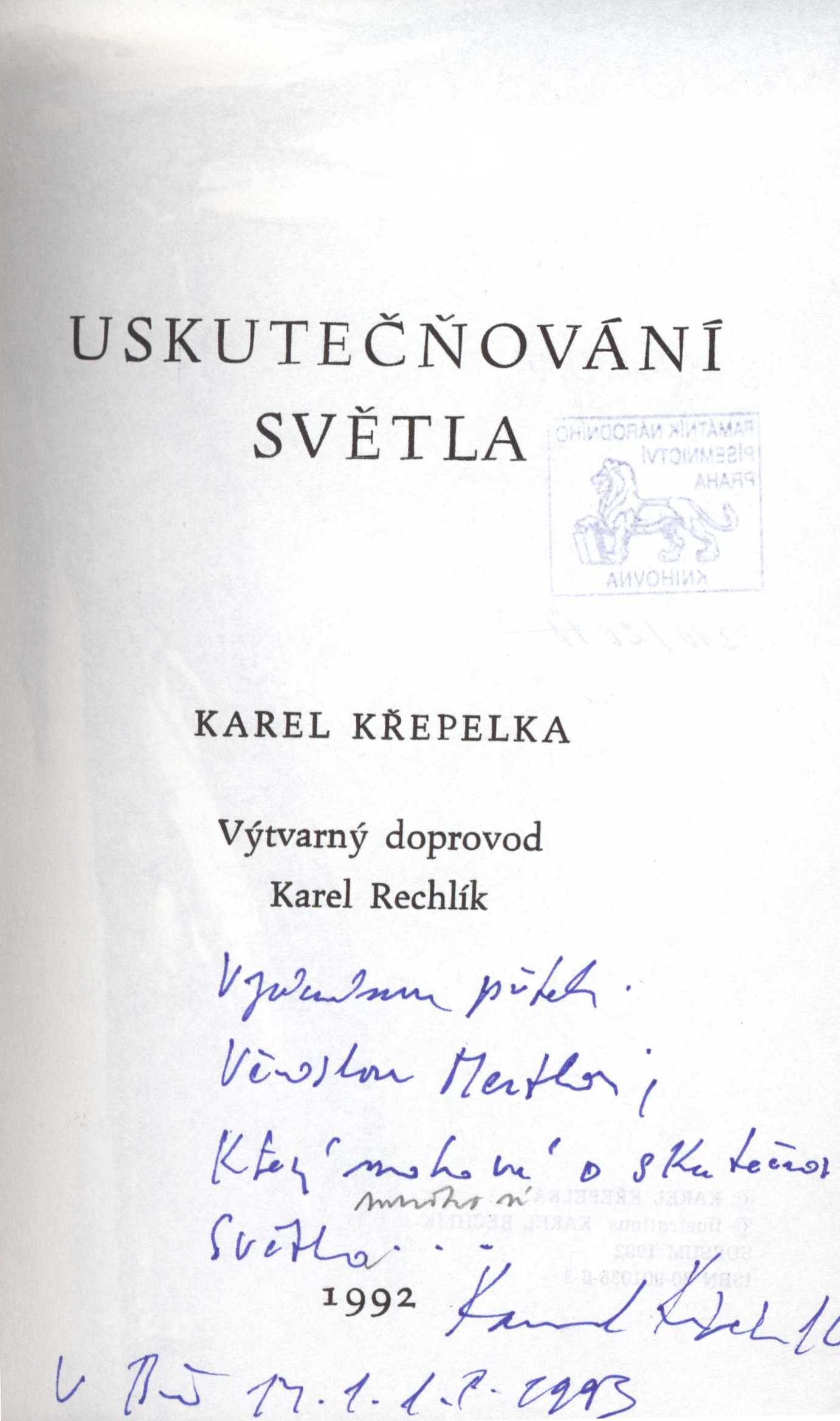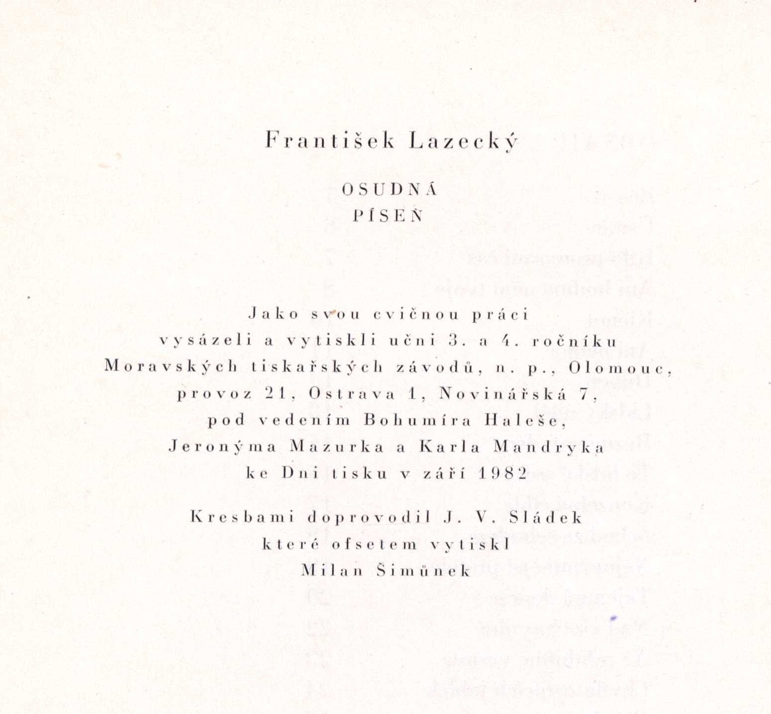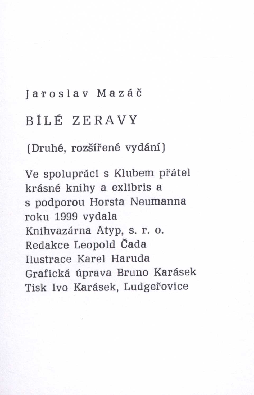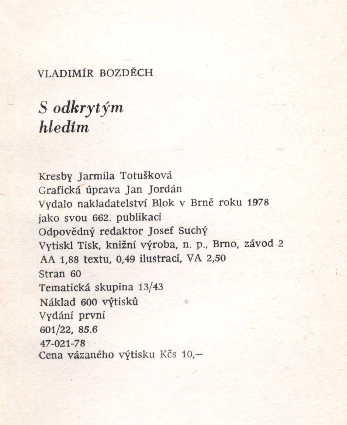 Názvové údaje Kosířské elegie / Otto F. Babler ; kresba v titulu od Cyrila Boudy ; k vydání připravil a ediční poznámku napsal Josef Glivický ; na obálce studie podoby Josefa Mánesa od Maxe Švabinského ; graficky upravil Alois Caletka Osobní jméno Babler, Otto František, 1901-1984 (Autor) (Dedikátor) Další autoři Glivický, Josef, 1903-1991 (Editor) (Autor úvodu atd.) Bouda, Cyril, 1901-1984 (Ilustrátor) Caletka, Alois, 1916-1997 (Knižní grafik) Mertl, Věroslav, 1929-2013 (Dedikant) Nakladatel Prostějov : Okresní knihovna, 1970 Výrobce V Olomouci : Moravské tiskařské závody Rozsah 19 stran : ilustrace Osobní hesla Mánes, Josef, 1820-1871 - malíř, ilustrátor, grafik Geografické heslo Čechy pod Kosířem (Česko) Klíčová slova čeští malíři * Morava * krajina * pobyt * vyznání * autobiografické eseje Počet ex. 4, z toho volných 5 Druh dok. monografie Signatura C12b 13298, C12b 14353, Branald 0317, P 134 f 100, M 156 g 62 Názvové údaje Noční hlídka / Karel Bodlák ; [dřevoryt na obálce Přemysl Rolčík ; typografie Oldřich Hlavsa] Osobní jméno Bodlák, Karel, 1903-1989 (Autor) (Dedikátor) Další autoři Rolčík, Přemysl, 1922-1989 (Ilustrátor) Hlavsa, Oldřich, 1909-1995 (Typograf) Mertl, Věroslav, 1929-2013 (Dedikant) Korp. Československý spisovatel (nakladatelství) (Nakladatel, vydavatel) Stráž, tiskařské závody (Tiskař) Nakladatel Praha : Československý spisovatel, 1971 Výrobce Stráž) Rozsah 70 s. Klíčová slova česká poezie * básně * výbor * stol. 20., léta 40.-60. Počet ex. 3, z toho volných 3 Druh dok. monografie Signatura C12a 1155, LK M 175 d 50, C12a 4574 Názvové údaje S odkrytým hledím / Vladimír Bozděch ; [kresby Jarmila Totušková ; grafická úprava Jan Jordán] Osobní jméno Bozděch, Vladimír, 1928-1991 (Autor) (Dedikátor) Další autoři Totušková, Jarmila, 1937- (Ilustrátor) Jordán, Jan, 1954- (Knižní grafik) Mertl, Věroslav, 1929-2013 (Dedikant) Korp. Blok (nakladatelství) (Nakladatel, vydavatel) Tisk Brno (tiskárna) (Tiskař) Nakladatel V Brně : Blok, 1978 Výrobce (Tisk 2) Rozsah 54 s. : il. Klíčová slova česká poezie * básně Počet ex. 1, z toho volných 1 Druh dok. monografie Signatura C12b 13317 Názvové údaje Miloslav Nováček (1923-1994) / texty - Hana Dobešová, František Dvořák, Milan Doubrava, Luboš Hlaváček, Josef Hošna, Václav Johanus, Jiří Kotalík, Bořivoj Lauda, Marcela Macková, Zdeněk Mráz, Stanislav Novotný, Blanka Pirnosová, Blanka Stehlíková ; rozhovory - Jan Bauer, Otakar Bílek, Věroslav Mertl ; foto - Radomír Postl, Karel Sláma, Michal Tůma ; grafická úprava - Anna Doubravová Osobní jméno Dobešová, Hana (Autor) Další autoři Dvořák, František, 1920-2015 (Autor) Doubrava, Milan, 1946-2017 (Autor) Hlaváček, Luboš, 1929-2007 (Autor) Hošna, Josef, 1926-2022 (Autor) Johanus, Václav, 1947-2024 (Autor) Kotalík, Jiří, 1920-1996 (Autor) Lauda, Bořivoj, 1922-2017 (Autor) Macková, Marcela (Autor) Mráz, Zdeněk, 1934-1993 (Autor) Novotný, Stanislav (Autor) Pirnosová, Blanka, 1946- (Autor) Stehlíková, Blanka, 1933- (Autor) Nováček, Miloslav, 1923-1994 (Umělec) Bauer, Jan, 1945-2025 (Dotazovatel, interviewující) Bílek, Otakar, 1932-2016 (Dotazovatel, interviewující) Mertl, Věroslav, 1929-2013 (Dotazovatel, interviewující) Postl, Radomír, 1939-2021 (Fotograf) Sláma, Karel, 1941- (Fotograf) Tůma, Michal, 1947- (Fotograf) Doubravová, Anna, 1957- (Knižní grafik) Reindlová, Alena (Nakladatel, vydavatel) (Autor úvodu atd.) Nárovec, František, 1954- (Autor úvodu atd.) Korp. Měsíc ve dne (nakladatelství) (Nakladatel, vydavatel) Typodesign (firma) (Tiskař) Nakladatel České Budějovice : Alena Reindlová ve spolupráci s nakladatelstvím Eliška Štěpánová - Měsíc ve dne, 2018 Výrobce České Budějovice : Typodesign s. r. o. Copyright © Eliška Štěpánová - Měsíc ve dne Rozsah 227 stran : ilustrace (některé barevné), portréty, faksimile ; 23 x 24 cm Osobní hesla Nováček, Miloslav, 1923-1994 - grafik, výtvarník, malíř, ilustrátor, autor dřevořezů a umělec Chronologie 1945-1994 Předmětová hesla Czech prints - 20th century * Czech drawing - 20th century * modern art - Czechia Klíčová slova česká literatura * monografie * výtvarné umění * moderní umění * grafické umění * grafika * kresba * čeští umělci * Nováček M. * Česko * stol. 20. Počet ex. 1, z toho volných 1 Druh dok. monografie Signatura C12b 18987 Názvové údaje Uskutečňování světla / Karel Křepelka ; výtvarný doprovod Karel Rechlík Osobní jméno Křepelka, Karel, 1946-1999 (Autor) (Dedikátor) Další autoři Rechlík, Karel, 1950- (Ilustrátor) Mertl, Věroslav, 1929-2013 (Dedikant) Korp. Sursum (nakladatelství) (Nakladatel, vydavatel) Nakladatel Tišnov : Sursum, 1992 Rozsah 38 s. : il Klíčová slova česká poezie * básně Počet ex. 2, z toho volných 2 Druh dok. monografie Signatura M 216 f 11, C12b 13308 Názvové údaje Chlebovice / František Lazecký ; [doslov napsal Václav Halat ; fotografie Jaroslav Žižka] Osobní jméno Lazecký, František, 1905-1984 (Autor) (Dedikátor) Další autoři Halát, Václav (Autor úvodu atd.) Žižka, Jaroslav (Fotograf) Mertl, Věroslav, 1929-2013 (Dedikant) Korp. Moravské tiskařské závody (firma) (Tiskař) Nakladatel Chlebovice : Osvětová beseda, 1983 Výrobce Moravské tiskařské závody, 21) Rozsah 14 s. : fot. ; 20 cm Klíčová slova česká poezie * básně * protinacistické básně * protiválečné básně Počet ex. 1, z toho volných 1 Druh dok. monografie Signatura C12b 13303 Názvové údaje Osudná píseň / František Lazecký ; [kresbami doprovodil J. V. Sládek] Osobní jméno Lazecký, František, 1905-1984 (Autor) (Dedikátor) Další autoři Sládek, Jan Václav, 1909-1992 (Ilustrátor) Mertl, Věroslav, 1929-2013 (Dedikant) Korp. Moravské tiskařské závody (firma) (Nakla
