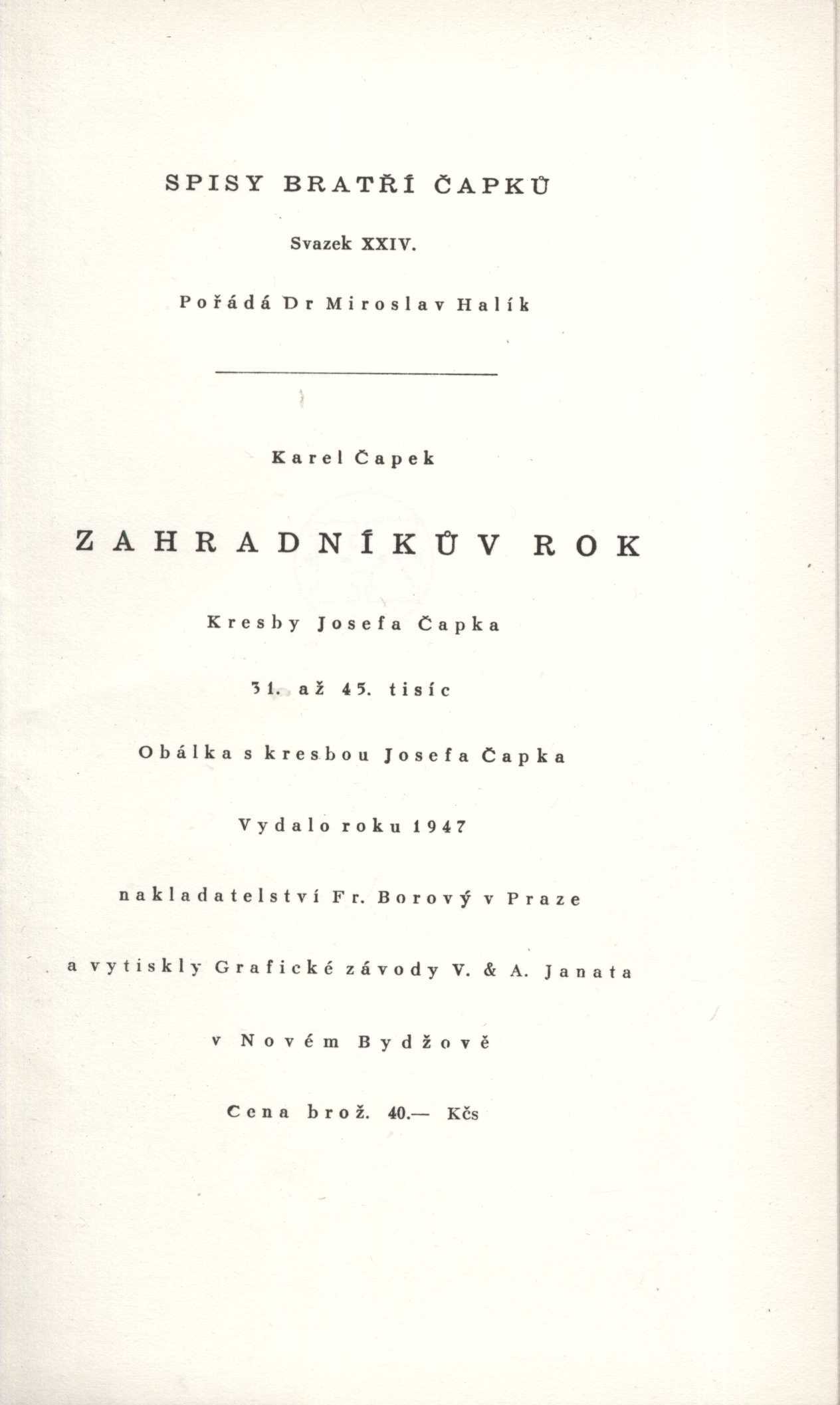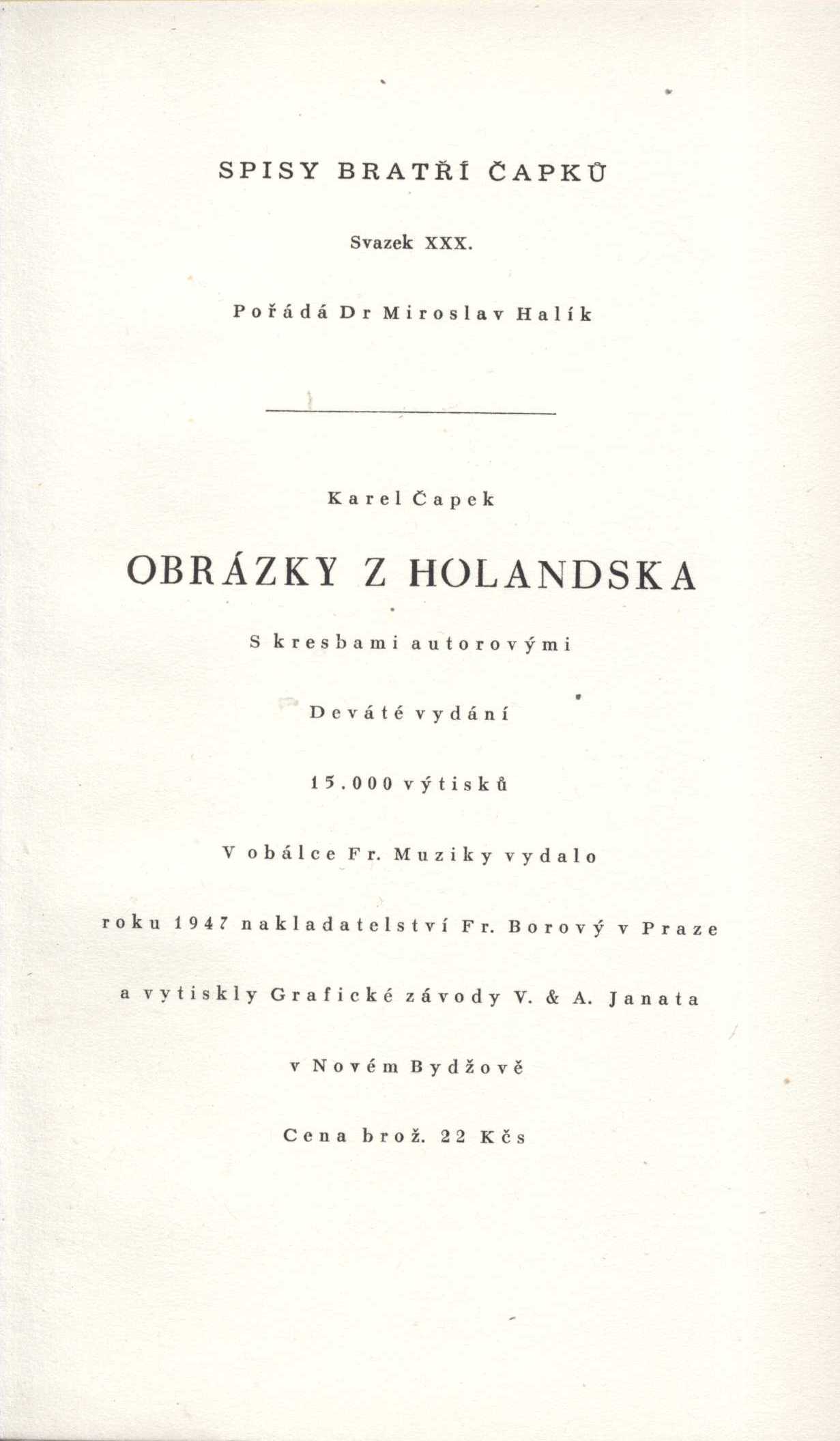 Názvové údaje Psyche / Pavel Albieri ; 5 litografií Karla Votlučky Osobní jméno Albieri, Pavel, 1861-1901 (Autor) Další autoři Votlučka, Karel, 1896-1963 (Ilustrátor) (Litograf) Korp. Grafické závody V. a A. Janata (Tiskař) Nakladatel [V Hradci Králové : knihomilové severovýchodních Čech], 1936 Výrobce Grafické závody V. & A. Janata) Rozsah 89 s. : il. Osobní hesla Sporck, František Antonín, hrabě, 1662-1738 Klíčová slova německá literatura * historická próza * česká próza * Kuks * bibliofilie * bibliofilská vydání * bibliofilské tisky Počet ex. 1, z toho volných 1 Druh dok. monografie Signatura KaG XXV F 35 Názvové údaje Ptáci : komedie / Aristofanes ; přeložil Ferdinand Stiebitz Autor Aristofanés, asi 445-asi 386 př. Kr. (Autor) Další autoři Stiebitz, Ferdinand, 1894-1961 (Překladatel) (Autor doslovu, tiráže atd.) Zink, Karel, 1889-1975 (Dedikátor) Zinková, Viola, 1925-2017 (Dedikant) Korp. Rudolf Škeřík (nakladatelství) (Nakladatel, vydavatel) Grafické závody V. a A. Janata (Tiskař) Nakladatel Praha : Antická knihovna, Rudolf Škeřík, 1934 Výrobce V Novém Bydžově : V. & A. Janata Rozsah 125 stran ; 20 cm Klíčová slova řecká literatura * řecká dramata * Aristofanes * komedie * překlad * Stiebitz F. * číslovaný výtisk * r. 1934 Počet ex. 2, z toho volných 2 Druh dok. monografie Signatura VZinková 0585, P 134 g 100 Názvové údaje Z modliteb básníkových : verše / Antonín Bebr ; Osobní jméno Bebr, Antonín, 1877-1940 (Autor) Další autoři Coufal, Vladislav Eduard, 1910-1980 (Nakladatel, vydavatel) Korp. Orbis (tiskárna) (Tiskař) Grafické závody V. a A. Janata (Tiskař) Nakladatel Praha : Vydavatelstvo EMNA, 1940 Výrobce [Grafické závody V. a A. Janata]) Rozsah 60 s. Klíčová slova česká literatura * česká poezie Počet ex. 1, z toho volných 1 Druh dok. monografie Signatura VHB 0236 Názvové údaje Povídání o pejskovi a kočičce : jak spolu hospodařili a ještě o všelijakých jiných věcech / pro děti napsal a nakreslil Josef Čapek, [který provedl i úpravu knihy] Osobní jméno Čapek, Josef, 1887-1945 (Autor) (Ilustrátor) (Knižní grafik) Další autoři Aventinum (nakladatelství) (Nakladatel, vydavatel) Grafické závody V. a A. Janata (Tiskař) Nakladatel Praha : Aventinum : Dr. O. Štorch-Marien, 1929 Výrobce V. a A. Janata) Rozsah 122 s. : il. ; 4° Klíčová slova česká literatura * česká próza * české pohádky * pohádky o zvířatech * knihy pro děti Počet ex. 4, z toho volných 4 Druh dok. monografie Signatura AFB 0513, AFB 0513a, C12d 1792, Thon 0064 Názvové údaje Krakatit : román / Karel Čapek ; [v úpravě Josefa Čapka] Osobní jméno Čapek, Karel, 1890-1938 (Autor) Další autoři Čapek, Josef, 1887-1945 (Knižní grafik) Korp. Dr. Ot. Štorch-Marien (nakladatelství) (Nakladatel, vydavatel) Grafické závody V. a A. Janata (Tiskař) Nakladatel Praha : Dr. Ot. Štorch-Marien, 1924 Výrobce Grafické závody V. & A. Janata) Rozsah 253 s. Klíčová slova česká literatura * próza * utopický román * stol. 20., léta 20. Počet ex. 2, z toho volných 2 Druh dok. monografie Signatura C12b 933, VMartínek 0525 Názvové údaje Obrázky z Holandska / Karel Čapek ; s kresbami autorovými ; [v obálce Fr. Muziky] Osobní jméno Čapek, Karel, 1890-1938 (Autor) (Ilustrátor) Další autoři Muzika, František, 1900-1974 (Autor obálky) Korp. Fr. Borový (firma) (Nakladatel, vydavatel) Grafické závody V. a A. Janata (Tiskař) Nakladatel Praha : Fr. Borový, 1947 Výrobce Grafické závody V. & A. Janata) Rozsah 86 s. : il. ; 8° Klíčová slova česká literatura * česká próza * Holandsko * cestopisné črty Počet ex. 1, z toho volných 1 Druh dok. monografie Signatura AFB 1905 Názvové údaje Obrázky z Holandska / Karel Čapek ; s kresbami autorovými ; [v obálce Fr. Muziky] Osobní jméno Čapek, Karel, 1890-1938 (Autor) (Ilustrátor) Další autoři Muzika, František, 1900-1974 (Autor obálky) Korp. Fr. Borový (firma) (Nakladatel, vydavatel) Grafické závody V. a A. Janata (Tiskař) Nakladatel Praha : Fr. Borový, 1947 Výrobce Grafické závody V. & A. Janata) Rozsah 86 s. : il. ; 8° Klíčová slova česká literatura * česká próza * Holandsko * cestopisné črty Počet ex. 1, z toho volných 1 Druh dok. monografie Signatura AFB 1906 Názvové údaje První parta / Karel Čapek ; [obálku navrhl Václav Sivko] Osobní jméno Čapek, Karel, 1890-1938 (Autor) Další autoři Sivko, Václav, 1923-1974 (Autor obálky) Korp. Fr. Borový (firma) (Nakladatel, vydavatel) Grafické závody V. a A. Janata (Tiskař) Nakladatel Praha : Fr. Borový, 1948 Výrobce Grafické závody V. & A. Janata) Rozsah 253 s. ; 8° Klíčová slova česká literatura * česká próza * hornická tematika * román Počet ex. 1, z toho volných 1 Druh dok. monografie Signatura AFB 2012 Názvové údaje První parta / Karel Čapek ; [obálku navrhl Václav Sivko] Osobní jméno Čapek, Karel, 1890-1938 (Autor) Další autoři Sivko, Václav, 1923-1974 (Autor obálky) Korp. Fr. Borový (firma) (Nakladatel, vydavatel) Grafické závody V. a A. Janata (Tiskař) Nakladatel Praha : Fr. Borový, 1948 Výrobce Grafické závody V. & A. Janata) Rozsah 253 s. ; 8° Klíčová slova česká literatura * česká próza * hornická tematika * román Počet ex. 1, z toho volných 1 Druh dok. monografie Signatura AFB 2013 Názvové údaje Zahradníkův rok / Karel Čapek ; obrázky Josefa Čapka ; [obálka s kresbou Josefa Čapka] Osobní jméno Čapek, Karel, 1890-1938 (Autor) Další autoři Čapek, Josef, 1887-1945 (Ilustrátor) Korp. Fr. Borový (firma) (Nakladatel, vydavatel) Grafické závody V. a A. Janata (Tiskař) Nakladatel Praha : Fr. Borový, 1947 Výrobce Grafické závody V. & A. Janata) Rozsah 156 s. : il. ; 8° Klíčová slova česká literatura * česká próza * zahrádkářství * fejetony Počet ex. 1, z toho volných 1 Druh dok. monografi