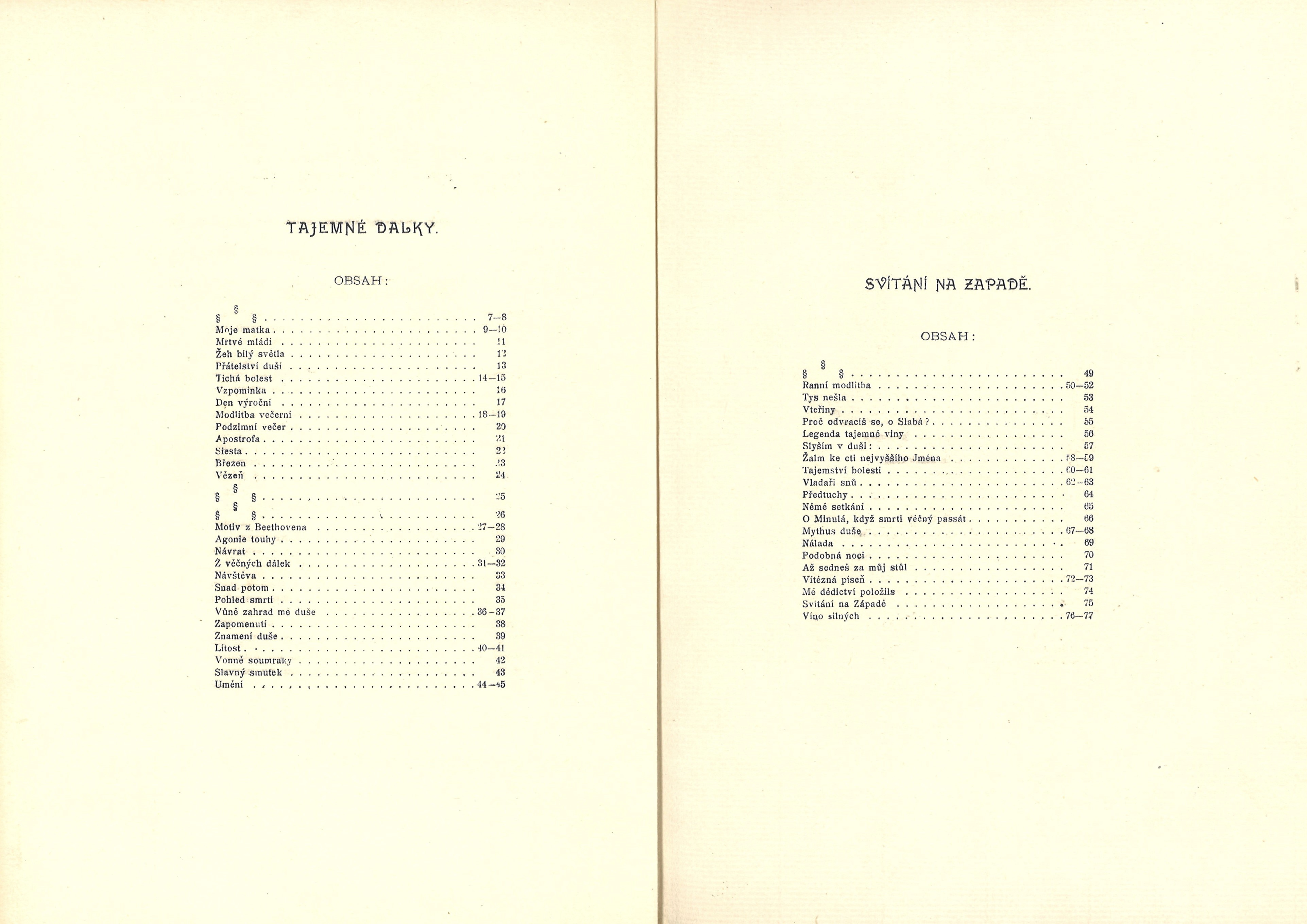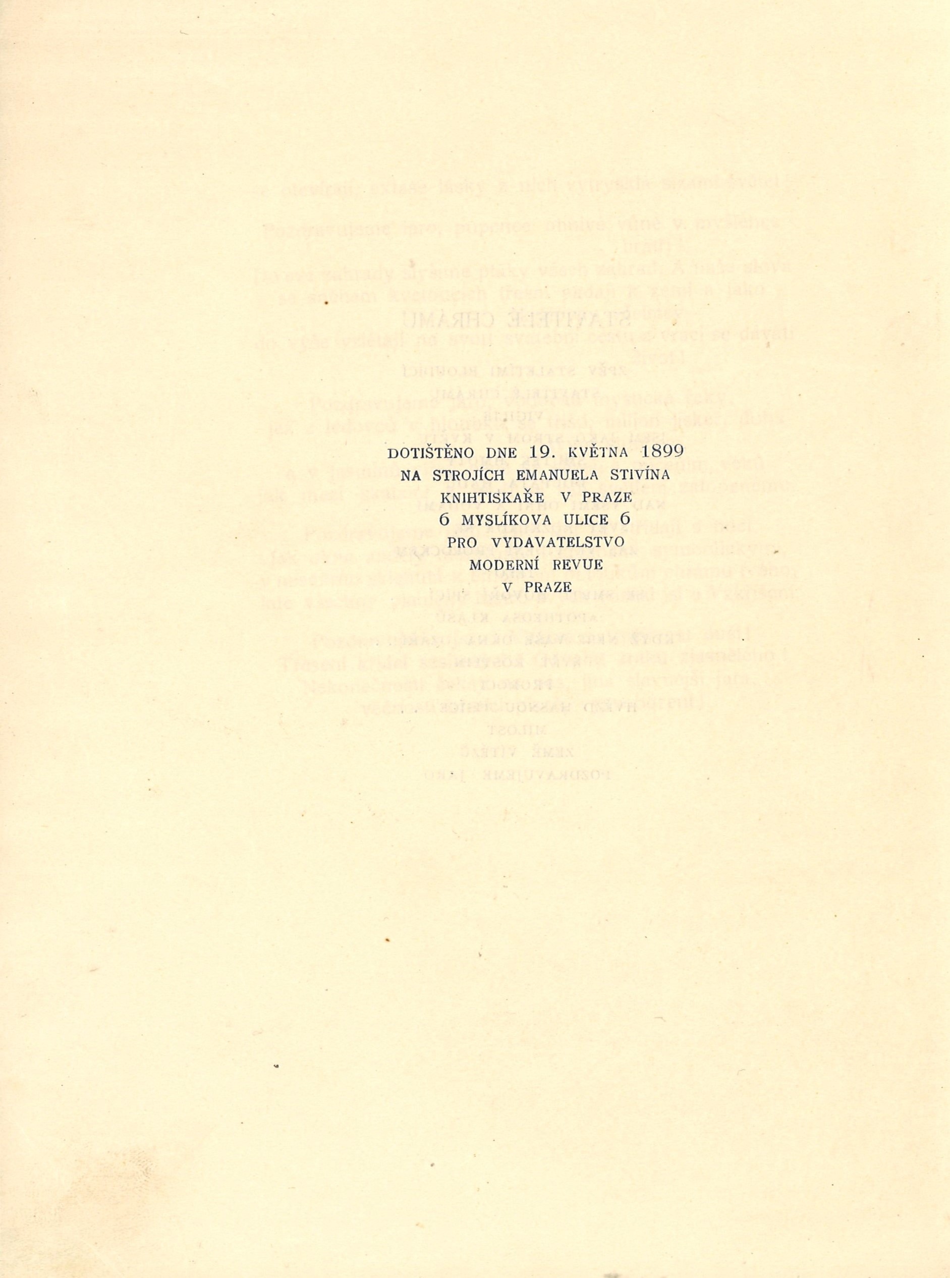 Názvové údaje "Praha jak bývala.." : kresby a vzácná grafika z pražské soukromé sbírky / tento katalog sestavil Bedřich Lenz ; se čtyřmi vyobrazeními ; Krasoumná jednota, Praha 2, Pštrossova 12. ; 22. únor - 16. březen Záhlaví-akce "Praha jak bývala.." (kresby a vzácná grafika z pražské soukromé sbírky) (22. 2. - 16. 3. 1930 : Krasoumná jednota, Praha, Česko) Další autoři Karásek ze Lvovic, Jiří, 1871-1951 (Autor podpisu) Lenz, Bedřich (Autor úvodu atd.) Korp. Krasoumná jednota (Praha) (Nakladatel, vydavatel) Emanuel Stivín (v Praze) (Tiskař) Nakladatel Praha : Krasoumná jednota, 1930 Výrobce (Tiskem Emanuela Stivína a synů) Rozsah 32 s., 4 l. obr. příl. : il. Klíčová slova česká literatura * české výtvarné umění * katalog * katalog výstavy * výstava * Praha * pragensia * stol. 20., léta 30. * r. 1930 Počet ex. 1, z toho volných 1 Druh dok. monografie Signatura KaG IX B 58 Názvové údaje Upomínka na Národopisnou výstavu českoslovanskou v Praze 1895 : Alešovy illustrace Národních písní Osobní jméno Aleš, Mikoláš, 1852-1913 (Ilustrátor) Další autoři Emanuel Stivín (v Praze) (Tiskař) Nakladatel V Praze : J. Jaroš, [1895] Výrobce Em. Stivín Rozsah 28 nečíslovaných stran : ilustrace ; 16 cm Klíčová slova česká grafika * české písně * národní písně * stol. 19. * jubilejní publikace Počet ex. 2, z toho volných 2 Druh dok. monografie Signatura P 75 f 70, P 74 e 109 Názvové údaje Novelly. I / napsal J. Arbes Osobní jméno Arbes, Jakub, 1840-1914 (Autor) (Nakladatel, vydavatel) Další autoři Emanuel Stivín (v Praze) (Tiskař) Nakladatel Praha : Jakub Arbes, 1896 Výrobce Em. Stivín Rozsah Strany 159-366 ; 19 cm Klíčová slova česká próza * novely Počet ex. 1, z toho volných 1 Druh dok. monografie Signatura F I 2458 Názvové údaje Po cestách vítězů / Arnošt Bláha Osobní jméno Bláha, Arnošt Inocenc, 1879-1960 (Autor) (Nakladatel, vydavatel) Další autoři Beneš Buchlovan, Bedřich, 1885-1953 (Dřívější majitel) (Dárce) Korp. Emanuel Stivín (v Praze) (Tiskař) Nakladatel [S. l.] : A. Bláha, 1902 Výrobce Tiskem Em. Stivína) Rozsah 70 s. Klíčová slova česká literatura * česká lyrika * česká poezie * dekadence Počet ex. 2, z toho volných 2 Druh dok. monografie Signatura KaG V23 A 41, KaG XXXII D 138 Názvové údaje Stavitelé chrámu / Otokar Březina Osobní jméno Březina, Otokar, 1868-1929 (Autor) Další autoři Moderní revue (nakladatelství) (Nakladatel, vydavatel) Emanuel Stivín (v Praze) (Tiskař) Nakladatel Praha : Moderní revue, 1899 Výrobce Emanuel Stivín Rozsah 47 nečíslovaných stran ; 24,5 cm Klíčová slova česká poezie * filozofické básně * symbolismus * přelom 19. a 20. stol. Počet ex. 4, z toho volných 4 Druh dok. monografie Signatura P 17 a 19, P 44 A 46, M 150 b 33, Holman-Březina 0247 Názvové údaje Tajemné dálky a Svítání na západě / Otokar Březina ; s třemi litografiemi Frant. Bílka Osobní jméno Březina, Otokar, 1868-1929 (Autor) (Dedikátor) (Autor podpisu) Další autoři Bílek, František, 1872-1941 (Ilustrátor) (Litograf) Korp. Moderní revue (nakladatelství) (Nakladatel, vydavatel) Emanuel Stivín (v Praze) (Tiskař) Nakladatel Praha : Moderní revue, 1900 Výrobce Tiskem Em. Stivína Rozsah 77 stran, 4 nečíslované listy obrazových příloh ; 24,5 cm Klíčová slova česká poezie * dekadence (literatura) * symbolismus (literatura) * bibliofilie Počet ex. 6, z toho volných 6 Druh dok. monografie Signatura VHB 1445, P 59 A 18, P 36 A 33, P 23 A 30, Holman-Březina 0317, C12c 5763 Názvové údaje Rodina, škola a společnost / napsal Josef Černý Osobní jméno Černý, Josef, 1863-1942 (Autor) Další autoři Emanuel Stivín (v Praze) (Tiskař) Tělocvičná jednota Sokol Pražský. Matice Sokola Pražského (Nakladatel, vydavatel) Nakladatel V Praze : Nákladem Sokolské matice, 1897 Výrobce V Praze : Tiskem Em. Stivína, 1897 Rozsah 68 stran Klíčová slova česká literatura * česká společnost * společnost * školství * výchova * výchova dětí * výchova mládeže * morálka * Česká obec sokolská * Sokol * sokolské hnutí * sokolstvo Počet ex. 1, z toho volných 1 Druh dok. monografie Signatura KaG III D2 50/přív.1 Odkazy (3) - Monografie Názvové údaje Marnosti : básně / Viktor Dyk Osobní jméno Dyk, Viktor, 1877-1931 (Autor) Další autoři Stivín, Emanuel, 1848-1925 (Tiskař) Korp. Moderní revue (nakladatelství) (Nakladatel, vydavatel) Emanuel Stivín (v Praze) (Tiskař) Nakladatel Praha : Moderní revue, [1900] Výrobce (Tiskem Em. Stivína) Rozsah 76 s. Klíčová slova česká literatura * česká poezie * česká dekadence * dekadence * básně * přelom 19. a 20. stol. Počet ex. 1, z toho volných 1 Druh dok. monografie Signatura KaG XVI B 319 Názvové údaje Sokolstvo a naše doba / napsal Milan Fučík Osobní jméno Fučík, Milan, 1876-1934 (Autor) Další autoři Emanuel Stivín (v Praze) (Tiskař) Tělocvičná jednota Sokol Pražský. Matice Sokola Pražského (Nakladatel, vydavatel) Nakladatel V Praze : Nákladem Sokolské matice, 1897 Výrobce V Praze : Tiskem Em. Stivína, 1897 Rozsah 30 stran Klíčová slova česká literatura * Česká obec sokolská * Sokol * sokolské hnutí * sokolstvo Počet ex. 1, z toho volných 1 Druh dok. monografie Signatura KaG III D2 50 Odkazy (3) - Monografie Názvové údaje Mstivá kantiléna / Karel Hlaváček Osobní jméno Hlaváček, Karel, 1874-1898 (Autor) Další autoři Moderní revue (nakladatelství) (Nakladatel, vydavatel) Emanuel Stivín (v Praze) (Tiskař) Nakladatel Praha : Moderní revue, 1900 Výrobce (Tiskem Em. Stivína) Rozsah 30 s. Klíčová slova česká literatura * bibliofilie * bibliofilské tisky * bibliofilský tisk * dekadence * česká poezie * symbolismus Počet ex. 1, z toho volných 1 Druh dok. monografie Signatura KaG XVI C 182