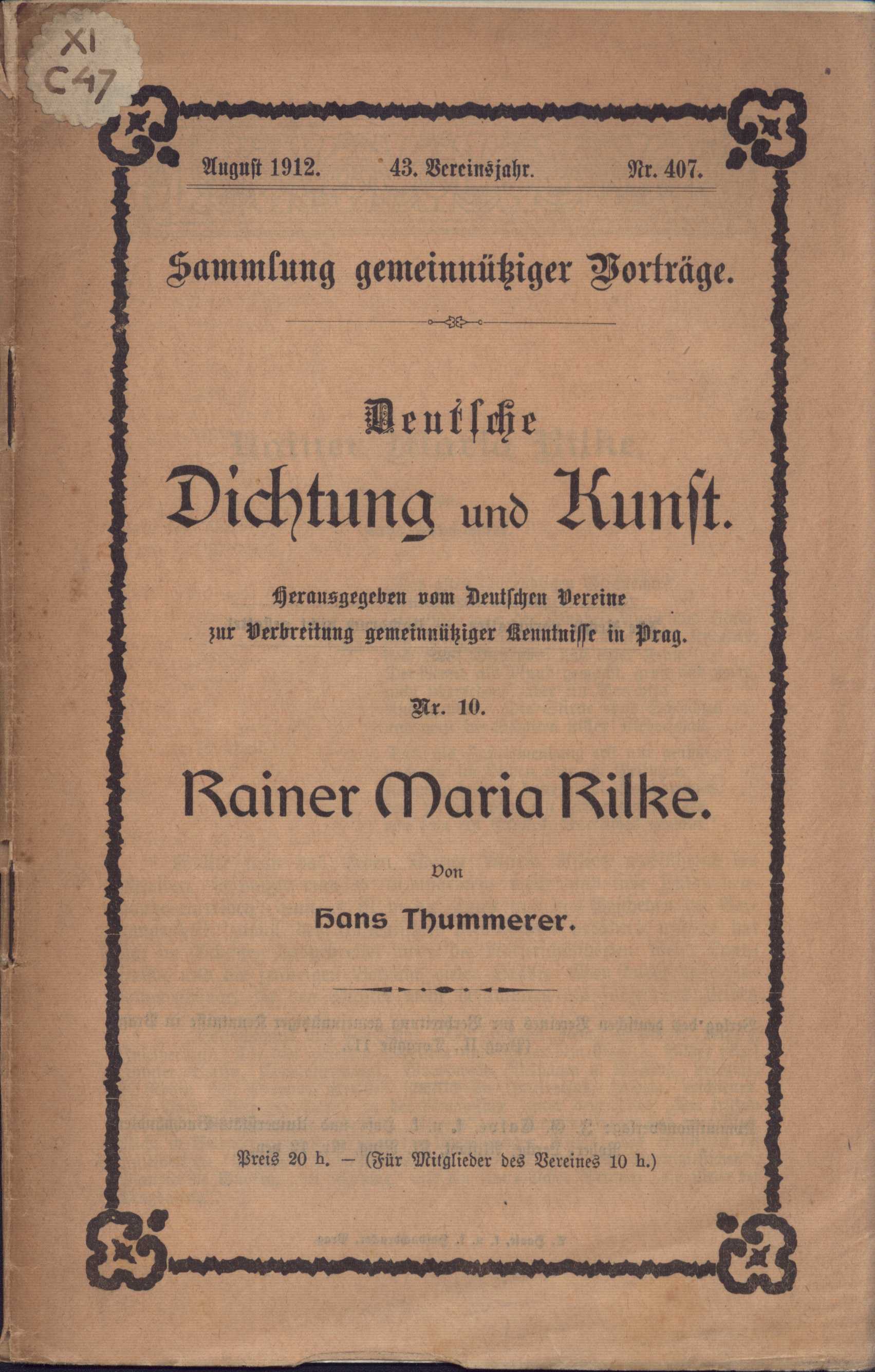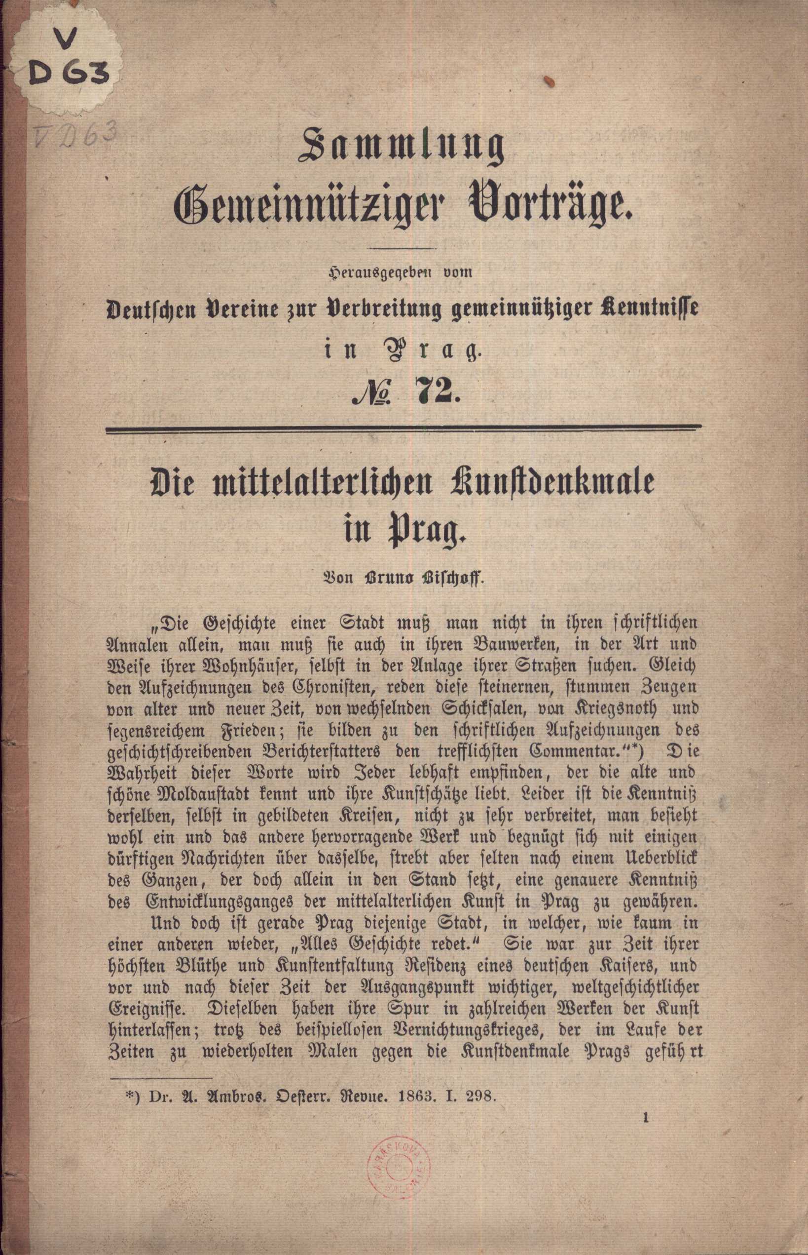 Názvové údaje Aus griechischen Papyri / von Johann Endt Osobní jméno Endt, Johann, 1869-1951 (Autor) Další autoři Andreas Haase (nakladatelství a tiskárna) (Tiskař) Deutsche Verein zur Verbreitung gemeinnütziger Kenntnisse in Prag (Nakladatel, vydavatel) Nakladatel Prag : Deutsche Verein zur Verbreitung gemeinnütziger Kenntnisse, 1908 Výrobce (A. Haase) Rozsah 85-107 s. (celkem 24 s.) Klíčová slova německá literatura * přednášky * stol. 20., léta 10. * antika * studie * Řecko Počet ex. 1, z toho volných 1 Druh dok. monografie Signatura KaG I D2 24 Názvové údaje Adalbert Stifter und die bildende Kunst / von Jos. Neuwirth Osobní jméno Neuwirth, Joseph, 1885-1934 (Autor) Další autoři Andreas Haase (nakladatelství a tiskárna) (Tiskař) Deutsche Verein zur Verbreitung gemeinnütziger Kenntnisse in Prag (Nakladatel, vydavatel) Nakladatel In Prag : Verlag des Deutschen Vereines zur Verbreitung gemeinnütziger Kenntnisse, 1903 Výrobce Prag : K. u. k. Hofbuchdruckerei A. Haase, 1903 Rozsah strany 36-66 Osobní hesla Stifter, Adalbert, 1805-1868 - česko-rakouský spisovatel, básník, malíř a pedagog Klíčová slova česká literatura * rakouská literatura * literární historie * dějiny umění Počet ex. 1, z toho volných 1 Druh dok. monografie Signatura KaG IV B 22 Názvové údaje Böhmens Kunstleben unter Karl IV. / von Joseph Neuwirth Osobní jméno Neuwirth, Joseph, 1885-1934 (Autor) Další autoři Andreas Haase (nakladatelství a tiskárna) (Tiskař) Deutsche Verein zur Verbreitung gemeinnütziger Kenntnisse in Prag (Nakladatel, vydavatel) Nakladatel In Prag : [Deutsche Verein zur Verbreitung gemeinnütziger Kenntnisse], 1891 Výrobce K. u. k. Hofbuchdruckerei A. Haase Rozsah 24 stran ; 22 cm Osobní hesla Karel IV., český král a římský císař, 1316-1378 Klíčová slova německá literatura * dějiny umění * české umění * české středověké umění * středověké umění Počet ex. 1, z toho volných 1 Druh dok. monografie Signatura KaG V D 65 Názvové údaje Kriegslieder deutsch-böhmischer Dichter / mit einer kurzen Einführung von Adolf Hauffen Další autoři Hauffen, Adolf, 1863-1930 (Autor úvodu atd.) Korp. Andreas Haase (nakladatelství a tiskárna) (Tiskař) Deutsche Verein zur Verbreitung gemeinnütziger Kenntnisse in Prag (Nakladatel, vydavatel) Nakladatel Prag : Herausgegeben vom Deutschen Vereine zur Verbreitung gemeinnütziger Kenntnisse, 1914 Výrobce (A. Haase) Rozsah 16 s. Klíčová slova německá literatura * německá poezie * česká literatura * česká poezie * německo-česká literatura * 1. světová válka * antologie * antologie textů * r. 1914 Počet ex. 1, z toho volných 1 Druh dok. monografie Signatura KaG I D2 21 Názvové údaje Die mittelalterlichen Kunstdenkmale in Prag / von Bruno Bischoff Osobní jméno Bischoff, Bruno, 1855-1911 (Autor) Další autoři Andreas Haase (nakladatelství a tiskárna) (Tiskař) Deutsche Verein zur Verbreitung gemeinnütziger Kenntnisse in Prag (Nakladatel, vydavatel) Nakladatel In Prag : Verlag des Deutschen Vereines zur Verbreitung gemeinnütziger Kenntnisse ; In Leipzig : Commissionär A. Refelshöfer & Cie., [1882] Výrobce Prag : K. k. Hofbuchdruckerei A. Haase, [1882] Rozsah 32 stran ; 22 cm Klíčová slova Praha * česká literatura * pragensia * dějiny umění * české středověké umění * středověké umění Počet ex. 1, z toho volných 1 Druh dok. monografie Signatura KaG V D 63 Názvové údaje Rainer Maria Rilke / von Hans Thummerer Osobní jméno Thummerer, Johannes, 1888-1921 (Autor) Další autoři Andreas Haase (nakladatelství a tiskárna) (Tiskař) Deutsche Verein zur Verbreitung gemeinnütziger Kenntnisse in Prag (Nakladatel, vydavatel) Nakladatel In Prag : Verlag des Deutschen Vereines zur Verbreitung gemeinnütziger Kenntnisse, 1912 Výrobce A. Haase, k. u. k. Hofbuchdrucker Rozsah 13 stran ; 22,5 cm Osobní hesla Rilke, Rainer Maria, 1875-1926 - pražský německy píšící spisovatel, dramatik, překladatel Klíčová slova česká literatura * rakouská literatura * literární historie * dějiny umění Počet ex. 1, z toho volných 1 Druh dok. monografie Signatura KaG XI C 47