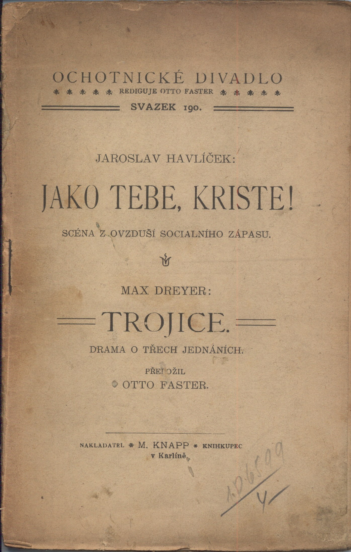 Názvové údaje Jako Tebe, Kriste! : scéna z ovzduší sociálního zápasu / Jaroslav Havlíček Osobní jméno Havlíček, Jaroslav, 1881-1960 (Autor) Další autoři Dreyer, Max, 1862-1946 (Autor) Korp. Mamert Knapp (nakladatelství) (Nakladatel, vydavatel) M. Knapp (nakladatelství, tiskárna) (Tiskař) Nakladatel V Karlíně : Nakladatel M. Knapp knihkupec, [1903] Výrobce tiskem M. Knappa) Rozsah 70 s. ; 19 cm Klíčová slova česká literatura * drama * divadelní hra Počet ex. 1, z toho volných 1 Druh dok. ***nezařazeno*** Signatura P 118 D 23