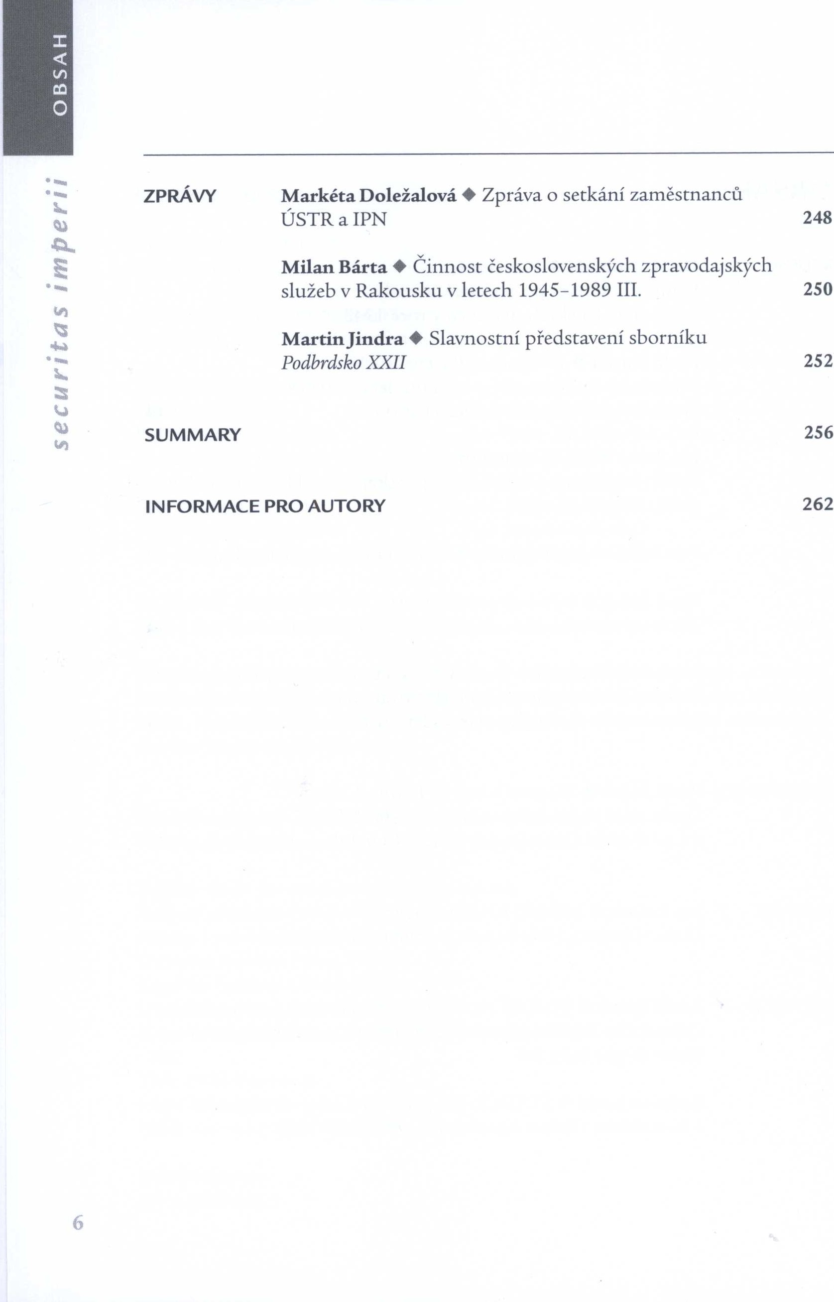 Názvové údaje Securitas imperii Další autoři Virkner, Patrik (Šéfredaktor, odpovědný redaktor) Ježek, Jaroslav (Knižní grafik) (Sazeč) Korp. Ústav pro studium totalitních režimů (vědecký ústav) (Nakladatel, vydavatel) TNM PRINT s. r. o. (tiskárna) (Tiskař) Roč., číslo 30 (01/2017), 2017 Nakladatel Praha : Ústav pro studium totalitních režimů, 2017 Výrobce TNM print s.r.o. Rozsah 346 stran : fotografie, portréty, faksimile ; 23 cm Osobní hesla Trapl, Miloš, 1935- - historik Klíčová slova Československo * totalitní režimy * Státní bezpečnost * františkáni * františkánský řád * soudní procesy * stol. 20., léta 70.-80. * koncentrační tábor * Ravensbrück * ženy * perzekuce * NSR * velvyslanectví * studie * rozhovory * dokumenty * recenze * sborník Nadřízená jednotka Securitas imperii Počet ex. 1, z toho volných 1 Druh dok. PERIODIKA - Přijatá čísla Signatura LITc 0299 Názvové údaje Securitas imperii Další autoři Virkner, Patrik (Šéfredaktor, odpovědný redaktor) Ježek, Jaroslav (Knižní grafik) (Sazeč) Korp. Ústav pro studium totalitních režimů (vědecký ústav) (Nakladatel, vydavatel) TNM PRINT s. r. o. (tiskárna) (Tiskař) Roč., číslo 29 (02/2016), 2016 Nakladatel Praha : Ústav pro studium totalitních režimů, 2016 Výrobce TNM print s.r.o. Rozsah 330 stran : fotografie, portréty, faksimile ; 23 cm Osobní hesla Trochta, Štěpán, 1905-1974 - litoměřický biskup, kardinál * Patočka, Jan, 1907-1977 - filozof, překladatel, pedagog * Pithart, Petr, 1941- - politik a právník Klíčová slova Československo * východní Evropa * totalitní režimy * Státní bezpečnost * emigrace * studentské spolky * univerzita * Brno * normalizace * písemnosti * r. 1968-1969 * r. 1969-1971 * studie * rozhovory * dokumenty * recenze * sborník Nadřízená jednotka Securitas imperii Počet ex. 1, z toho volných 1 Druh dok. PERIODIKA - Přijatá čísla Signatura LITc 0298 Názvové údaje Securitas imperii Další autoři Virkner, Patrik (Šéfredaktor, odpovědný redaktor) Ježek, Jaroslav (Knižní grafik) (Sazeč) Korp. Ústav pro studium totalitních režimů (vědecký ústav) (Nakladatel, vydavatel) TNM PRINT s. r. o. (tiskárna) (Tiskař) Roč., číslo 27 (02/2015), 2015 Nakladatel Praha : Ústav pro studium totalitních režimů, 2015 Výrobce TNM Print s.r.o. Rozsah 264 stran : fotografie, portréty, faksimile ; 23 cm Klíčová slova Československo * totalitní režimy * politický vývoj * 2. světová válka * nacismus * ukrajinská povstalecká armáda * německá okupace * koncentrační tábor * Ravensbrück * Pražské povstání * r. 1939-1945 * studie * dokumenty * recenze * sborník Nadřízená jednotka Securitas imperii Počet ex. 1, z toho volných 1 Druh dok. PERIODIKA - Přijatá čísla Signatura LITc 0296