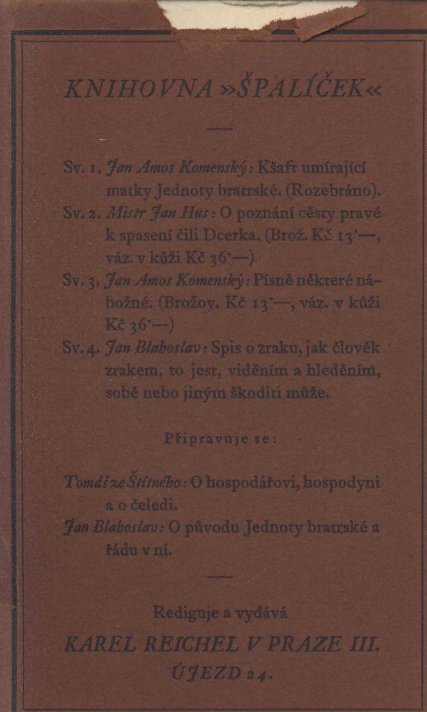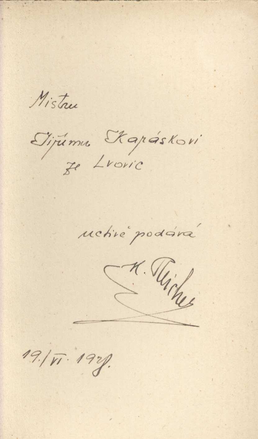 Názvové údaje Rukověť sběratelova / J. M. Augusta Osobní jméno Augusta, Jan Maria, 1897-1939 (Autor) (Dedikátor) Další autoři Bradáč, Ludvík, 1885-1947 (Dedikátor) Karásek ze Lvovic, Jiří, 1871-1951 (Dedikant) Juna, Zdeněk, 1897-1975 (Ilustrátor) Stretti, Viktor, 1878-1957 (Grafický technik) (Leptař) Bílek, František, 1872-1941 (Grafický technik) Kobliha, František, 1877-1962 (Grafický technik) Vik, Karel, 1883-1964 (Grafický technik) Röhling, Vladislav, 1878-1949 (Grafický technik) Klír, Svatopluk, 1896-1959 (Grafický technik) Moravec, Alois, 1899-1987 (Grafický technik) Brunner, Vratislav Hugo, 1886-1928 (Grafický technik) Kremlička, Rudolf, 1886-1932 (Grafický technik) Tusar, Slavoboj, 1885-1950 (Grafický technik) Kulhánek, Stanislav, 1885-1970 (Grafický technik) Pavelka, František, 1894-1948 (Grafický technik) Šimon, Tavík František, 1877-1942 (Grafický technik) Nauman, Arno, 1887-1959 (Grafický technik) Mánes, Josef, 1820-1871 (Umělec) Kafka, Bohumil, 1878-1942 (Sochař) Braunerová, Zdenka, 1858-1934 (Knižní grafik) Korp. Průmyslová tiskárna v Praze (Tiskař) Ludvík Bradáč (nakladatelství) (Nakladatel, vydavatel) Nakladatel Praha : Nakladatelství L. Bradáče, 1927 Výrobce (Tiskem Průmyslové tiskárny) Rozsah 1102 s., [2] l. obr. příl., [31] l. graf. příl. Klíčová slova česká literatura * užité umění * sběratelé * sběratelství * muzejní sbírky * ochrana sbírek * sbírka * sbírka umění * sbírky * soukromé sbírky * umělecké sbírky * bibliofilie * bibliofilské tisky * bibliofilský tisk * knihy * porcelán * numismatika * šperky * podpisy * signatury * značky * knižní značky * knižní grafika * grafici * grafické listy * grafické umění * grafický design * grafické techniky * rytecké techniky * umělecké techniky * sochy * sochaři * sochařství * textil * koberce * nábytek * historický nábytek * umělecký nábytek * hudební nástroje Počet ex. 1, z toho volných 1 Druh dok. monografie Signatura KaG V C 54 Odkazy (1) - Monografie Názvové údaje Bratřím tvůrcům / František Bílek Osobní jméno Bílek, František, 1872-1941 (Autor) (Autor podpisu) (Ilustrátor) Další autoři Karásek ze Lvovic, Jiří, 1871-1951 (Dedikant) Reichel, Karel, 1895-1970 (Dedikátor) (Nakladatel, vydavatel) Korp. Kryl a Scotti (firma) (Tiskař) Nakladatel Praha : Soukromý tisk ... Karla Reichla, 1929 Výrobce Tiskem bibliofilů Kryla a Scottiho) Rozsah 11 s. : il. Osobní hesla Bílek, František, 1872-1941 - sochař, grafik a ilustrátor Klíčová slova česká literatura * esej * vyznání * umění * výtvarné umění * novoroční tisk * novoročenka * soukromé tisky * bibliofilie * bibliofilské tisky * bibliofilský tisk * stol. 20., léta 20. * Bílek F. Počet ex. 2, z toho volných 1 Druh dok. monografie Signatura KaG XVI C 159, M 126 h 131 Názvové údaje Cesta : [cyklus pův. litografií] / František Bílek ; [Text česko-francouzský napsal Miloš Marten] Osobní jméno Bílek, František, 1872-1941 (Umělec) Další autoři Marten, Miloš, 1883-1917 (Autor) Nakladatel V Praze : Odbor Svazu Českoslovanského Studentstva pro postavení student. pomníku Mládí, 1909 Výrobce Lithografie tiskl Ant. Vítek, text knihtiskárna Politiky Rozsah 1 svazek (nestránkováno) ; litografie 25,5 cm Klíčová slova české výtvarné umění * Bílek F. * secese * biblické náměty * litografie * přelom 19. a 20. stol. Počet ex. 1, z toho volných 1 Druh dok. monografie Signatura ZA 4 A 30 Názvové údaje Jak mi dřeva povídala / František Bílek ; [Bílkovou gotikou psaný titulní list s použitím snímků písmen sestavil a typograficky upravil Josef Sonberg ; obálku nakreslil a vazbu navrhl František Kobliha] Osobní jméno Bílek, František, 1872-1941 (Autor) Další autoři Sonberg, Josef, 1892-1979 (Sestavovatel, kompilátor) (Grafický technik) (Typograf) Kobliha, František, 1877-1962 (Autor obálky) (Výtvarník vazby) Korp. Jan Pohořelý (nakladatelství) (Nakladatel, vydavatel) Orbis (tiskárna) (Tiskař) Nakladatel Praha : Jan Pohořelý, 1946 Výrobce (Orbis) Rozsah 13 l. : il Klíčová slova česká literatura * rukopis * kresby * české umění * české výtvarné umění * faksimile * nedějová etuda Počet ex. 3, z toho volných 3 Druh dok. monografie Signatura Bbf VI 0035, P IV C 38, VHB 1438 Názvové údaje Korespondence katolické moderny : dopisy Františka Bílka a Karla Dostála-Lutinova z let 1896-1923 / editoři Štěpán Kohout, Pavel Marek, Oldřich Svozil Osobní jméno Bílek, František, 1872-1941 (Autor) (Ilustrátor) Další autoři Dostál-Lutinov, Karel, 1871-1923 (Autor) Kohout, Štěpán, 1969- (Editor) Marek, Pavel, 1949- (Editor) (Autor obálky) Svozil, Oldřich, 1906-1984 (Editor) Korp. Univerzita Palackého. Katedra historie (Nakladatel, vydavatel) Nakladatel Rosice : Gloria, 2007 Rozsah 255 s. : portréty ; 21 cm Osobní hesla Bílek, František, 1872-1941 - sochař, grafik a ilustrátor * Dostál-Lutinov, Karel, 1871-1923 - básník a publicista, překladatel Heslo korporace (zkrác. heslo korp.) : Katolická moderna (literární hnutí) Předmětová hesla sochaři - Česko - 19.-20. stol * grafici - Česko - 19.-20. stol * katoličtí kněží - Česko - 19.-20. stol * čeští spisovatelé - 19.-20. stol * literární hnutí - Česko - 19.-20. stol * katolická hnutí - Česko - 19.-20. stol * kulturní život - bílek - 19.-20. stol * křesťanství a kultura - Česko - 19.-20. stol Klíčová slova česká literatura * korespondence * čeští umělci * čeští spisovatelé * Bílek F. * Dostál-Lutinov K. * r. 1896-1923 Počet ex. 1, z toho volných 1 Druh dok. monografie Signatura C12b 12048 Názvové údaje Moje pohádka : cyklus šesti dřevorytů / František Bílek Osobní jméno Bílek, František, 1872-1941 (Autor) (Ilustrátor) (Grafický technik) Další autoři Karásek ze Lvovic, Jiří, 1871-1951 (Autor po