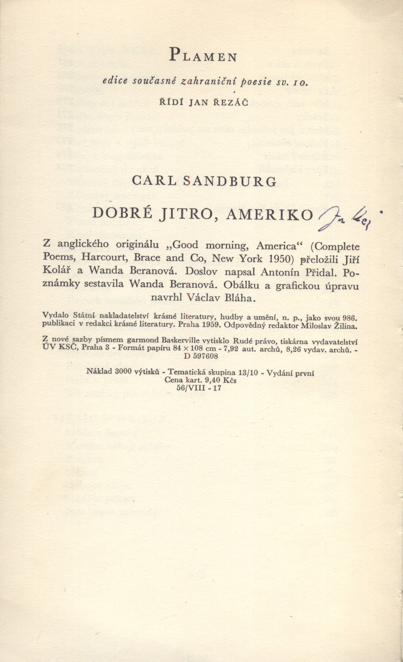 Klíčová slova americká literatura * poezie * Sandburg C. * anglicky psaná literatura * americká poezie * překlad * Kolář J. * Beranová W. * r. 1959
